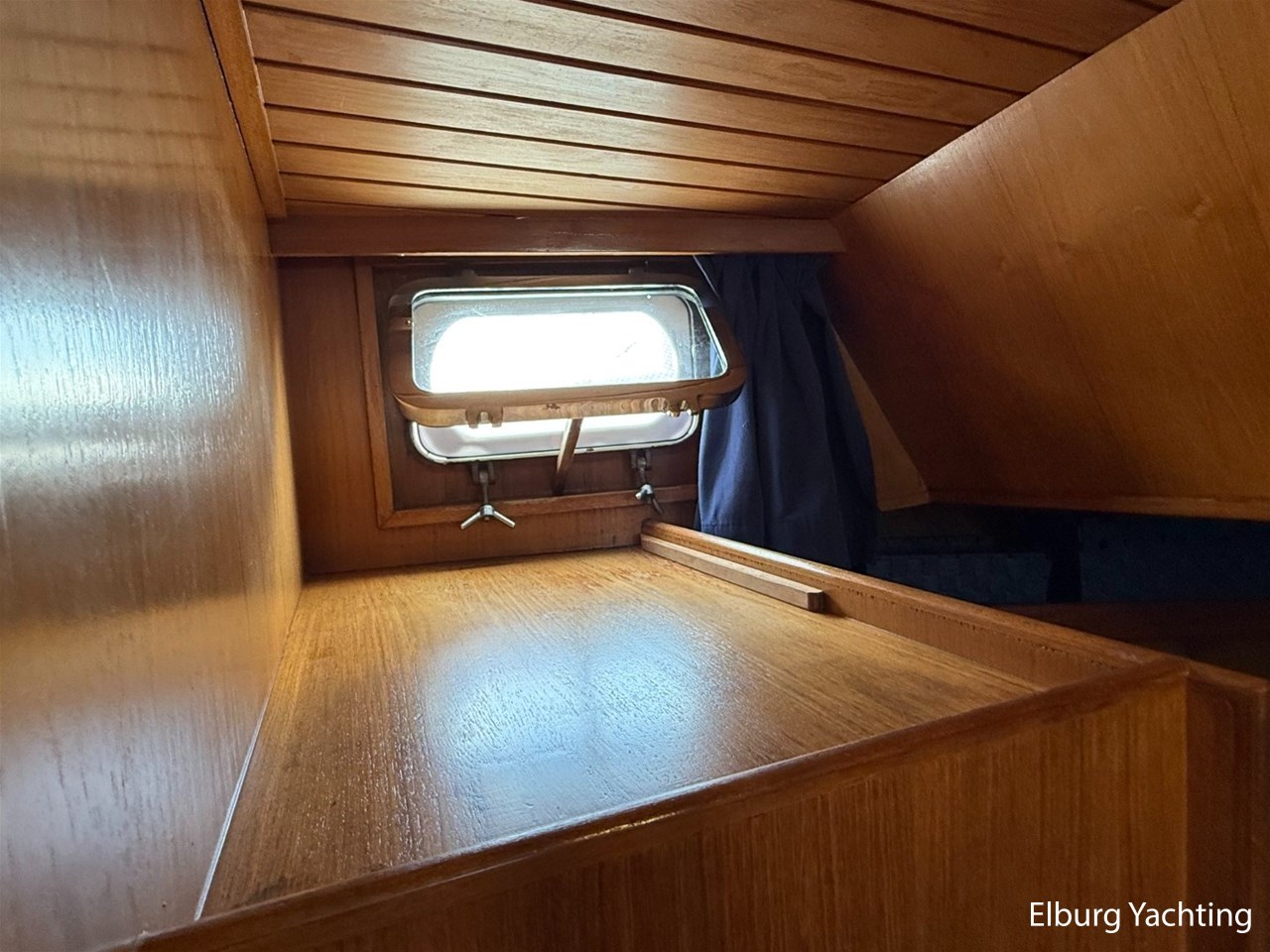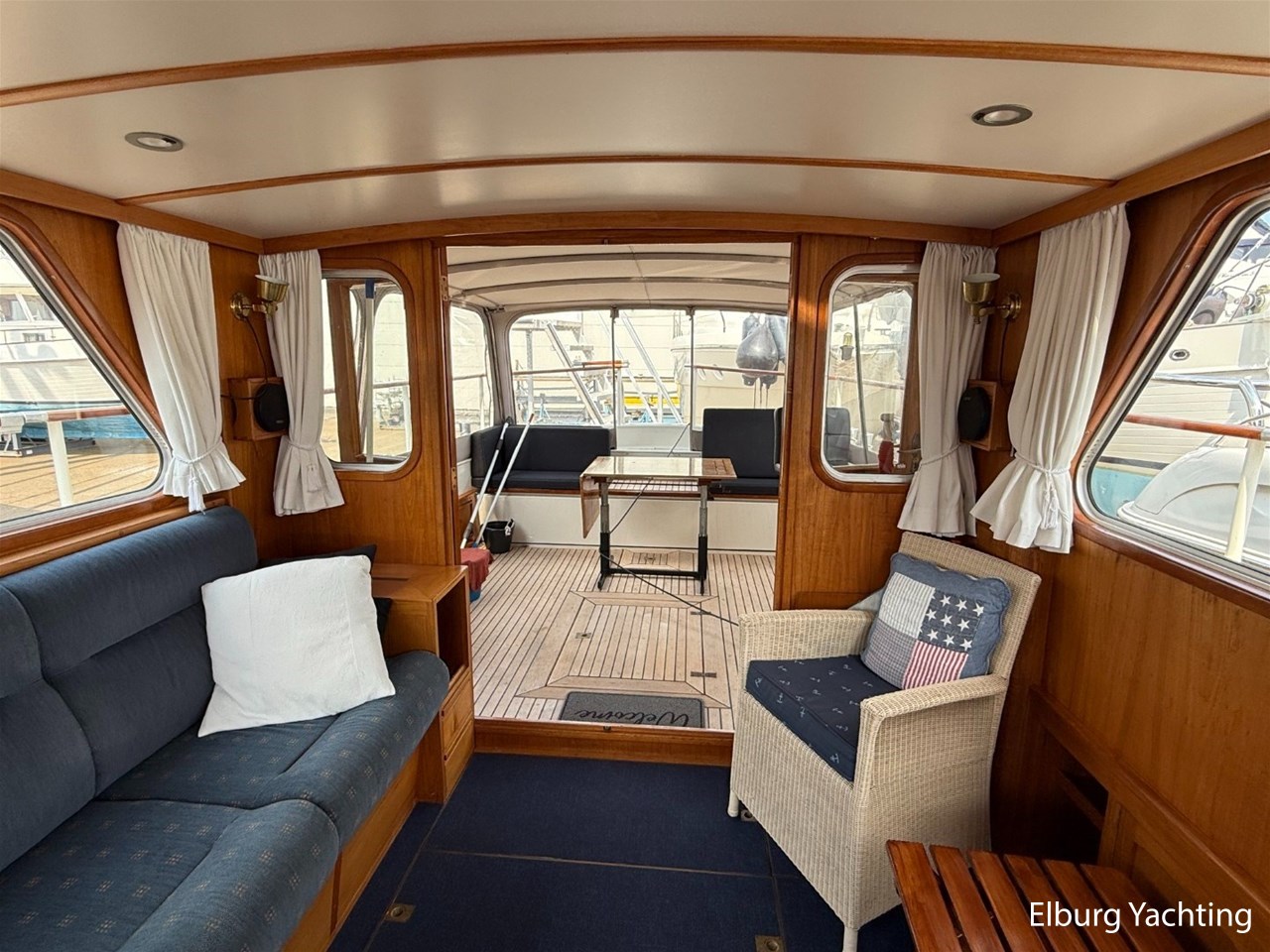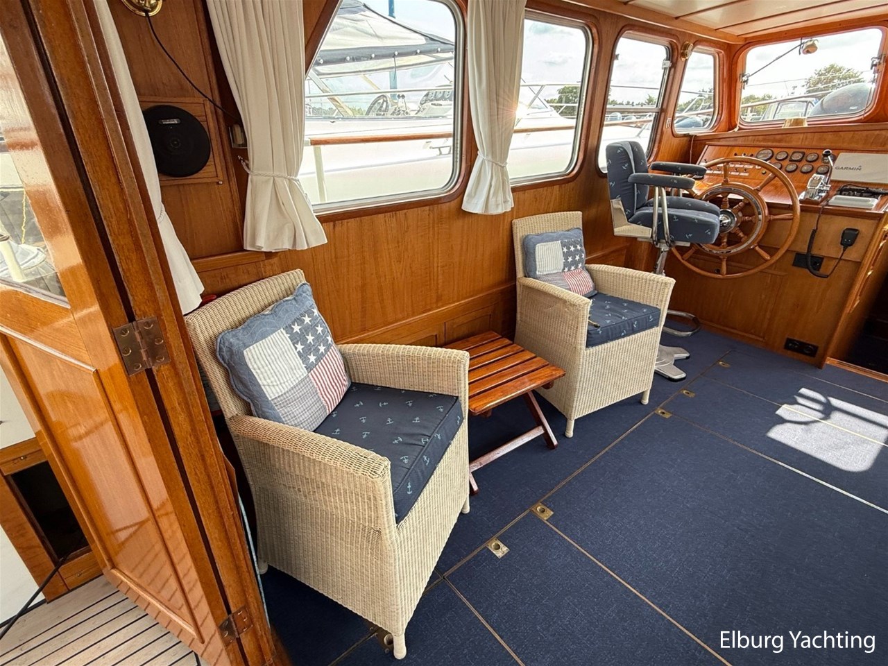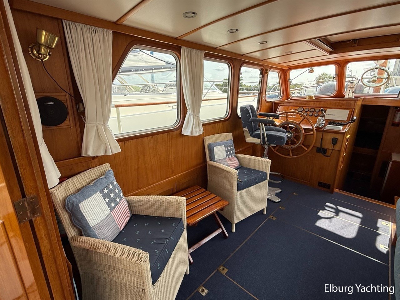 - Ship Teak interior with blue upholstery and recent blue carpeting