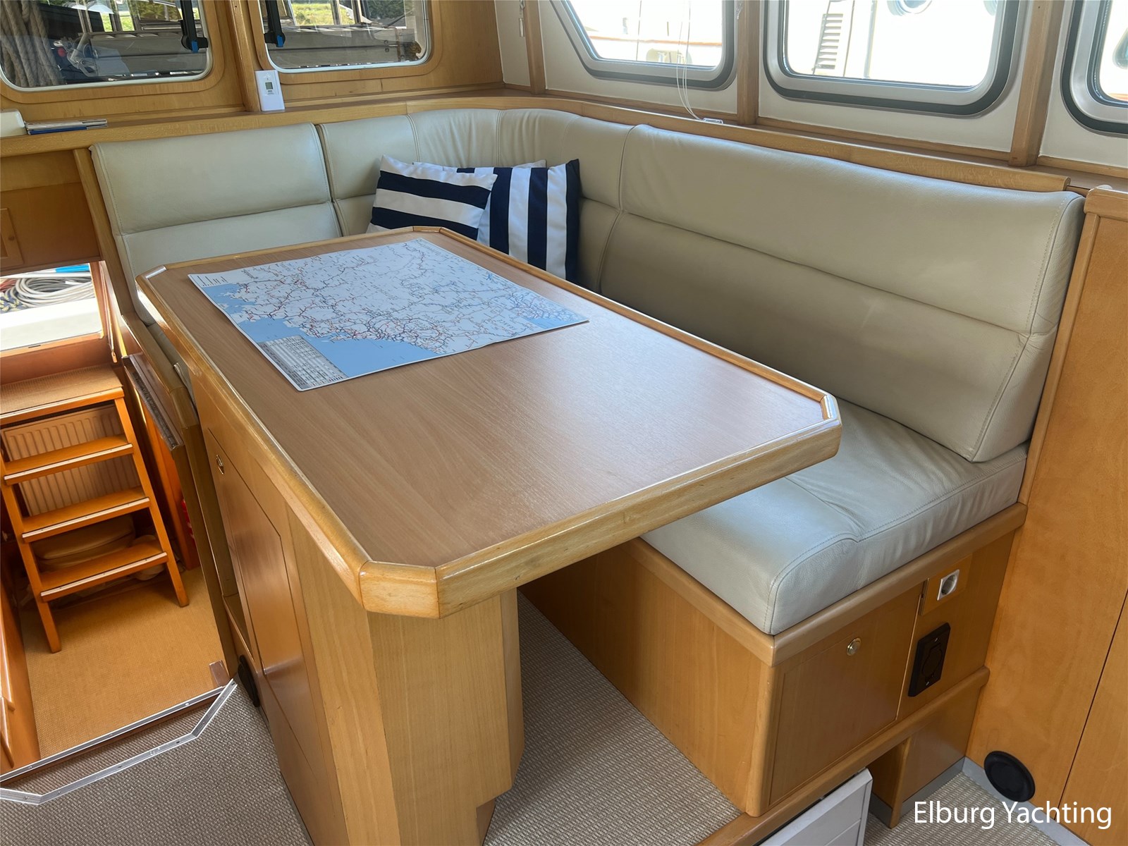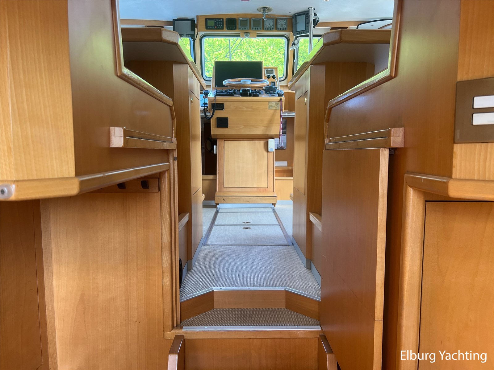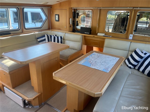This unique Pilot 42 is offered by her original owner. She has maintained her condition through continuous improvements and maintenance over the years. The boat is characterized by its unique layout, which allows for both indoor and outdoor steering. A side door leads from the saloon to the gangway for easy mooring. The aft section is spacious with ample seating and storage. The aft deck is fully covered by a removable aluminum fixed roof. The aft cabin has its own entrance and private bathroom. With its 2 x 260 hp engines, the boat has a long range, making it ideal for both slow and fast sailing. Once arrived, the Yacht Control remote control makes mooring a breeze. This Pilot also comes with: hull painted in 2020, underwater hull blasted and rebuilt in 2020, deck painted in 2023, Raymarine plotter in 2023, Raymarine VHF radio in 2023, new propellers in 2022, Munters MG dehumidifier with hygrostat that provides dry air throughout the ship, double stainless steel railings, double stainless steel bollards, bimini over the helm station, stainless steel fender holders, stainless steel handrails, folding radar mast, seaworthy sheltered cockpit, Tack Ticks wind set, 1000-watt searchlight, manually installed gangway, insulated hull, slats, and trim tabs.