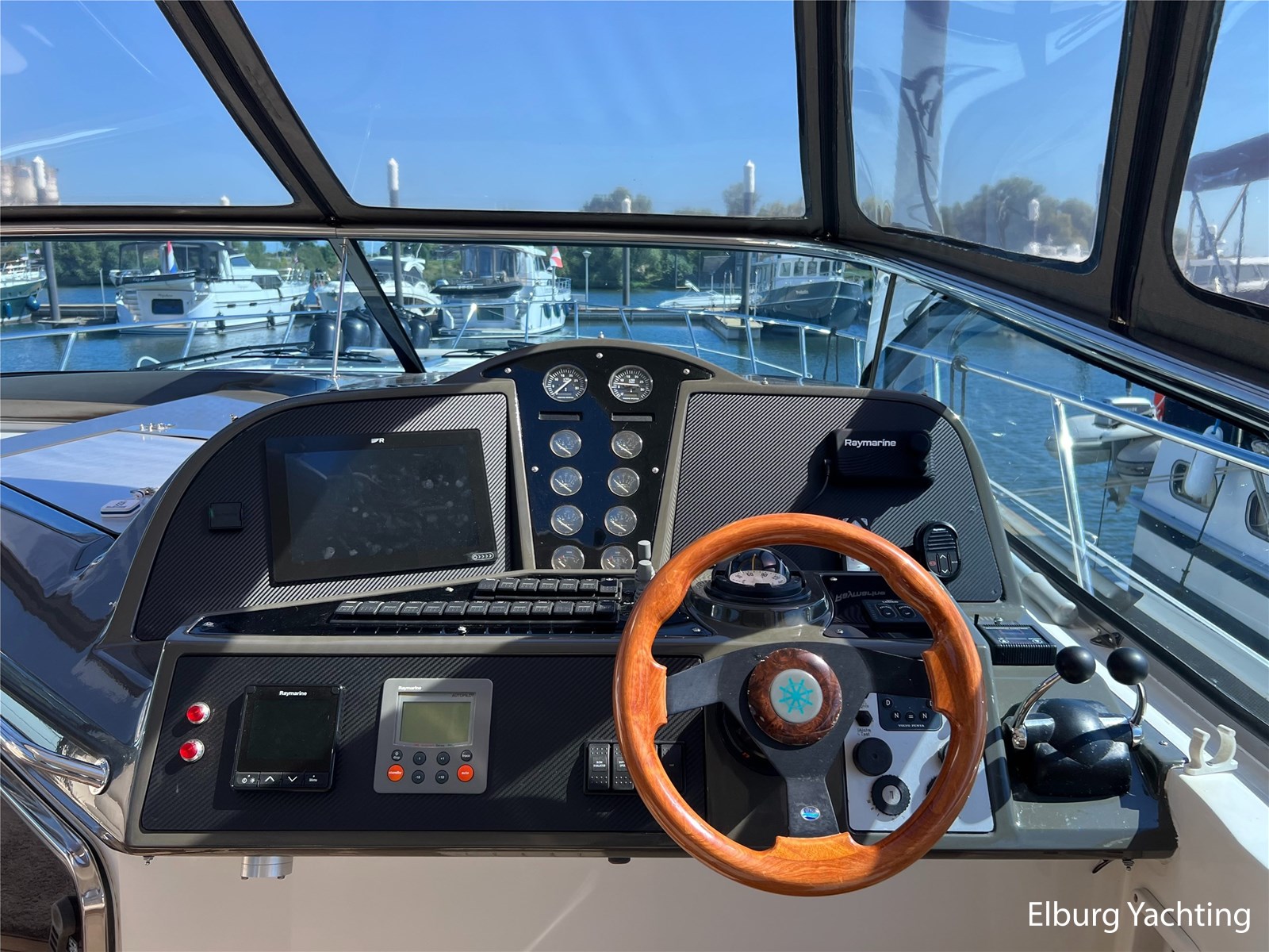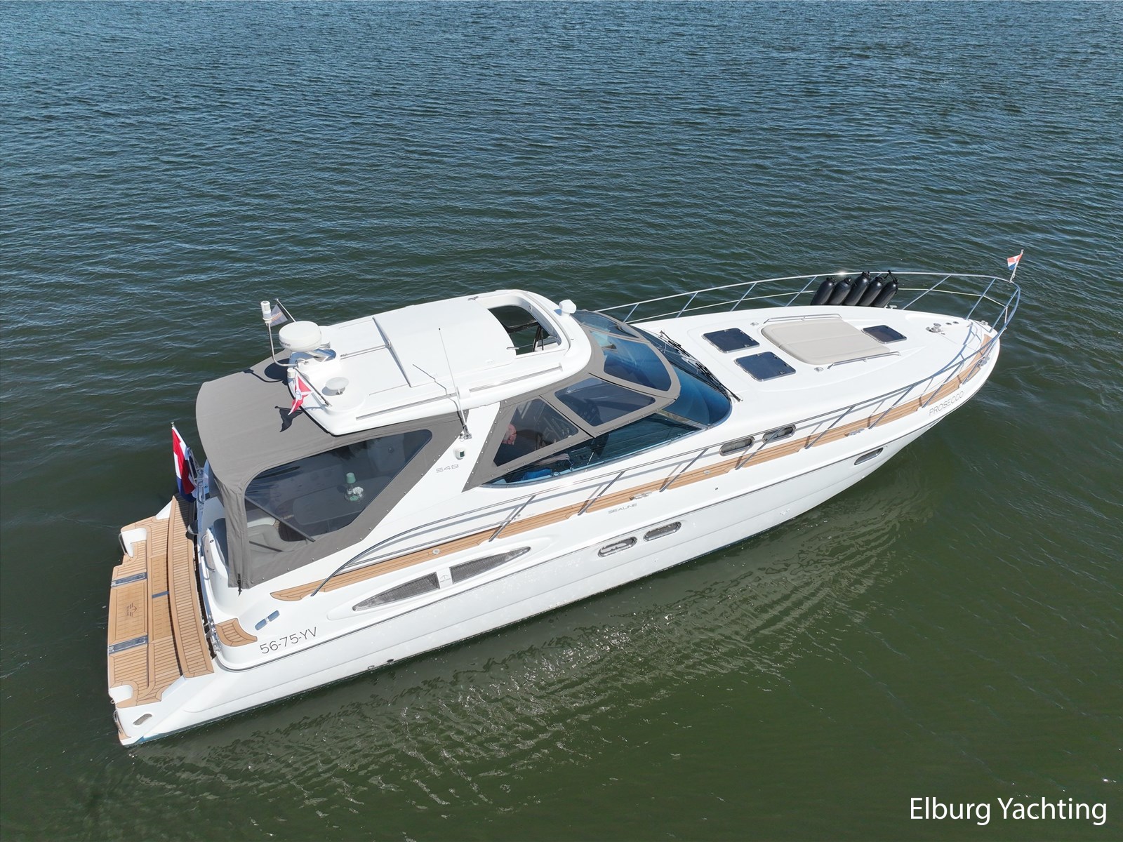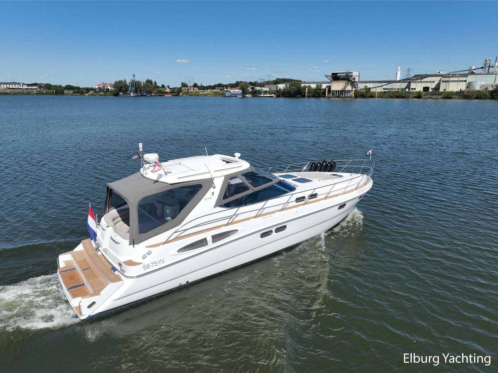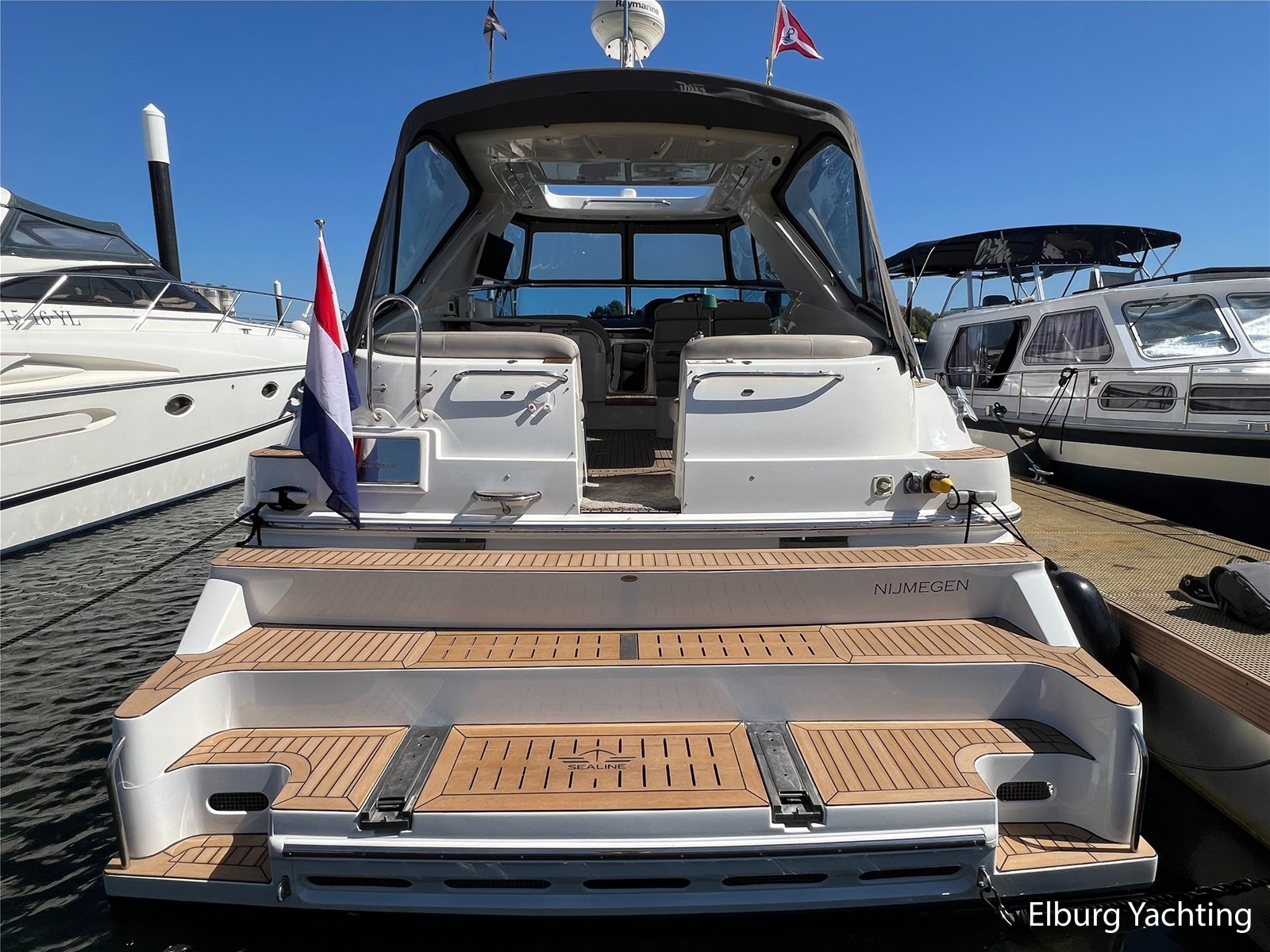 A beautiful Sealine S48 in well-maintained condition. The exterior immediately catches the eye by: the renewed synthetic teak deck, beautifully lined new cockpit cover and shiny hull because of its last polish earlier this year. Upon entering the open cockpit, there's a large bench on either side, easily accommodating at least eight people. On the port side is the wet bar with a grill, refrigerator, sink, and storage space. The helm station features a two-person bench, with another two people on the port side. An electric sliding roof is integrated into the hardtop roof. The navigation equipment has been updated with the latest Raymarine systems. The port side door provides quick access to the side deck. Below deck, you enter the saloon with its adjoining spacious galley, fully equipped. The carpeting in the saloon and in both cabins has been replaced. The forward cabin has a double French bed with separate toilet and shower facilities. Amidships is the second cabin with a double bed and en-suite bathroom. The engine room is accessed through a hatch in the open cockpit. There is ample storage space and easy access to all the equipment. A sunbed with removable cushions is located on the foredeck. This Sealine S48 is also equipped with: storage space under the cockpit benches, TVs in the cockpit and front cabin, Victron BMV-702 Battery Monitor display, dimmable interior lighting, Fusion audio system, and a dishwasher in the galley. Engine maintenance on both main engines and the generator was carried out in the winter of 2024.