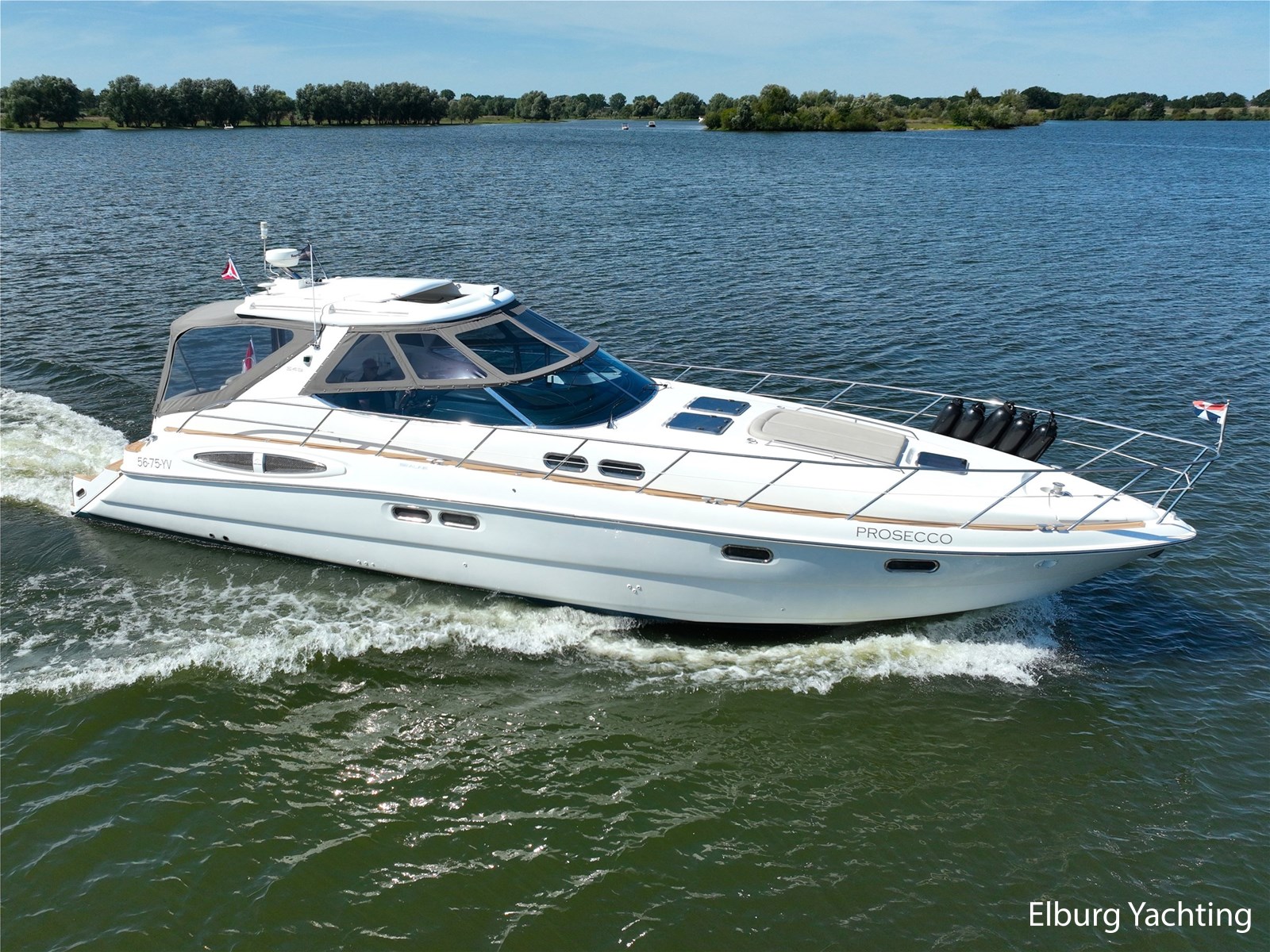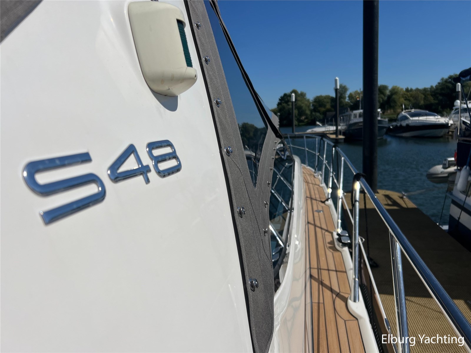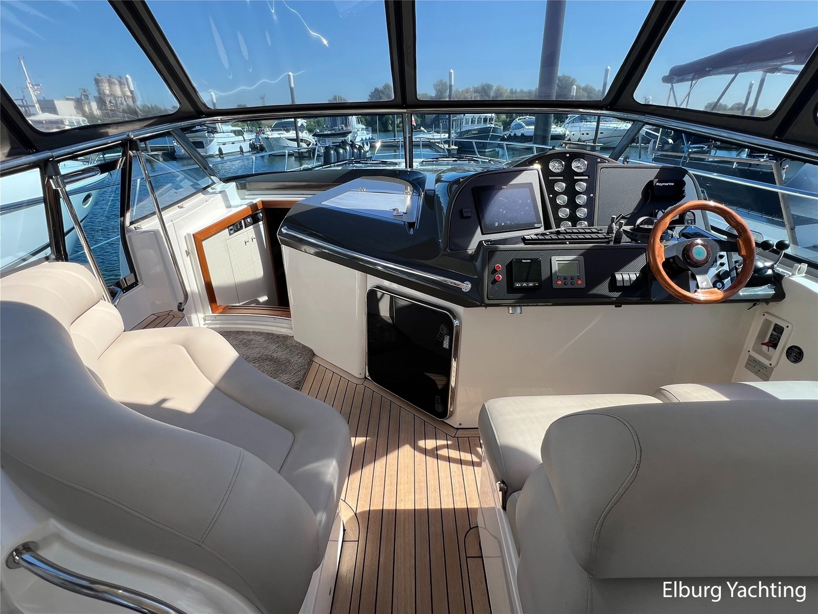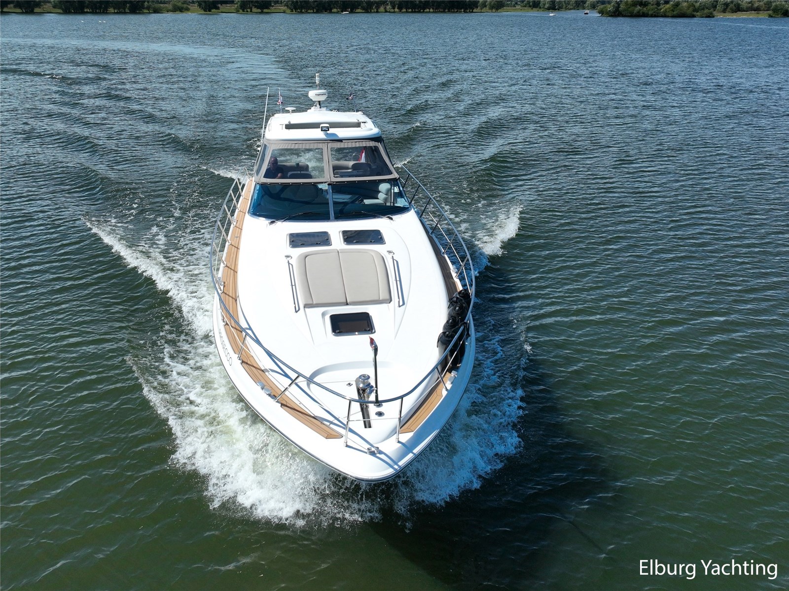 A beautiful Sealine S48 in well-maintained condition. The exterior immediately catches the eye by: the renewed synthetic teak deck, beautifully lined new cockpit cover and shiny hull because of its last polish earlier this year. Upon entering the open cockpit, there's a large bench on either side, easily accommodating at least eight people. On the port side is the wet bar with a grill, refrigerator, sink, and storage space. The helm station features a two-person bench, with another two people on the port side. An electric sliding roof is integrated into the hardtop roof. The navigation equipment has been updated with the latest Raymarine systems. The port side door provides quick access to the side deck. Below deck, you enter the saloon with its adjoining spacious galley, fully equipped. The carpeting in the saloon and in both cabins has been replaced. The forward cabin has a double French bed with separate toilet and shower facilities. Amidships is the second cabin with a double bed and en-suite bathroom. The engine room is accessed through a hatch in the open cockpit. There is ample storage space and easy access to all the equipment. A sunbed with removable cushions is located on the foredeck. This Sealine S48 is also equipped with: storage space under the cockpit benches, TVs in the cockpit and front cabin, Victron BMV-702 Battery Monitor display, dimmable interior lighting, Fusion audio system, and a dishwasher in the galley. Engine maintenance on both main engines and the generator was carried out in the winter of 2024.
