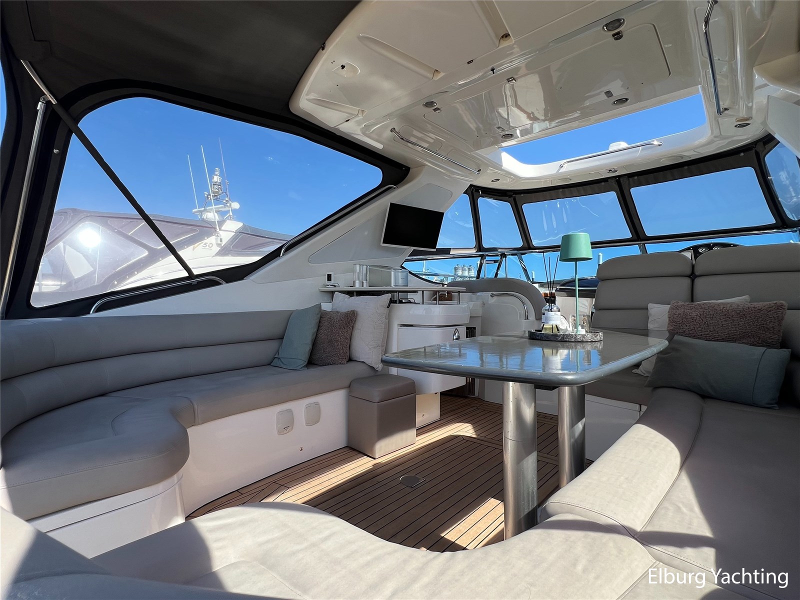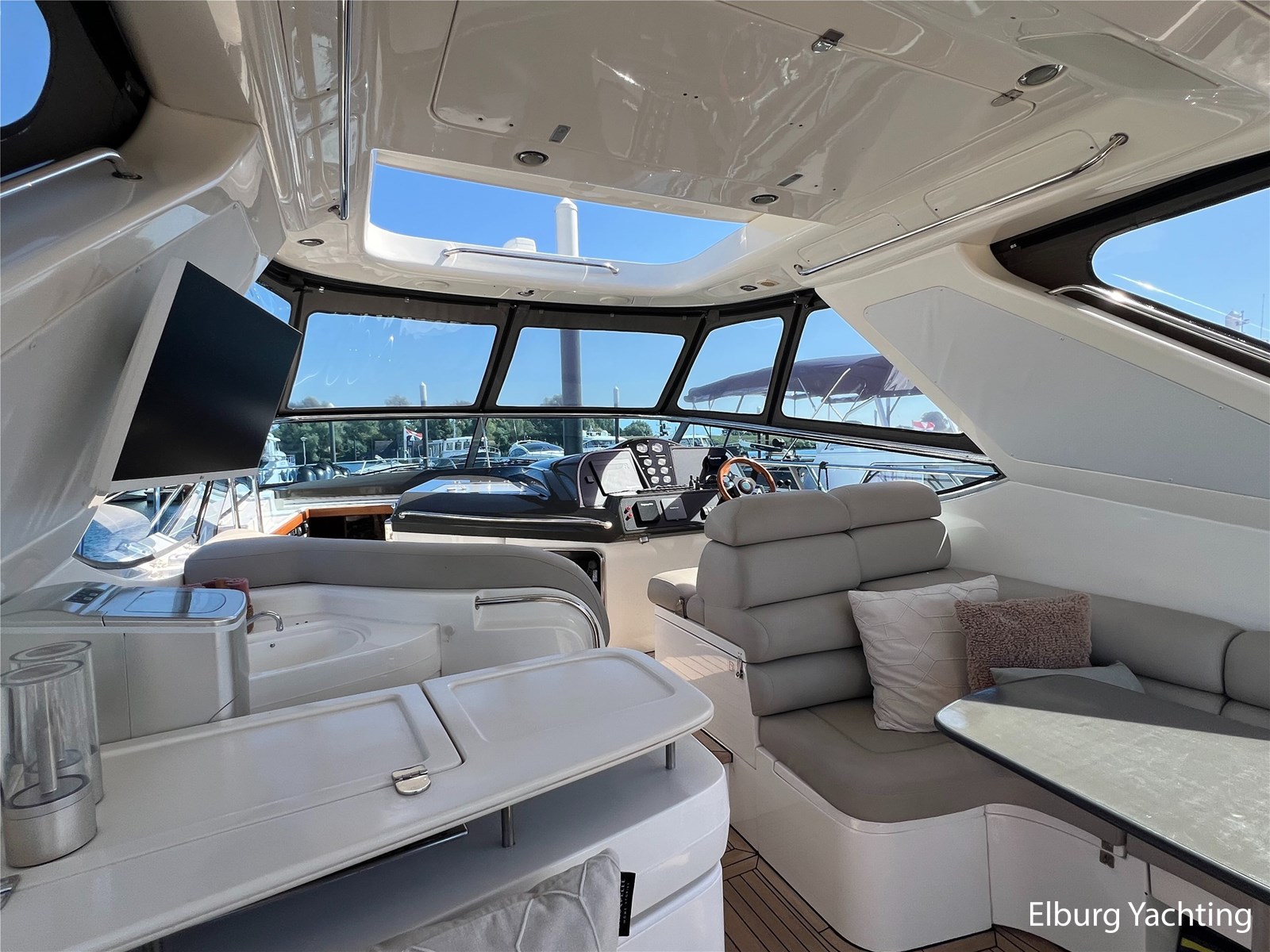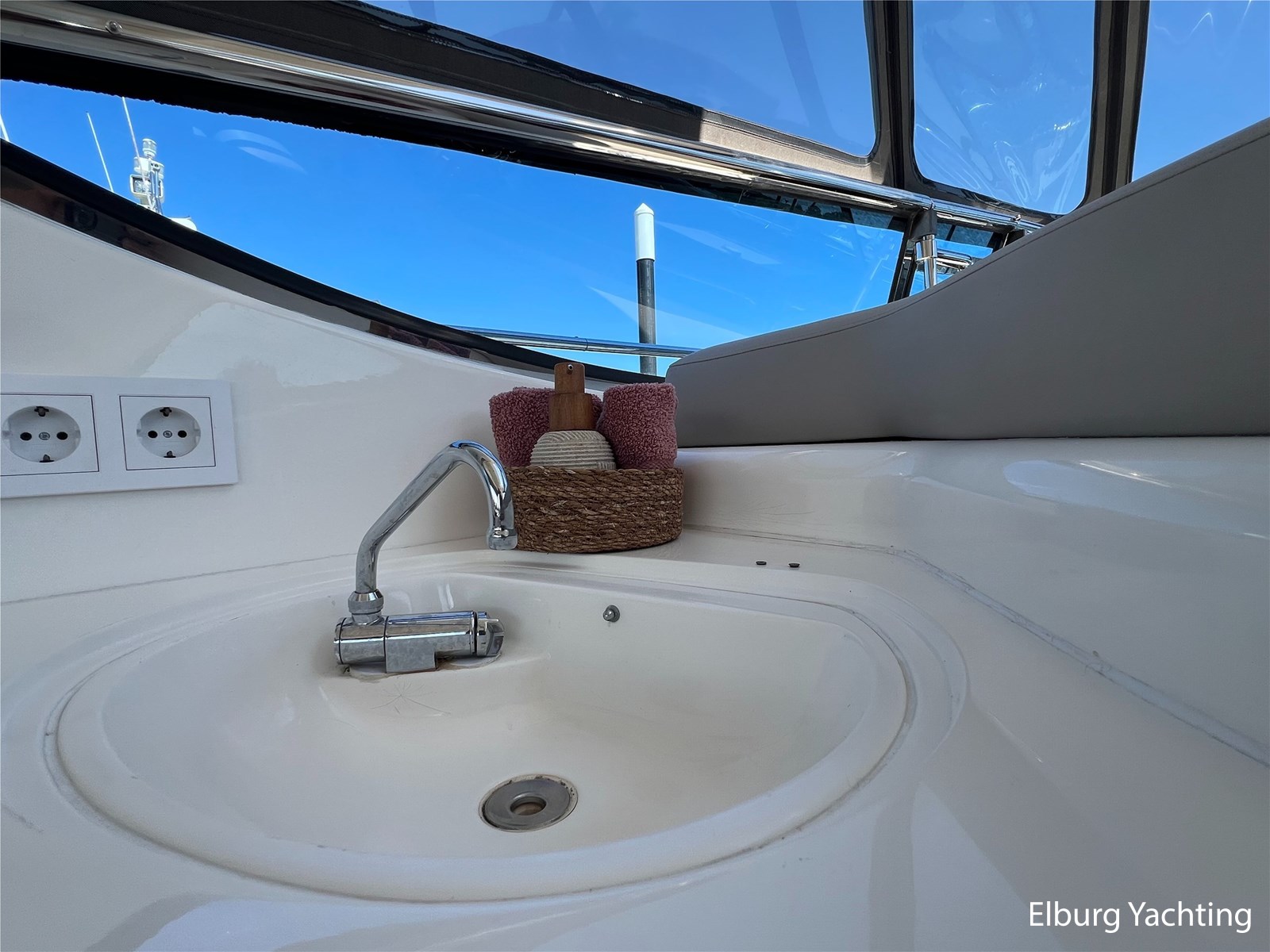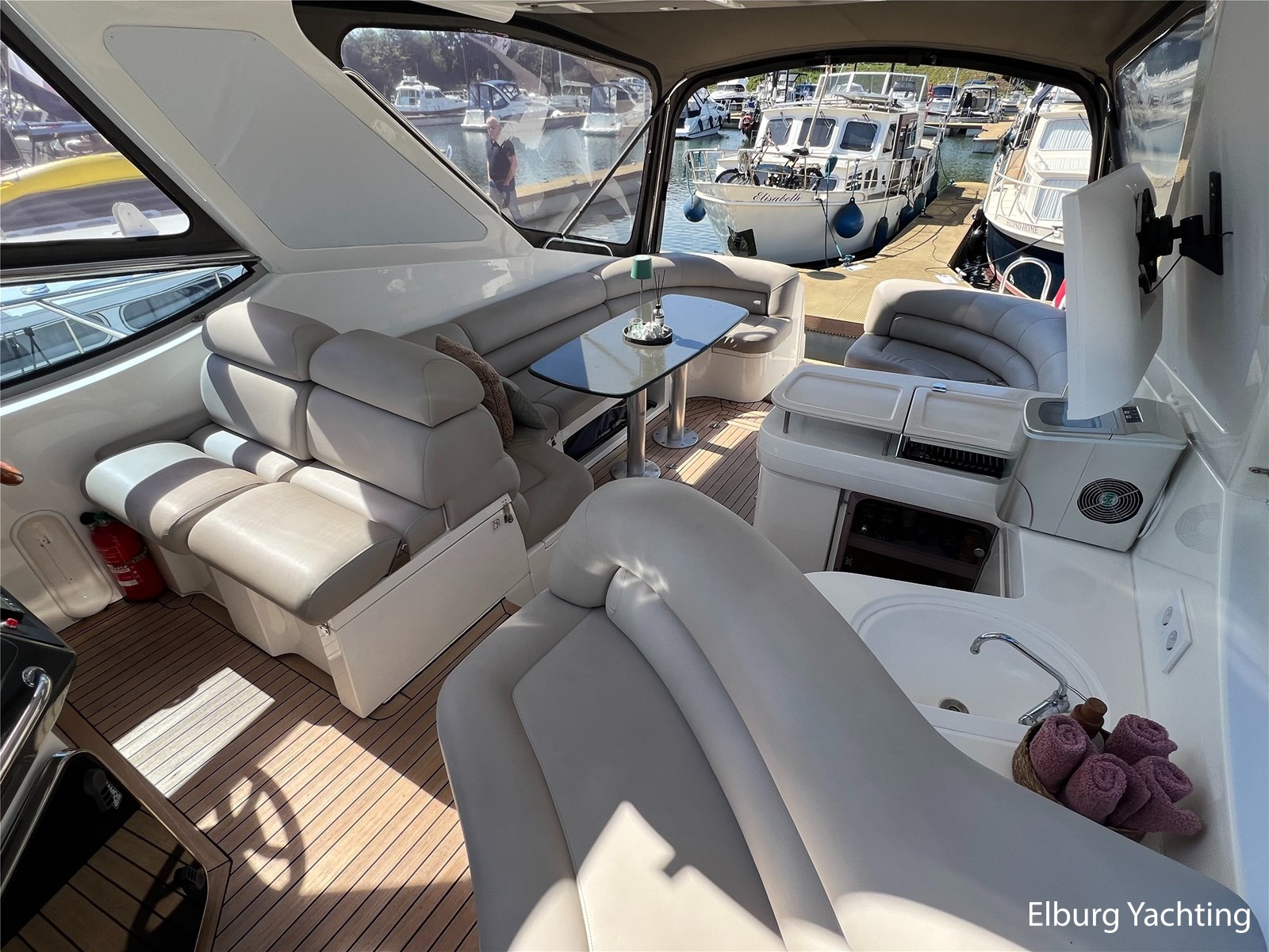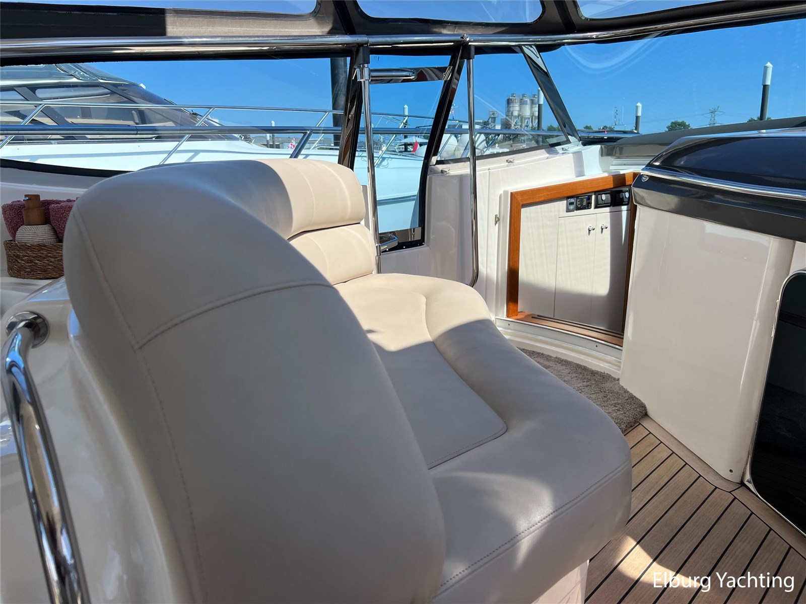 A beautiful Sealine S48 in well-maintained condition. The exterior immediately catches the eye by: the renewed synthetic teak deck, beautifully lined new cockpit cover and shiny hull because of its last polish earlier this year. Upon entering the open cockpit, there's a large bench on either side, easily accommodating at least eight people. On the port side is the wet bar with a grill, refrigerator, sink, and storage space. The helm station features a two-person bench, with another two people on the port side. An electric sliding roof is integrated into the hardtop roof. The navigation equipment has been updated with the latest Raymarine systems. The port side door provides quick access to the side deck. Below deck, you enter the saloon with its adjoining spacious galley, fully equipped. The carpeting in the saloon and in both cabins has been replaced. The forward cabin has a double French bed with separate toilet and shower facilities. Amidships is the second cabin with a double bed and en-suite bathroom. The engine room is accessed through a hatch in the open cockpit. There is ample storage space and easy access to all the equipment. A sunbed with removable cushions is located on the foredeck. This Sealine S48 is also equipped with: storage space under the cockpit benches, TVs in the cockpit and front cabin, Victron BMV-702 Battery Monitor display, dimmable interior lighting, Fusion audio system, and a dishwasher in the galley. Engine maintenance on both main engines and the generator was carried out in the winter of 2024.