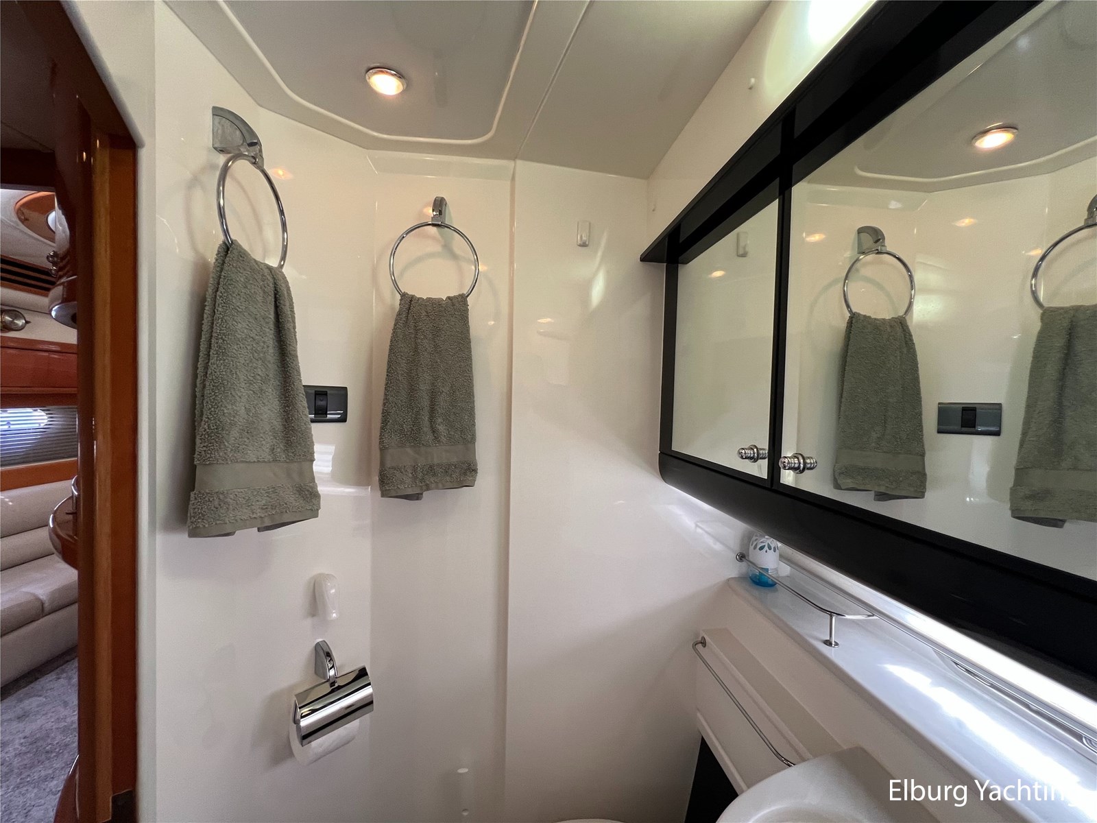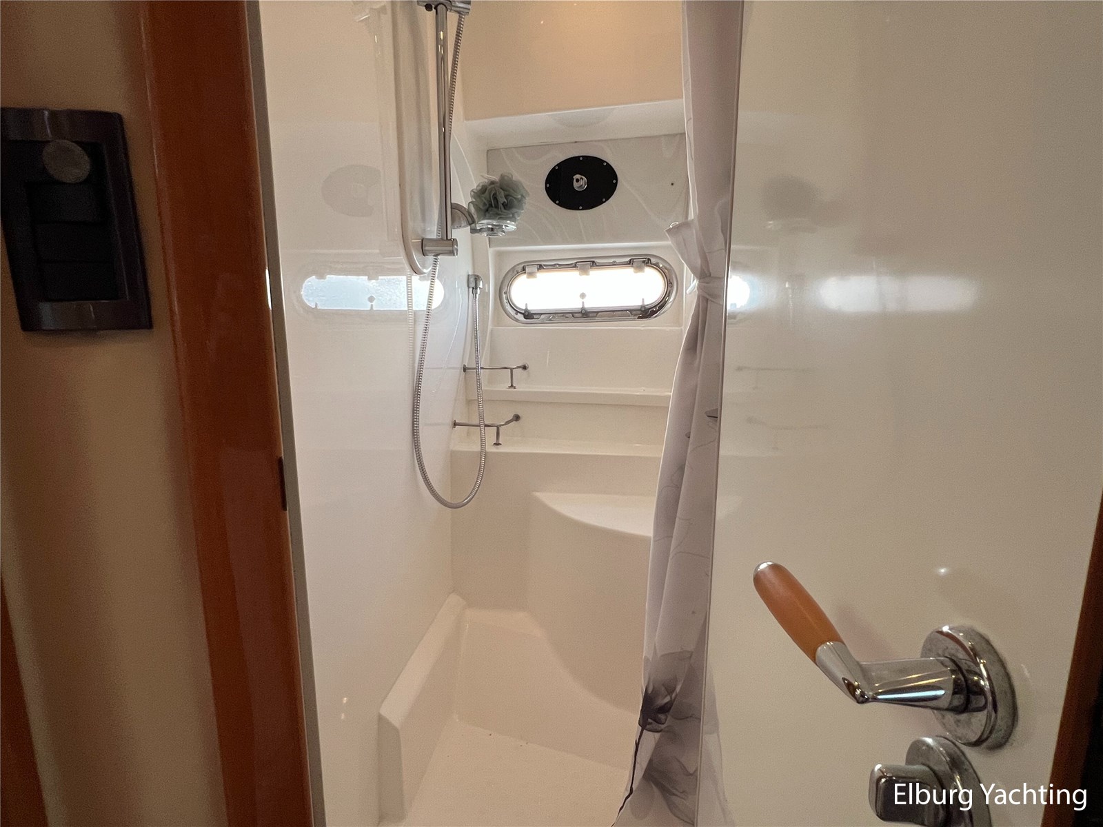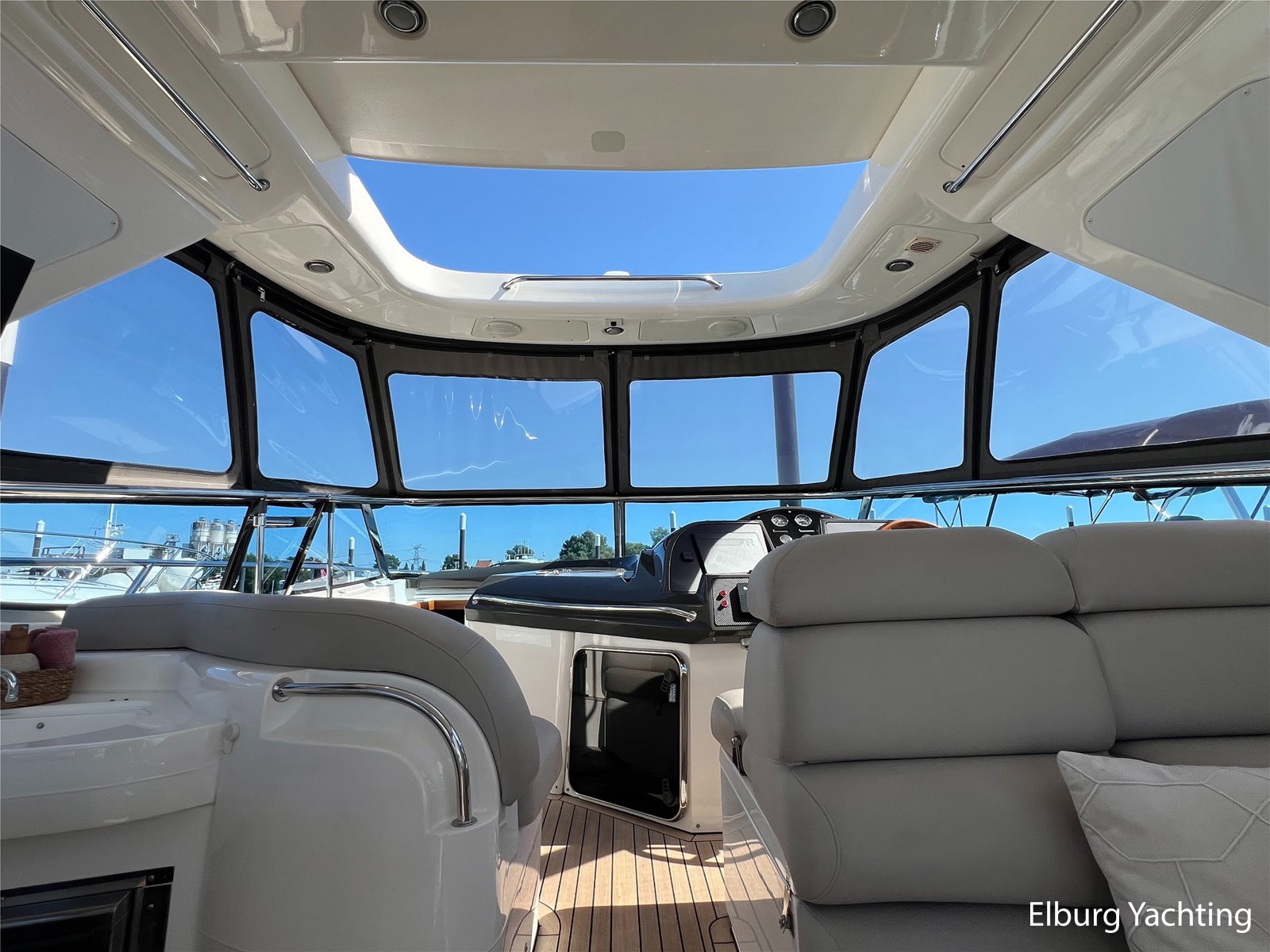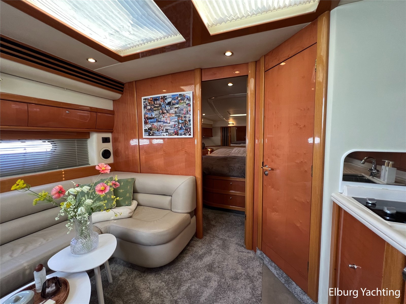 A beautiful Sealine S48 in well-maintained condition. The exterior immediately catches the eye by: the renewed synthetic teak deck, beautifully lined new cockpit cover and shiny hull because of its last polish earlier this year. Upon entering the open cockpit, there's a large bench on either side, easily accommodating at least eight people. On the port side is the wet bar with a grill, refrigerator, sink, and storage space. The helm station features a two-person bench, with another two people on the port side. An electric sliding roof is integrated into the hardtop roof. The navigation equipment has been updated with the latest Raymarine systems. The port side door provides quick access to the side deck. Below deck, you enter the saloon with its adjoining spacious galley, fully equipped. The carpeting in the saloon and in both cabins has been replaced. The forward cabin has a double French bed with separate toilet and shower facilities. Amidships is the second cabin with a double bed and en-suite bathroom. The engine room is accessed through a hatch in the open cockpit. There is ample storage space and easy access to all the equipment. A sunbed with removable cushions is located on the foredeck. This Sealine S48 is also equipped with: storage space under the cockpit benches, TVs in the cockpit and front cabin, Victron BMV-702 Battery Monitor display, dimmable interior lighting, Fusion audio system, and a dishwasher in the galley. Engine maintenance on both main engines and the generator was carried out in the winter of 2024.