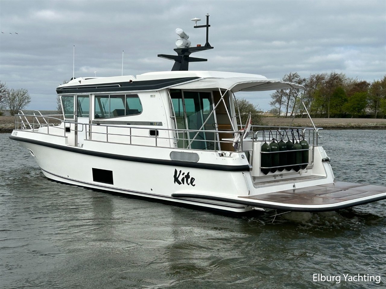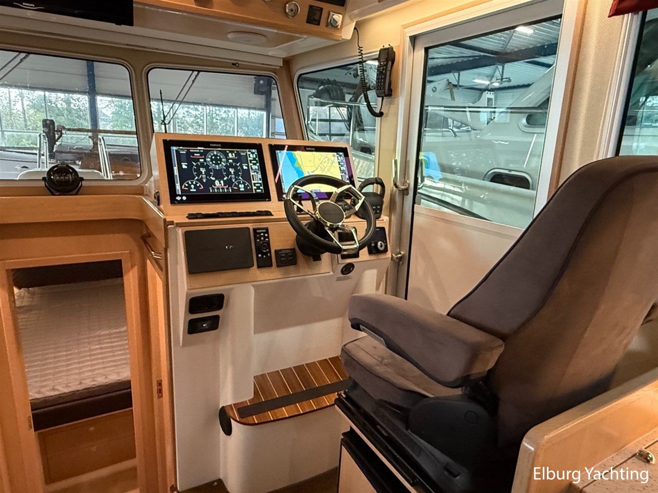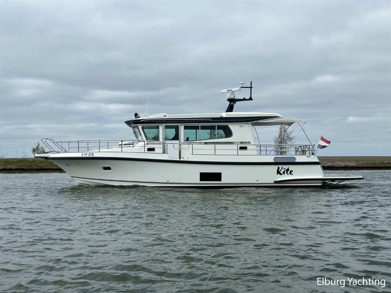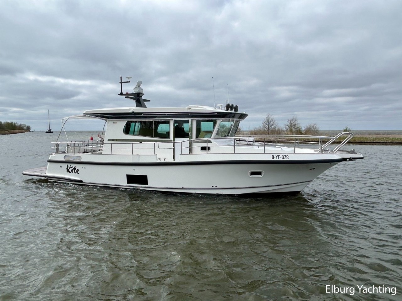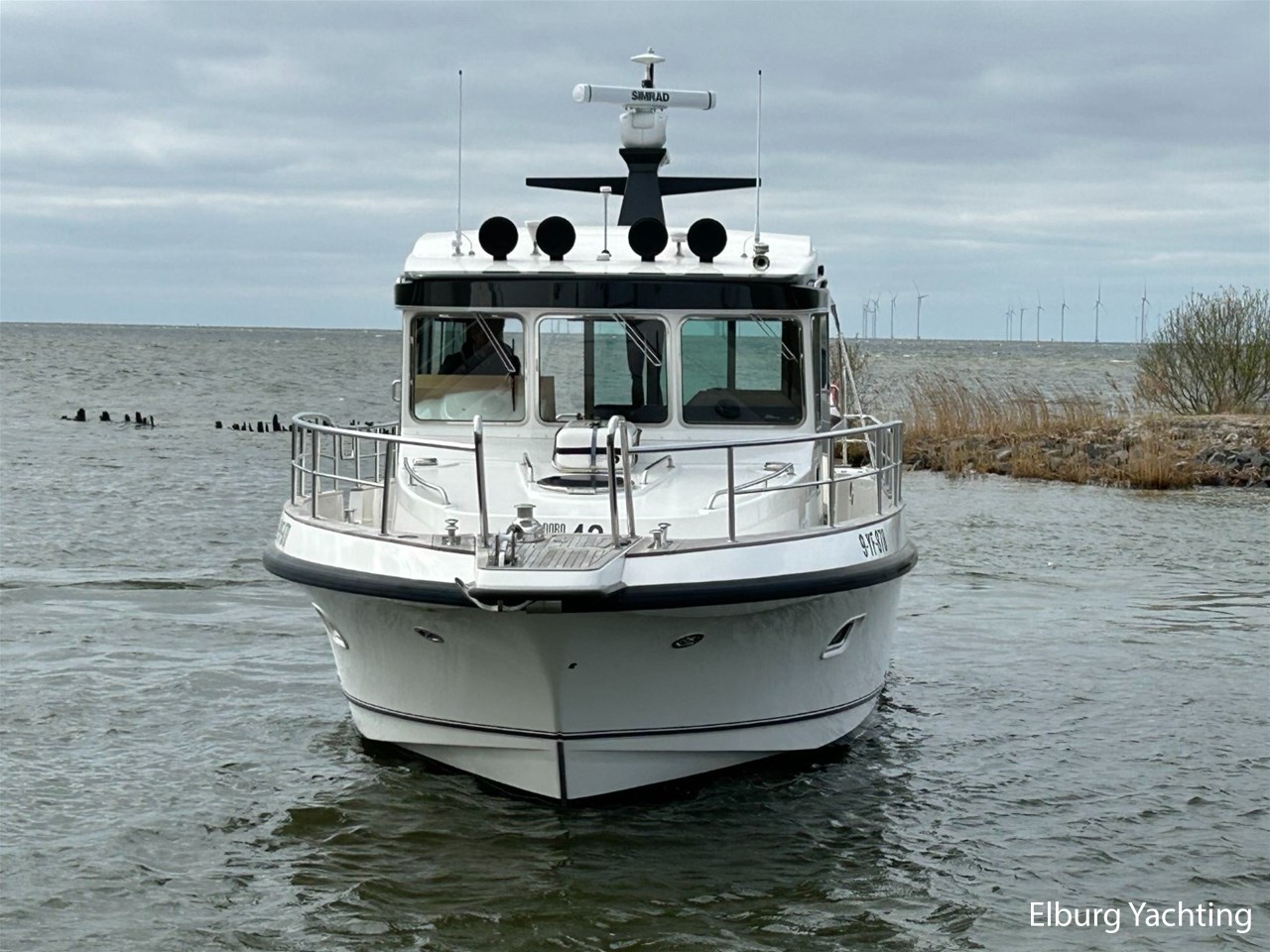 Sporty and highly seaworthy Nord Star Patrol 42 offered by its first owner. This fully equipped Scandinavian Nord Star is a true quality yacht with luxurious features. Among other things, she is equipped with a teak deck all around + swimming platform with double stainless steel guardrails with railings, fender holders, electric sunroof and large spotlights on the wheelhouse. With seaworthiness in mind, the wheelhouse is equipped with negative windscreen angles, allowing spray to fall downwards in rough seas and thus ensuring good visibility. The wheelhouse is easily accessible from the spacious open cockpit with fixed bench, cockpit tent and cosy cockpit table via the stainless steel sliding doors. The wheelhouse is very efficiently laid out, with a spacious and, above all, very cosy dinette with a lowerable table (which can also be used as a bed), TV + stereo, galley with double sink, induction hob, combi oven and worktop, and, of course, the well-organised helm on the starboard side. The wheelhouse is easily accessible on both sides via the side doors from the gangways, which is very practical when mooring and unmooring. The forward cabin is equipped with a beautiful freestanding double bed and nearby sanitary facilities (separate toilet and shower). The aft cabin is accessible from the rear of the wheelhouse and has a spacious double bed amidships and a nearby toilet with washbasin.