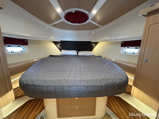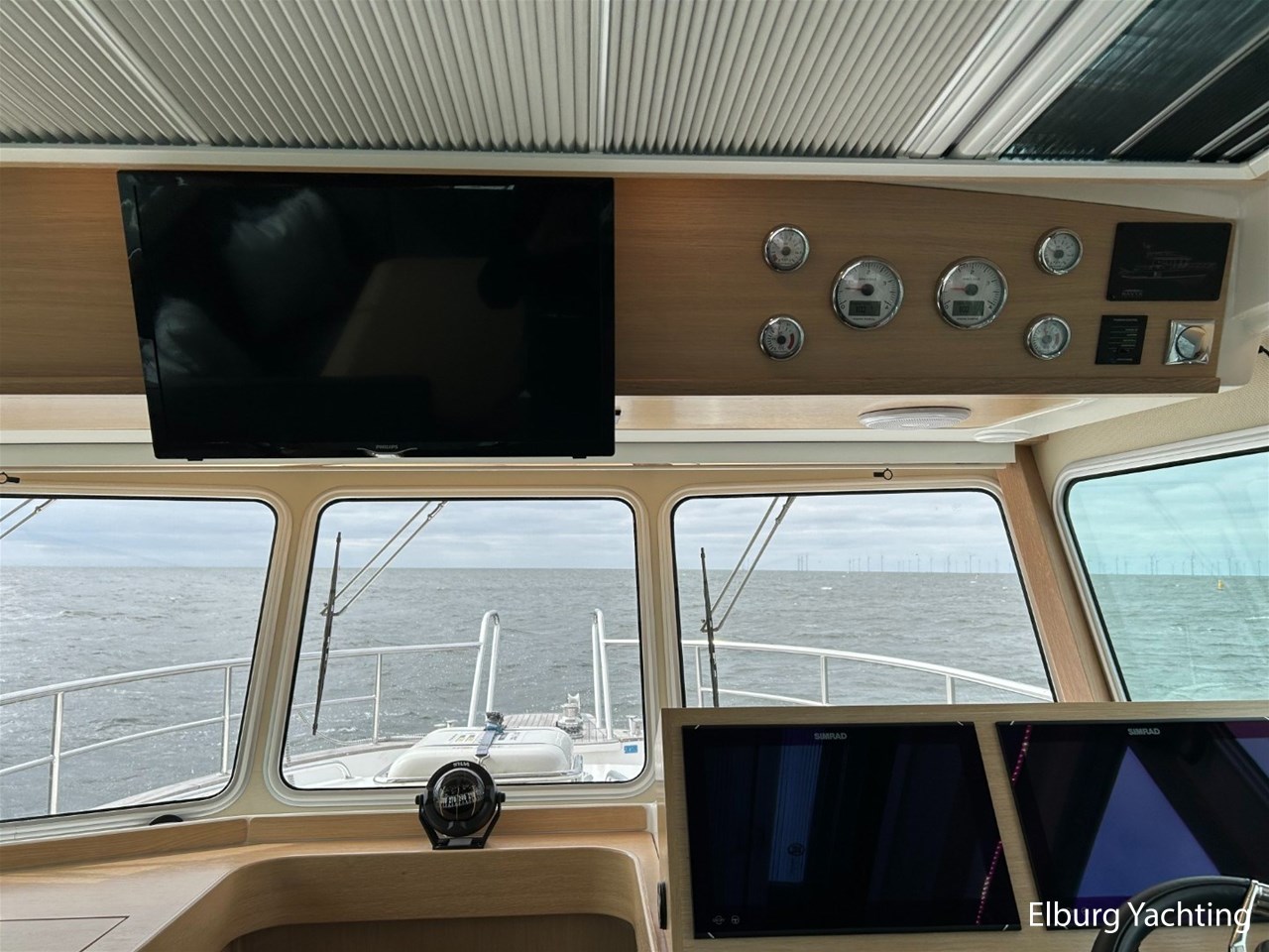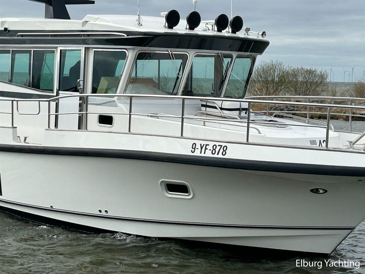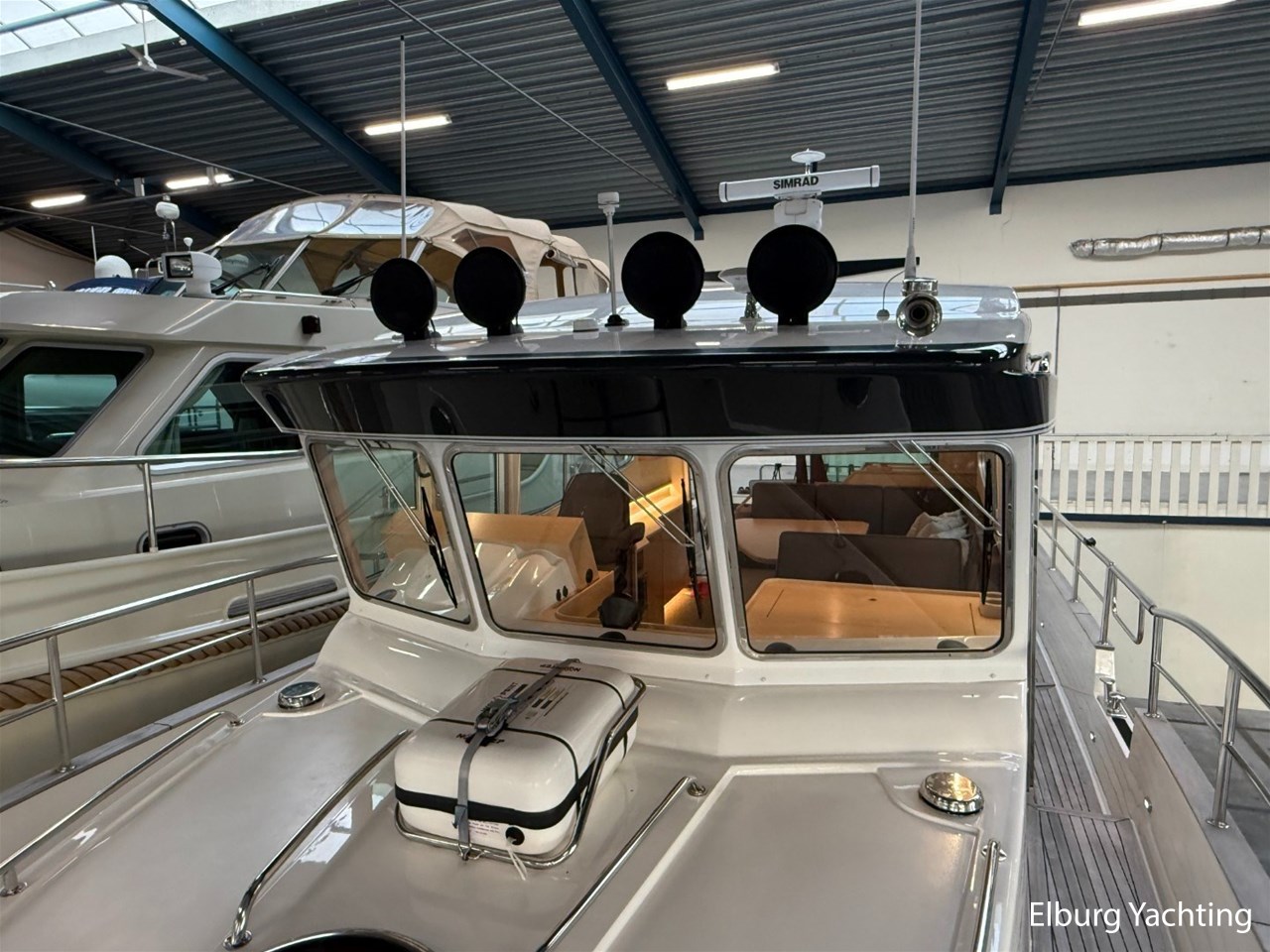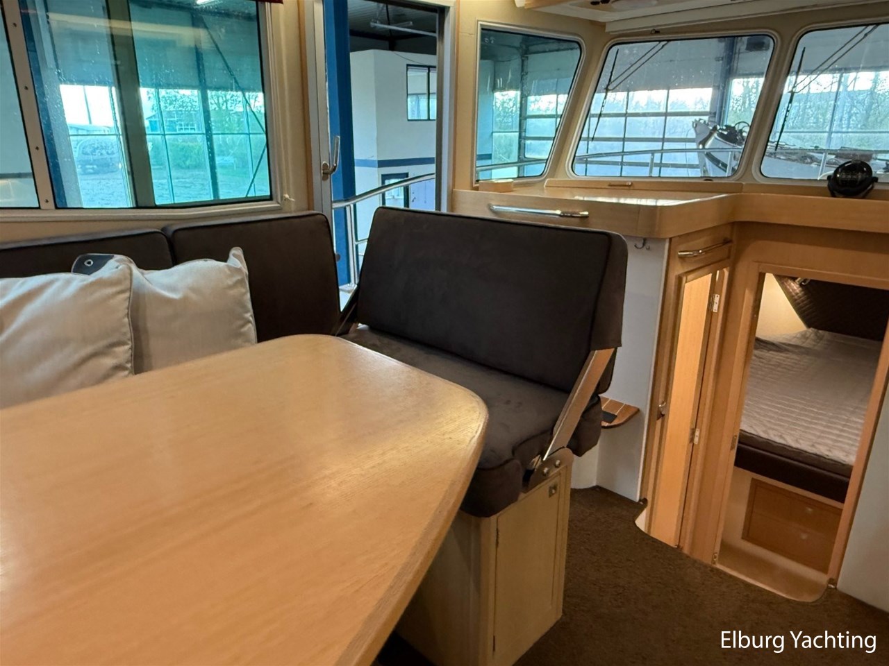 Sporty and highly seaworthy Nord Star Patrol 42 offered by its first owner. This fully equipped Scandinavian Nord Star is a true quality yacht with luxurious features. Among other things, she is equipped with a teak deck all around + swimming platform with double stainless steel guardrails with railings, fender holders, electric sunroof and large spotlights on the wheelhouse. With seaworthiness in mind, the wheelhouse is equipped with negative windscreen angles, allowing spray to fall downwards in rough seas and thus ensuring good visibility. The wheelhouse is easily accessible from the spacious open cockpit with fixed bench, cockpit tent and cosy cockpit table via the stainless steel sliding doors. The wheelhouse is very efficiently laid out, with a spacious and, above all, very cosy dinette with a lowerable table (which can also be used as a bed), TV + stereo, galley with double sink, induction hob, combi oven and worktop, and, of course, the well-organised helm on the starboard side. The wheelhouse is easily accessible on both sides via the side doors from the gangways, which is very practical when mooring and unmooring. The forward cabin is equipped with a beautiful freestanding double bed and nearby sanitary facilities (separate toilet and shower). The aft cabin is accessible from the rear of the wheelhouse and has a spacious double bed amidships and a nearby toilet with washbasin.