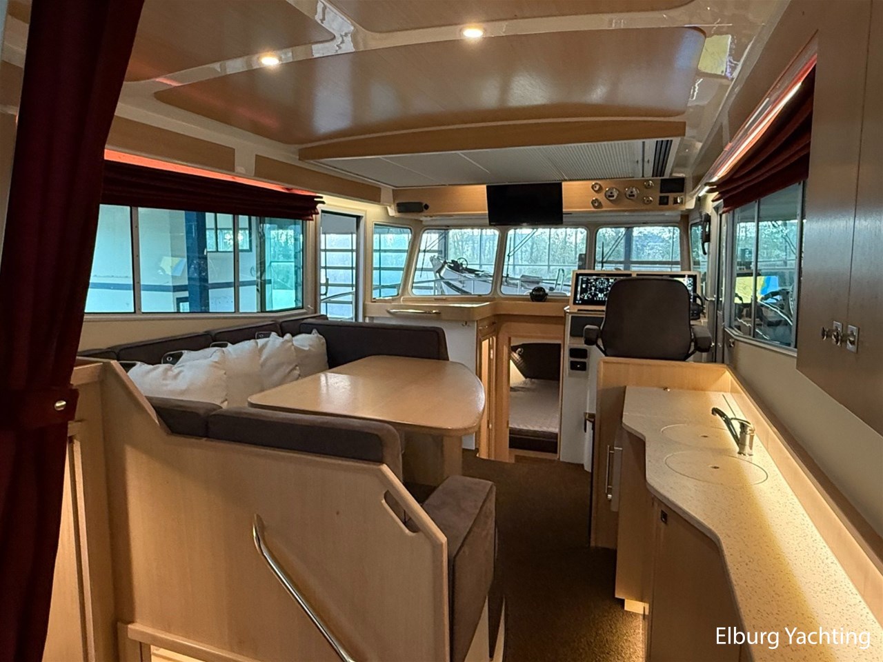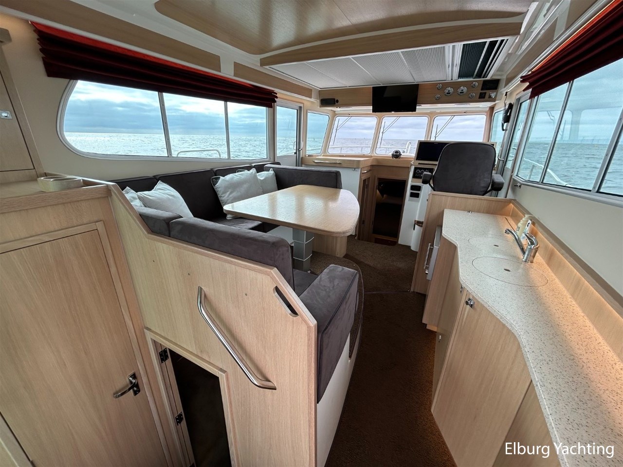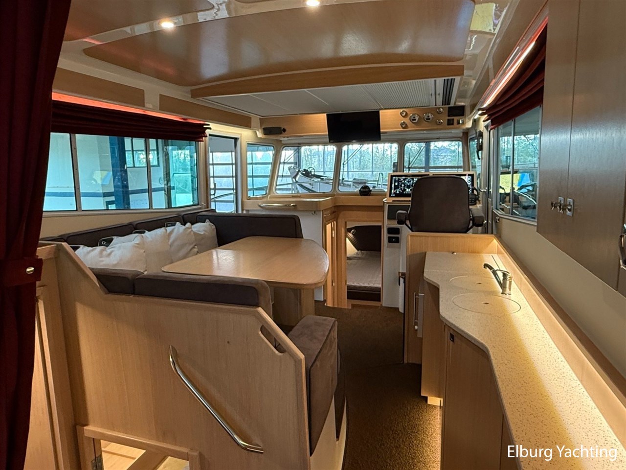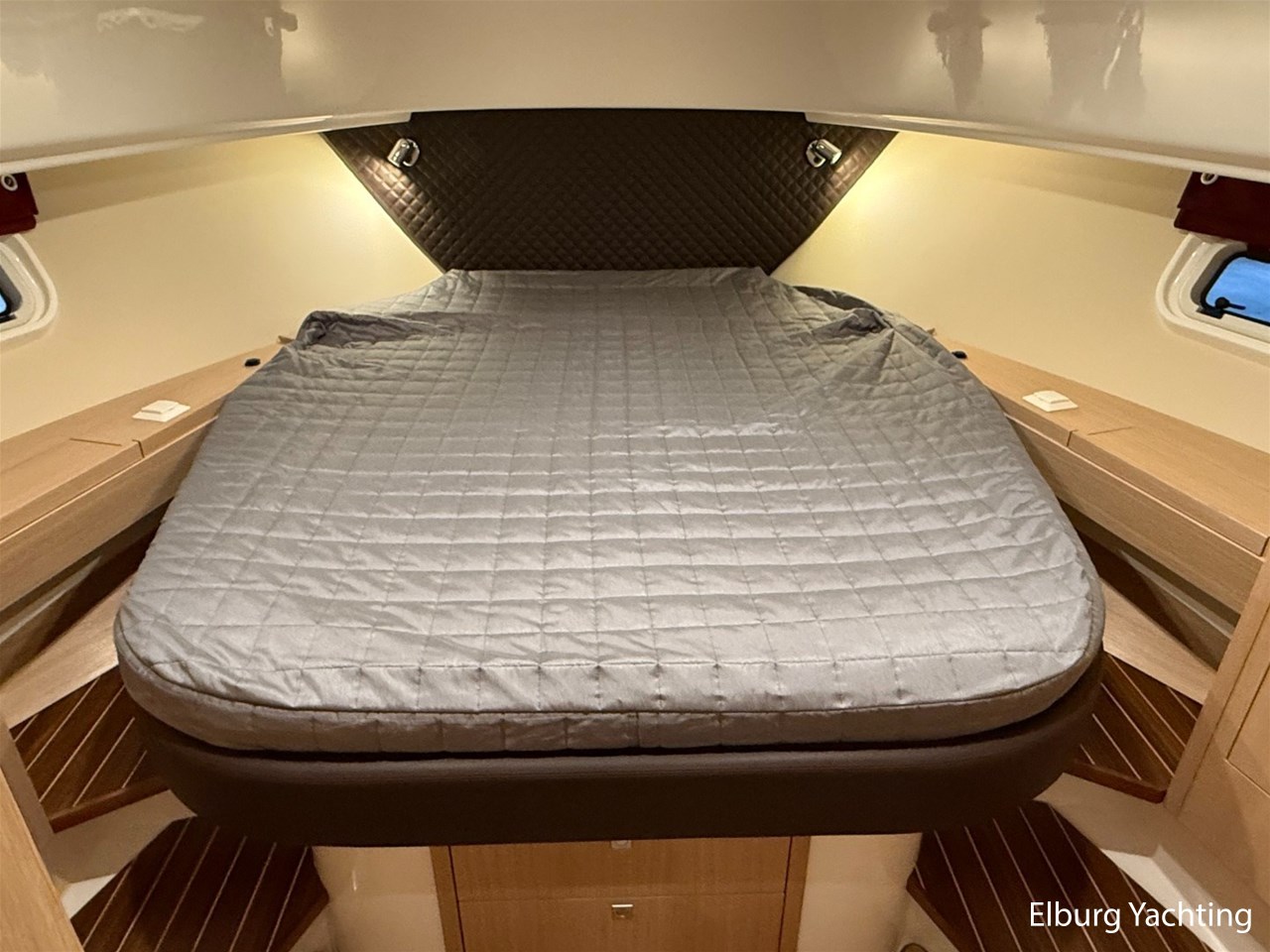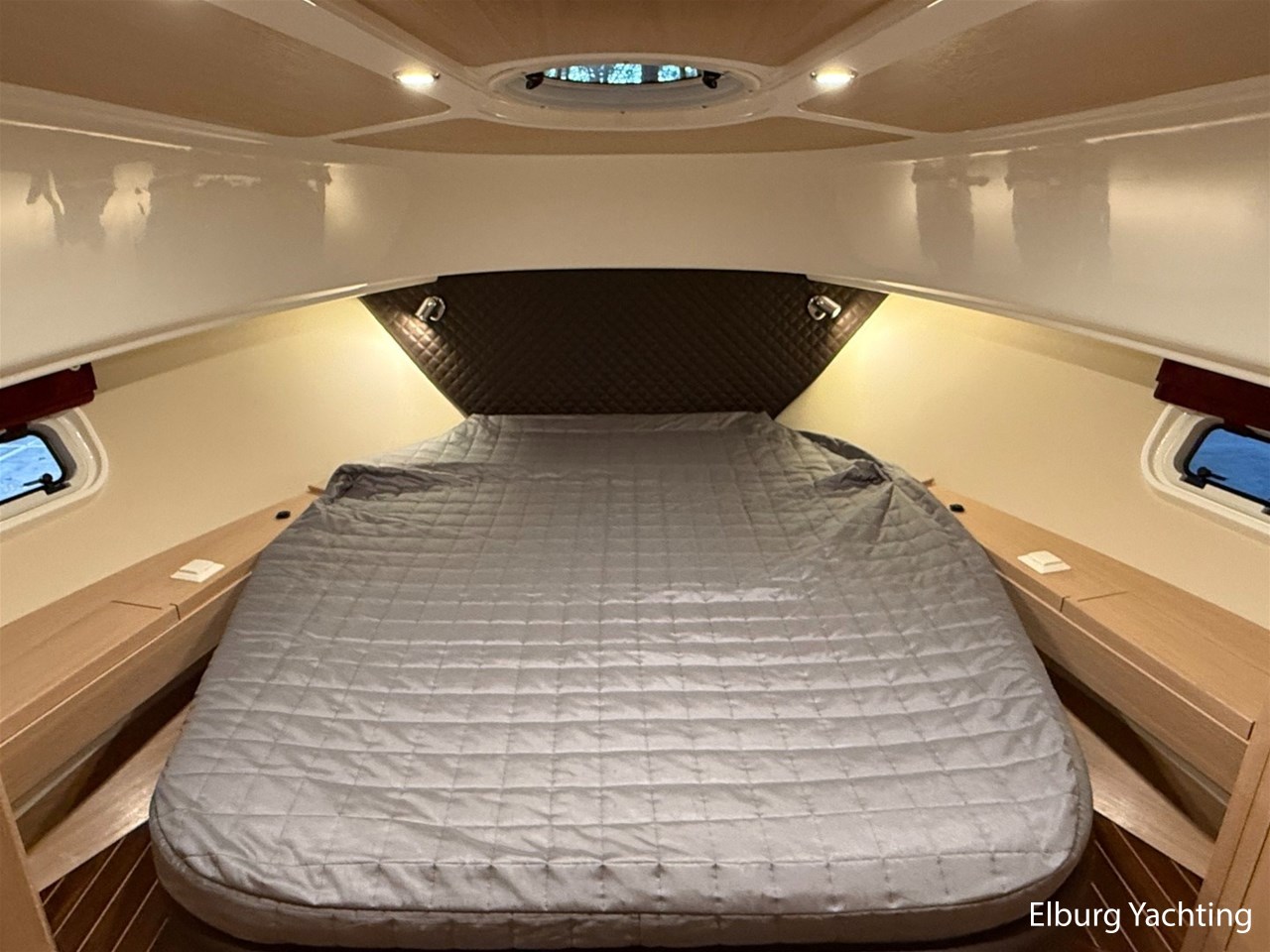 Sporty and highly seaworthy Nord Star Patrol 42 offered by its first owner. This fully equipped Scandinavian Nord Star is a true quality yacht with luxurious features. Among other things, she is equipped with a teak deck all around + swimming platform with double stainless steel guardrails with railings, fender holders, electric sunroof and large spotlights on the wheelhouse. With seaworthiness in mind, the wheelhouse is equipped with negative windscreen angles, allowing spray to fall downwards in rough seas and thus ensuring good visibility. The wheelhouse is easily accessible from the spacious open cockpit with fixed bench, cockpit tent and cosy cockpit table via the stainless steel sliding doors. The wheelhouse is very efficiently laid out, with a spacious and, above all, very cosy dinette with a lowerable table (which can also be used as a bed), TV + stereo, galley with double sink, induction hob, combi oven and worktop, and, of course, the well-organised helm on the starboard side. The wheelhouse is easily accessible on both sides via the side doors from the gangways, which is very practical when mooring and unmooring. The forward cabin is equipped with a beautiful freestanding double bed and nearby sanitary facilities (separate toilet and shower). The aft cabin is accessible from the rear of the wheelhouse and has a spacious double bed amidships and a nearby toilet with washbasin.