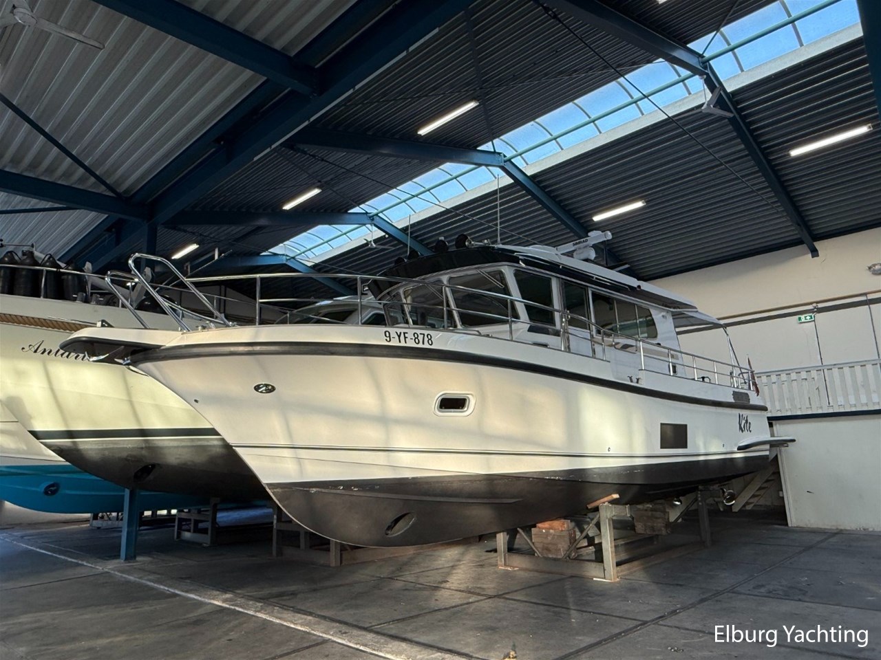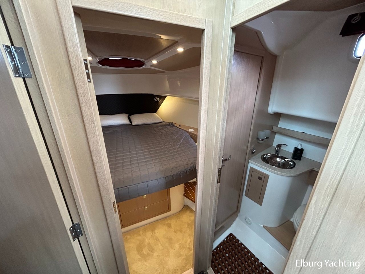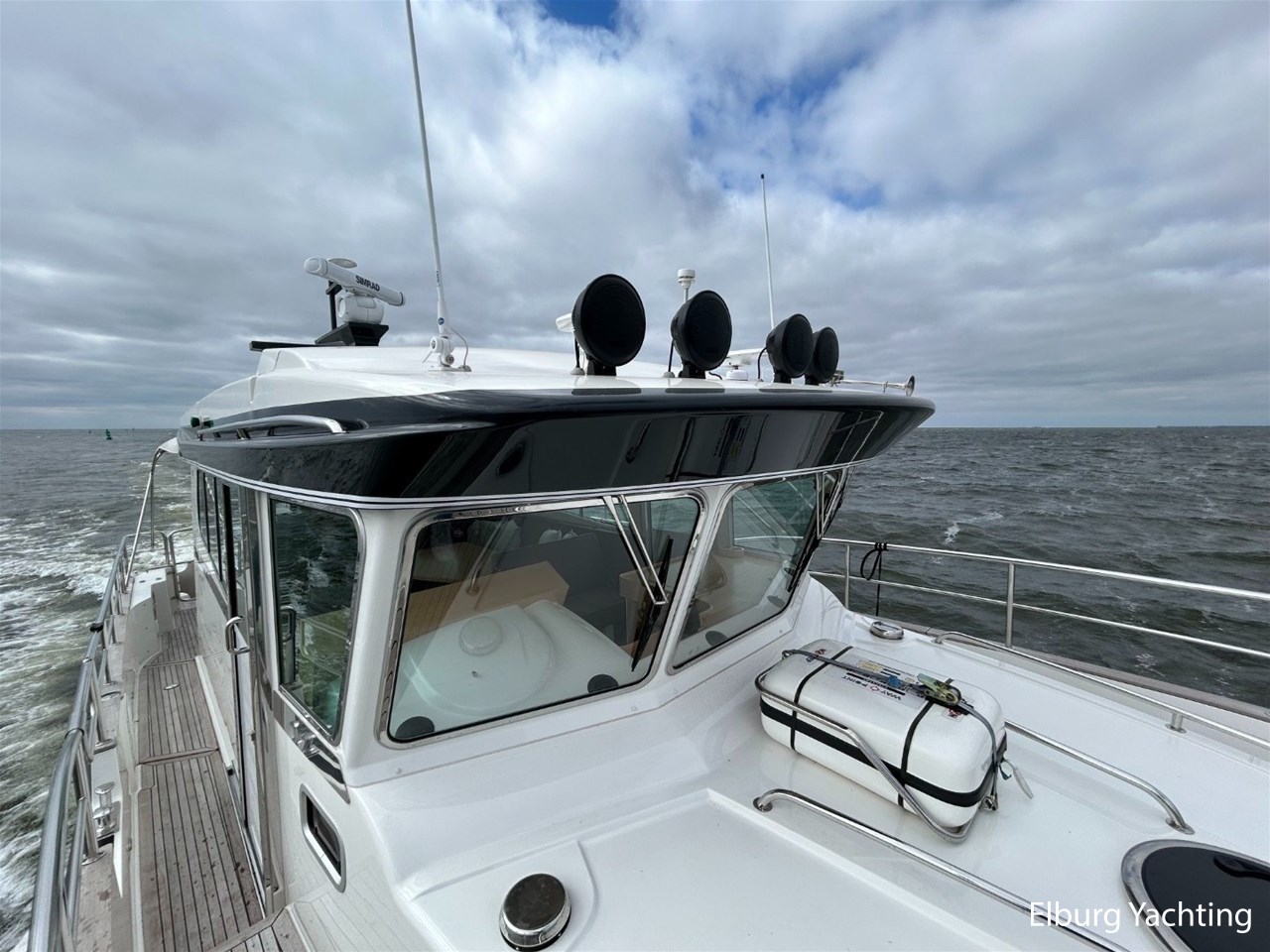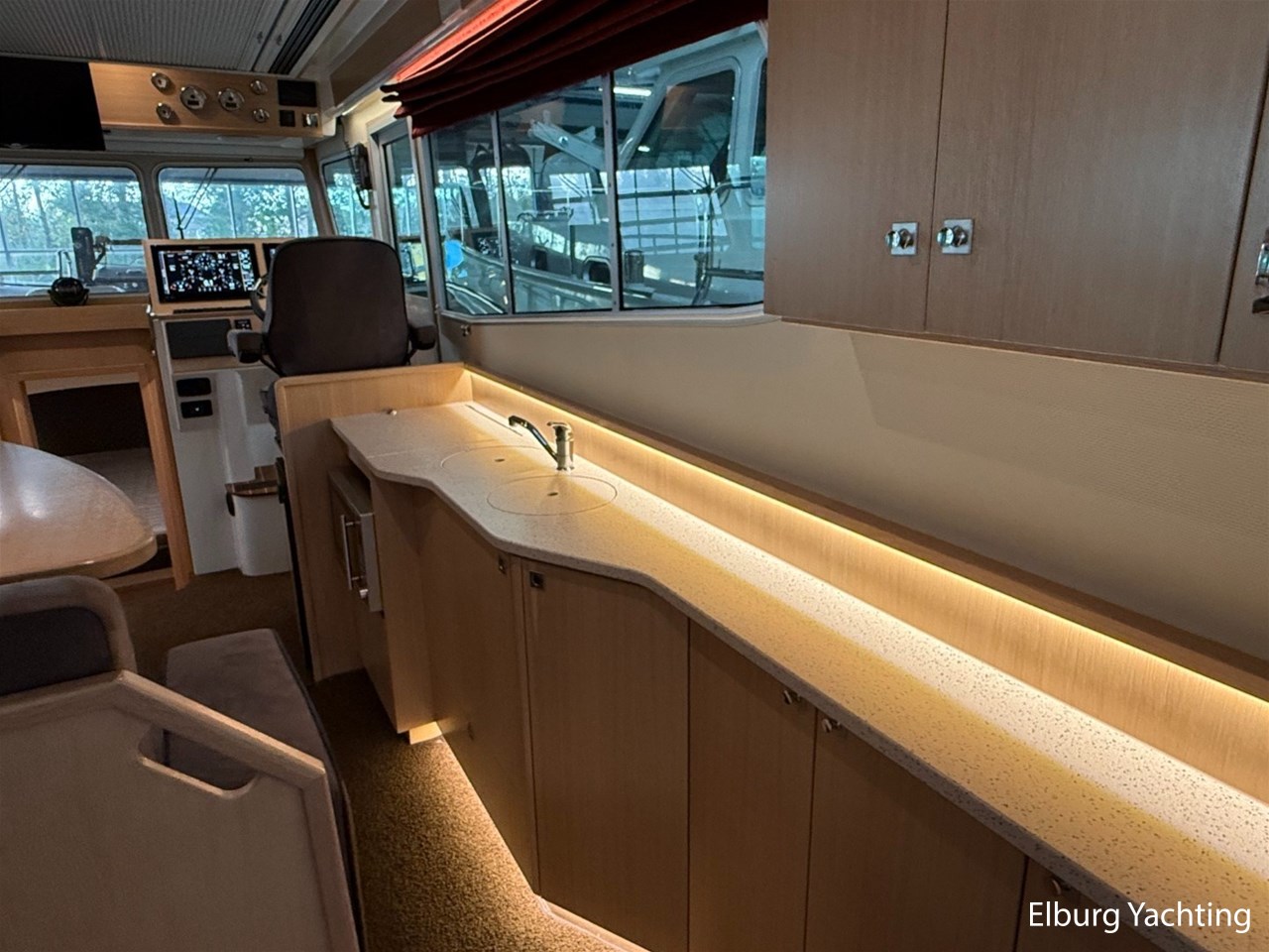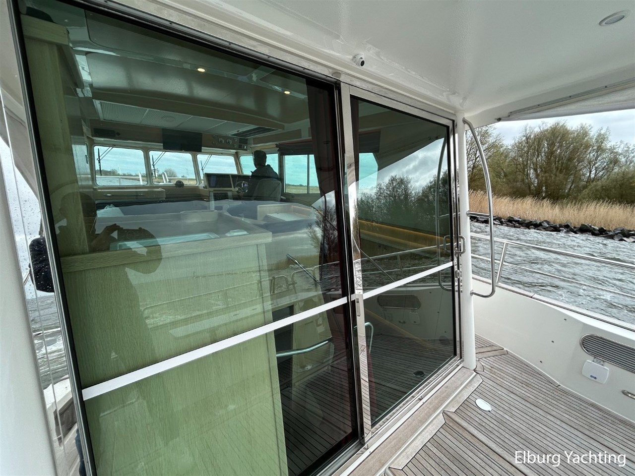 Sporty and highly seaworthy Nord Star Patrol 42 offered by its first owner. This fully equipped Scandinavian Nord Star is a true quality yacht with luxurious features. Among other things, she is equipped with a teak deck all around + swimming platform with double stainless steel guardrails with railings, fender holders, electric sunroof and large spotlights on the wheelhouse. With seaworthiness in mind, the wheelhouse is equipped with negative windscreen angles, allowing spray to fall downwards in rough seas and thus ensuring good visibility. The wheelhouse is easily accessible from the spacious open cockpit with fixed bench, cockpit tent and cosy cockpit table via the stainless steel sliding doors. The wheelhouse is very efficiently laid out, with a spacious and, above all, very cosy dinette with a lowerable table (which can also be used as a bed), TV + stereo, galley with double sink, induction hob, combi oven and worktop, and, of course, the well-organised helm on the starboard side. The wheelhouse is easily accessible on both sides via the side doors from the gangways, which is very practical when mooring and unmooring. The forward cabin is equipped with a beautiful freestanding double bed and nearby sanitary facilities (separate toilet and shower). The aft cabin is accessible from the rear of the wheelhouse and has a spacious double bed amidships and a nearby toilet with washbasin.