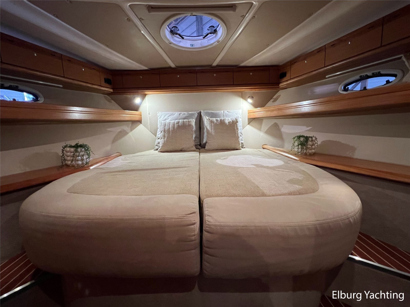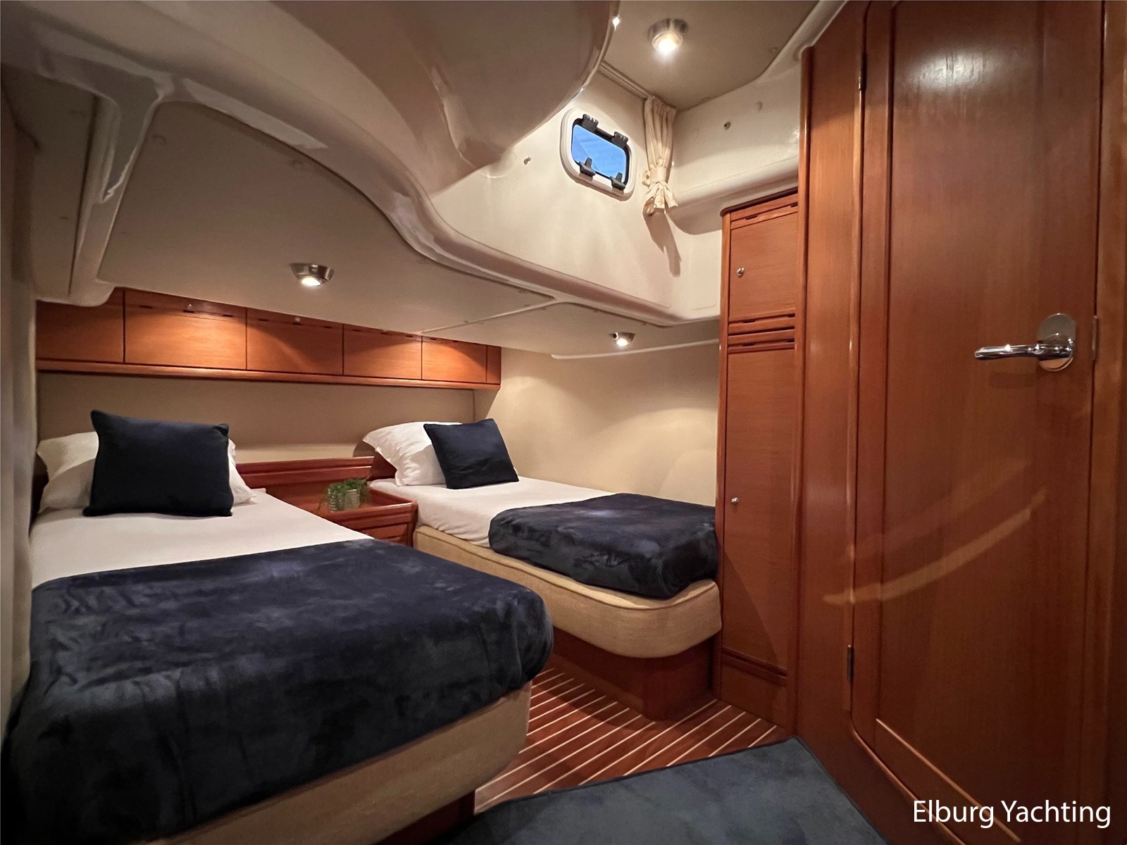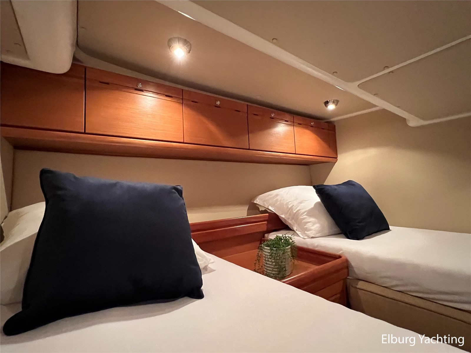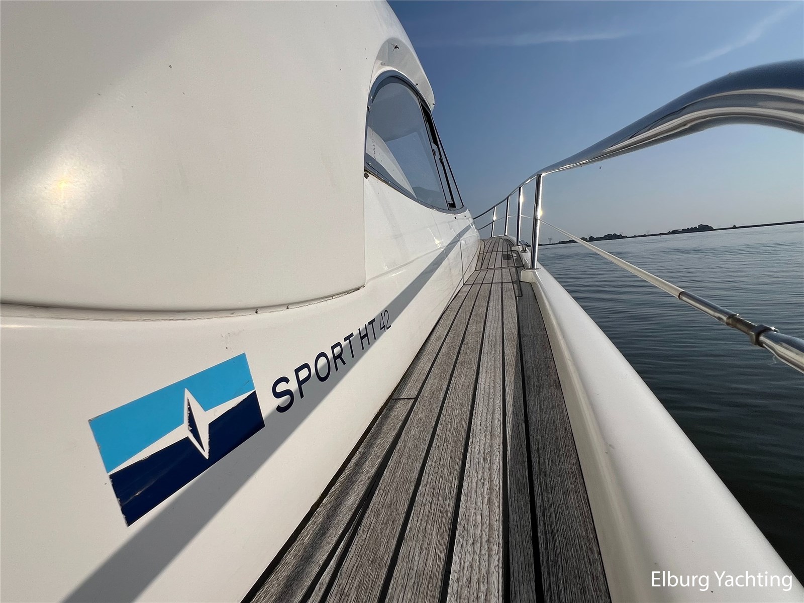 The Bavaria 42 HT Sport combines practical space and good sailing characteristics to be a sporty all-rounder suitable for both inland and open waters. The Bavaria 42 HT is characterized by its fixed superstructure (hardtop) with a large, electrical operated convertible roof, ideal for enjoying good weather or convenient retractable in inclement weather. The entire aft-deck can be closed off with a canopy featuring large removable windows. The hydraulically lowerable swim platform is convenient for bringing a dinghy or for easy entry and exit during a swim. The aft deck features a sunbed with ample storage space underneath. The engine room is accessible from the cockpit via an electrically operated hatch. A passenger bench is positioned facing the sailing direction of travel. The wetbar in the cockpit offers a grill, sink, and refrigerator. The saloon and galley are located below deck. The 2m+ headroom is immediately noticeable and creates a feeling of spaciousness. The forward cabin features a double French bed with its own en-suite bathroom (toilet/shower). A second double cabin is located amidships, also equipped with its own en-suite bathroom. In 2025, various upgrades were carried out, including new antifouling, anodes, life jackets, a wireless headset intercom system, new fenders with covers, stainless steel boat supports (also suitable for a jetski), a Wi-Fi installation, two smart TVs, a Bluetooth radio, custom-made mattresses, and a trickle charger.