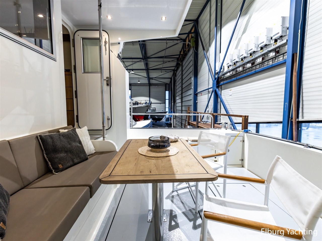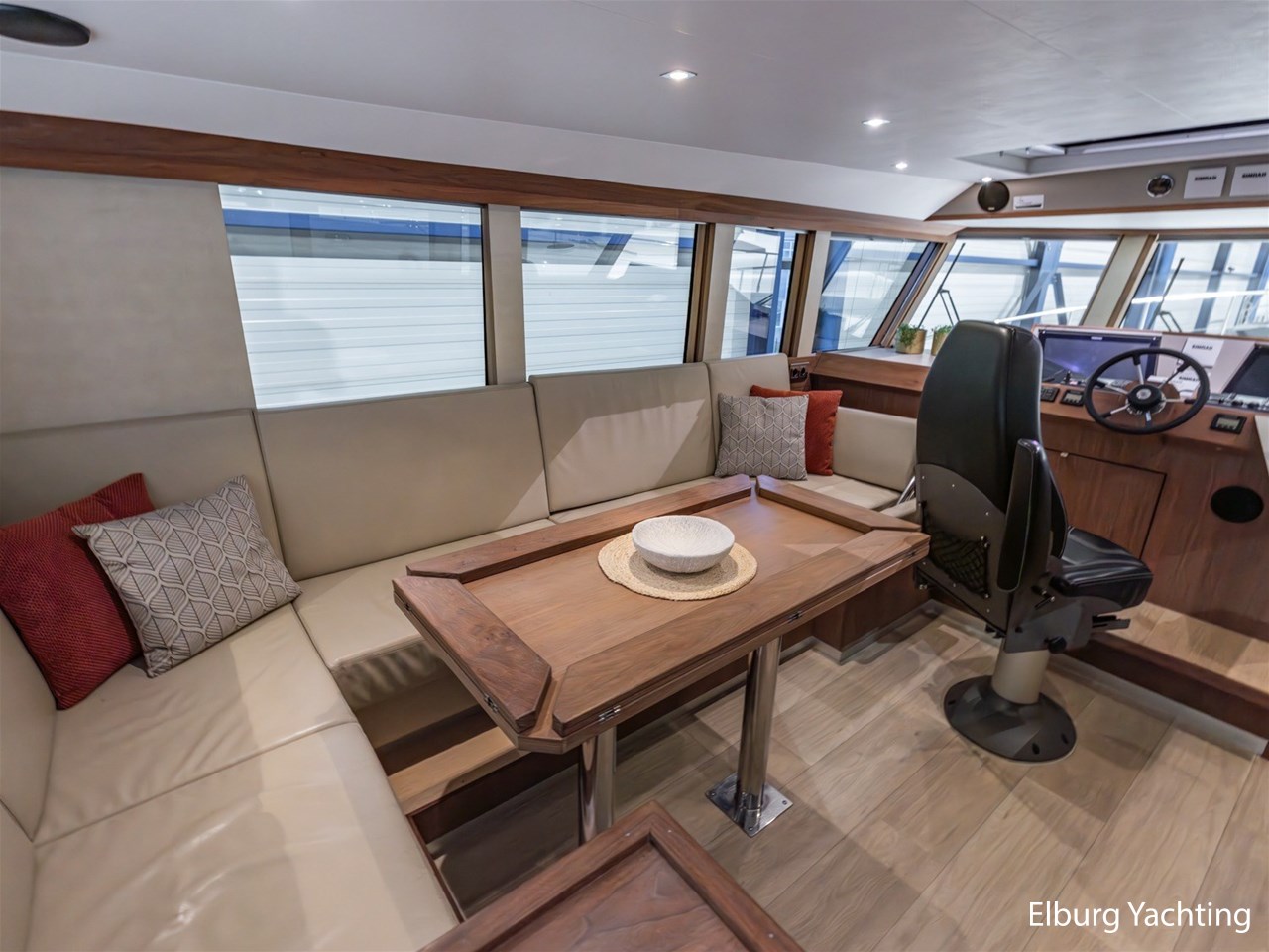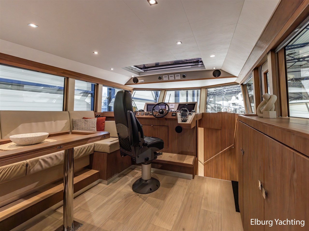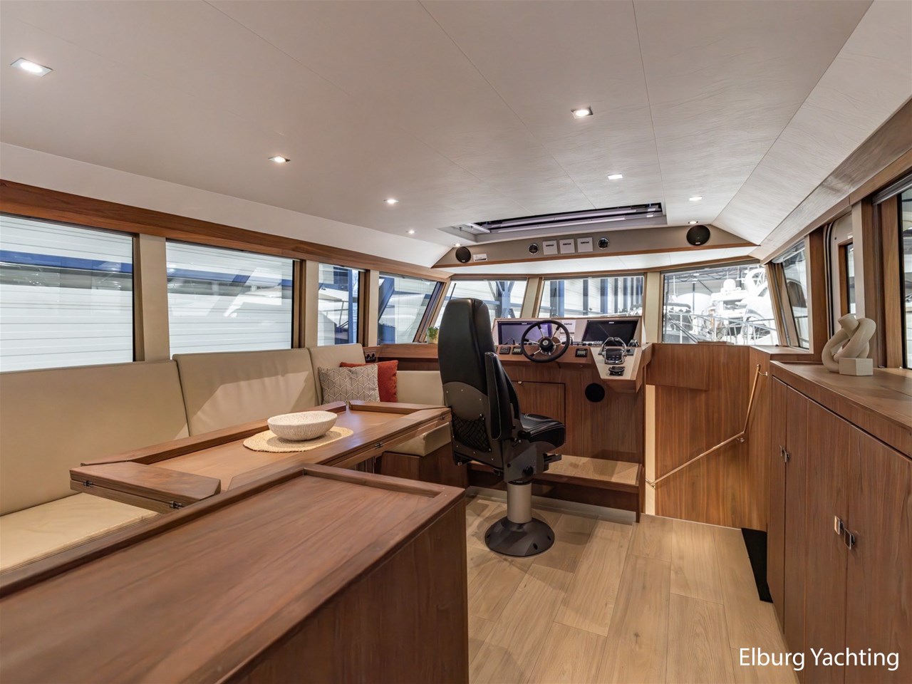 The ship has been proofen well maintained under the current and first owner. The extensive and professional Simrad navigation tools, AIS transponder and Simrad 4G radar ensure a comfortable trip with a high level of safety. The high-quality 2-component polyurethane blue hull coating is in good condition together with the rest of the ship. The Volvo Penta D6 diesel engines (435 hp each) drive the propellers built into half tunnels, which ensures less vulnerability, better protection and less draft. The D-fenders all around provide even greater stability (= safety) in bad weather. Plenty of storage space due to numerous cupboards and drawers throughout the ship. The ship is equipped with: Spacious and sunken open cockpit for a sheltered seat with fixed bench incl. accompanying cushions, the cockpit is equipped with a canopy with night/work lighting and can be extended with a canvas sunshade, cockpit with closed (deep) lockers, spacious storage hatch in the stern, foldable transom that can be used as a bathing platform, wheelhouse/saloon entrance via rear and side door (SB), full view all-round from the steering position, luxurious Norsapp helm seat, professionally furnished dashboard with high-quality Simrad navigation instruments, There is a WiFi on-board network via 4G, for the co-pilot there is an electrically height-adjustable co-pilot seat, which in rest position can also be adjusted to a cozy seat at the saloon table, the interior is equipped with comfortable underfloor heating, blinds and pleated blinds, Samsung TV on lift in saloon, Samsung TV in front cabin, large sliding roof above steering position, Bosch kitchen appliances with an induction cooking plate / microwave oven / dishwasher, mosquito screens, Samsung washer/dryer combination, electrically equipment housed in the "technical room". In the bow there is room for storage of items such as mooring lines and fenders incl. the anchor chain. The engine room has an automatic extinguishing system & double fuel filters. The radar bracket is electrically foldable, as is the transom, which can be electrically operated both in the cockpit outside and on the dashboard inside. A comfortable sailing speed for inland waterways is around 6 á 7 knots, with a total consumption of approximately 10 liters per hour. The maximum speed is approximately 25 knots. A more extensive consumption table is available on request. The clearance height with the folded bracket is approx. 3.60 meters and with the bracket up it is approx. 6.20 meters.