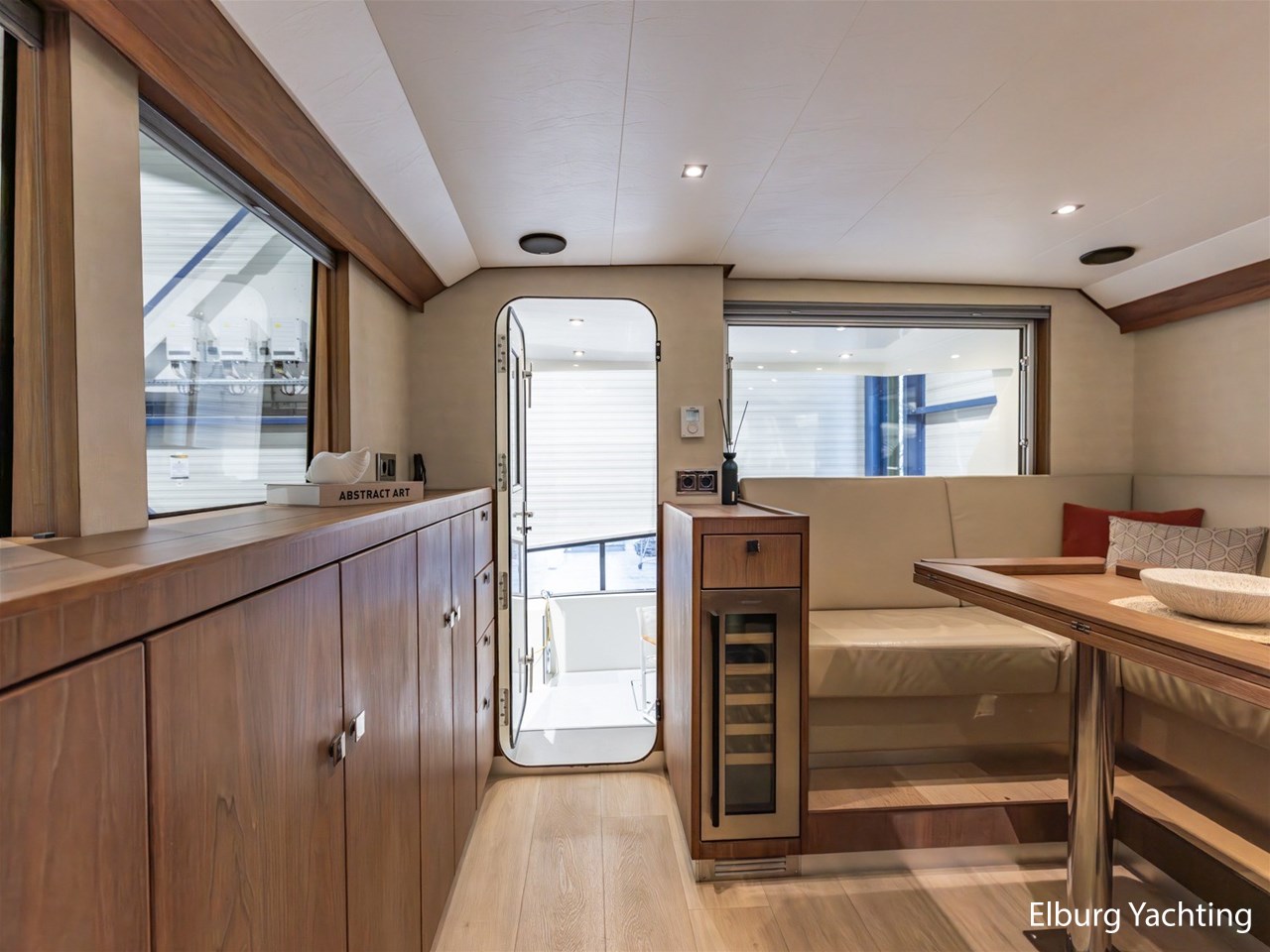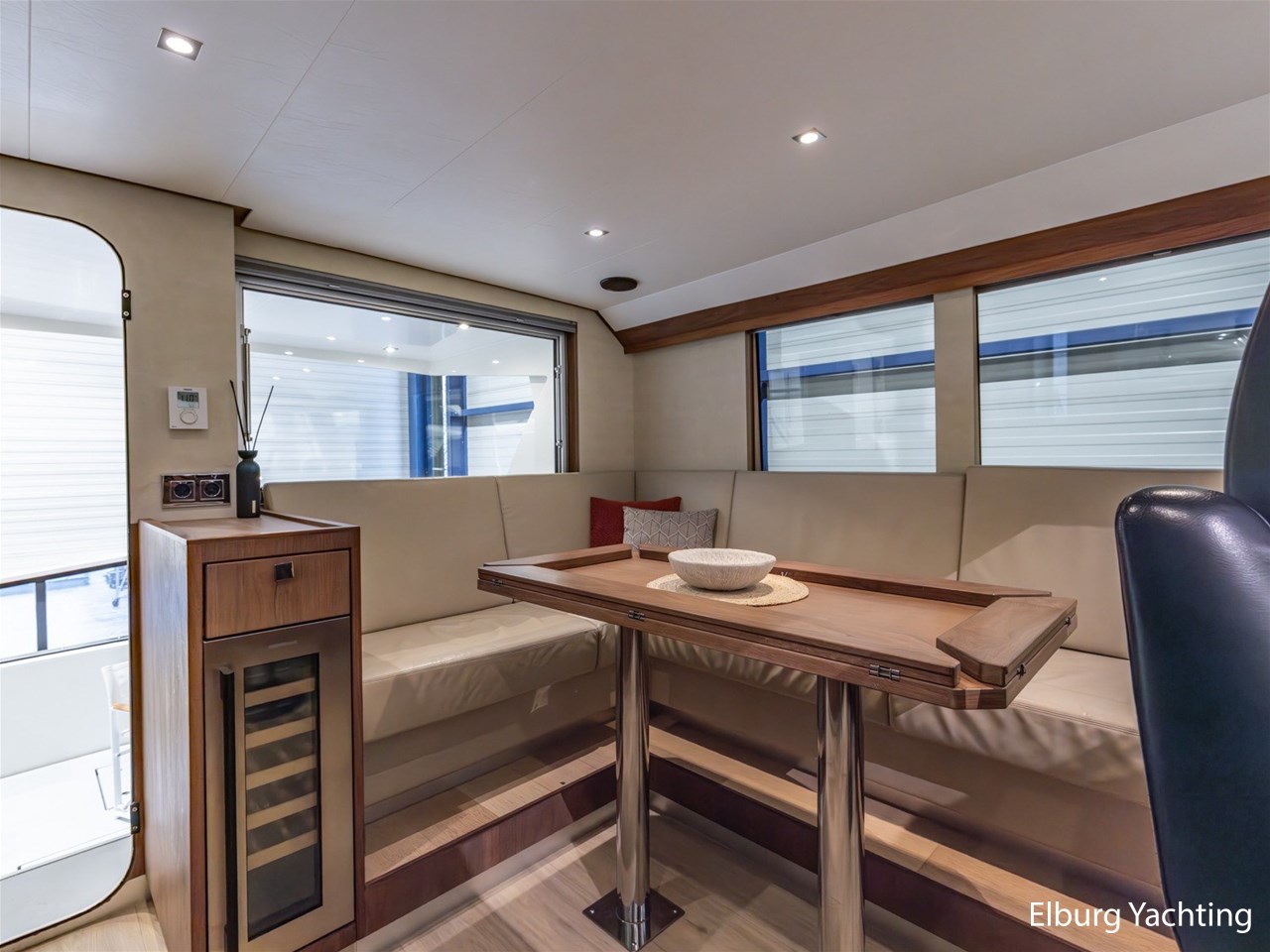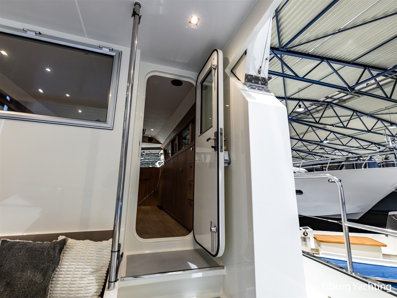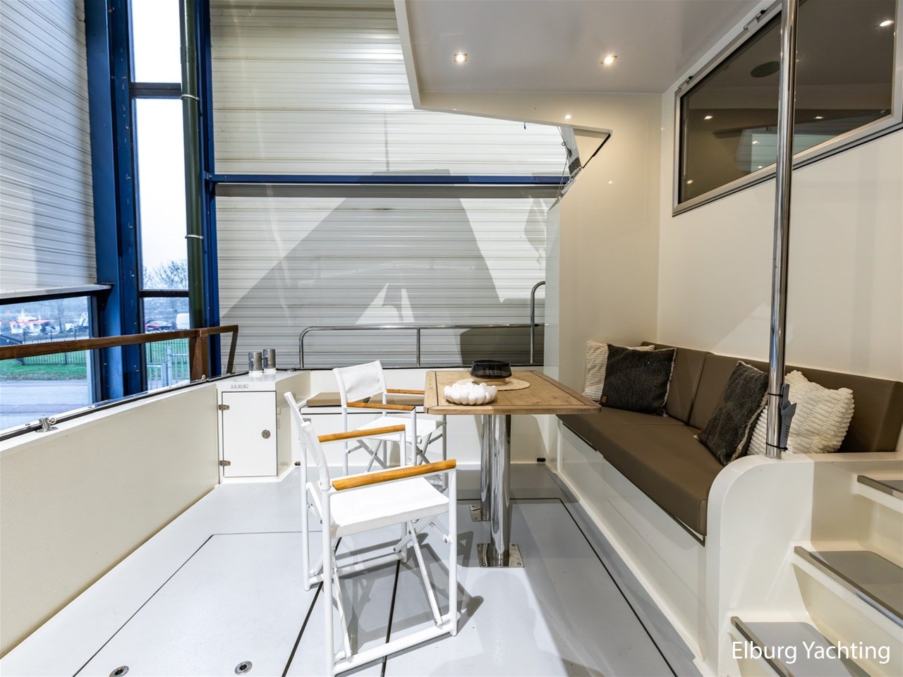 The ship has been proofen well maintained under the current and first owner. The extensive and professional Simrad navigation tools, AIS transponder and Simrad 4G radar ensure a comfortable trip with a high level of safety. The high-quality 2-component polyurethane blue hull coating is in good condition together with the rest of the ship. The Volvo Penta D6 diesel engines (435 hp each) drive the propellers built into half tunnels, which ensures less vulnerability, better protection and less draft. The D-fenders all around provide even greater stability (= safety) in bad weather. Plenty of storage space due to numerous cupboards and drawers throughout the ship. The ship is equipped with: Spacious and sunken open cockpit for a sheltered seat with fixed bench incl. accompanying cushions, the cockpit is equipped with a canopy with night/work lighting and can be extended with a canvas sunshade, cockpit with closed (deep) lockers, spacious storage hatch in the stern, foldable transom that can be used as a bathing platform, wheelhouse/saloon entrance via rear and side door (SB), full view all-round from the steering position, luxurious Norsapp helm seat, professionally furnished dashboard with high-quality Simrad navigation instruments, There is a WiFi on-board network via 4G, for the co-pilot there is an electrically height-adjustable co-pilot seat, which in rest position can also be adjusted to a cozy seat at the saloon table, the interior is equipped with comfortable underfloor heating, blinds and pleated blinds, Samsung TV on lift in saloon, Samsung TV in front cabin, large sliding roof above steering position, Bosch kitchen appliances with an induction cooking plate / microwave oven / dishwasher, mosquito screens, Samsung washer/dryer combination, electrically equipment housed in the "technical room". In the bow there is room for storage of items such as mooring lines and fenders incl. the anchor chain. The engine room has an automatic extinguishing system & double fuel filters. The radar bracket is electrically foldable, as is the transom, which can be electrically operated both in the cockpit outside and on the dashboard inside. A comfortable sailing speed for inland waterways is around 6 á 7 knots, with a total consumption of approximately 10 liters per hour. The maximum speed is approximately 25 knots. A more extensive consumption table is available on request. The clearance height with the folded bracket is approx. 3.60 meters and with the bracket up it is approx. 6.20 meters.