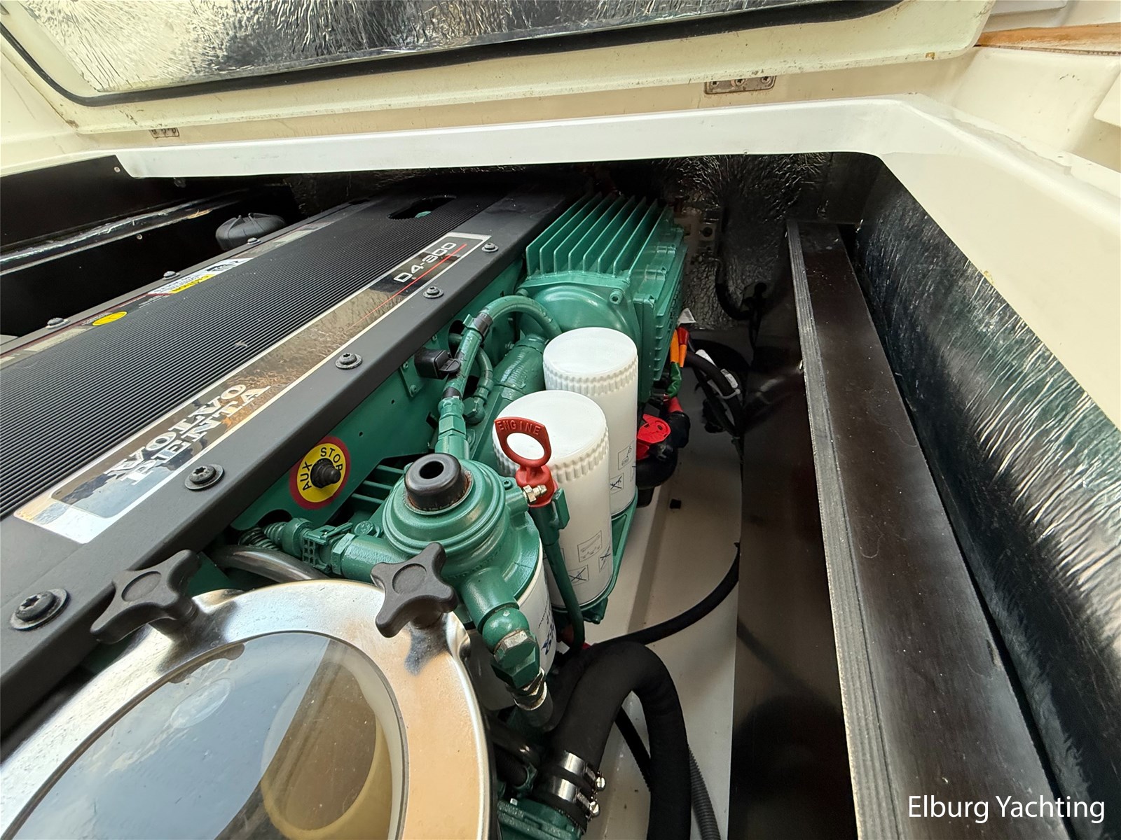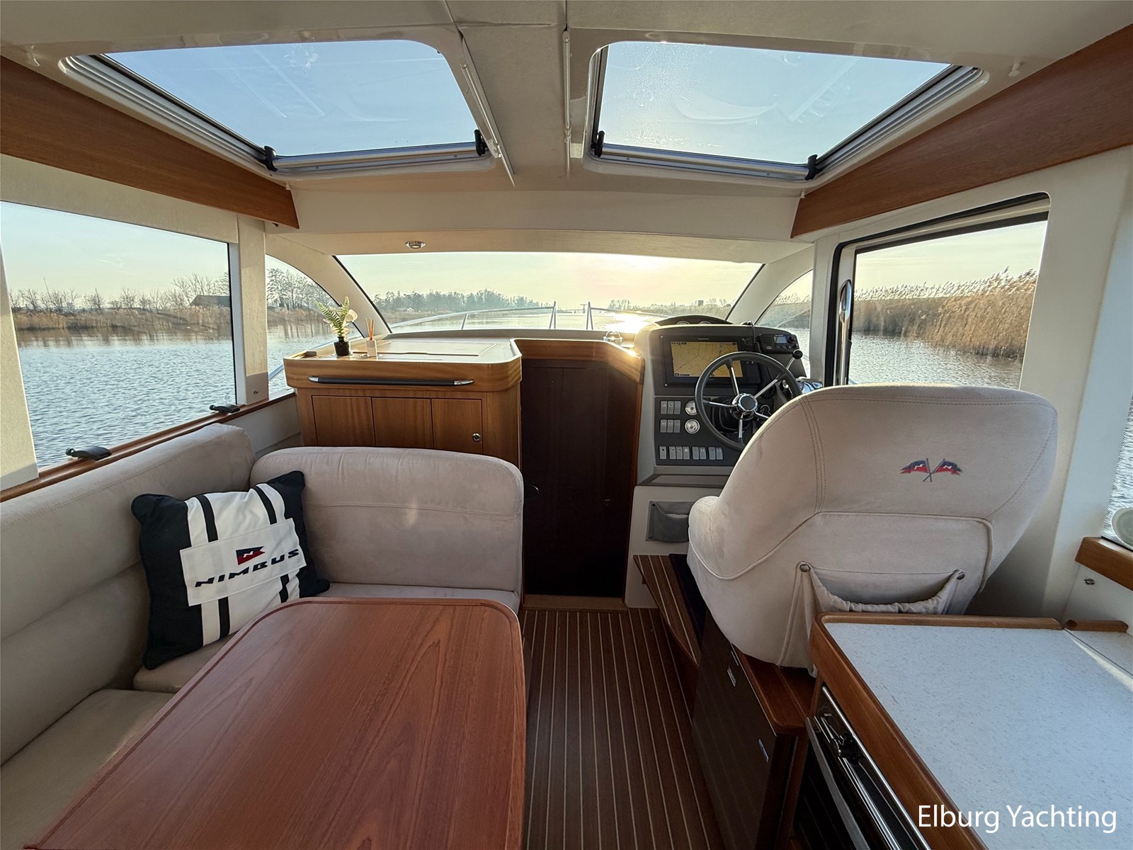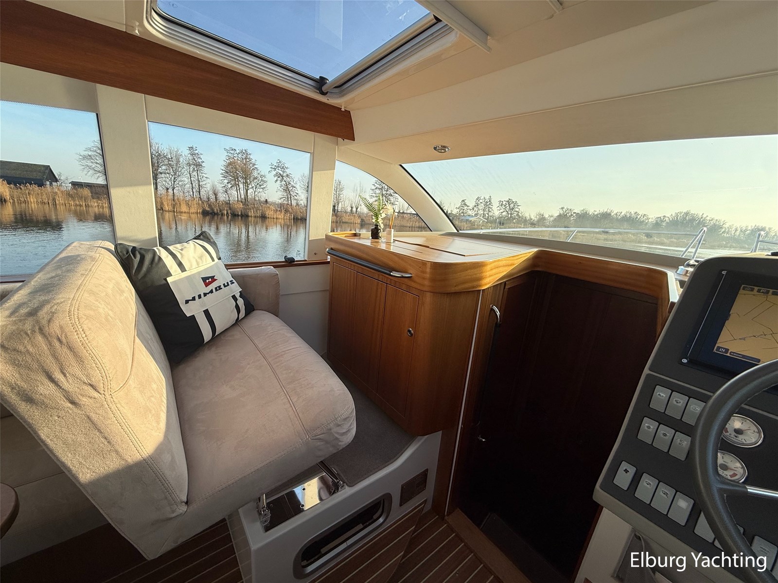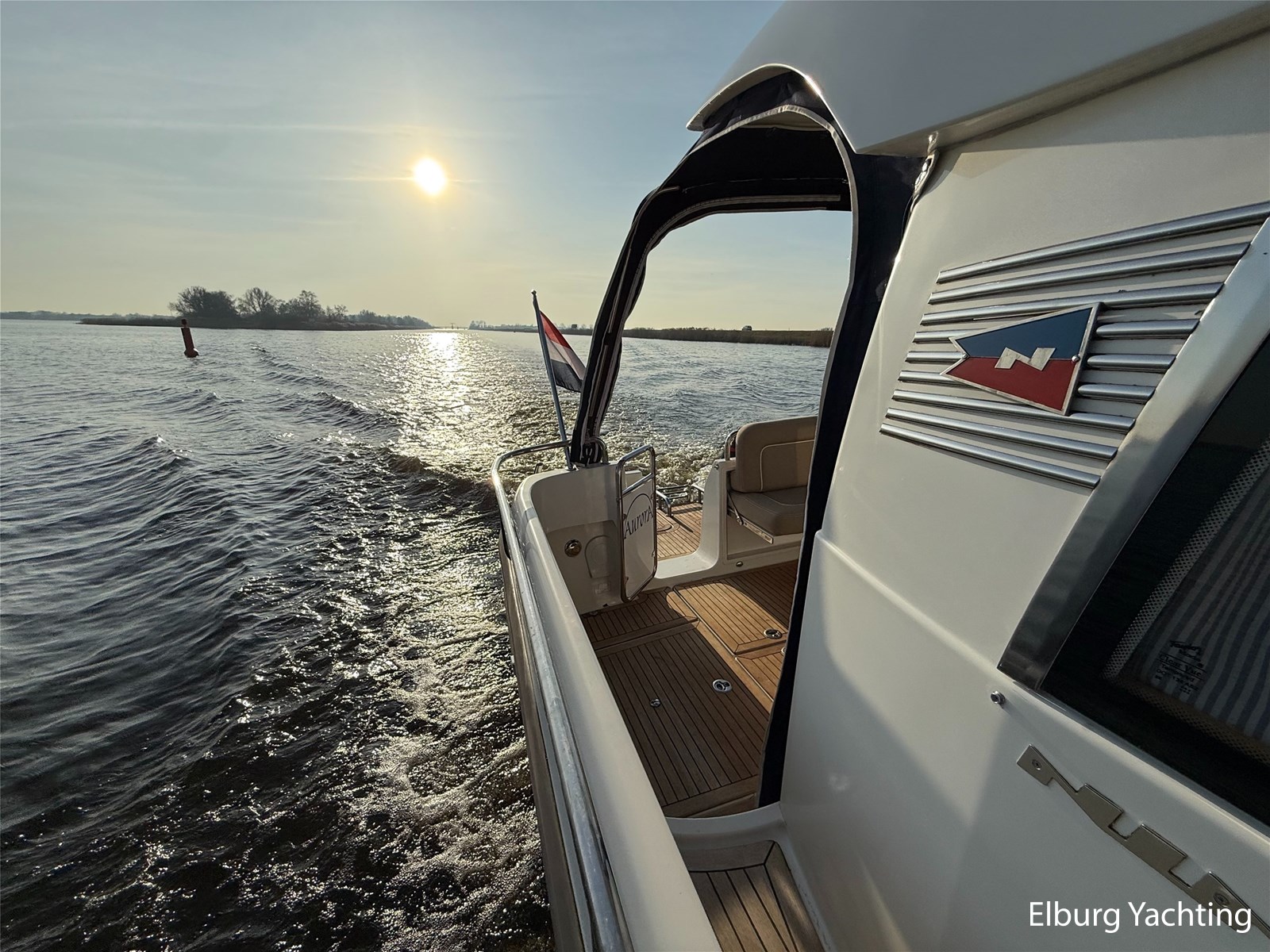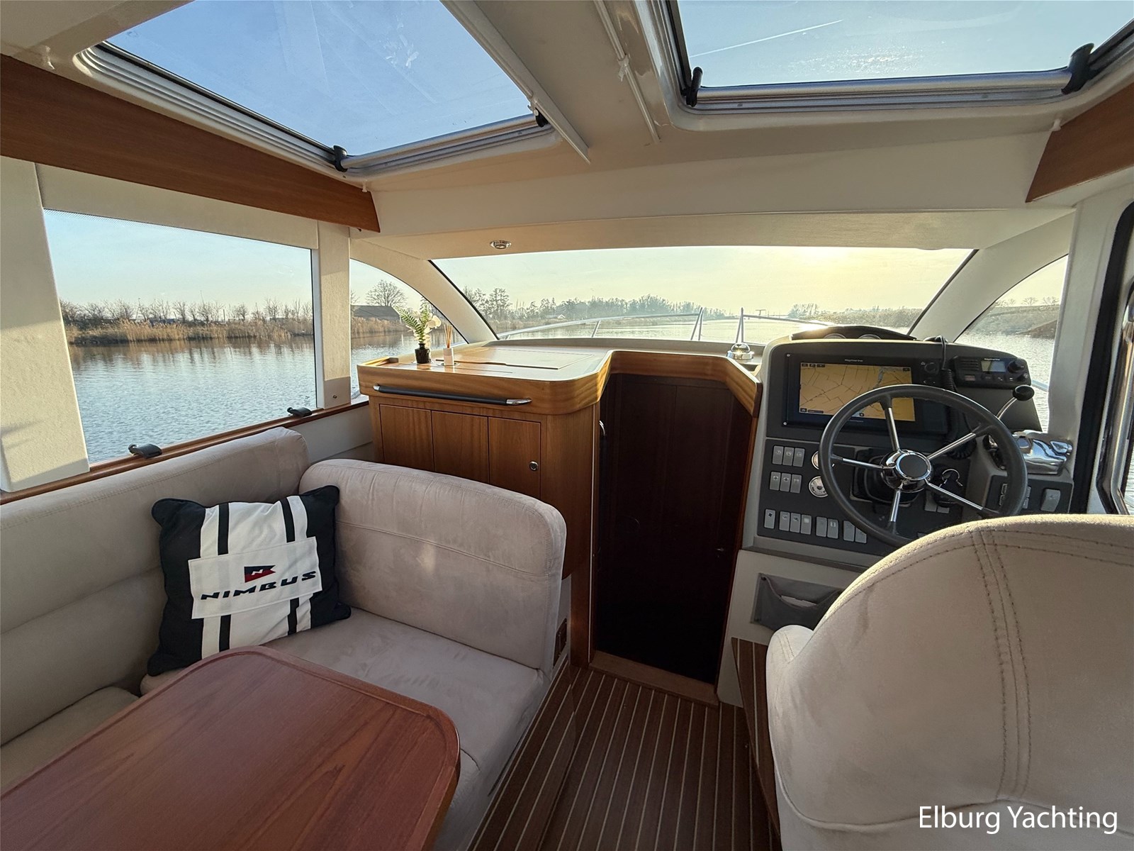 The Nimbus 335 features a spacious and well-maintained cockpit where comfort and functionality come together beautifully. The bench with cushions invites relaxing moments on board, while the deep storage locker offers practical space. Thanks to the fully closable cockpit tent, this outdoor area remains a pleasant place to stay even in less favorable weather. A convenient passage leads to the swim platform. The saloon is accessible via a sliding door and offers, on the starboard side, the galley and helm station. The helm station includes a practical side door to the side deck. To port, there's a comfortable dinette with a height-adjustable table. Forward, opposite the helm, is a foldable co-pilot seat with a retractable TV. The combination of mahogany woodwork and light upholstery creates a warm, stylish Scandinavian atmosphere. In 2025, several items were renewed, including the toilet, radar, inverter, VHF radio, Fusion stereo, and mattresses. The heat exchanger was overhauled. The yacht received new antifouling and a thorough cleaning and polishing in 2025. The engine was serviced in 2025, and the plotter was replaced in 2023. Large hatches in the cockpit floor provide excellent access to the engine compartment, storage space, and technical installations. Average fuel consumption at 5–6 knots was approximately 3 liters per hour.