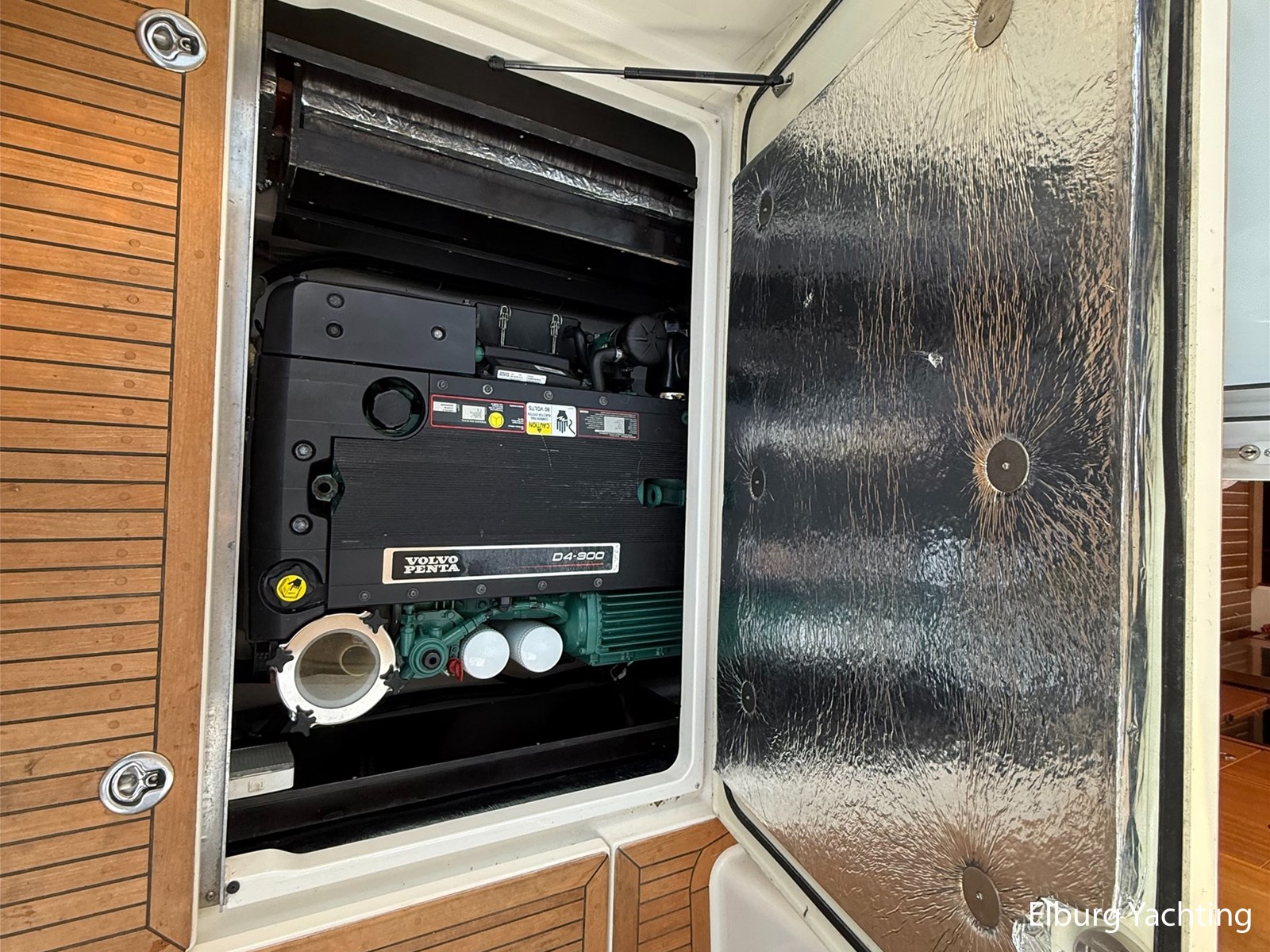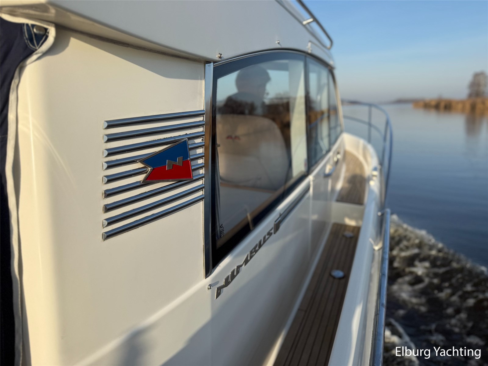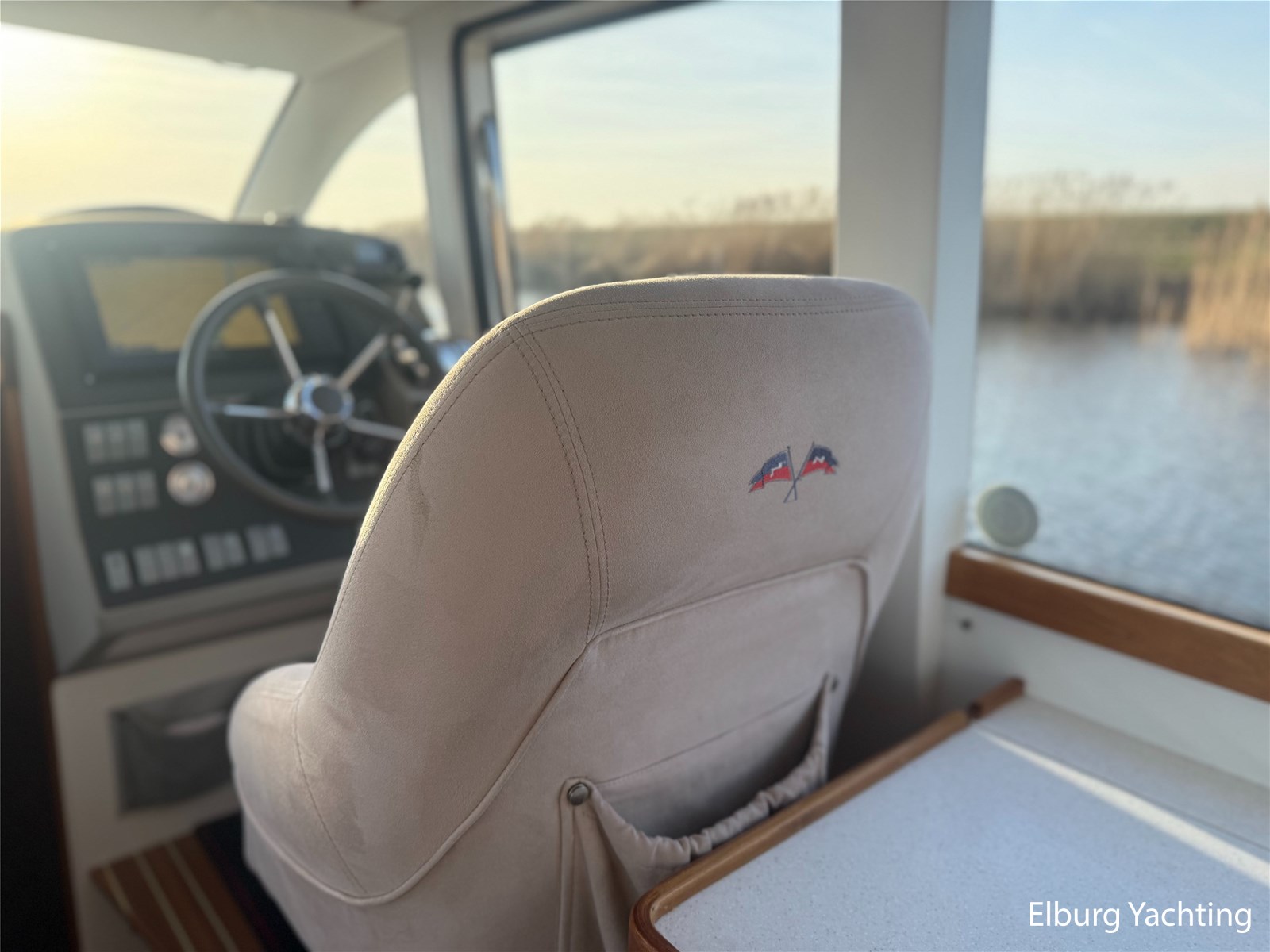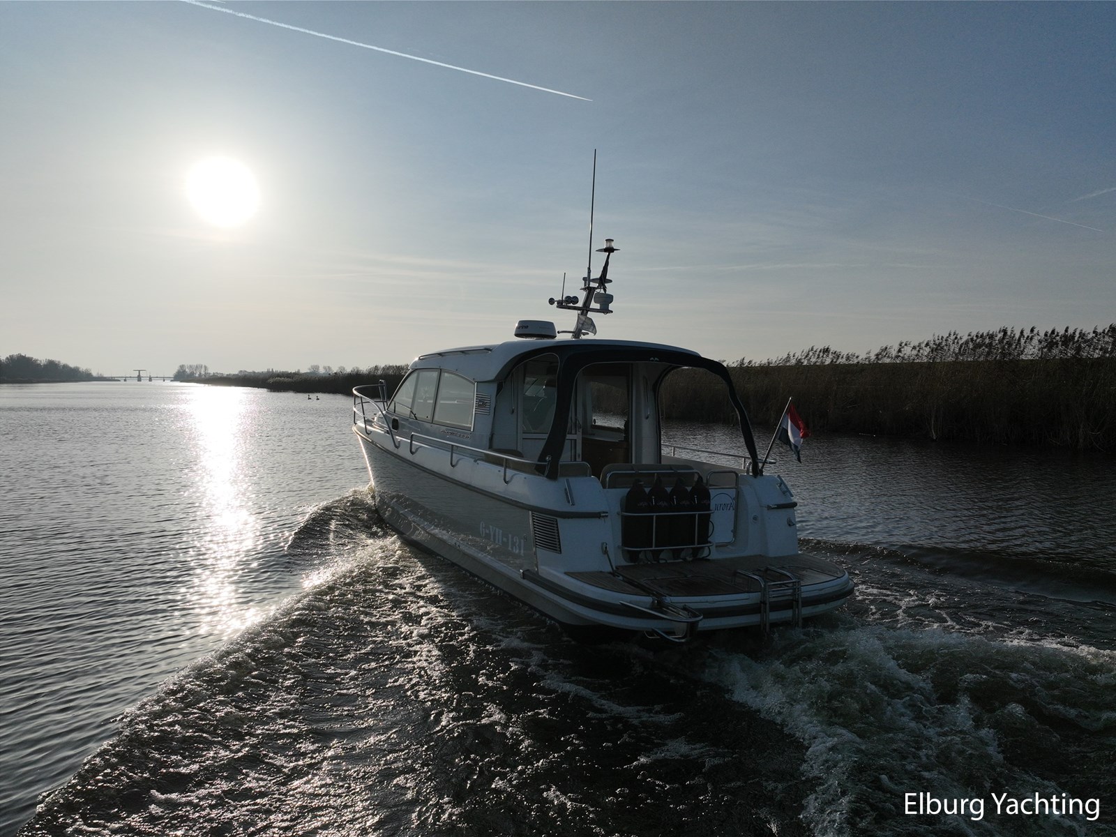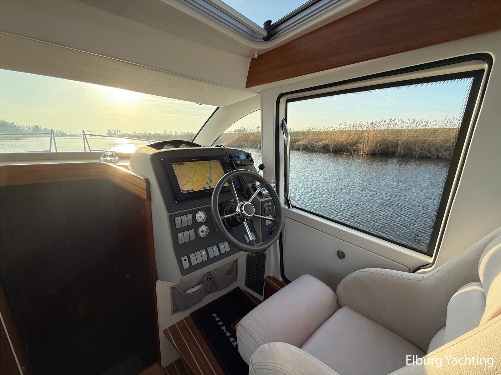 The Nimbus 335 features a spacious and well-maintained cockpit where comfort and functionality come together beautifully. The bench with cushions invites relaxing moments on board, while the deep storage locker offers practical space. Thanks to the fully closable cockpit tent, this outdoor area remains a pleasant place to stay even in less favorable weather. A convenient passage leads to the swim platform. The saloon is accessible via a sliding door and offers, on the starboard side, the galley and helm station. The helm station includes a practical side door to the side deck. To port, there's a comfortable dinette with a height-adjustable table. Forward, opposite the helm, is a foldable co-pilot seat with a retractable TV. The combination of mahogany woodwork and light upholstery creates a warm, stylish Scandinavian atmosphere. In 2025, several items were renewed, including the toilet, radar, inverter, VHF radio, Fusion stereo, and mattresses. The heat exchanger was overhauled. The yacht received new antifouling and a thorough cleaning and polishing in 2025. The engine was serviced in 2025, and the plotter was replaced in 2023. Large hatches in the cockpit floor provide excellent access to the engine compartment, storage space, and technical installations. Average fuel consumption at 5–6 knots was approximately 3 liters per hour.