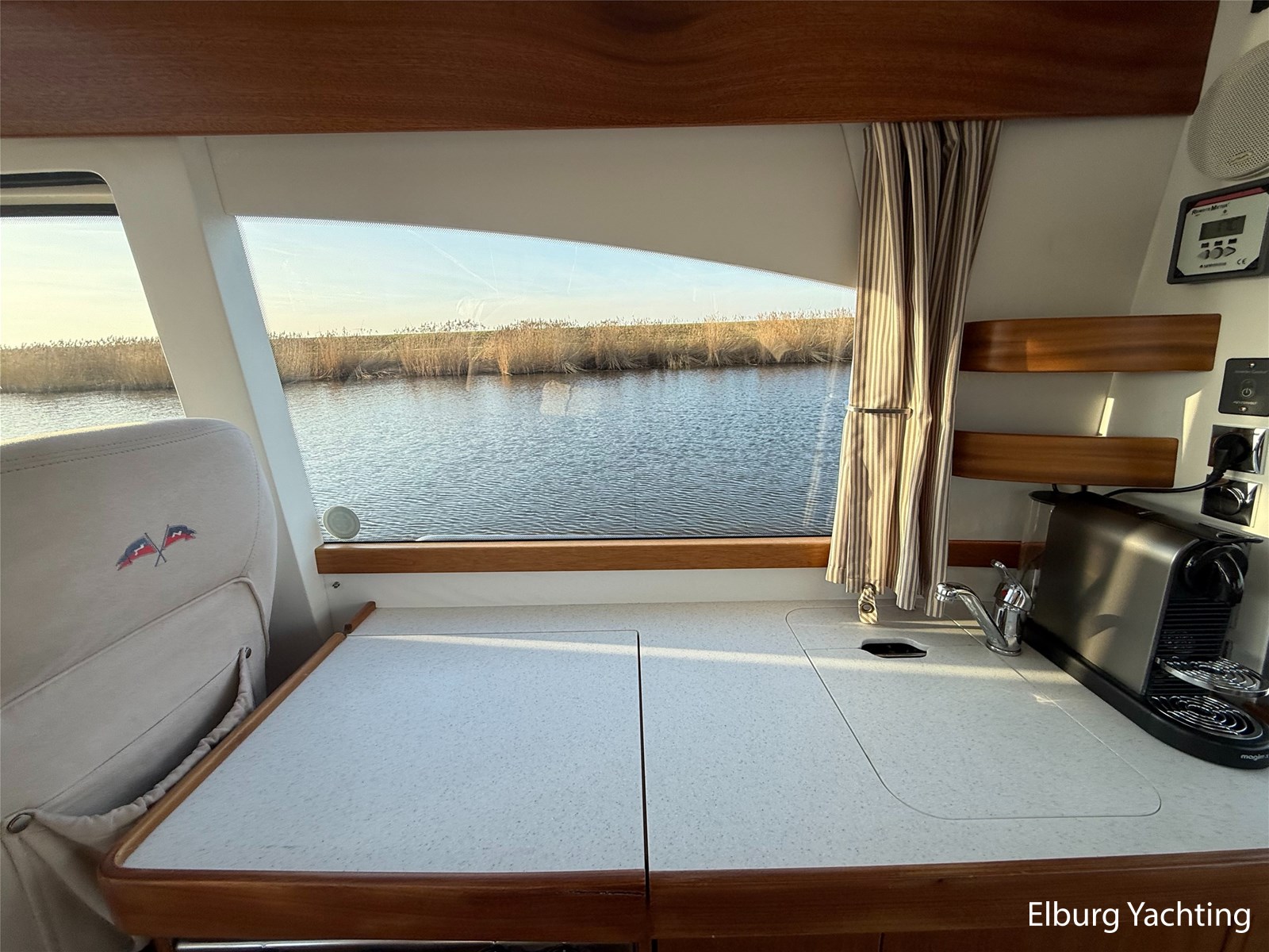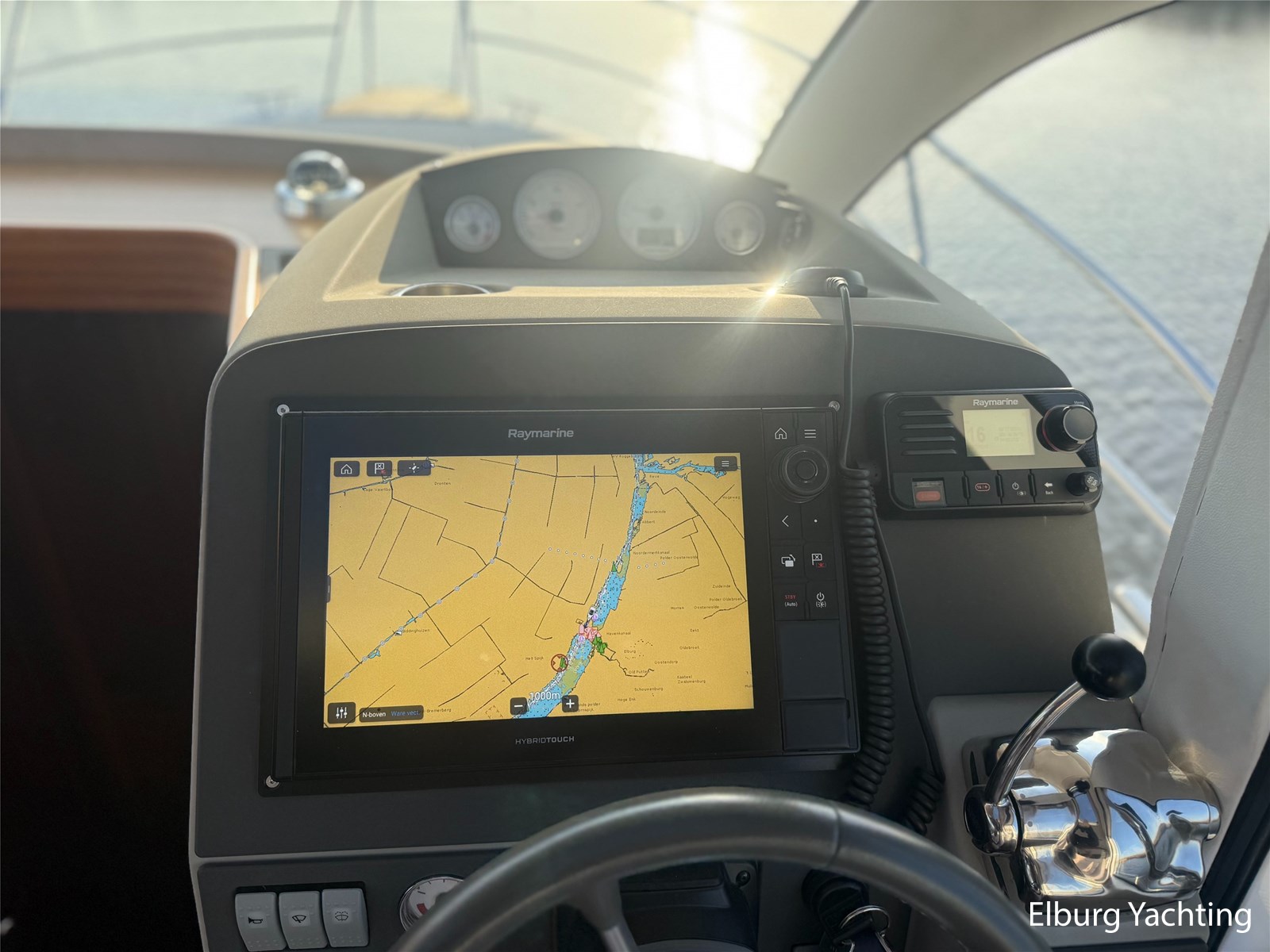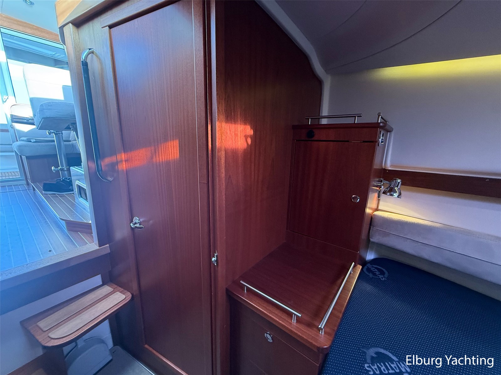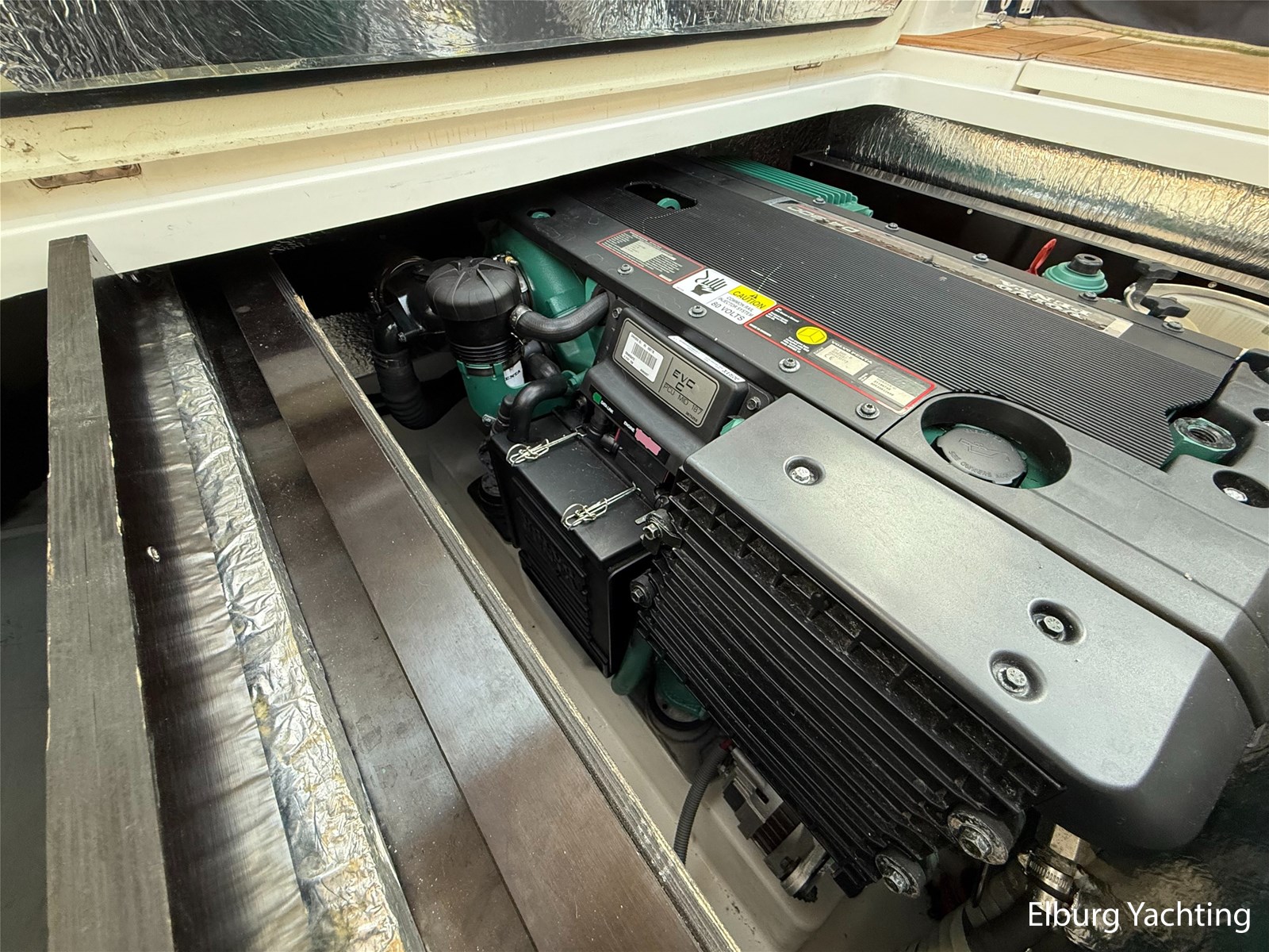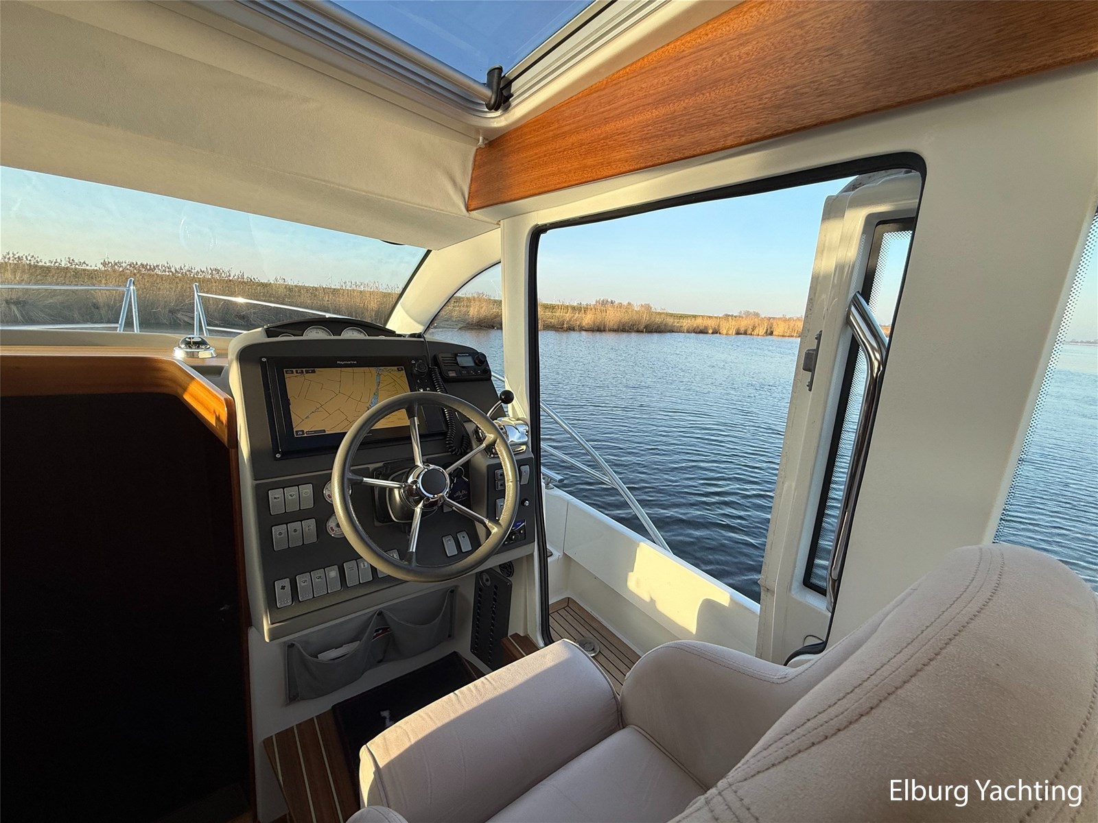 The Nimbus 335 features a spacious and well-maintained cockpit where comfort and functionality come together beautifully. The bench with cushions invites relaxing moments on board, while the deep storage locker offers practical space. Thanks to the fully closable cockpit tent, this outdoor area remains a pleasant place to stay even in less favorable weather. A convenient passage leads to the swim platform. The saloon is accessible via a sliding door and offers, on the starboard side, the galley and helm station. The helm station includes a practical side door to the side deck. To port, there's a comfortable dinette with a height-adjustable table. Forward, opposite the helm, is a foldable co-pilot seat with a retractable TV. The combination of mahogany woodwork and light upholstery creates a warm, stylish Scandinavian atmosphere. In 2025, several items were renewed, including the toilet, radar, inverter, VHF radio, Fusion stereo, and mattresses. The heat exchanger was overhauled. The yacht received new antifouling and a thorough cleaning and polishing in 2025. The engine was serviced in 2025, and the plotter was replaced in 2023. Large hatches in the cockpit floor provide excellent access to the engine compartment, storage space, and technical installations. Average fuel consumption at 5–6 knots was approximately 3 liters per hour.