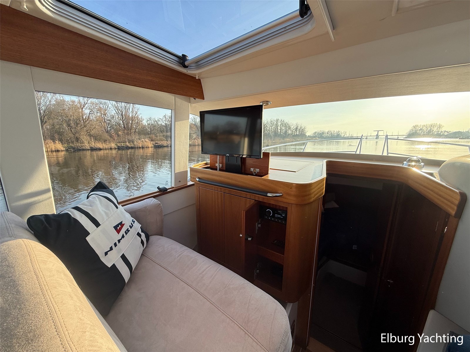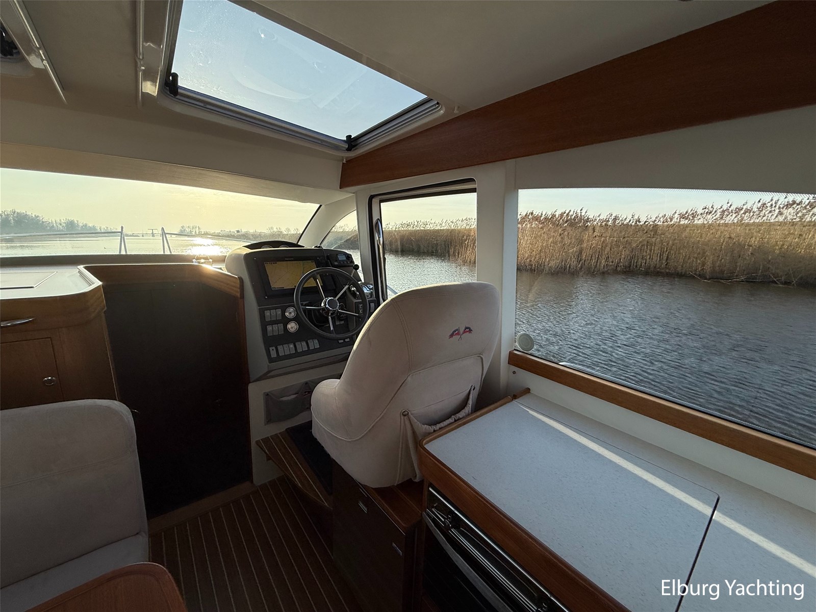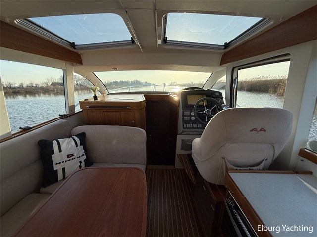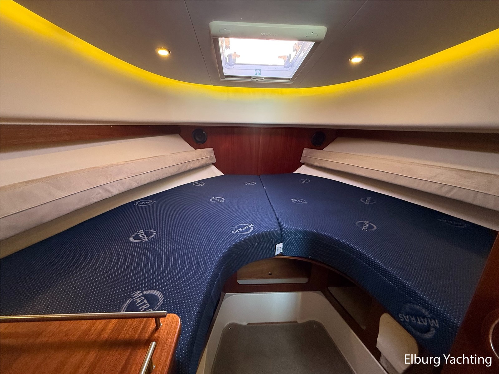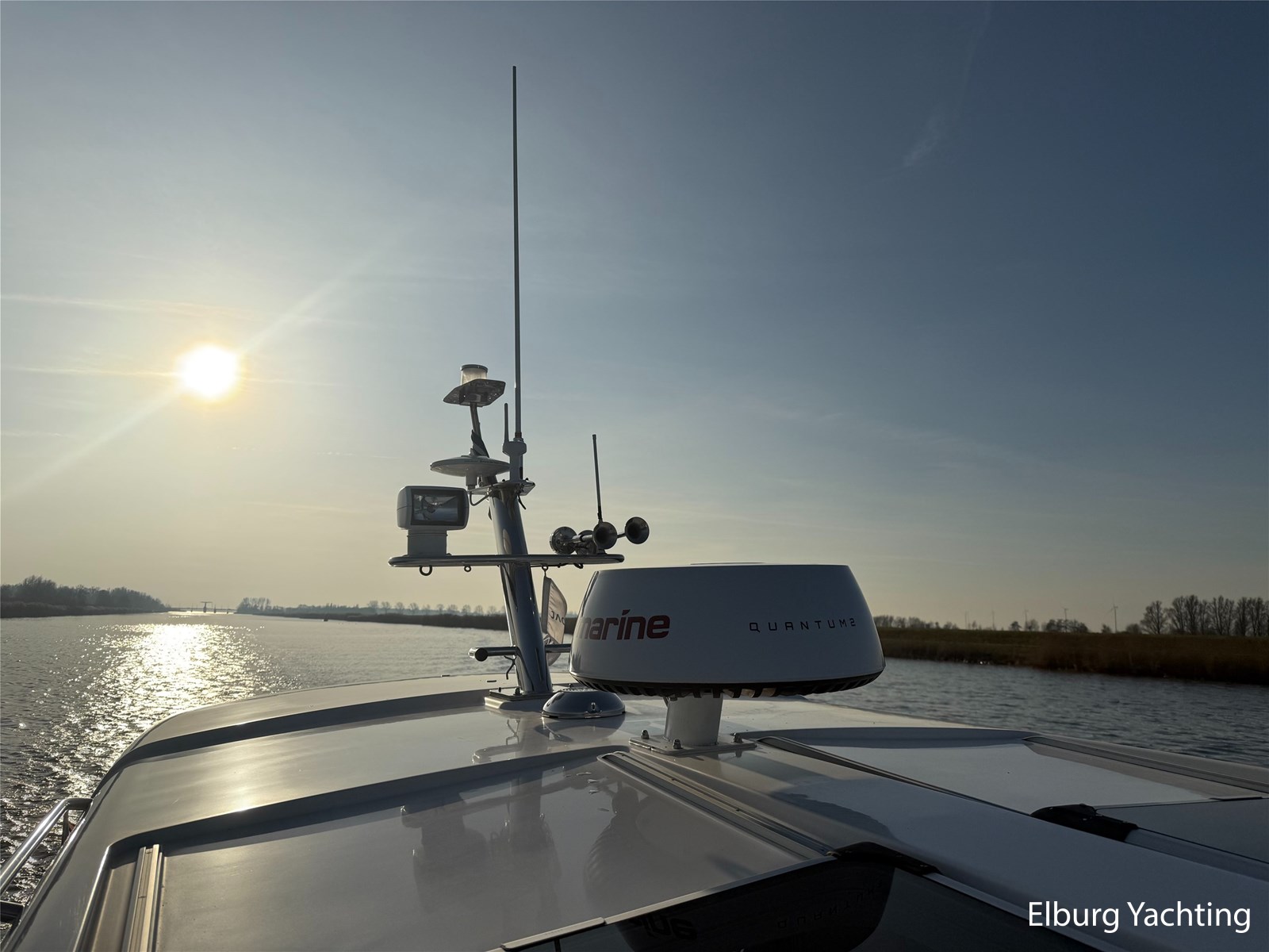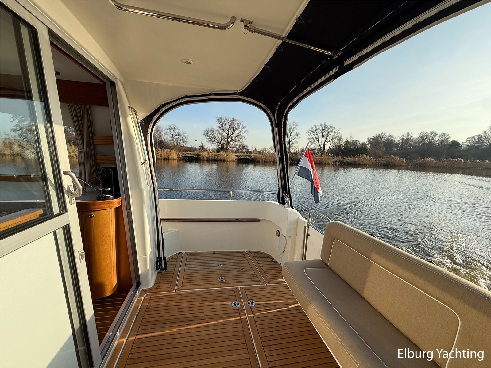 The Nimbus 335 features a spacious and well-maintained cockpit where comfort and functionality come together beautifully. The bench with cushions invites relaxing moments on board, while the deep storage locker offers practical space. Thanks to the fully closable cockpit tent, this outdoor area remains a pleasant place to stay even in less favorable weather. A convenient passage leads to the swim platform. The saloon is accessible via a sliding door and offers, on the starboard side, the galley and helm station. The helm station includes a practical side door to the side deck. To port, there's a comfortable dinette with a height-adjustable table. Forward, opposite the helm, is a foldable co-pilot seat with a retractable TV. The combination of mahogany woodwork and light upholstery creates a warm, stylish Scandinavian atmosphere. In 2025, several items were renewed, including the toilet, radar, inverter, VHF radio, Fusion stereo, and mattresses. The heat exchanger was overhauled. The yacht received new antifouling and a thorough cleaning and polishing in 2025. The engine was serviced in 2025, and the plotter was replaced in 2023. Large hatches in the cockpit floor provide excellent access to the engine compartment, storage space, and technical installations. Average fuel consumption at 5–6 knots was approximately 3 liters per hour.