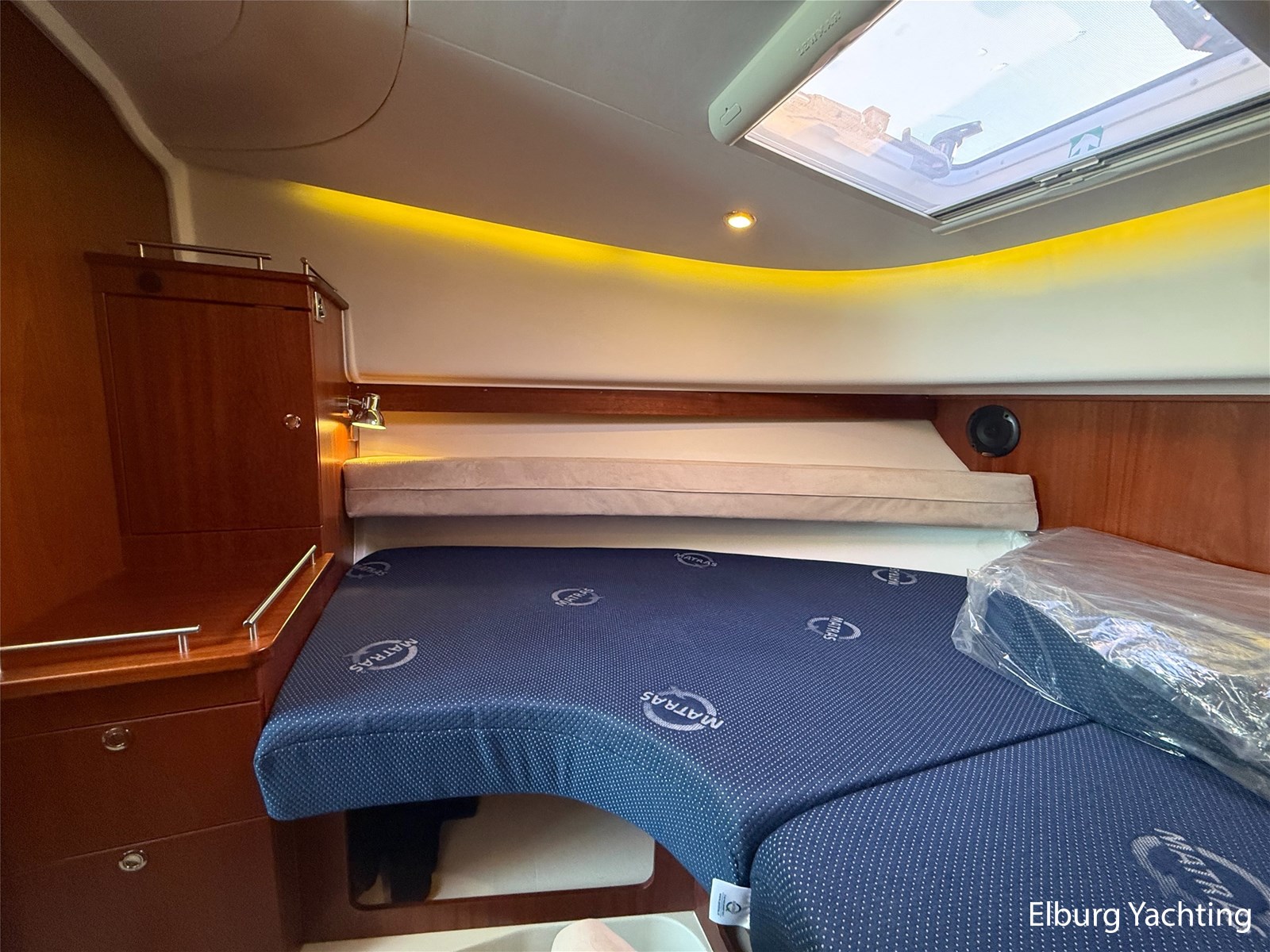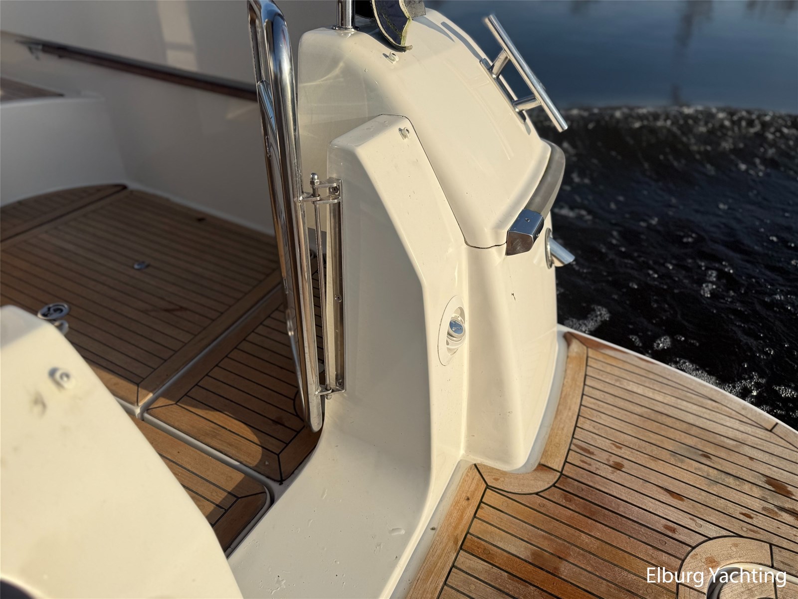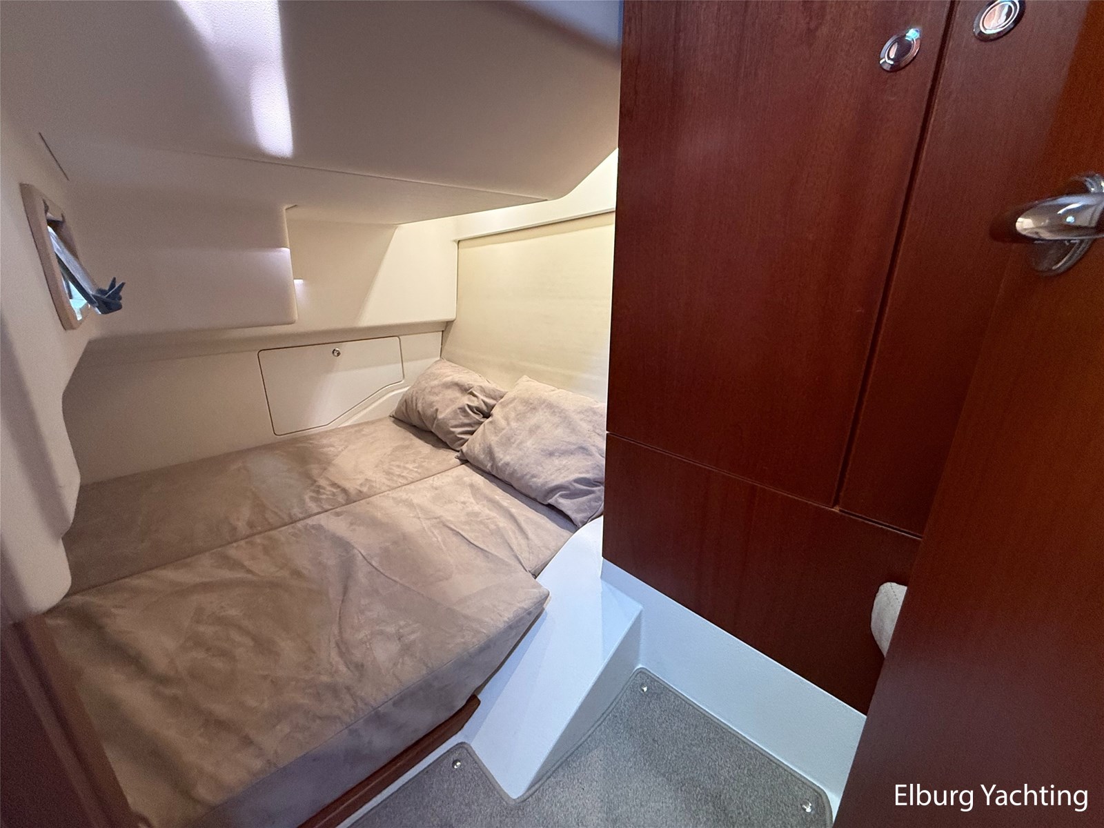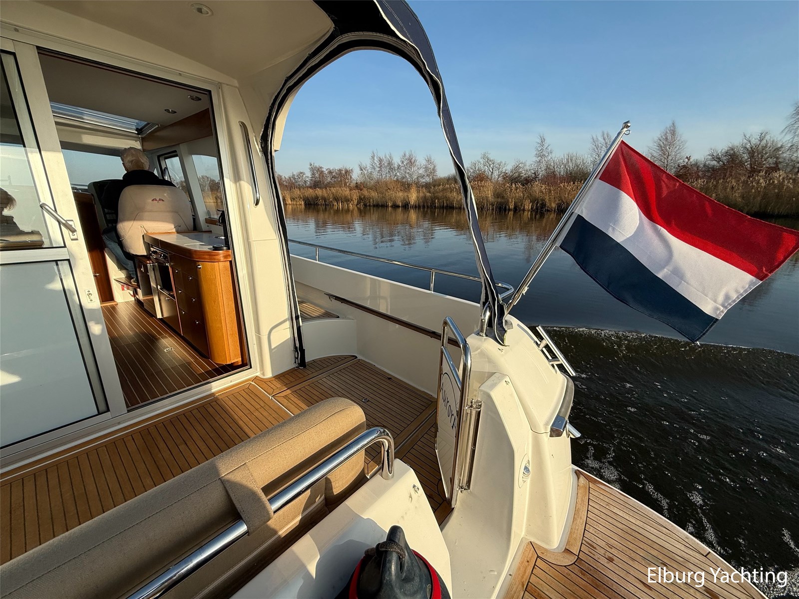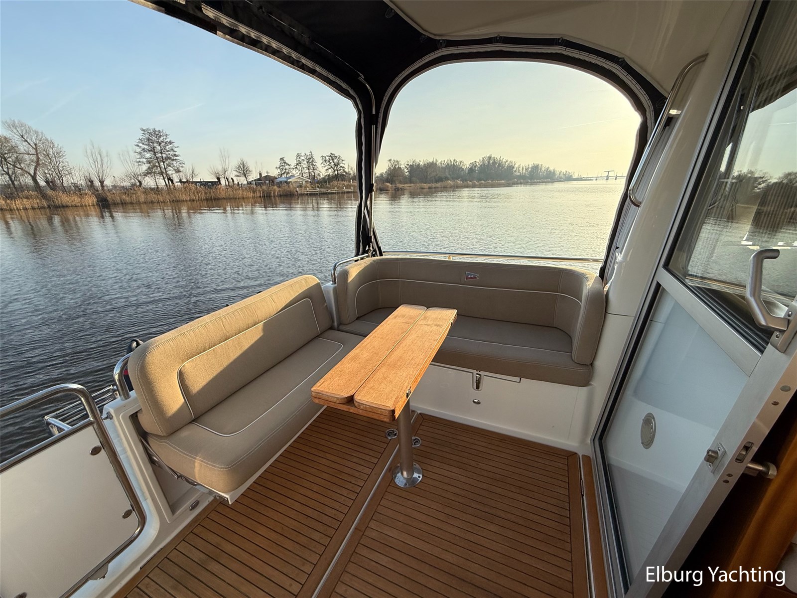 The Nimbus 335 features a spacious and well-maintained cockpit where comfort and functionality come together beautifully. The bench with cushions invites relaxing moments on board, while the deep storage locker offers practical space. Thanks to the fully closable cockpit tent, this outdoor area remains a pleasant place to stay even in less favorable weather. A convenient passage leads to the swim platform. The saloon is accessible via a sliding door and offers, on the starboard side, the galley and helm station. The helm station includes a practical side door to the side deck. To port, there's a comfortable dinette with a height-adjustable table. Forward, opposite the helm, is a foldable co-pilot seat with a retractable TV. The combination of mahogany woodwork and light upholstery creates a warm, stylish Scandinavian atmosphere. In 2025, several items were renewed, including the toilet, radar, inverter, VHF radio, Fusion stereo, and mattresses. The heat exchanger was overhauled. The yacht received new antifouling and a thorough cleaning and polishing in 2025. The engine was serviced in 2025, and the plotter was replaced in 2023. Large hatches in the cockpit floor provide excellent access to the engine compartment, storage space, and technical installations. Average fuel consumption at 5–6 knots was approximately 3 liters per hour.