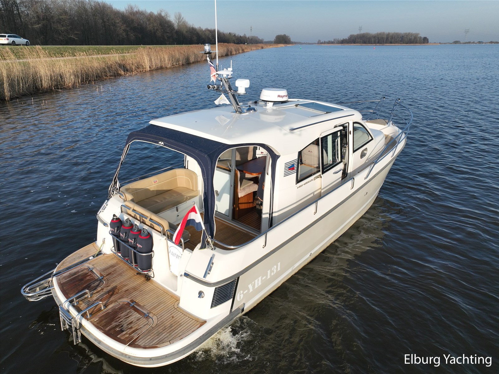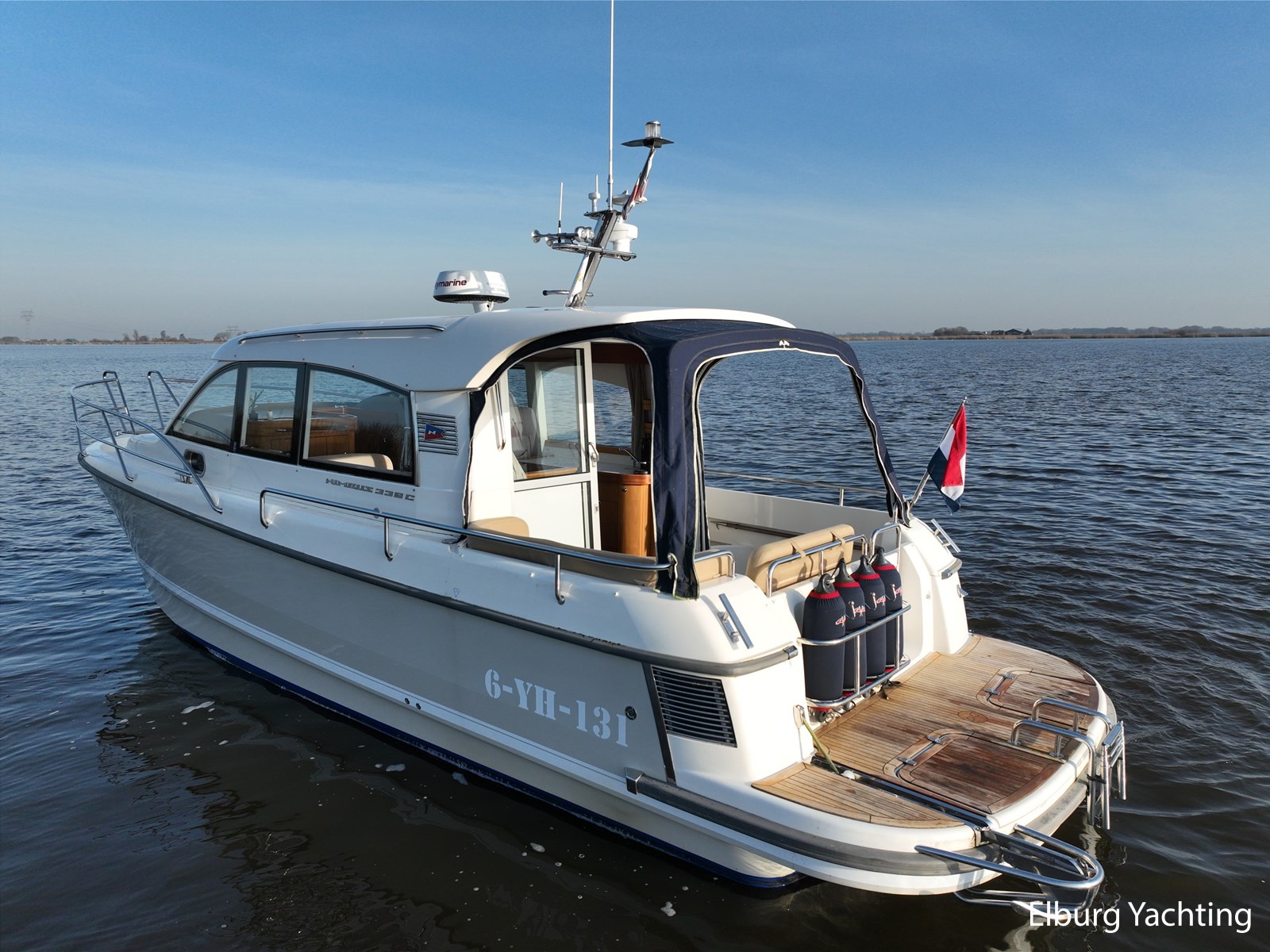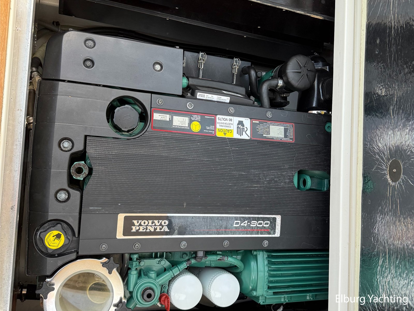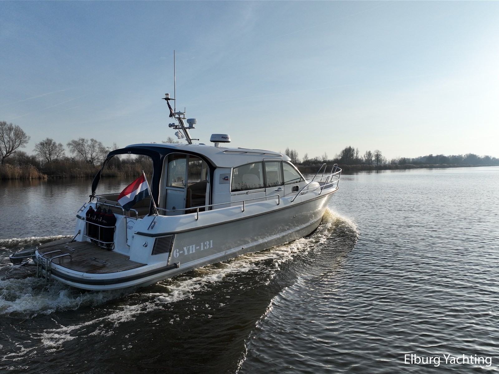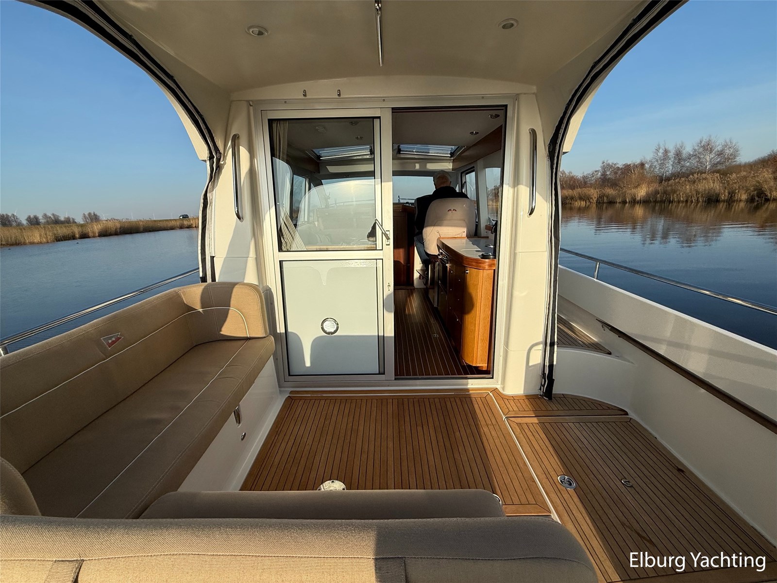 The Nimbus 335 features a spacious and well-maintained cockpit where comfort and functionality come together beautifully. The bench with cushions invites relaxing moments on board, while the deep storage locker offers practical space. Thanks to the fully closable cockpit tent, this outdoor area remains a pleasant place to stay even in less favorable weather. A convenient passage leads to the swim platform. The saloon is accessible via a sliding door and offers, on the starboard side, the galley and helm station. The helm station includes a practical side door to the side deck. To port, there's a comfortable dinette with a height-adjustable table. Forward, opposite the helm, is a foldable co-pilot seat with a retractable TV. The combination of mahogany woodwork and light upholstery creates a warm, stylish Scandinavian atmosphere. In 2025, several items were renewed, including the toilet, radar, inverter, VHF radio, Fusion stereo, and mattresses. The heat exchanger was overhauled. The yacht received new antifouling and a thorough cleaning and polishing in 2025. The engine was serviced in 2025, and the plotter was replaced in 2023. Large hatches in the cockpit floor provide excellent access to the engine compartment, storage space, and technical installations. Average fuel consumption at 5–6 knots was approximately 3 liters per hour.