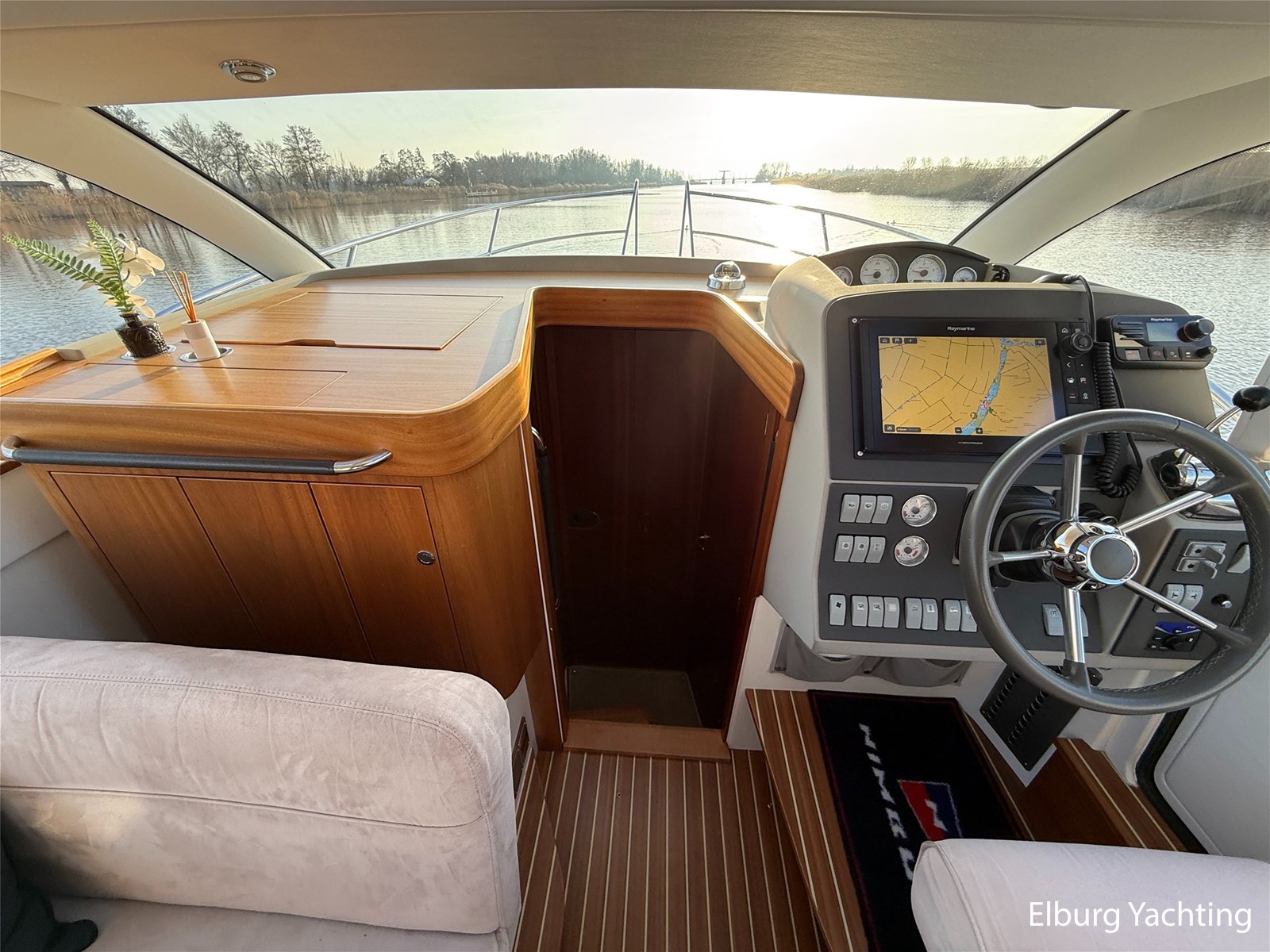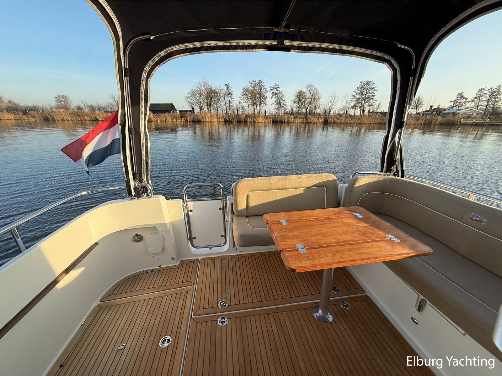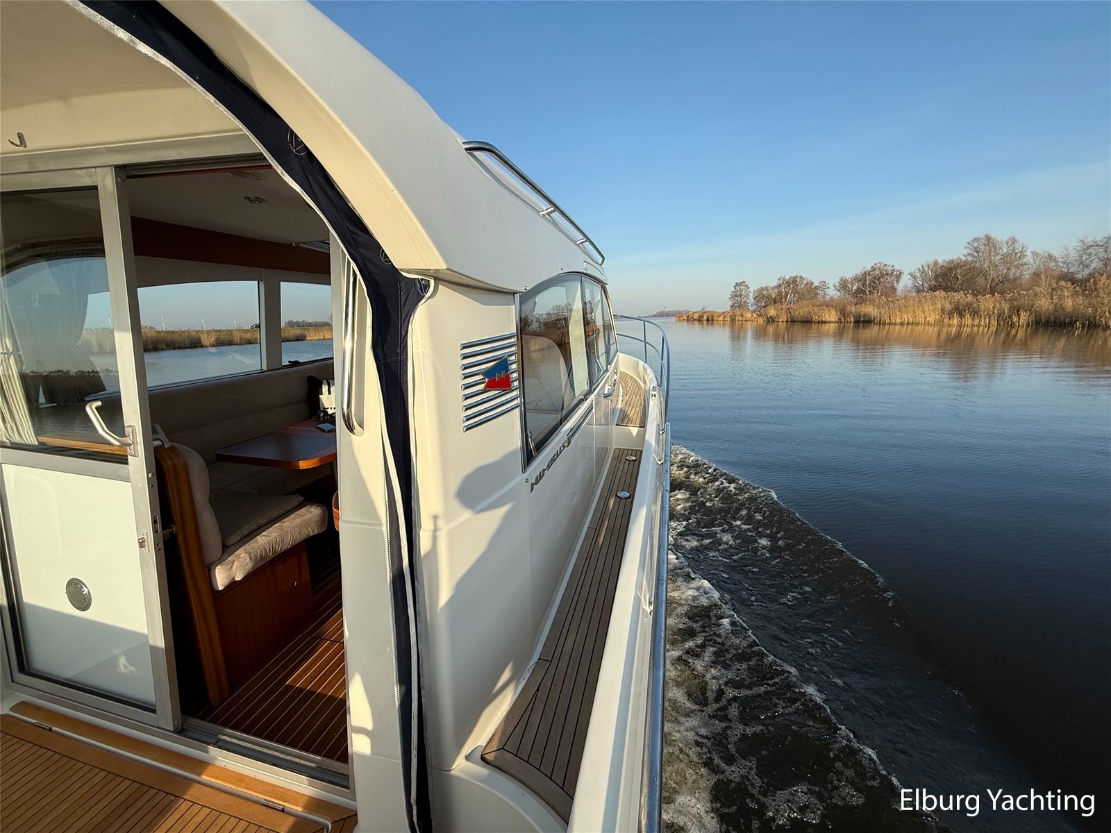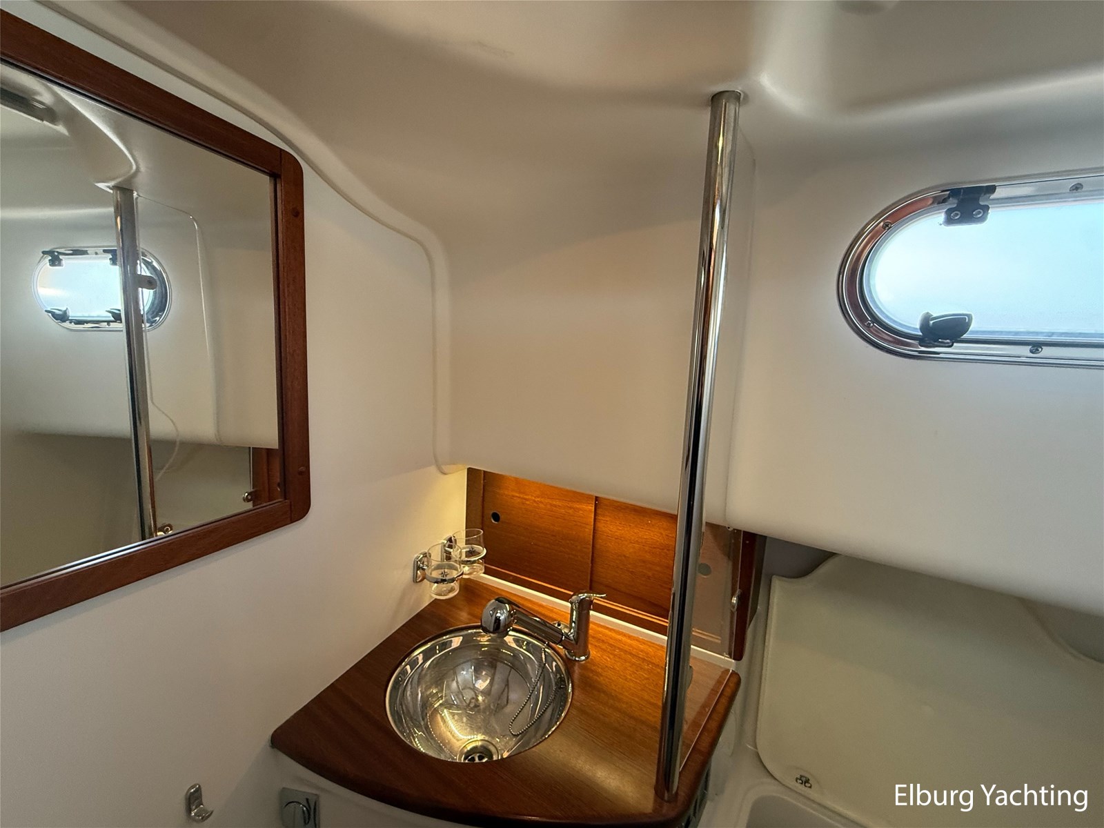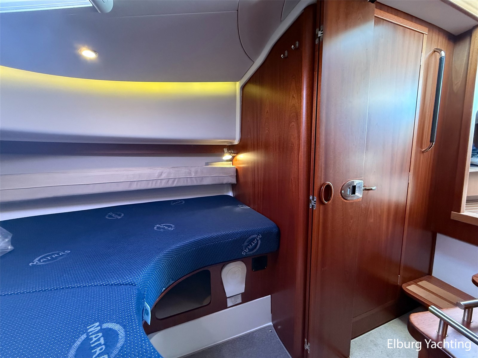 The Nimbus 335 features a spacious and well-maintained cockpit where comfort and functionality come together beautifully. The bench with cushions invites relaxing moments on board, while the deep storage locker offers practical space. Thanks to the fully closable cockpit tent, this outdoor area remains a pleasant place to stay even in less favorable weather. A convenient passage leads to the swim platform. The saloon is accessible via a sliding door and offers, on the starboard side, the galley and helm station. The helm station includes a practical side door to the side deck. To port, there's a comfortable dinette with a height-adjustable table. Forward, opposite the helm, is a foldable co-pilot seat with a retractable TV. The combination of mahogany woodwork and light upholstery creates a warm, stylish Scandinavian atmosphere. In 2025, several items were renewed, including the toilet, radar, inverter, VHF radio, Fusion stereo, and mattresses. The heat exchanger was overhauled. The yacht received new antifouling and a thorough cleaning and polishing in 2025. The engine was serviced in 2025, and the plotter was replaced in 2023. Large hatches in the cockpit floor provide excellent access to the engine compartment, storage space, and technical installations. Average fuel consumption at 5–6 knots was approximately 3 liters per hour.
