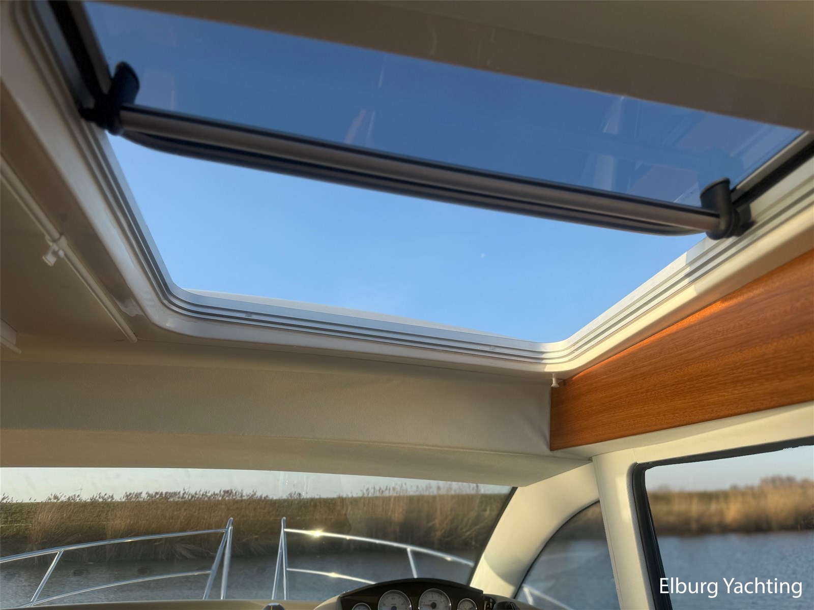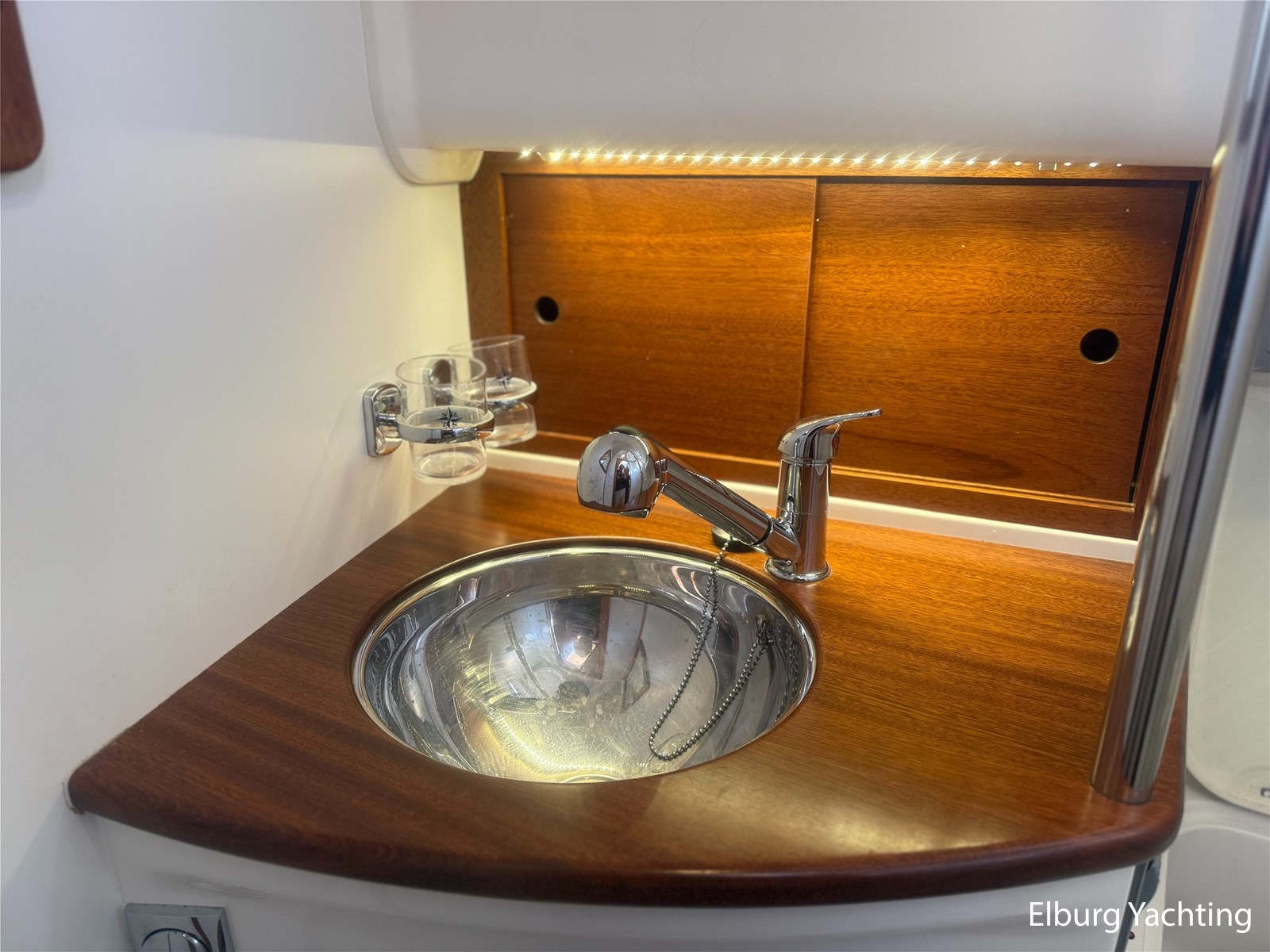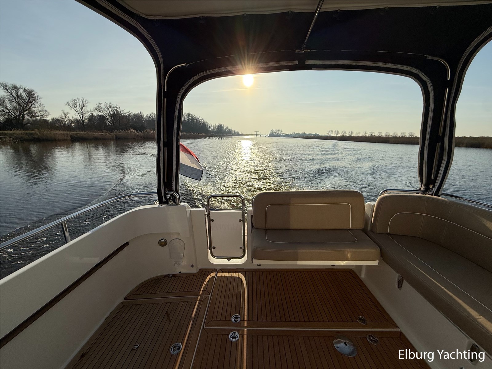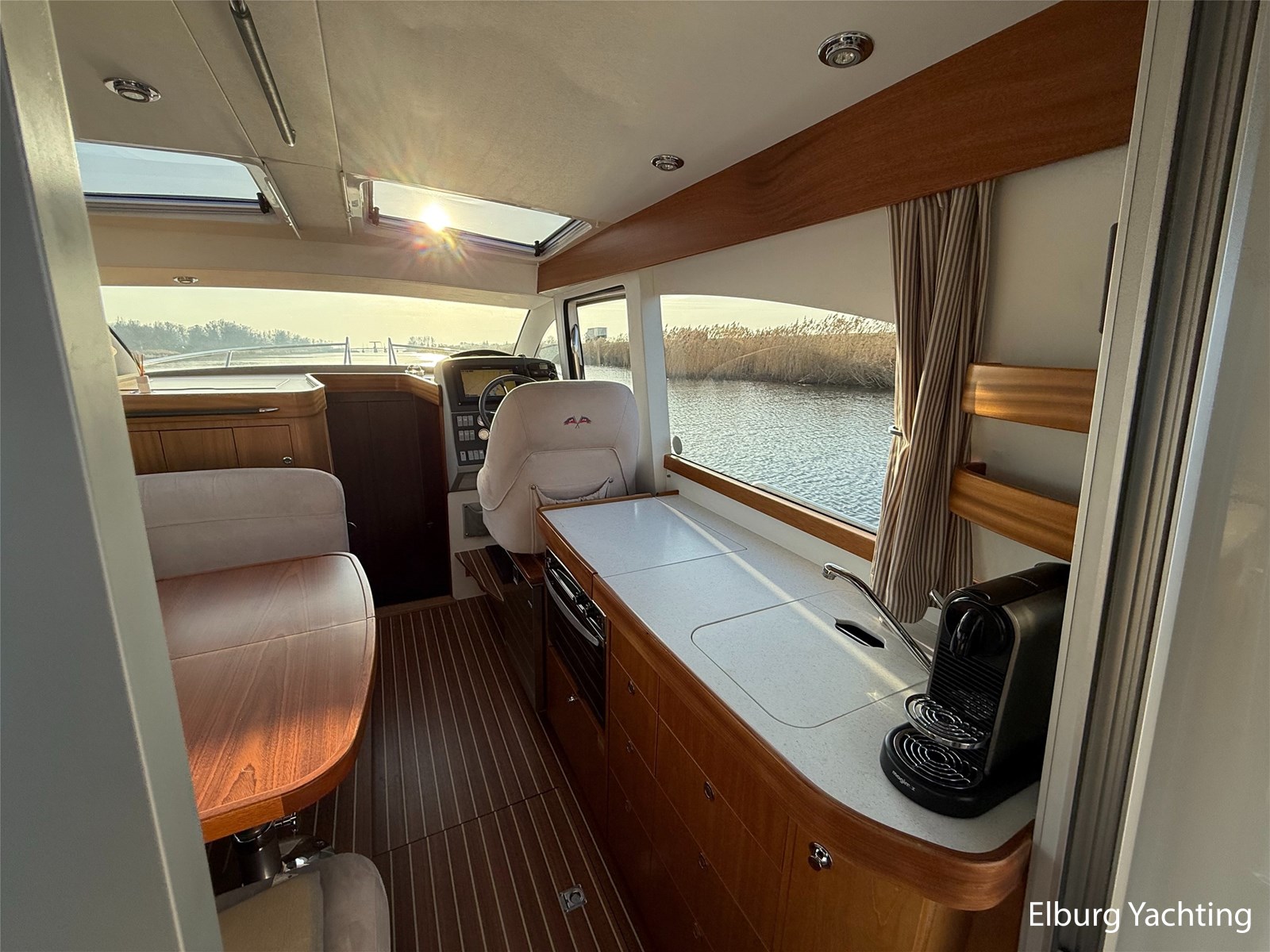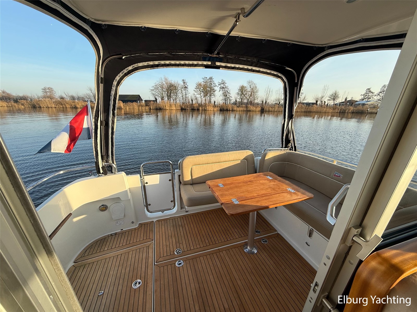 The Nimbus 335 features a spacious and well-maintained cockpit where comfort and functionality come together beautifully. The bench with cushions invites relaxing moments on board, while the deep storage locker offers practical space. Thanks to the fully closable cockpit tent, this outdoor area remains a pleasant place to stay even in less favorable weather. A convenient passage leads to the swim platform. The saloon is accessible via a sliding door and offers, on the starboard side, the galley and helm station. The helm station includes a practical side door to the side deck. To port, there's a comfortable dinette with a height-adjustable table. Forward, opposite the helm, is a foldable co-pilot seat with a retractable TV. The combination of mahogany woodwork and light upholstery creates a warm, stylish Scandinavian atmosphere. In 2025, several items were renewed, including the toilet, radar, inverter, VHF radio, Fusion stereo, and mattresses. The heat exchanger was overhauled. The yacht received new antifouling and a thorough cleaning and polishing in 2025. The engine was serviced in 2025, and the plotter was replaced in 2023. Large hatches in the cockpit floor provide excellent access to the engine compartment, storage space, and technical installations. Average fuel consumption at 5–6 knots was approximately 3 liters per hour.