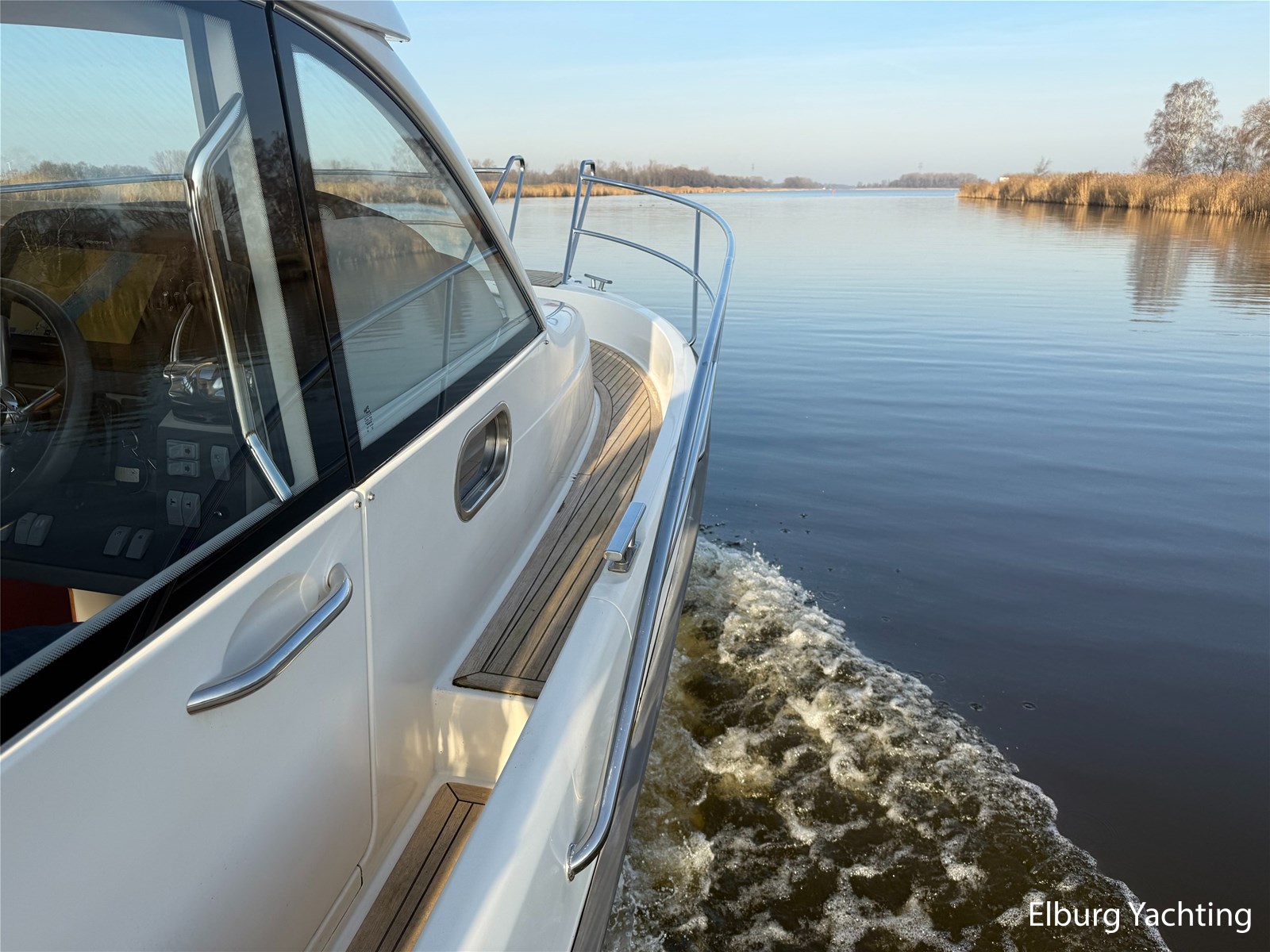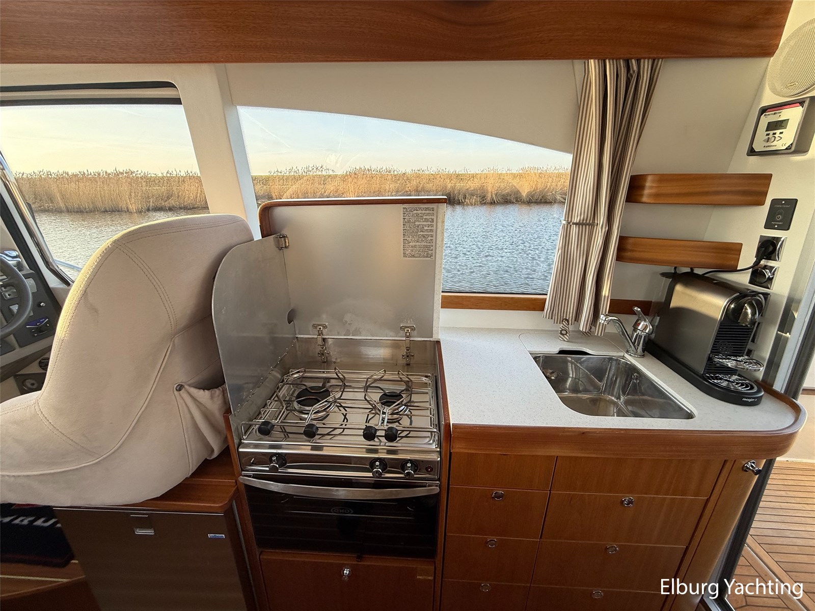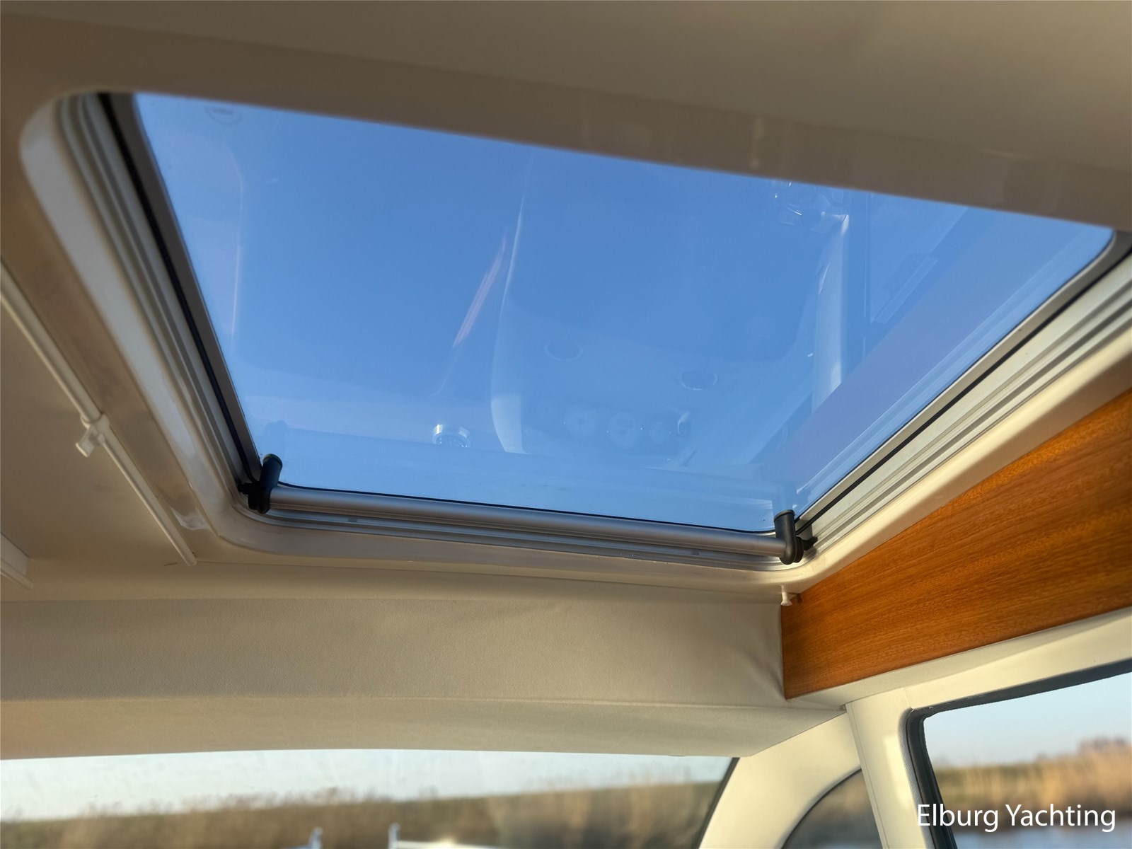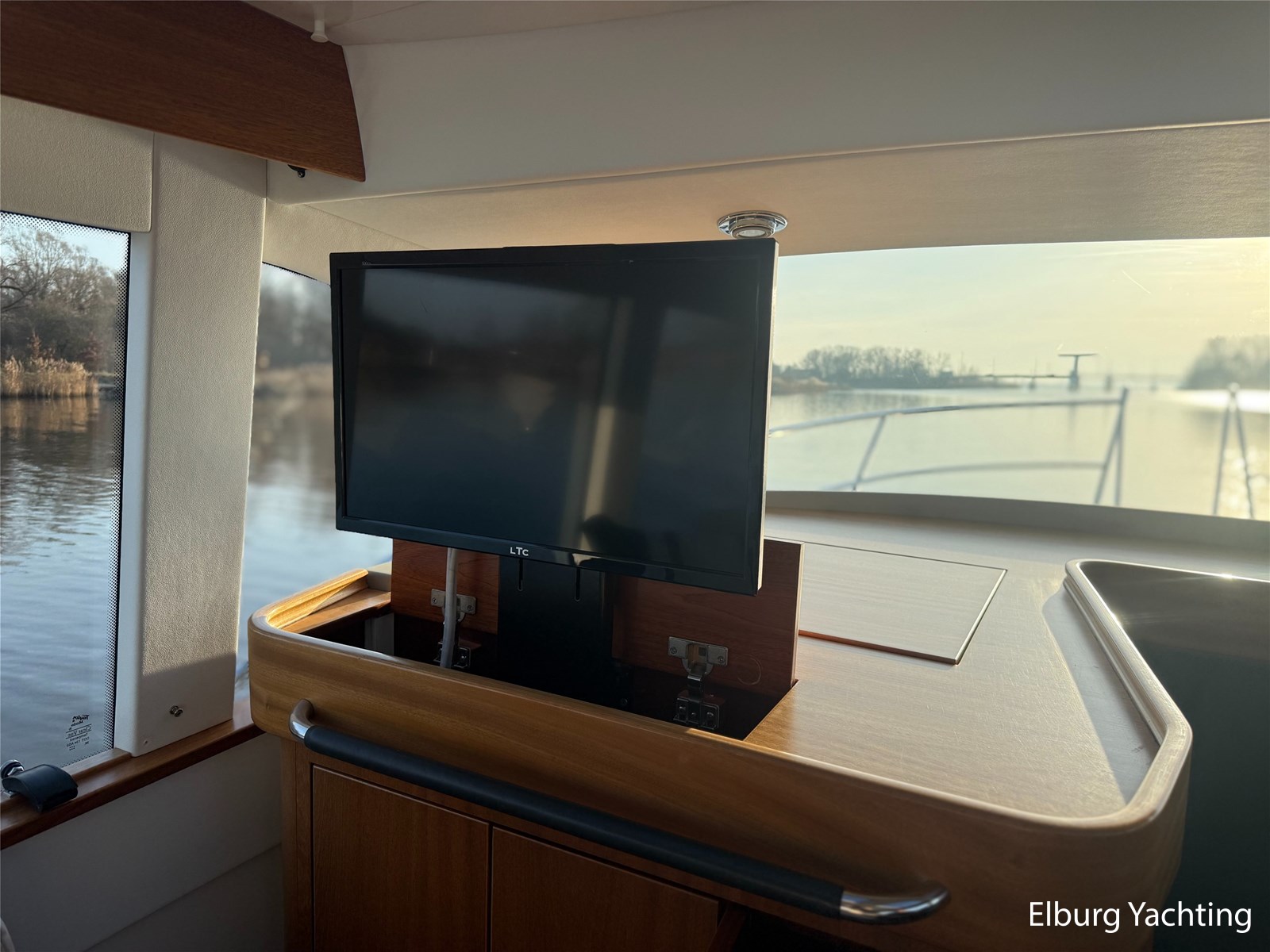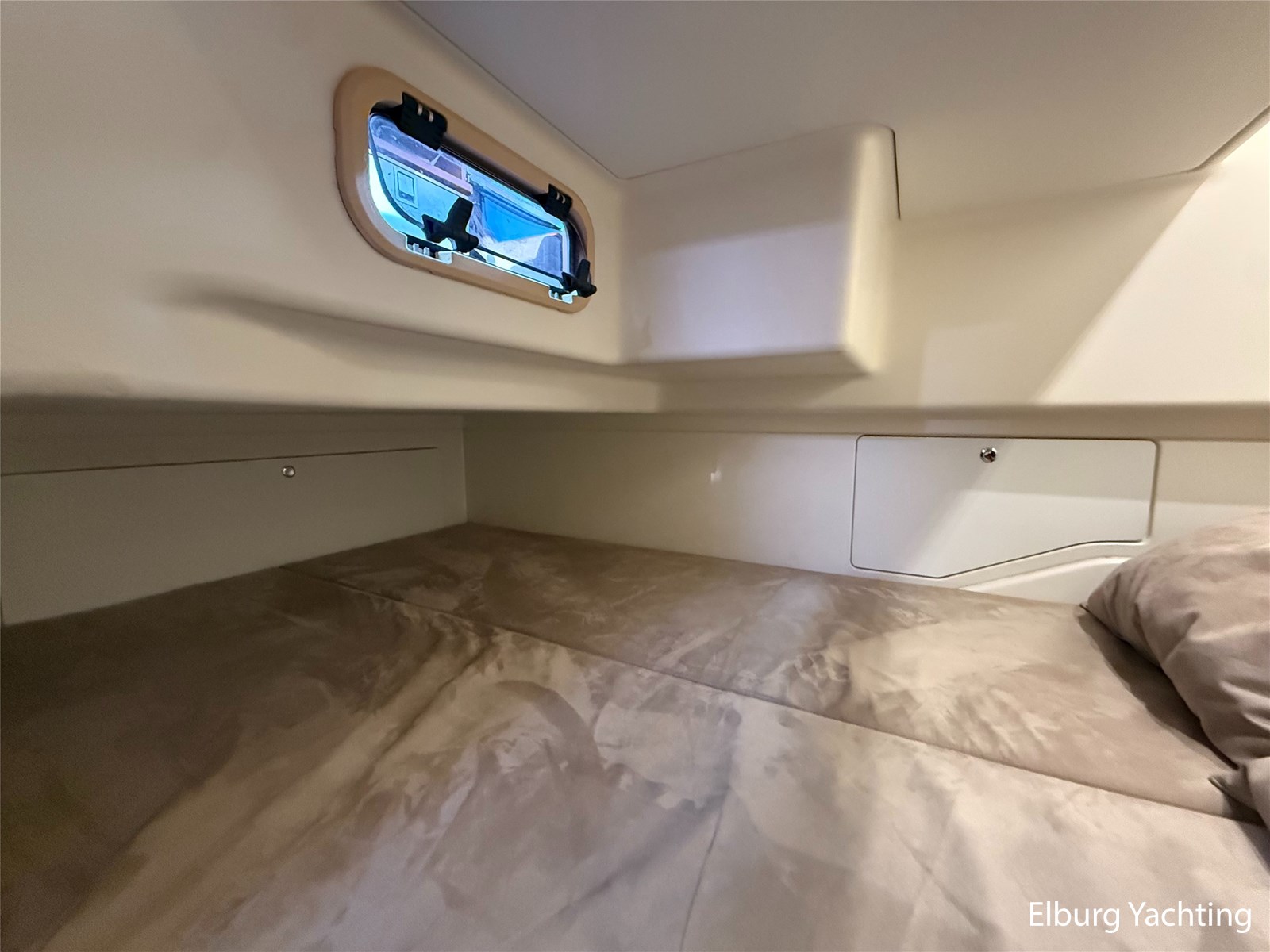 The Nimbus 335 features a spacious and well-maintained cockpit where comfort and functionality come together beautifully. The bench with cushions invites relaxing moments on board, while the deep storage locker offers practical space. Thanks to the fully closable cockpit tent, this outdoor area remains a pleasant place to stay even in less favorable weather. A convenient passage leads to the swim platform. The saloon is accessible via a sliding door and offers, on the starboard side, the galley and helm station. The helm station includes a practical side door to the side deck. To port, there's a comfortable dinette with a height-adjustable table. Forward, opposite the helm, is a foldable co-pilot seat with a retractable TV. The combination of mahogany woodwork and light upholstery creates a warm, stylish Scandinavian atmosphere. In 2025, several items were renewed, including the toilet, radar, inverter, VHF radio, Fusion stereo, and mattresses. The heat exchanger was overhauled. The yacht received new antifouling and a thorough cleaning and polishing in 2025. The engine was serviced in 2025, and the plotter was replaced in 2023. Large hatches in the cockpit floor provide excellent access to the engine compartment, storage space, and technical installations. Average fuel consumption at 5–6 knots was approximately 3 liters per hour.