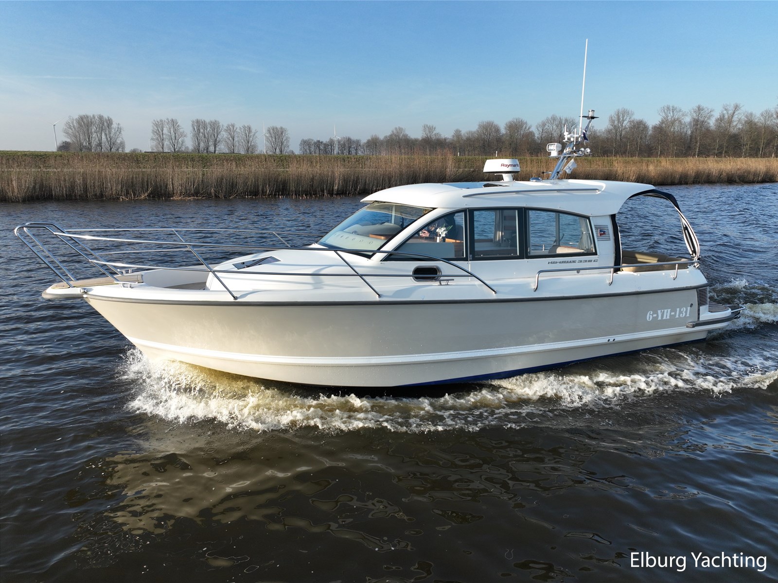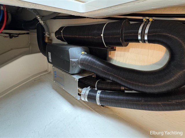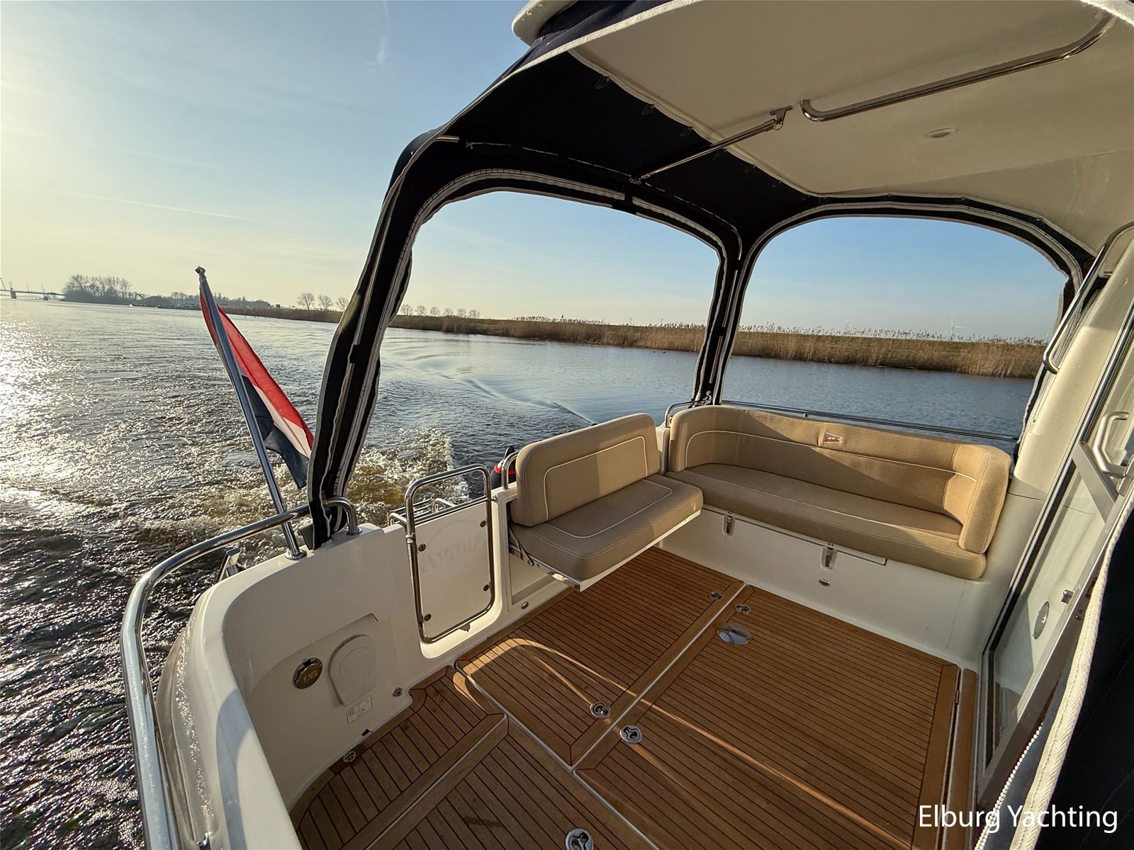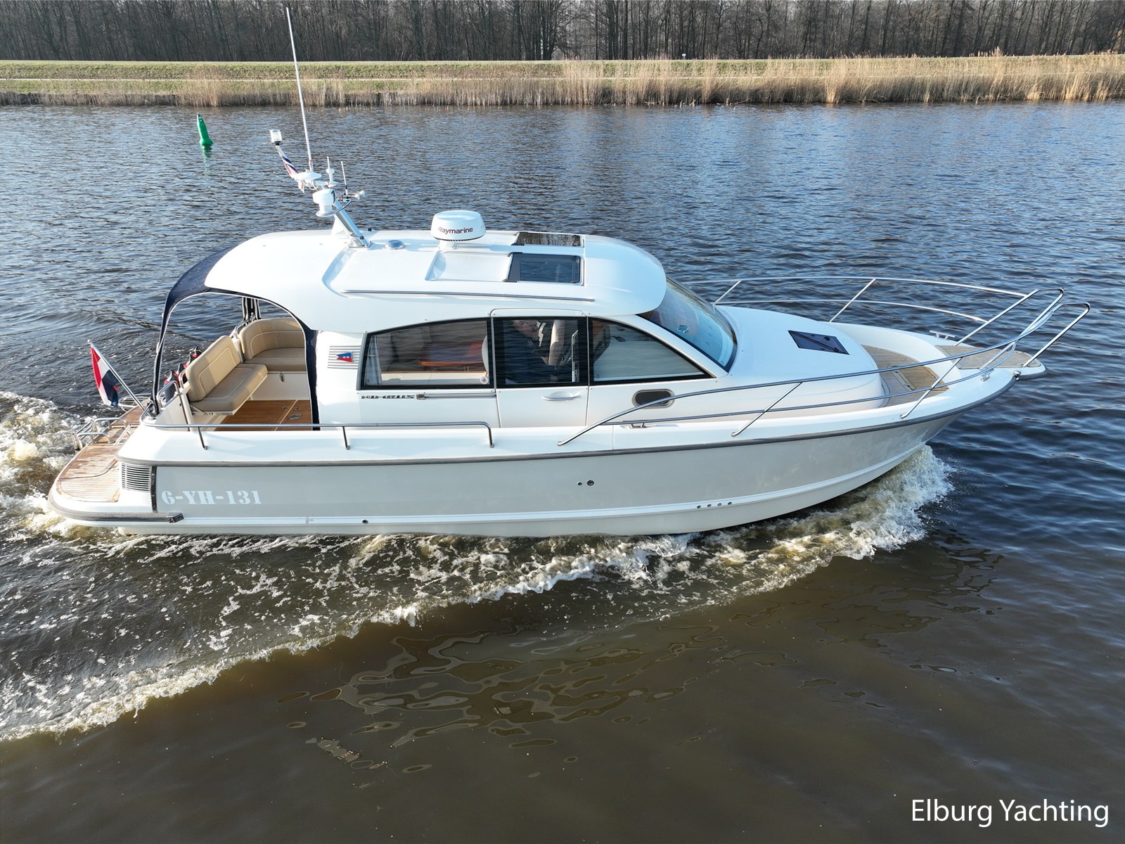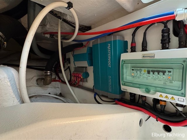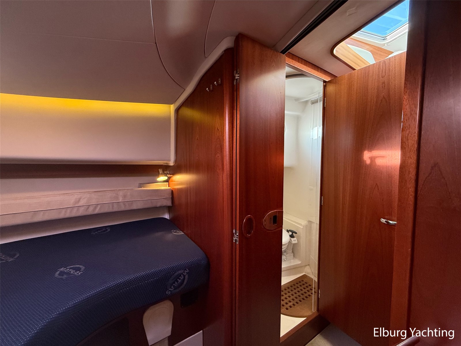 The Nimbus 335 features a spacious and well-maintained cockpit where comfort and functionality come together beautifully. The bench with cushions invites relaxing moments on board, while the deep storage locker offers practical space. Thanks to the fully closable cockpit tent, this outdoor area remains a pleasant place to stay even in less favorable weather. A convenient passage leads to the swim platform. The saloon is accessible via a sliding door and offers, on the starboard side, the galley and helm station. The helm station includes a practical side door to the side deck. To port, there's a comfortable dinette with a height-adjustable table. Forward, opposite the helm, is a foldable co-pilot seat with a retractable TV. The combination of mahogany woodwork and light upholstery creates a warm, stylish Scandinavian atmosphere. In 2025, several items were renewed, including the toilet, radar, inverter, VHF radio, Fusion stereo, and mattresses. The heat exchanger was overhauled. The yacht received new antifouling and a thorough cleaning and polishing in 2025. The engine was serviced in 2025, and the plotter was replaced in 2023. Large hatches in the cockpit floor provide excellent access to the engine compartment, storage space, and technical installations. Average fuel consumption at 5–6 knots was approximately 3 liters per hour.