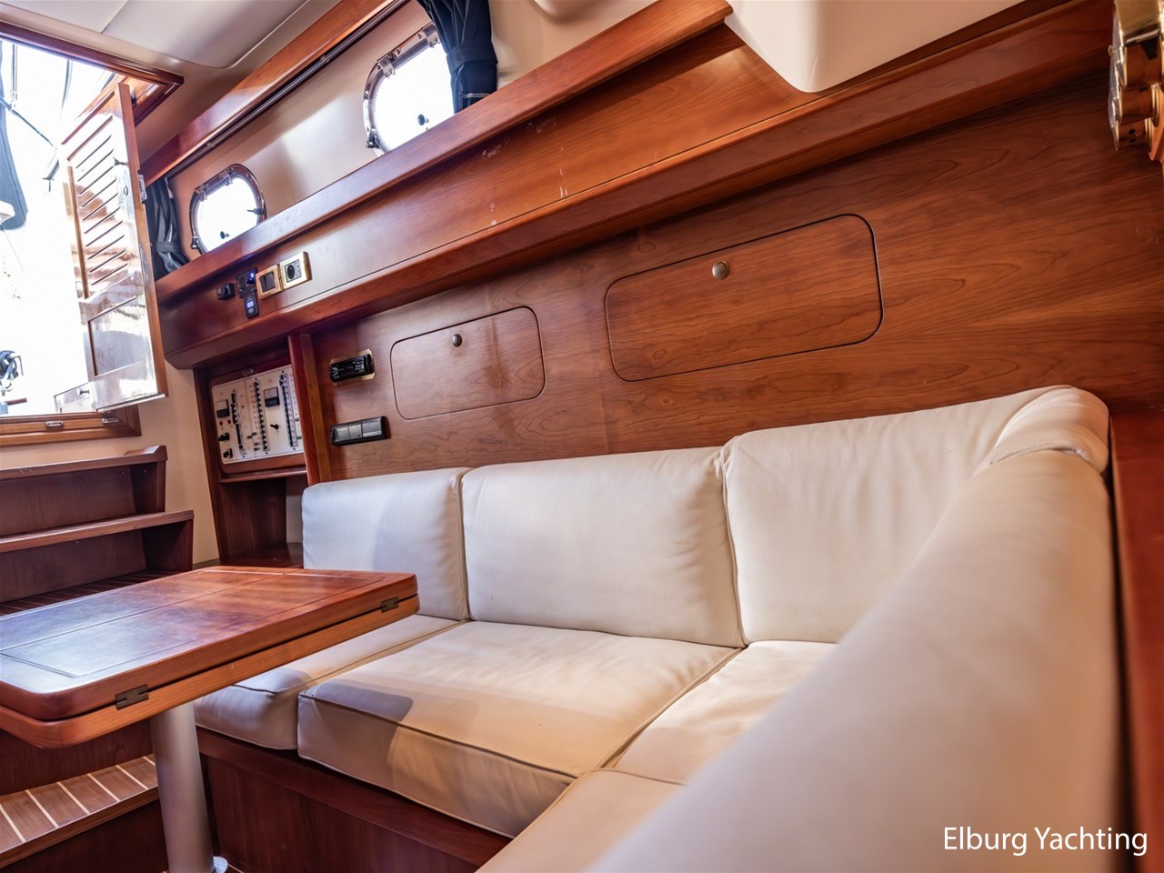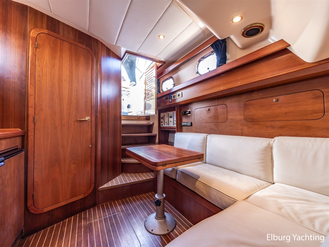 - Teak ship interior with creme coloured upholstery on the inside