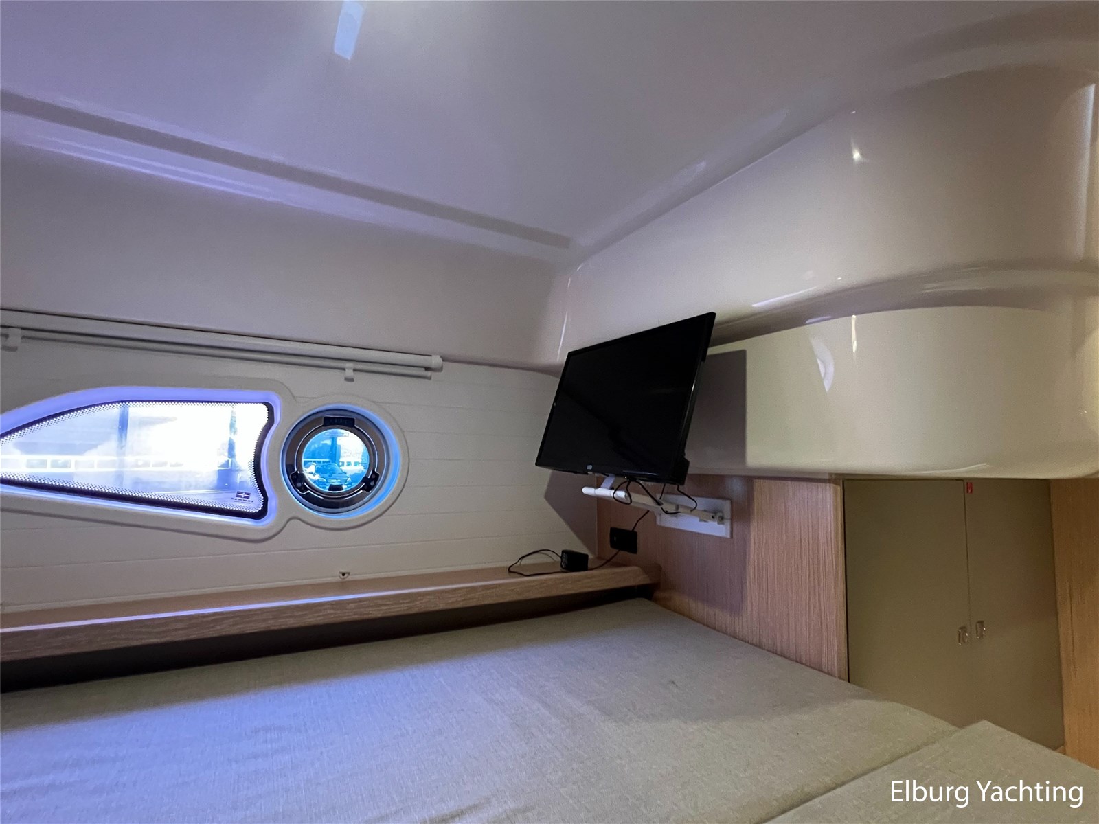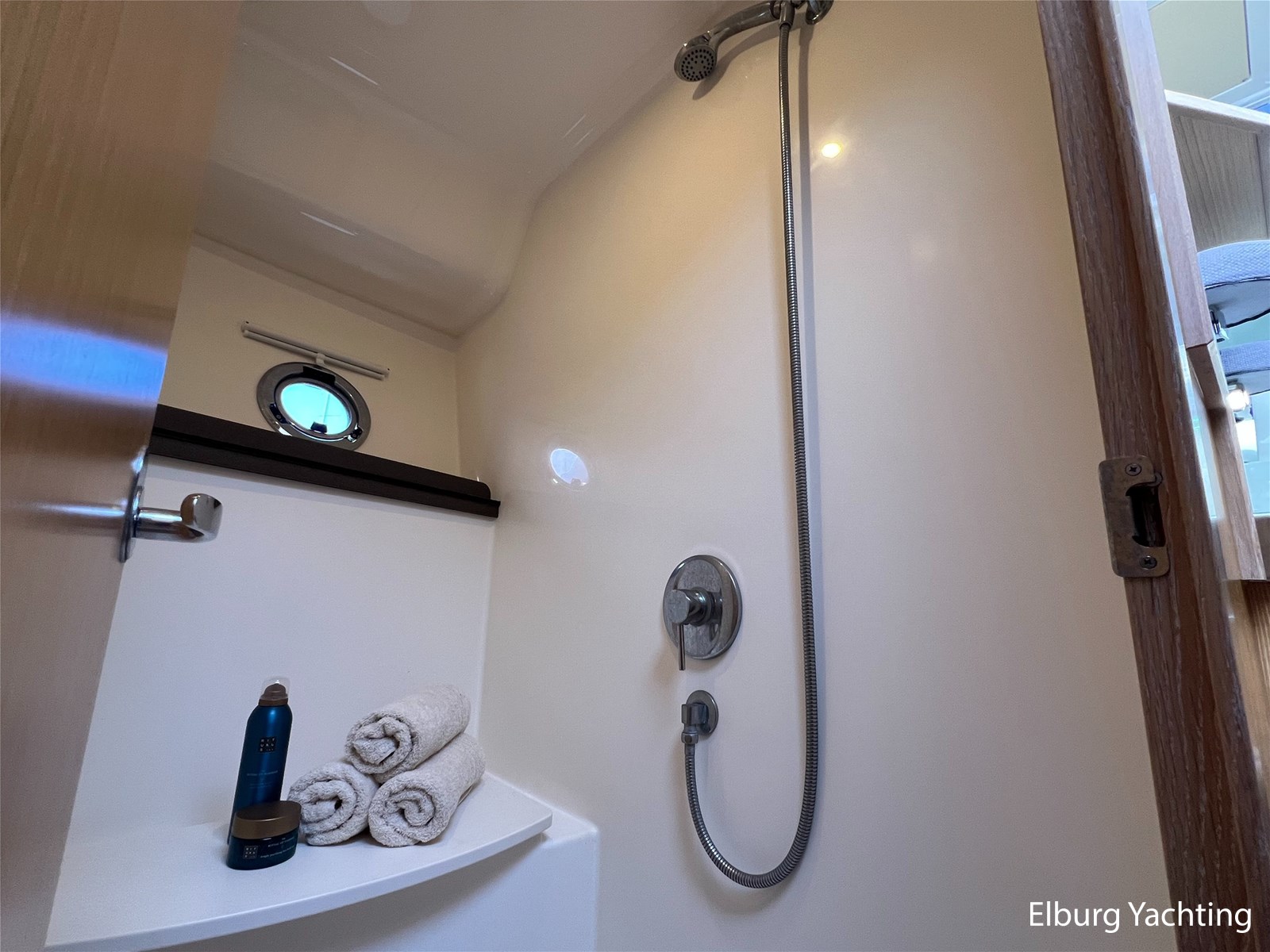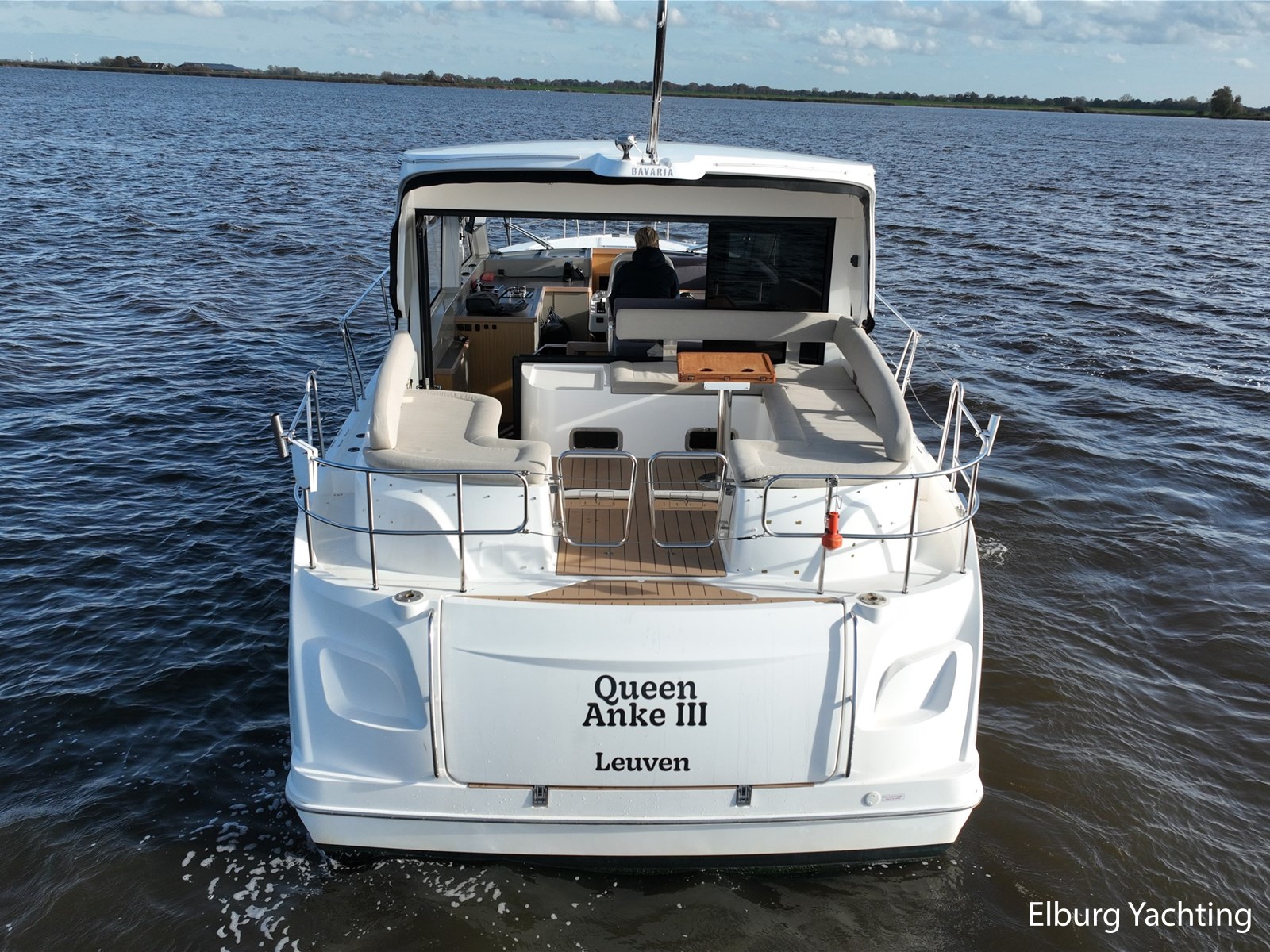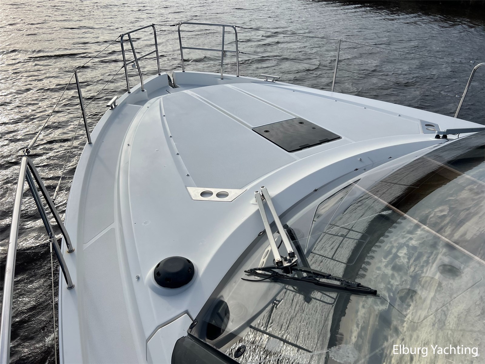 This young Bavaria E40 is offered by her second owner. Built with plenty of useable space for her size, the Bavaria E40 Sedan features three full cabins. This example is equipped with the top engine, a 300 hp Volvo Penta D4 with fixed shaft transmission, which achieves a top speed of approximately 13 knots. The cockpit offers space for approximately eight people and runs parallel to the side decks. From the open cockpit, there is a short passage to the saloon, where the raised helm station is located on the right side. The helm station offers space for at least two people and is equipped with all the necessary modern navigation equipment, including electric bow and stern thrusters controls, a fixed Simrad HS35 VHF radio with a second paired handheld device, a Simrad NSS Evo 3 plotter with autopilot, and a Fusion audio system with volume controls in both the saloon and cockpit. A spacious galley is located to port of the saloon, with the dinette on the starboard side offering a full view around. The saloon features large windows that create a sense of space and allow plenty of natural light. Three sliding windows are located between the helm station and the cockpit, allowing the captain and his guests to enjoy the cruise together. Forward in the ship is a double beth, with a toilet on the port side and a shower enclosure on the starboard side. Behind the helm station, a staircase leads down to the second and third cabins, each with a double bed. There is also a second bathroom with a shared shower and toilet. This Bavaria E40 is also equipped with: integrated cockpit benches with removable cushions, a complete cockpit tent (2025), removable stainless steel davits, a foldable bathing platform in the transom, two roof hatches in the saloon and two sliding windows (starboard and portside), cusions available for sunbed on frontdeck, large storage hatch in the bow, a TV in the saloon and all cabins, and a stainless steel mast with top light which can be folded achieving a minimum height of approximately 3.80m.