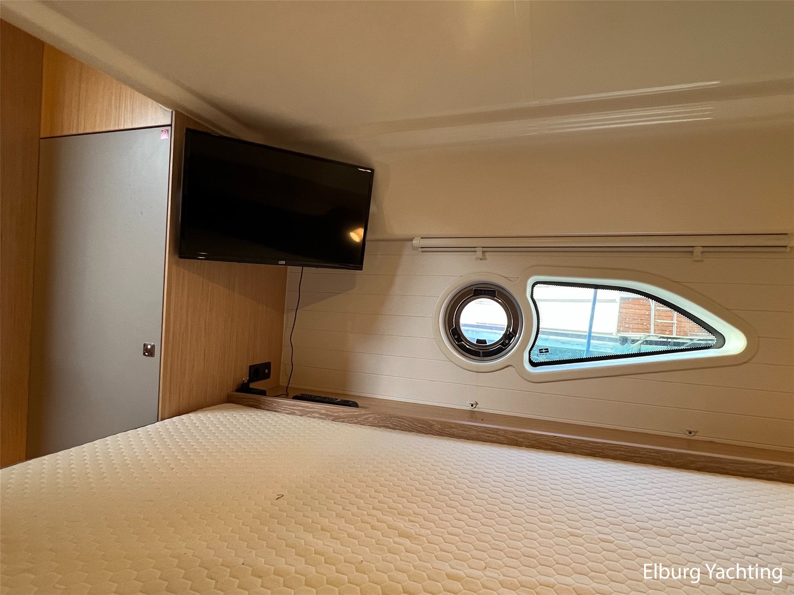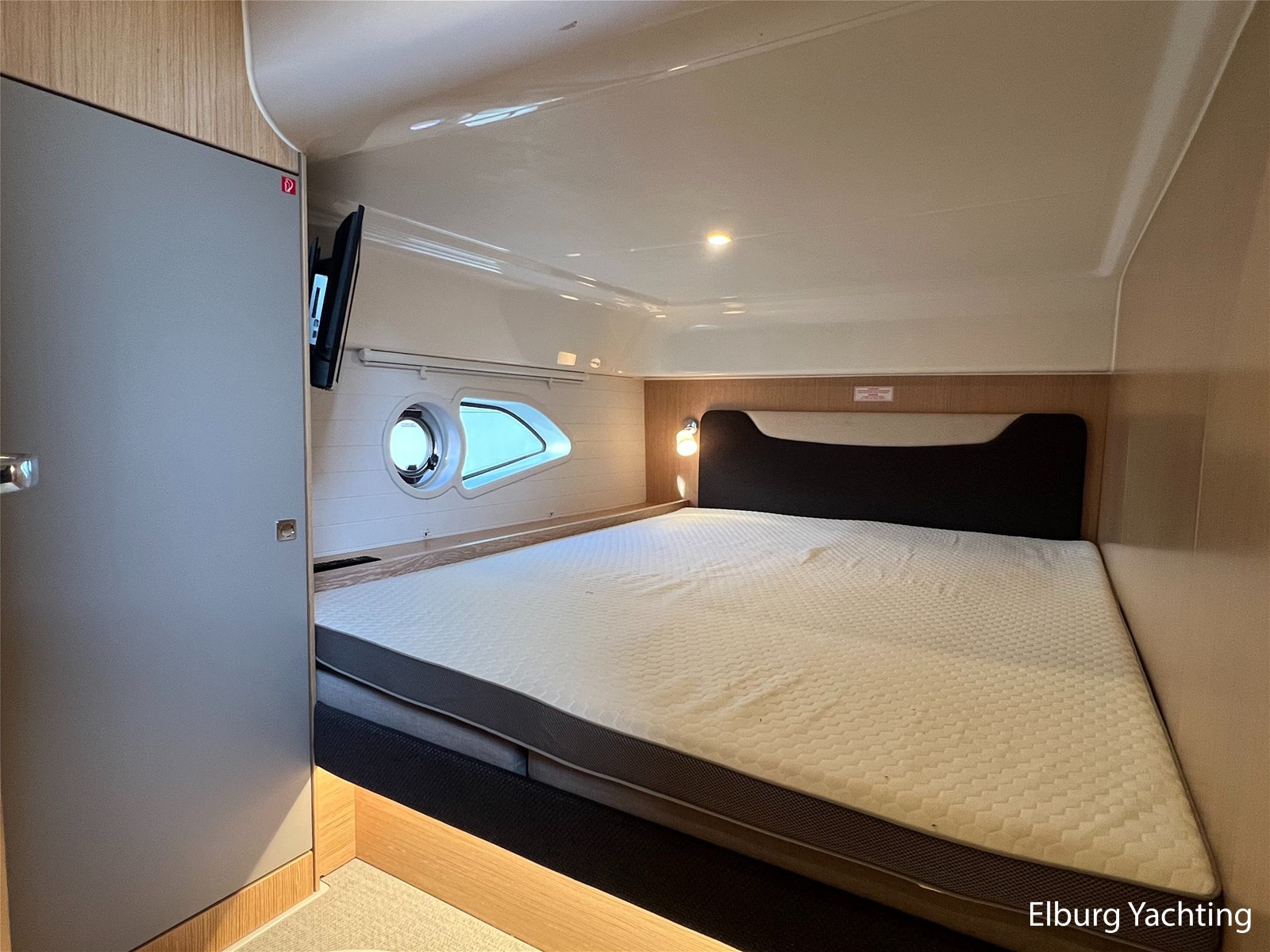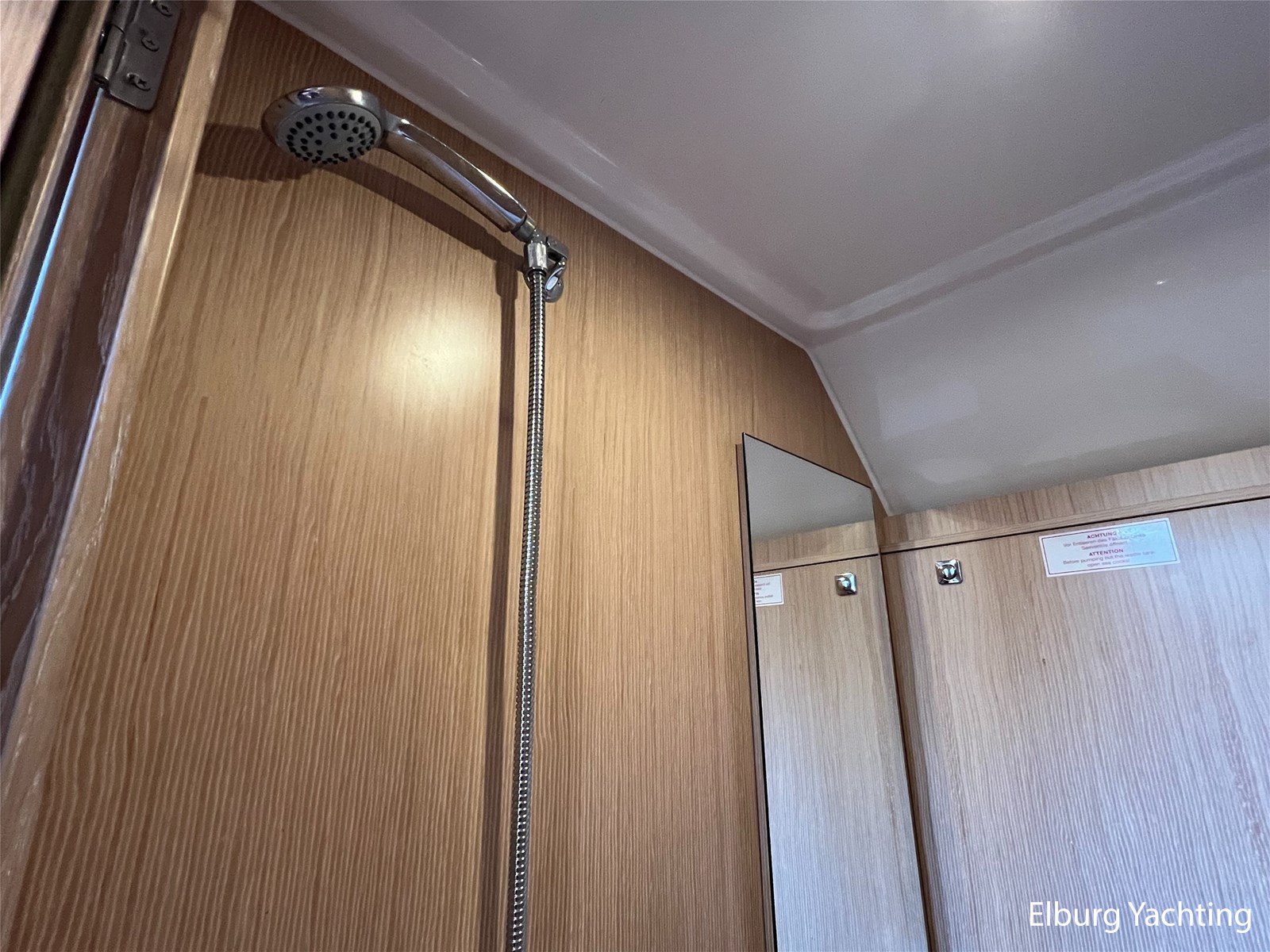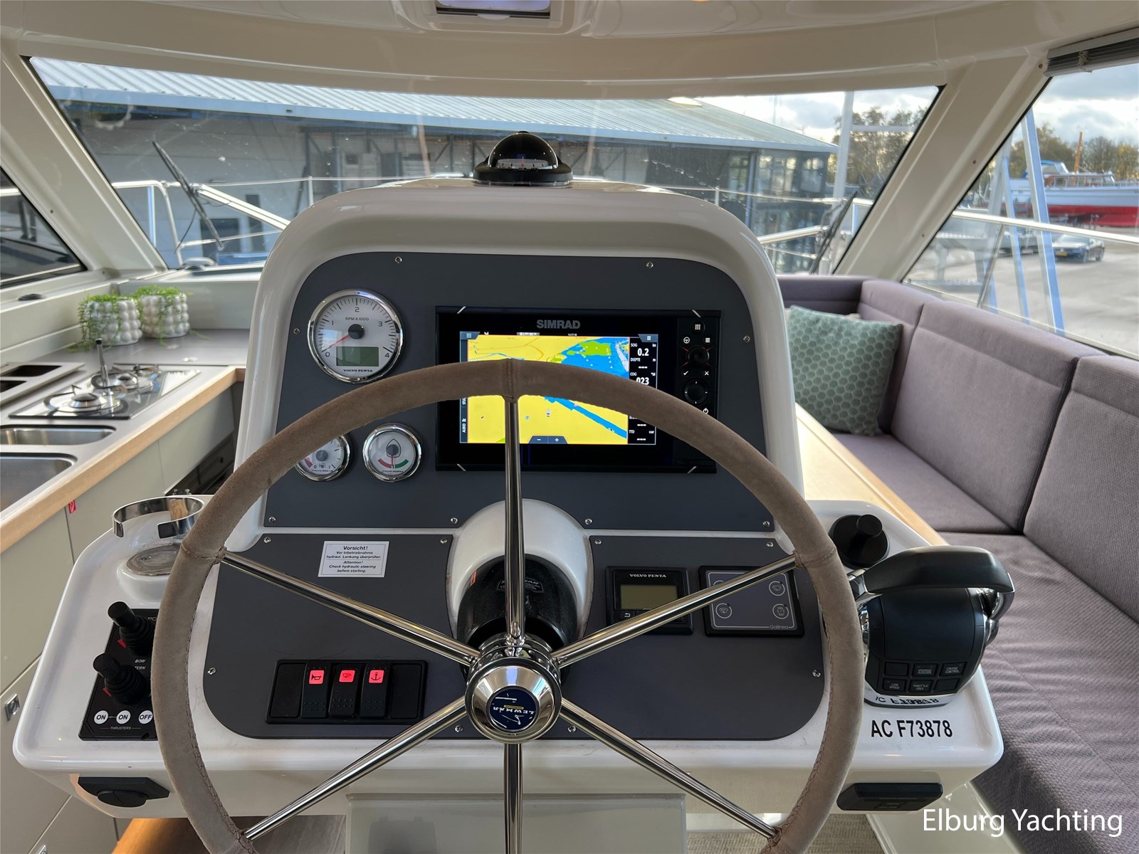 This young Bavaria E40 is offered by her second owner. Built with plenty of useable space for her size, the Bavaria E40 Sedan features three full cabins. This example is equipped with the top engine, a 300 hp Volvo Penta D4 with fixed shaft transmission, which achieves a top speed of approximately 13 knots. The cockpit offers space for approximately eight people and runs parallel to the side decks. From the open cockpit, there is a short passage to the saloon, where the raised helm station is located on the right side. The helm station offers space for at least two people and is equipped with all the necessary modern navigation equipment, including electric bow and stern thrusters controls, a fixed Simrad HS35 VHF radio with a second paired handheld device, a Simrad NSS Evo 3 plotter with autopilot, and a Fusion audio system with volume controls in both the saloon and cockpit. A spacious galley is located to port of the saloon, with the dinette on the starboard side offering a full view around. The saloon features large windows that create a sense of space and allow plenty of natural light. Three sliding windows are located between the helm station and the cockpit, allowing the captain and his guests to enjoy the cruise together. Forward in the ship is a double beth, with a toilet on the port side and a shower enclosure on the starboard side. Behind the helm station, a staircase leads down to the second and third cabins, each with a double bed. There is also a second bathroom with a shared shower and toilet. This Bavaria E40 is also equipped with: integrated cockpit benches with removable cushions, a complete cockpit tent (2025), removable stainless steel davits, a foldable bathing platform in the transom, two roof hatches in the saloon and two sliding windows (starboard and portside), cusions available for sunbed on frontdeck, large storage hatch in the bow, a TV in the saloon and all cabins, and a stainless steel mast with top light which can be folded achieving a minimum height of approximately 3.80m.