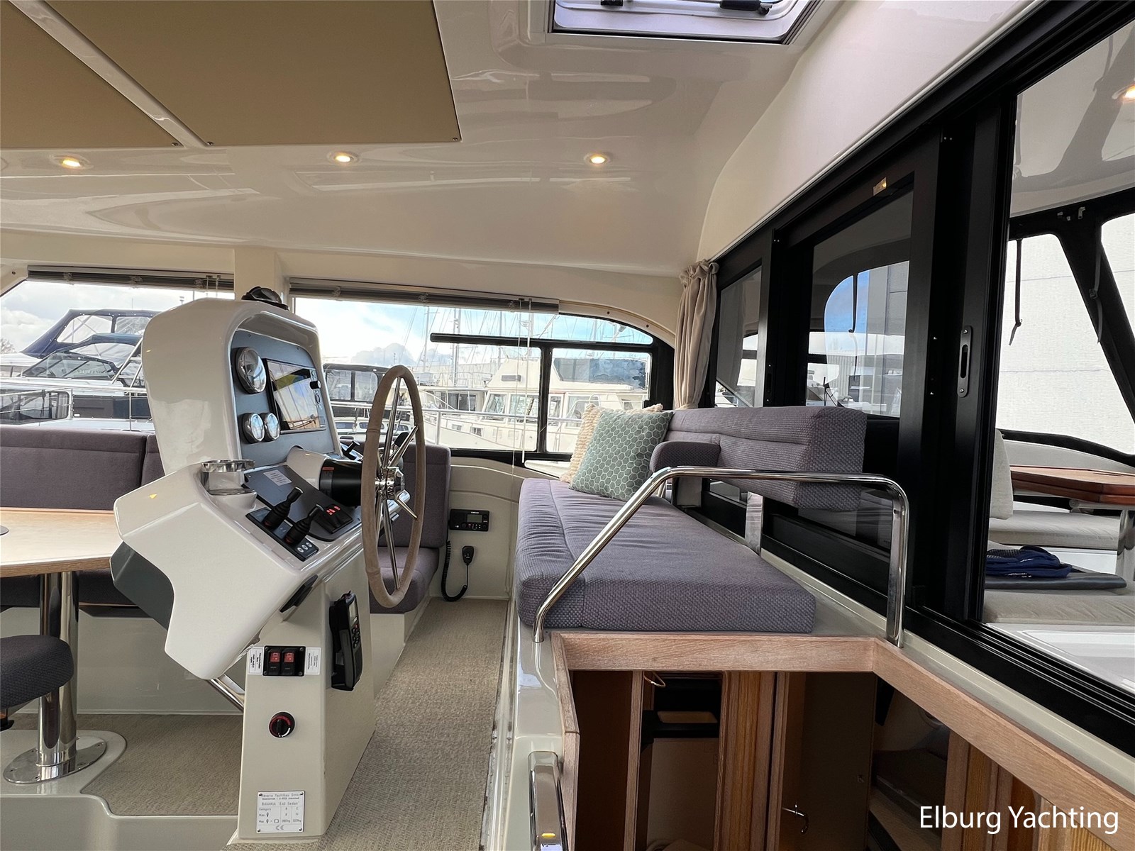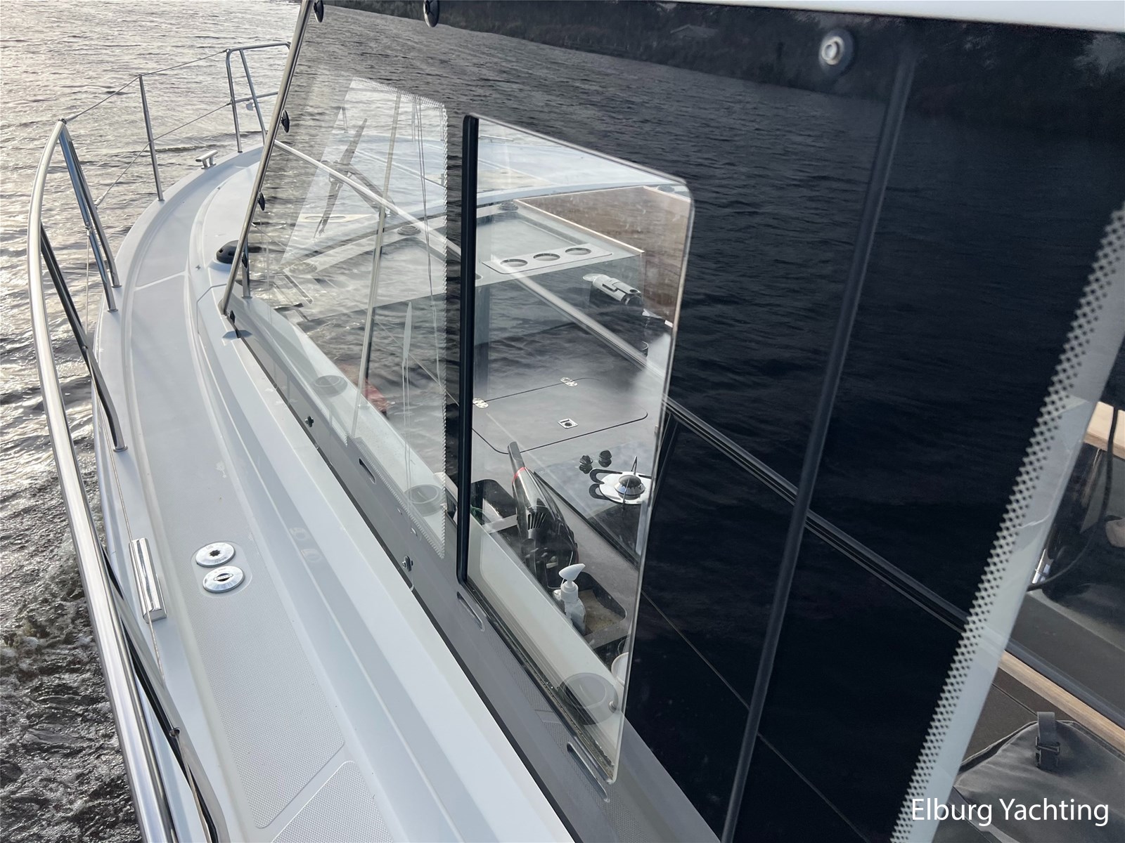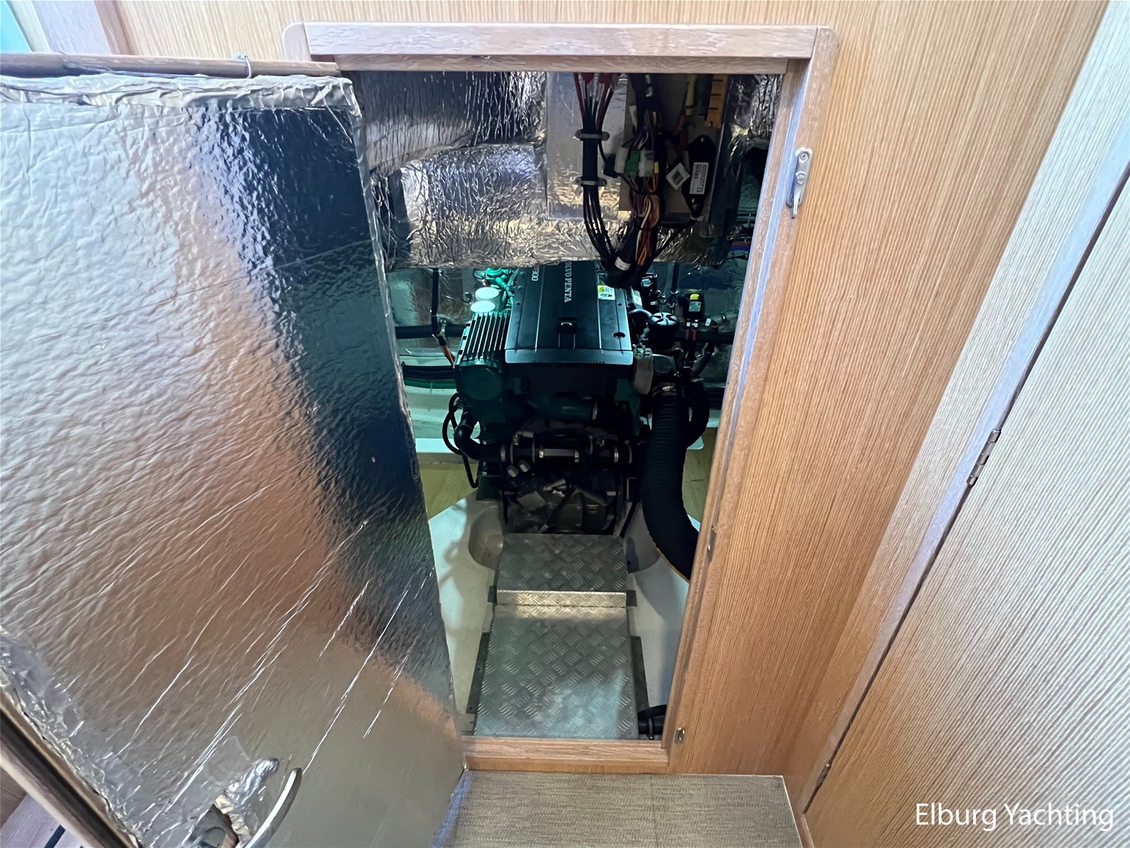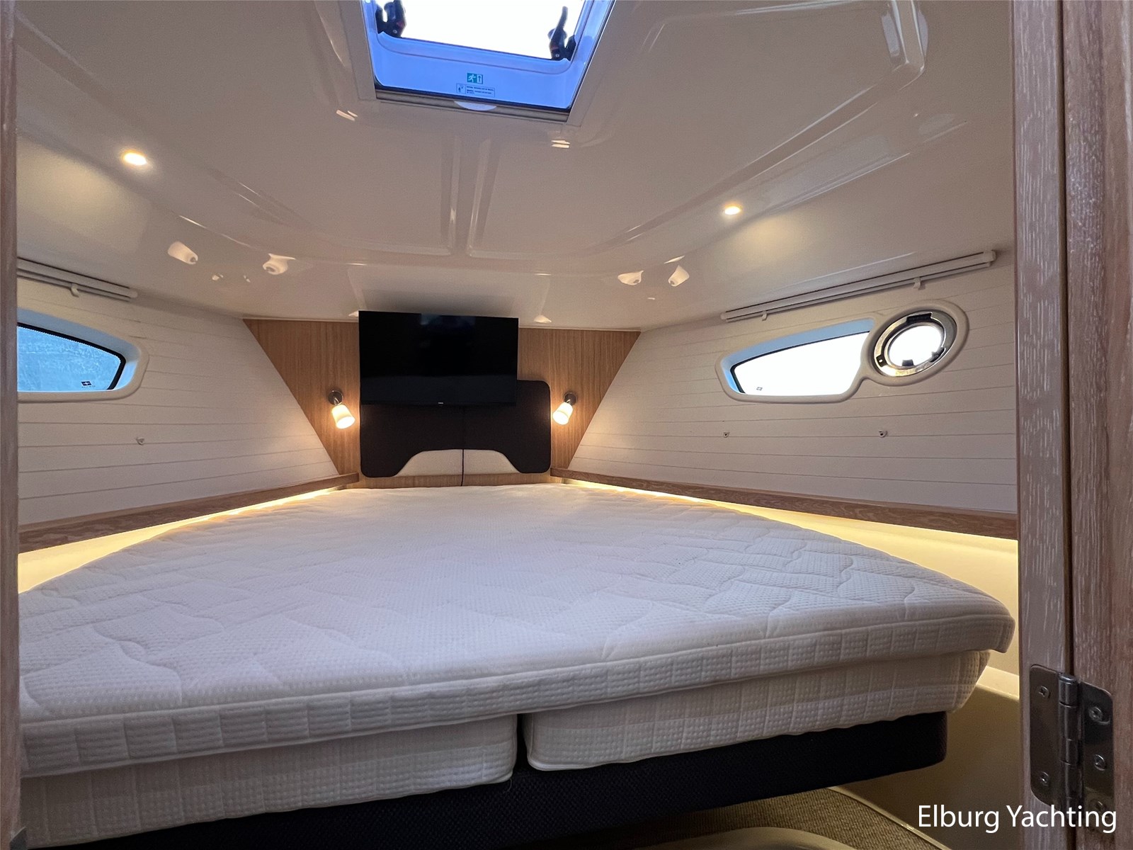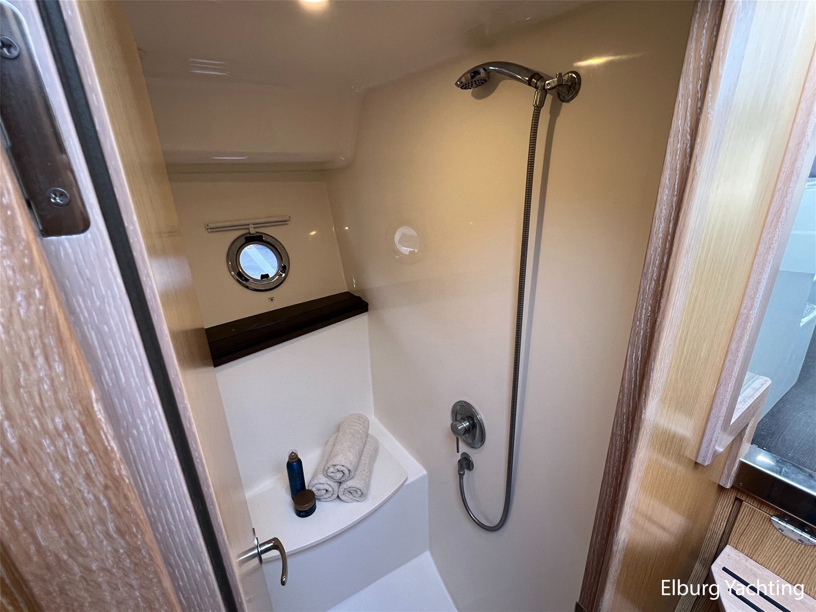 This young Bavaria E40 is offered by her second owner. Built with plenty of useable space for her size, the Bavaria E40 Sedan features three full cabins. This example is equipped with the top engine, a 300 hp Volvo Penta D4 with fixed shaft transmission, which achieves a top speed of approximately 13 knots. The cockpit offers space for approximately eight people and runs parallel to the side decks. From the open cockpit, there is a short passage to the saloon, where the raised helm station is located on the right side. The helm station offers space for at least two people and is equipped with all the necessary modern navigation equipment, including electric bow and stern thrusters controls, a fixed Simrad HS35 VHF radio with a second paired handheld device, a Simrad NSS Evo 3 plotter with autopilot, and a Fusion audio system with volume controls in both the saloon and cockpit. A spacious galley is located to port of the saloon, with the dinette on the starboard side offering a full view around. The saloon features large windows that create a sense of space and allow plenty of natural light. Three sliding windows are located between the helm station and the cockpit, allowing the captain and his guests to enjoy the cruise together. Forward in the ship is a double beth, with a toilet on the port side and a shower enclosure on the starboard side. Behind the helm station, a staircase leads down to the second and third cabins, each with a double bed. There is also a second bathroom with a shared shower and toilet. This Bavaria E40 is also equipped with: integrated cockpit benches with removable cushions, a complete cockpit tent (2025), removable stainless steel davits, a foldable bathing platform in the transom, two roof hatches in the saloon and two sliding windows (starboard and portside), cusions available for sunbed on frontdeck, large storage hatch in the bow, a TV in the saloon and all cabins, and a stainless steel mast with top light which can be folded achieving a minimum height of approximately 3.80m.
