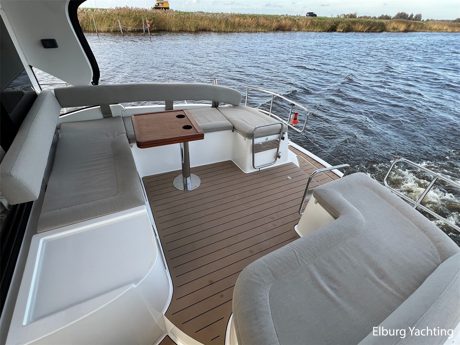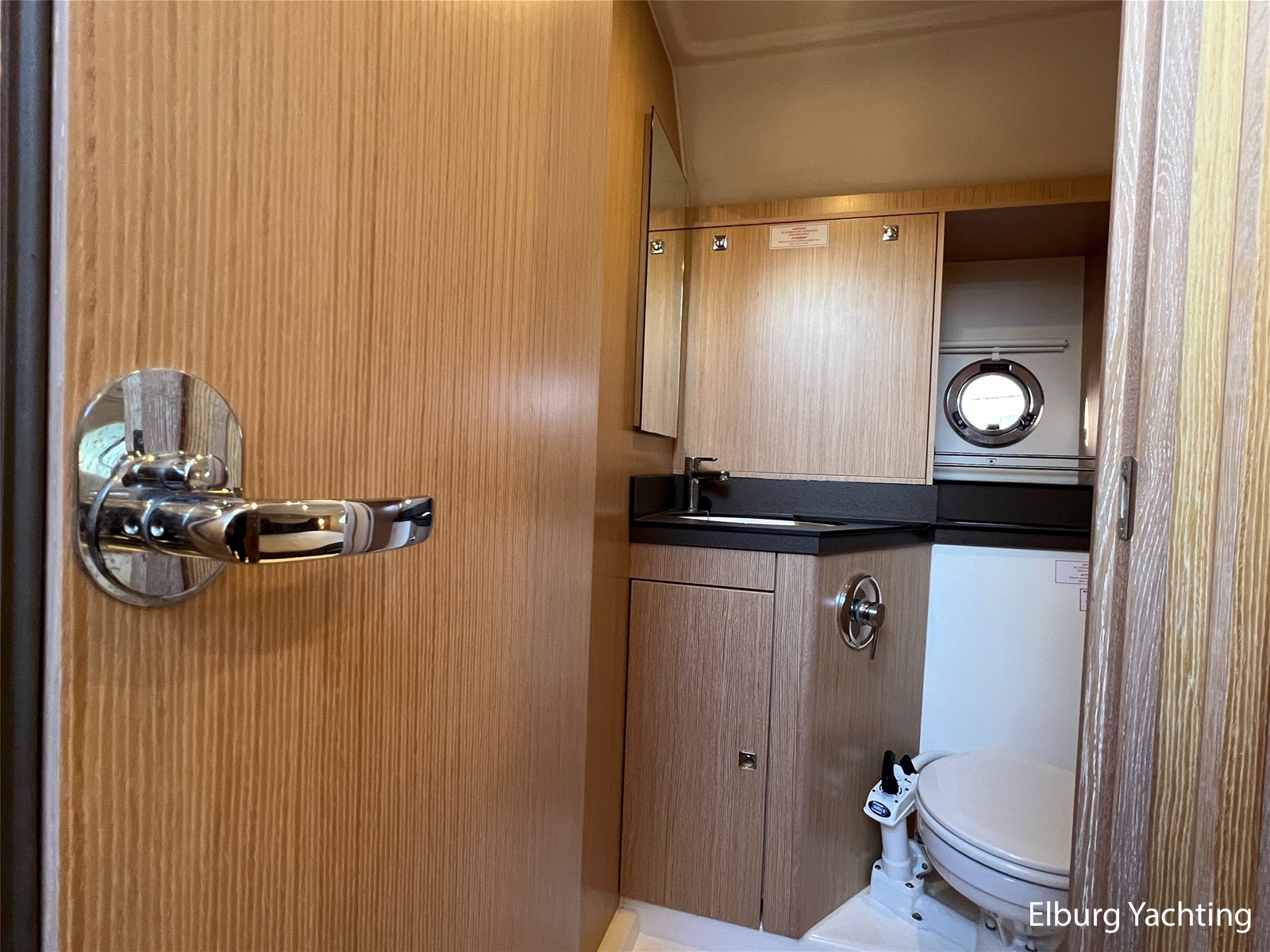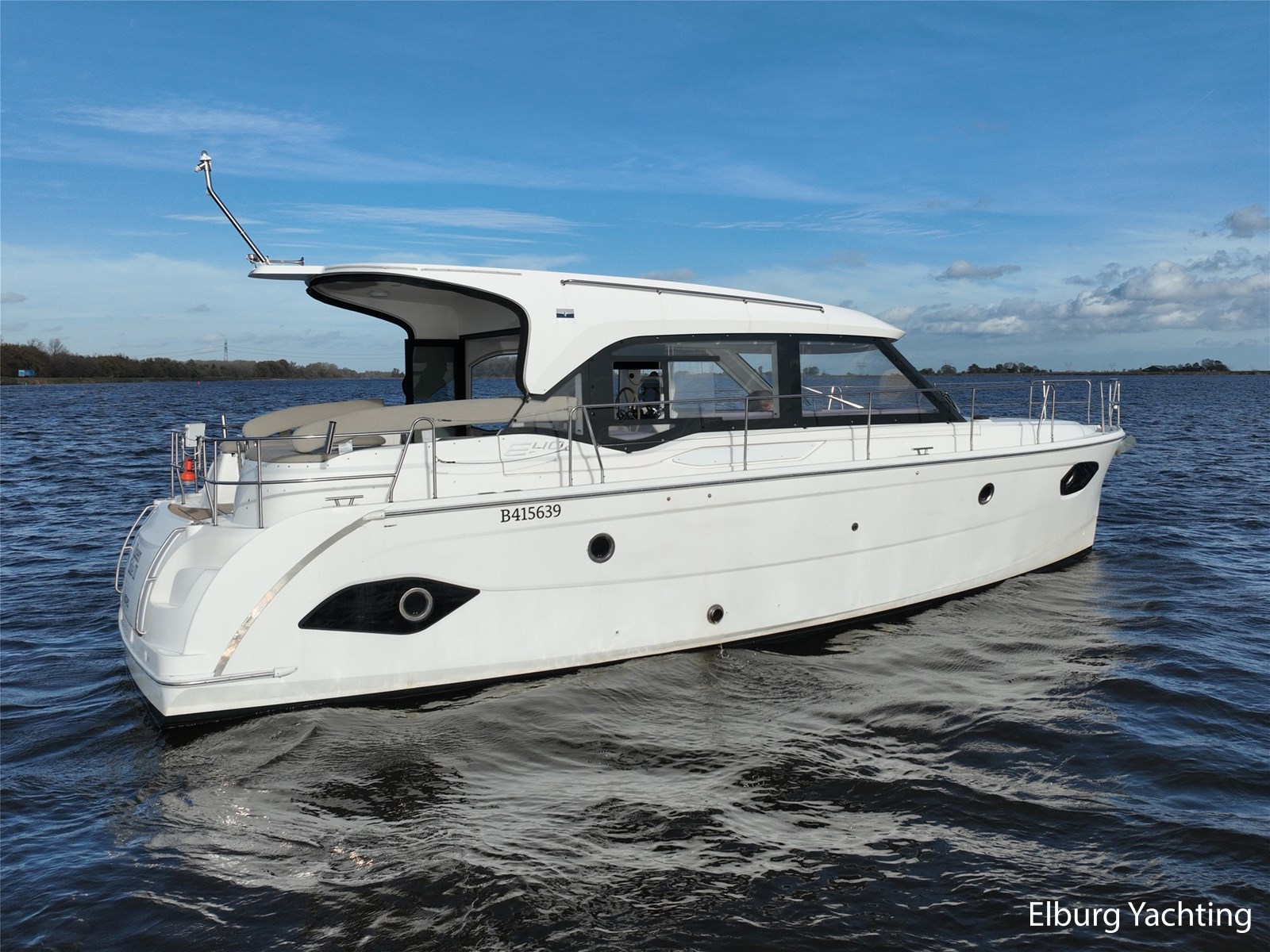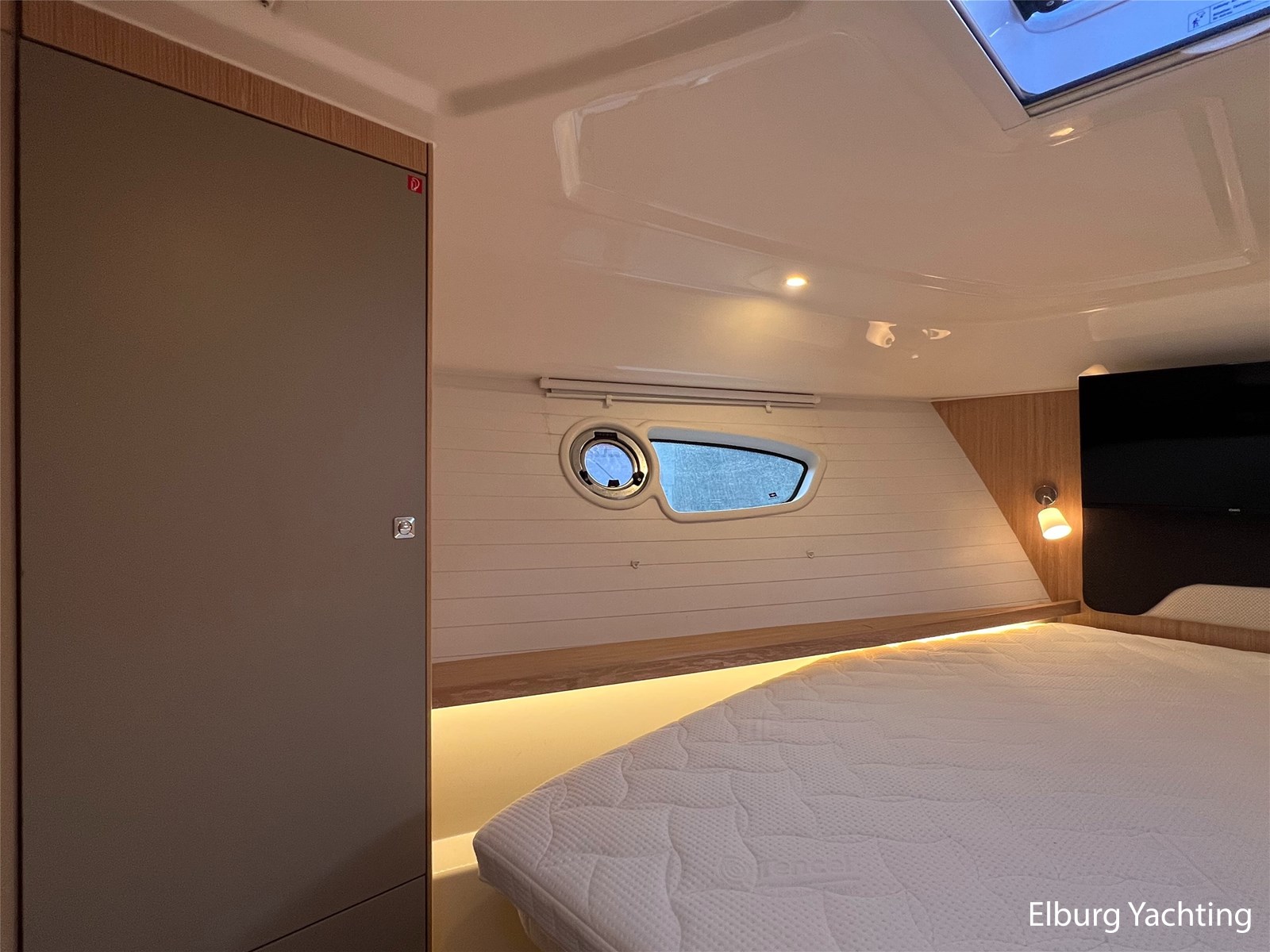 This young Bavaria E40 is offered by her second owner. Built with plenty of useable space for her size, the Bavaria E40 Sedan features three full cabins. This example is equipped with the top engine, a 300 hp Volvo Penta D4 with fixed shaft transmission, which achieves a top speed of approximately 13 knots. The cockpit offers space for approximately eight people and runs parallel to the side decks. From the open cockpit, there is a short passage to the saloon, where the raised helm station is located on the right side. The helm station offers space for at least two people and is equipped with all the necessary modern navigation equipment, including electric bow and stern thrusters controls, a fixed Simrad HS35 VHF radio with a second paired handheld device, a Simrad NSS Evo 3 plotter with autopilot, and a Fusion audio system with volume controls in both the saloon and cockpit. A spacious galley is located to port of the saloon, with the dinette on the starboard side offering a full view around. The saloon features large windows that create a sense of space and allow plenty of natural light. Three sliding windows are located between the helm station and the cockpit, allowing the captain and his guests to enjoy the cruise together. Forward in the ship is a double beth, with a toilet on the port side and a shower enclosure on the starboard side. Behind the helm station, a staircase leads down to the second and third cabins, each with a double bed. There is also a second bathroom with a shared shower and toilet. This Bavaria E40 is also equipped with: integrated cockpit benches with removable cushions, a complete cockpit tent (2025), removable stainless steel davits, a foldable bathing platform in the transom, two roof hatches in the saloon and two sliding windows (starboard and portside), cusions available for sunbed on frontdeck, large storage hatch in the bow, a TV in the saloon and all cabins, and a stainless steel mast with top light which can be folded achieving a minimum height of approximately 3.80m.