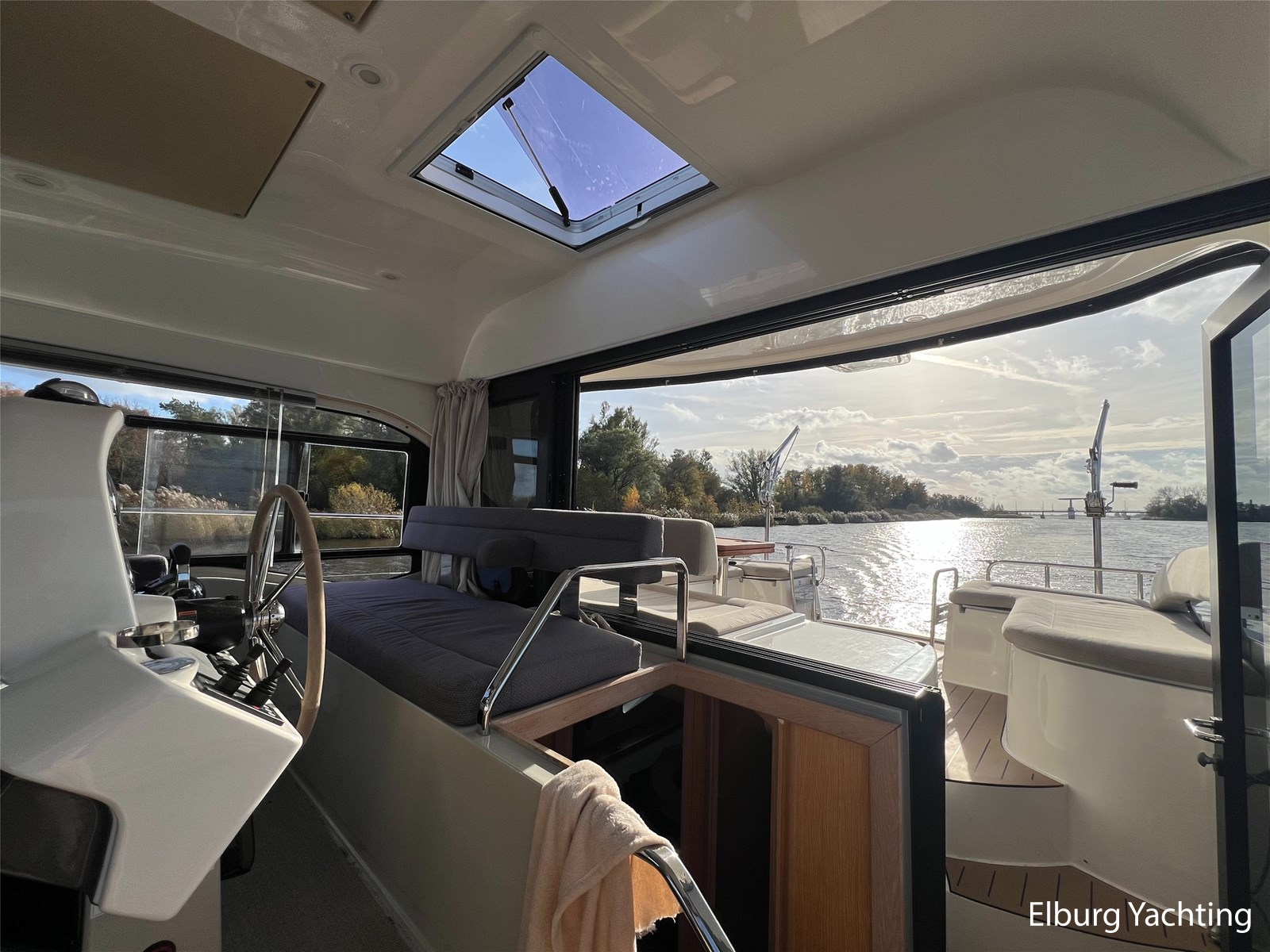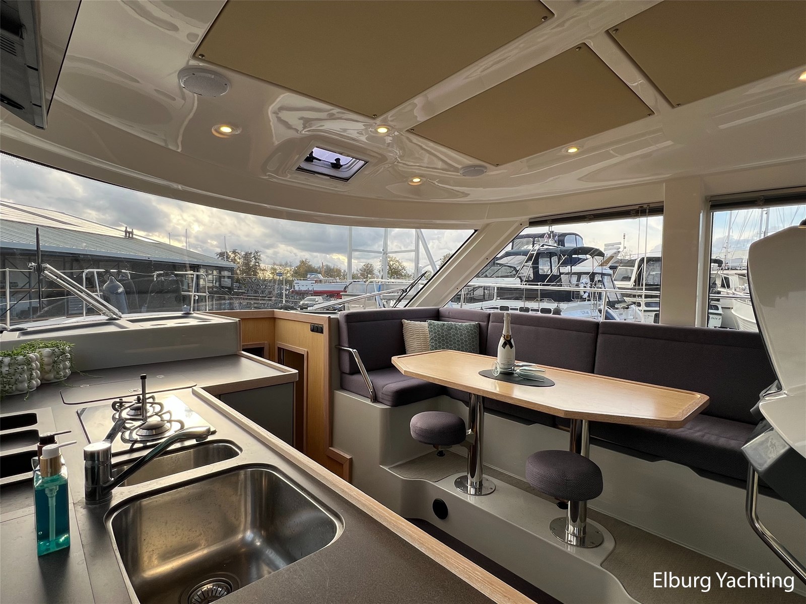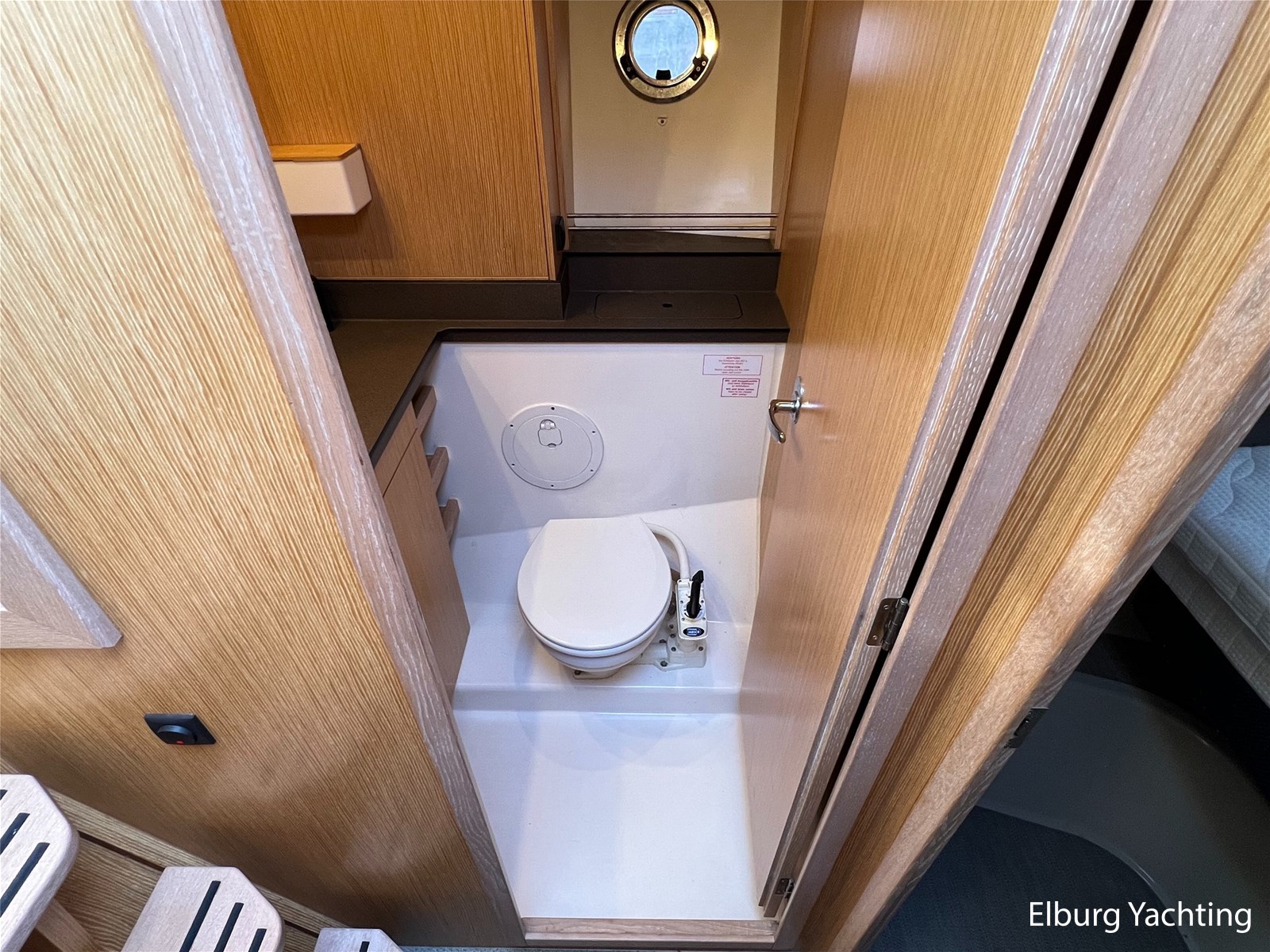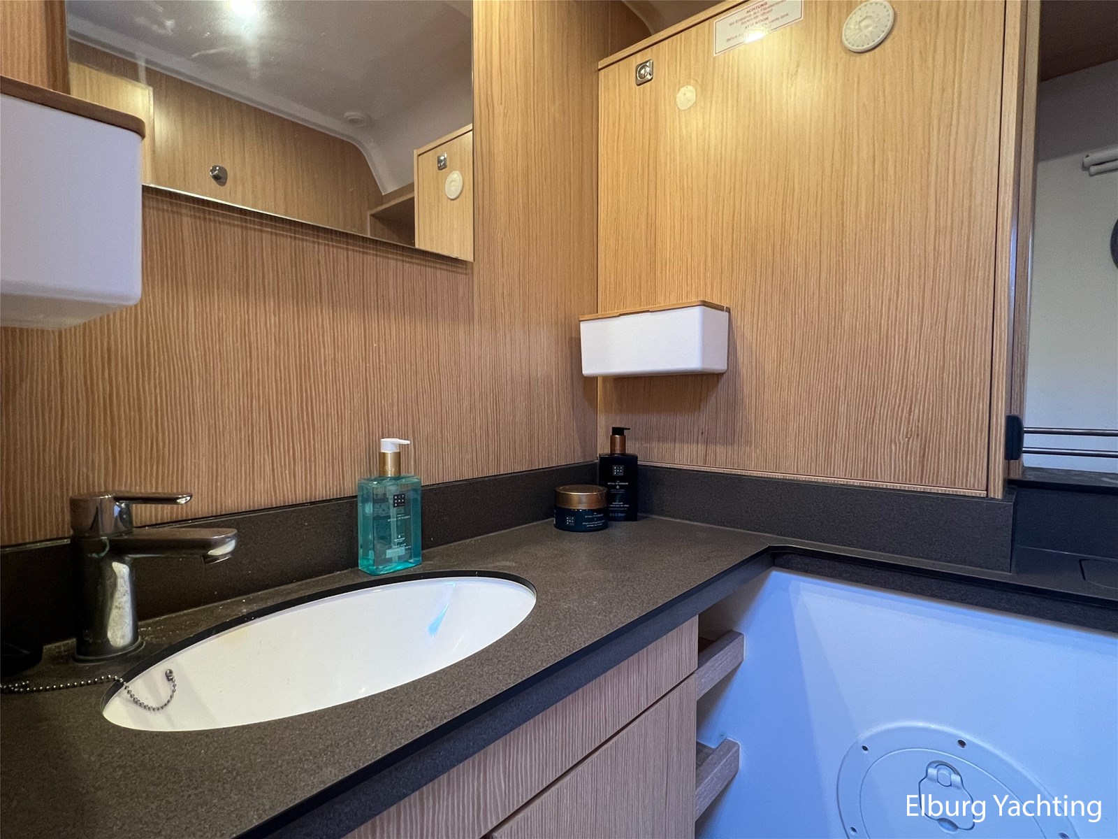 This young Bavaria E40 is offered by her second owner. Built with plenty of useable space for her size, the Bavaria E40 Sedan features three full cabins. This example is equipped with the top engine, a 300 hp Volvo Penta D4 with fixed shaft transmission, which achieves a top speed of approximately 13 knots. The cockpit offers space for approximately eight people and runs parallel to the side decks. From the open cockpit, there is a short passage to the saloon, where the raised helm station is located on the right side. The helm station offers space for at least two people and is equipped with all the necessary modern navigation equipment, including electric bow and stern thrusters controls, a fixed Simrad HS35 VHF radio with a second paired handheld device, a Simrad NSS Evo 3 plotter with autopilot, and a Fusion audio system with volume controls in both the saloon and cockpit. A spacious galley is located to port of the saloon, with the dinette on the starboard side offering a full view around. The saloon features large windows that create a sense of space and allow plenty of natural light. Three sliding windows are located between the helm station and the cockpit, allowing the captain and his guests to enjoy the cruise together. Forward in the ship is a double beth, with a toilet on the port side and a shower enclosure on the starboard side. Behind the helm station, a staircase leads down to the second and third cabins, each with a double bed. There is also a second bathroom with a shared shower and toilet. This Bavaria E40 is also equipped with: integrated cockpit benches with removable cushions, a complete cockpit tent (2025), removable stainless steel davits, a foldable bathing platform in the transom, two roof hatches in the saloon and two sliding windows (starboard and portside), cusions available for sunbed on frontdeck, large storage hatch in the bow, a TV in the saloon and all cabins, and a stainless steel mast with top light which can be folded achieving a minimum height of approximately 3.80m.