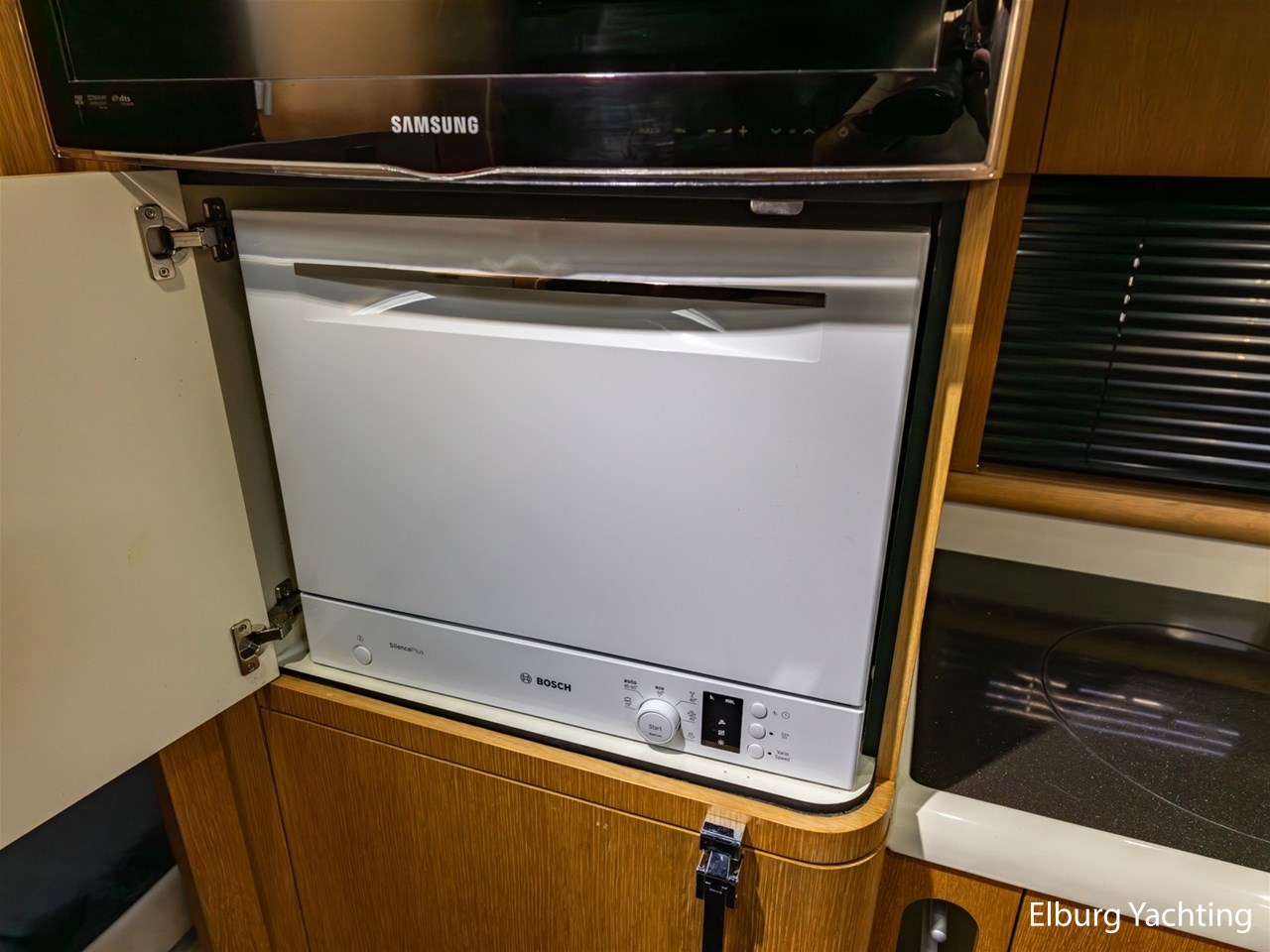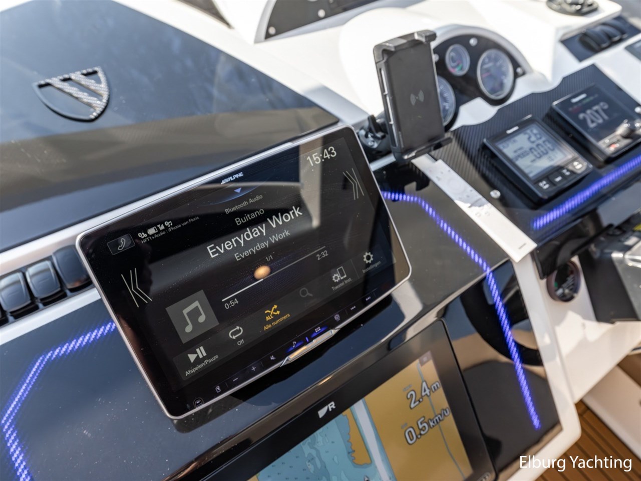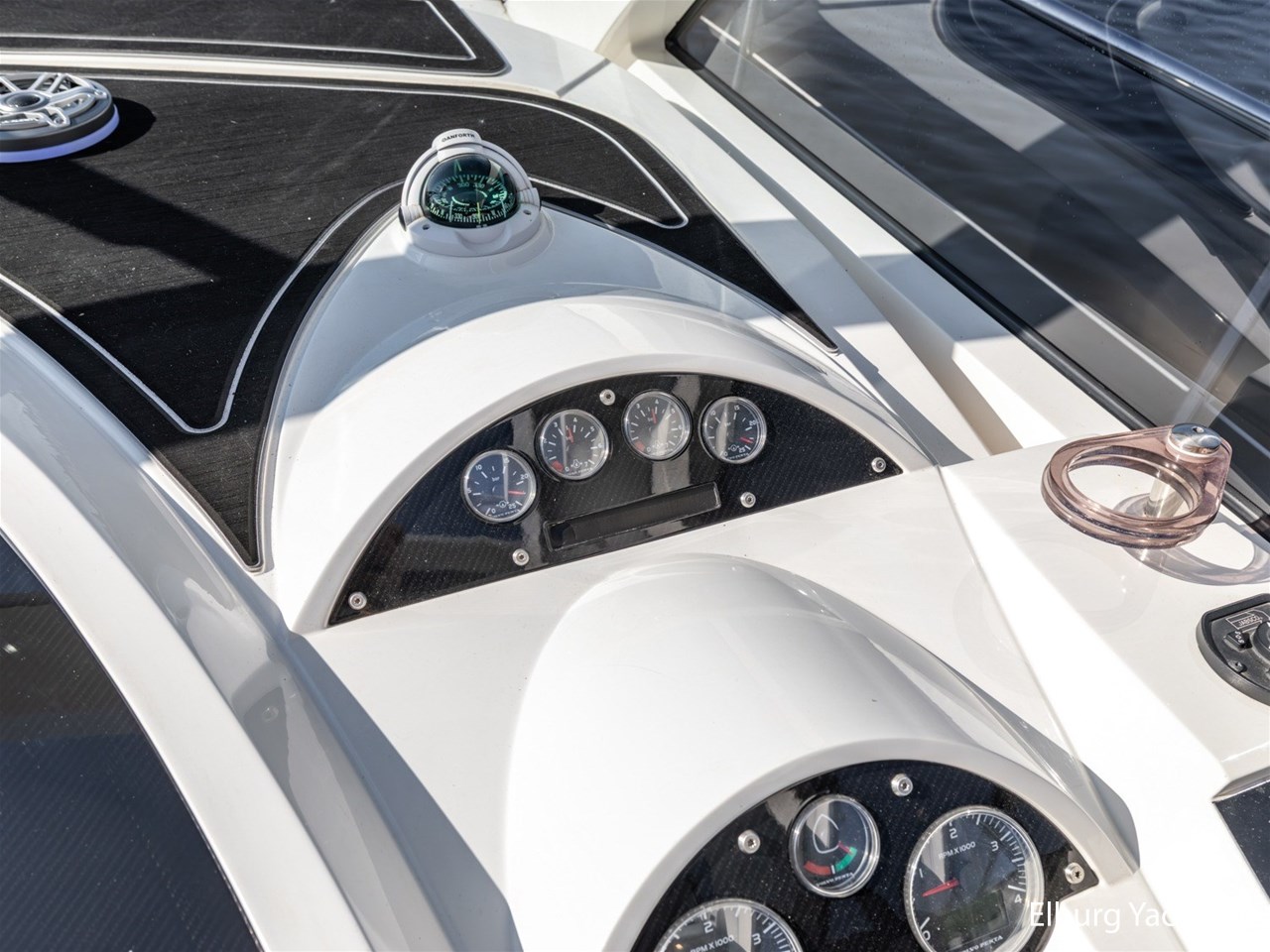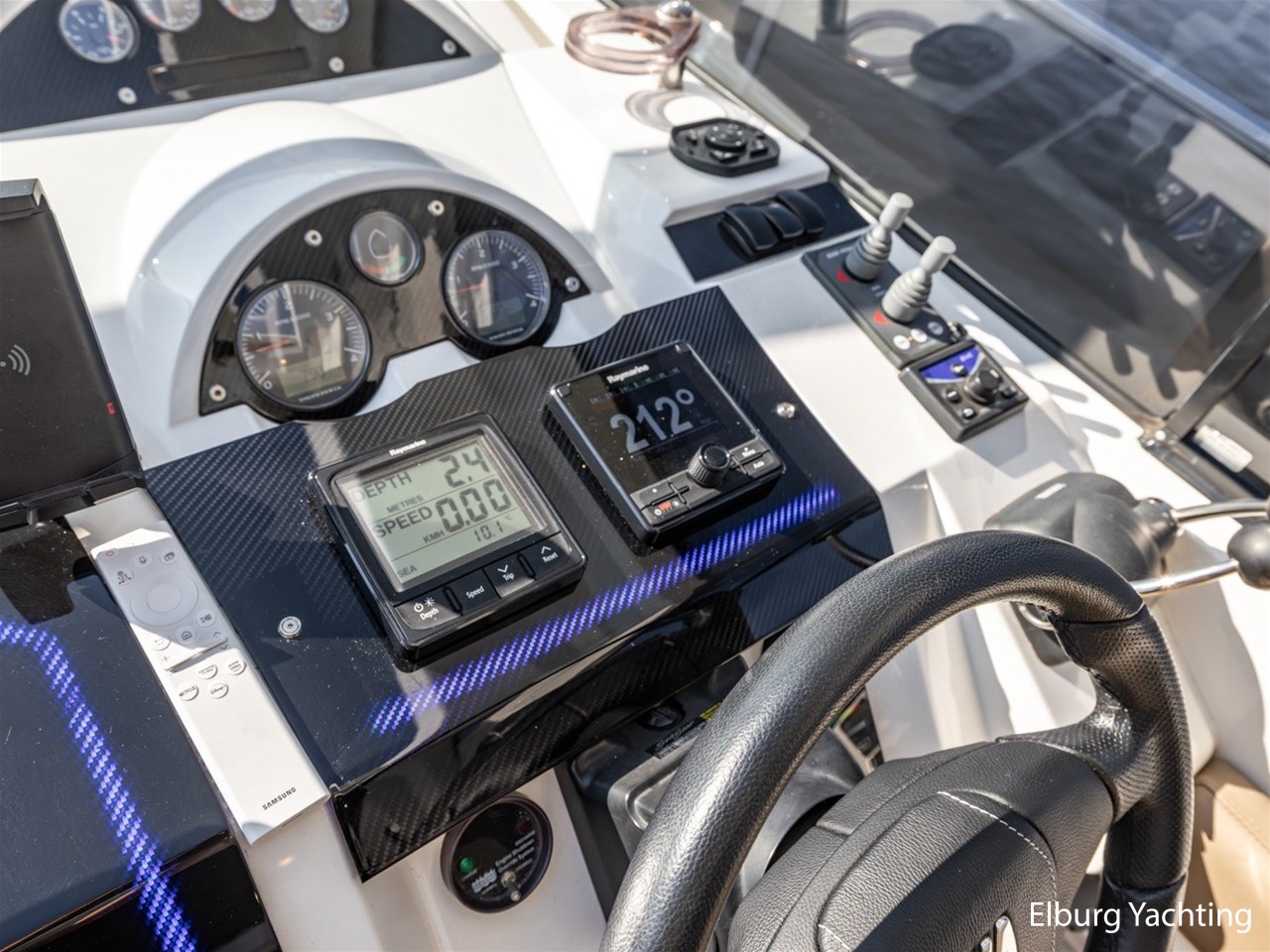 The galley is fully equipped with, among other things, a dishwasher, Isotherm refrigerator, refrigerator with ice maker, and a microwave. The dashboard is custom-made from carbon fiber and see-through carbon. Ambient lighting is also present in the cockpit and can be adjusted to your preference. The yacht is fitted with an original Fairline steering wheel.