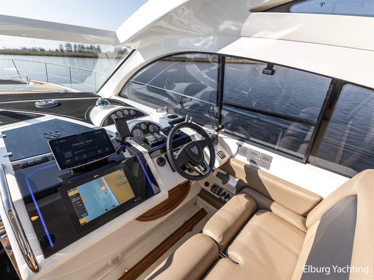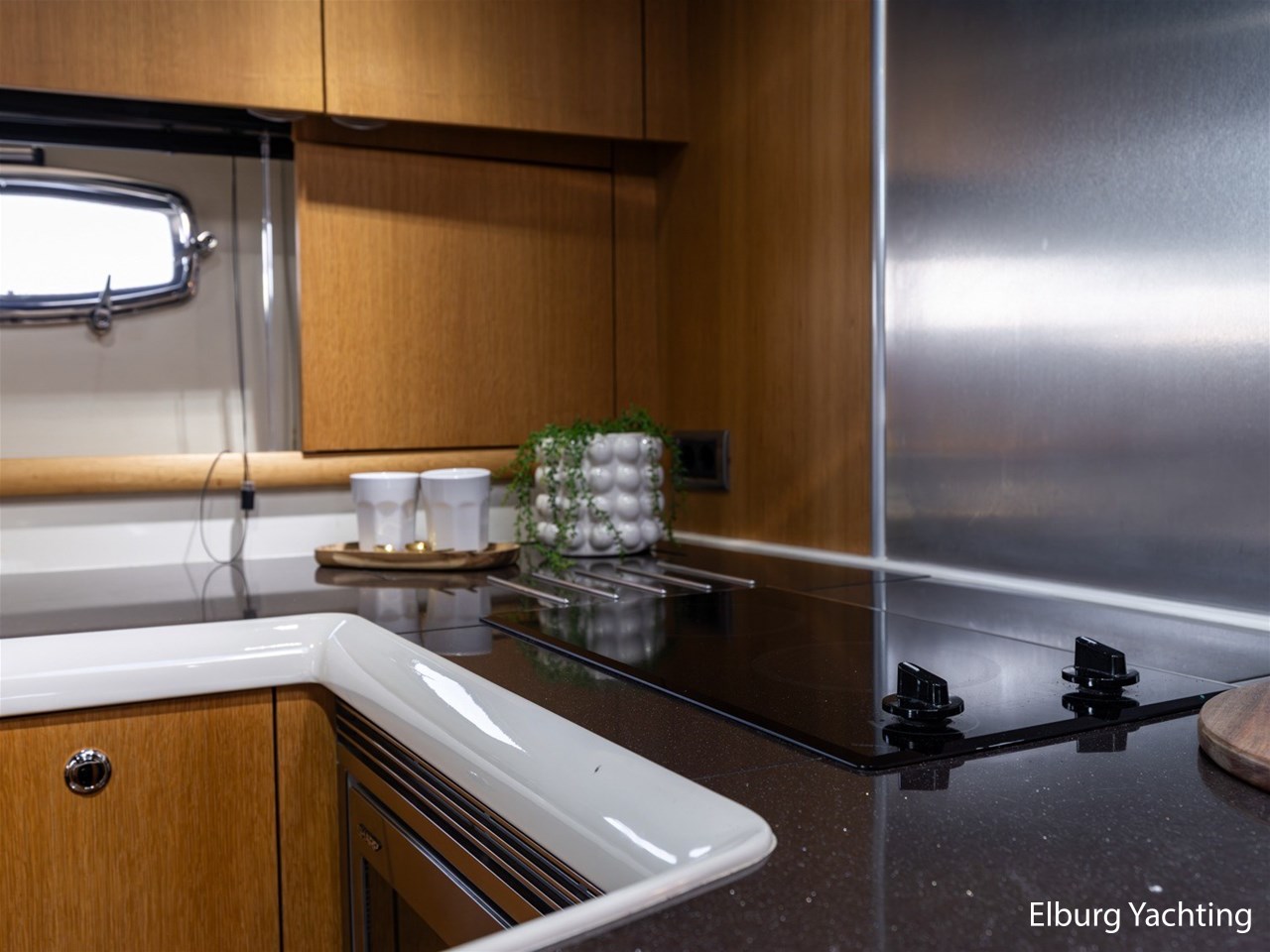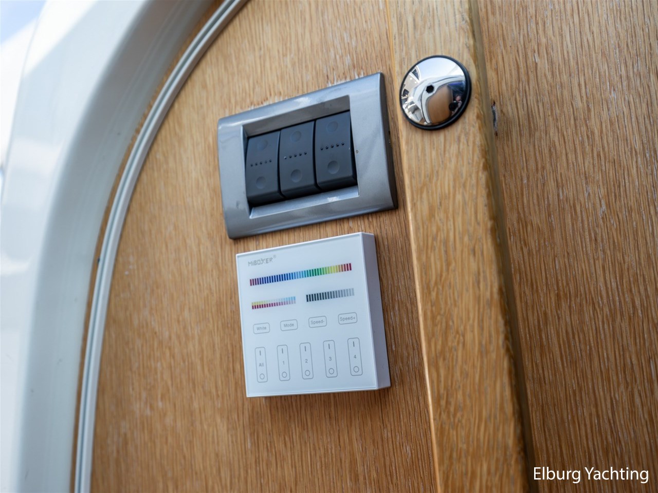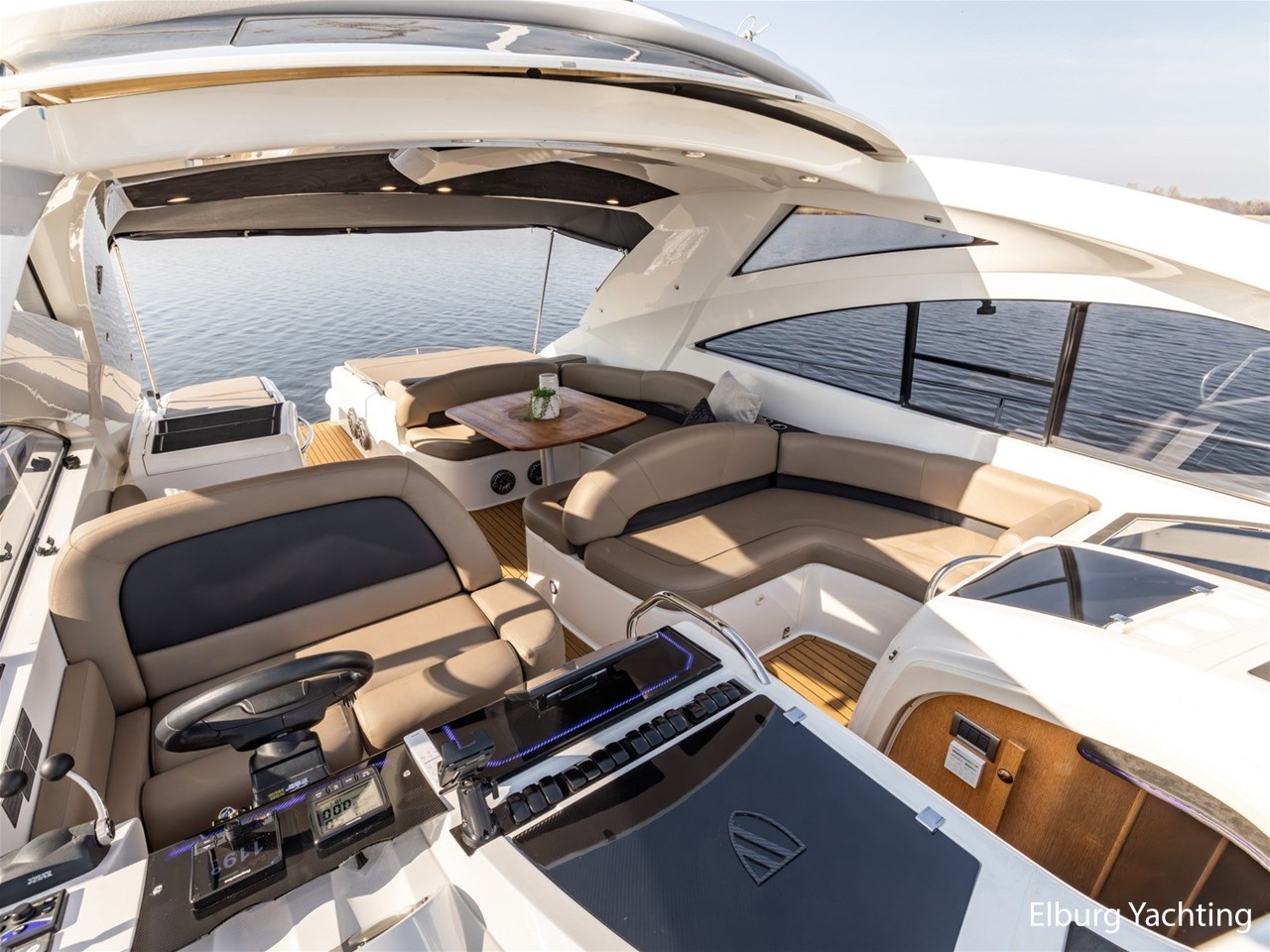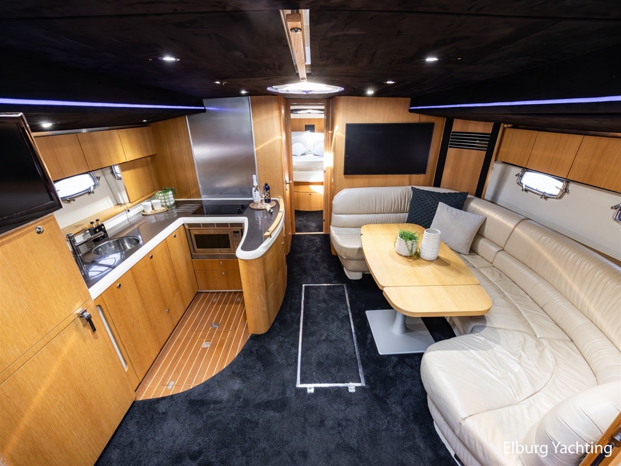 The galley is fully equipped with, among other things, a dishwasher, Isotherm refrigerator, refrigerator with ice maker, and a microwave. The dashboard is custom-made from carbon fiber and see-through carbon. Ambient lighting is also present in the cockpit and can be adjusted to your preference. The yacht is fitted with an original Fairline steering wheel.