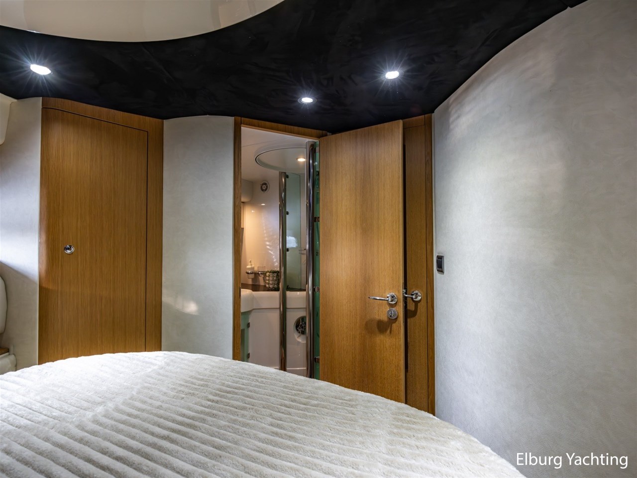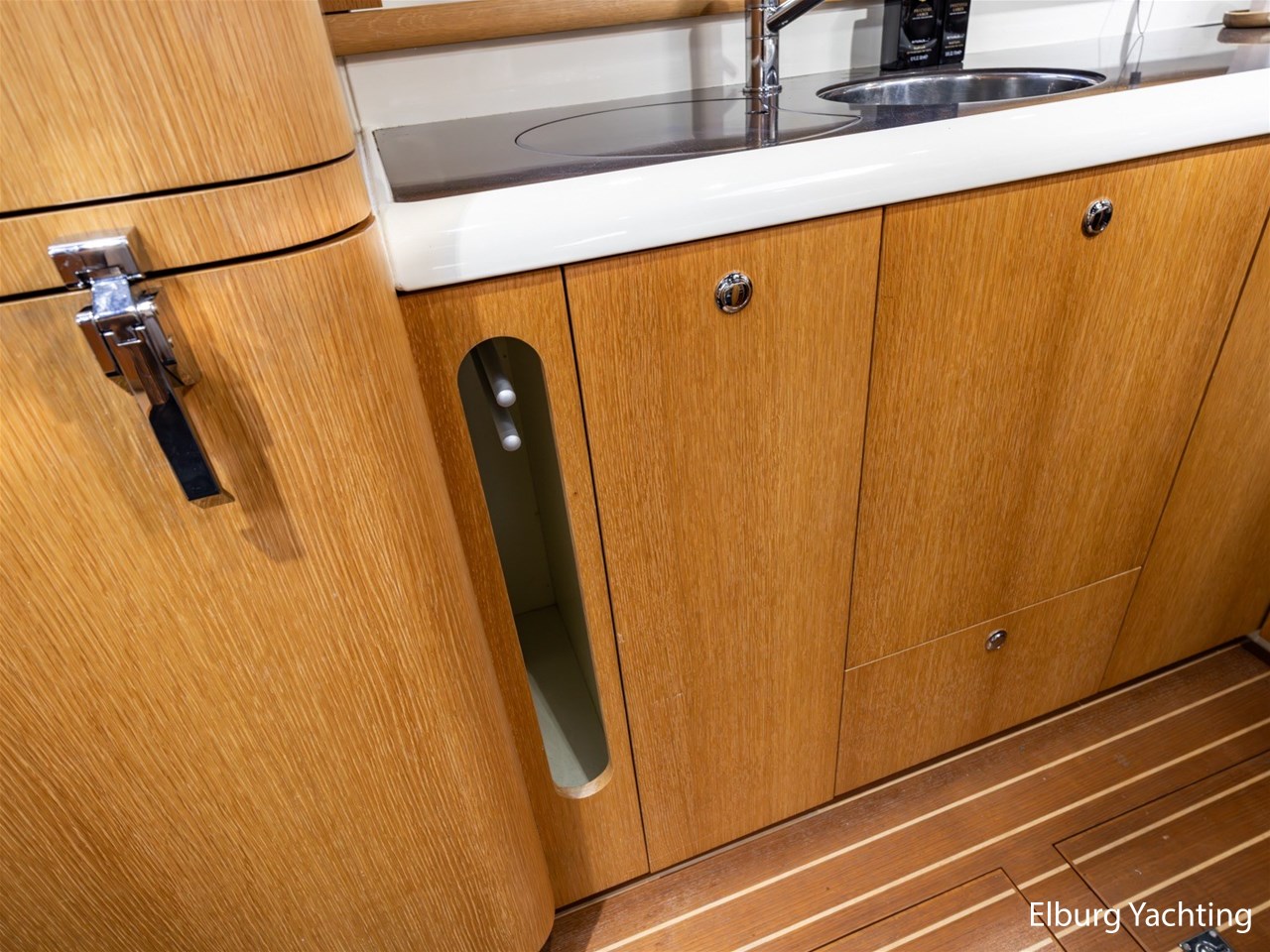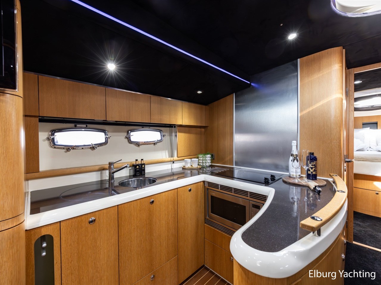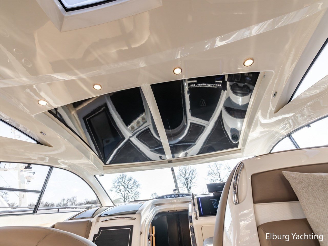 The galley is fully equipped with, among other things, a dishwasher, Isotherm refrigerator, refrigerator with ice maker, and a microwave. The dashboard is custom-made from carbon fiber and see-through carbon. Ambient lighting is also present in the cockpit and can be adjusted to your preference. The yacht is fitted with an original Fairline steering wheel.
