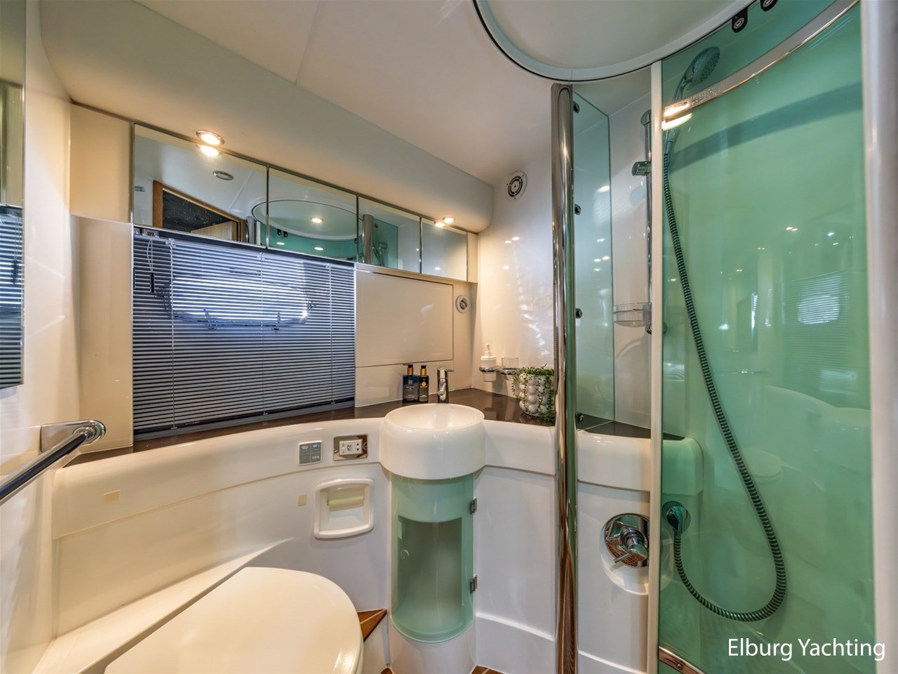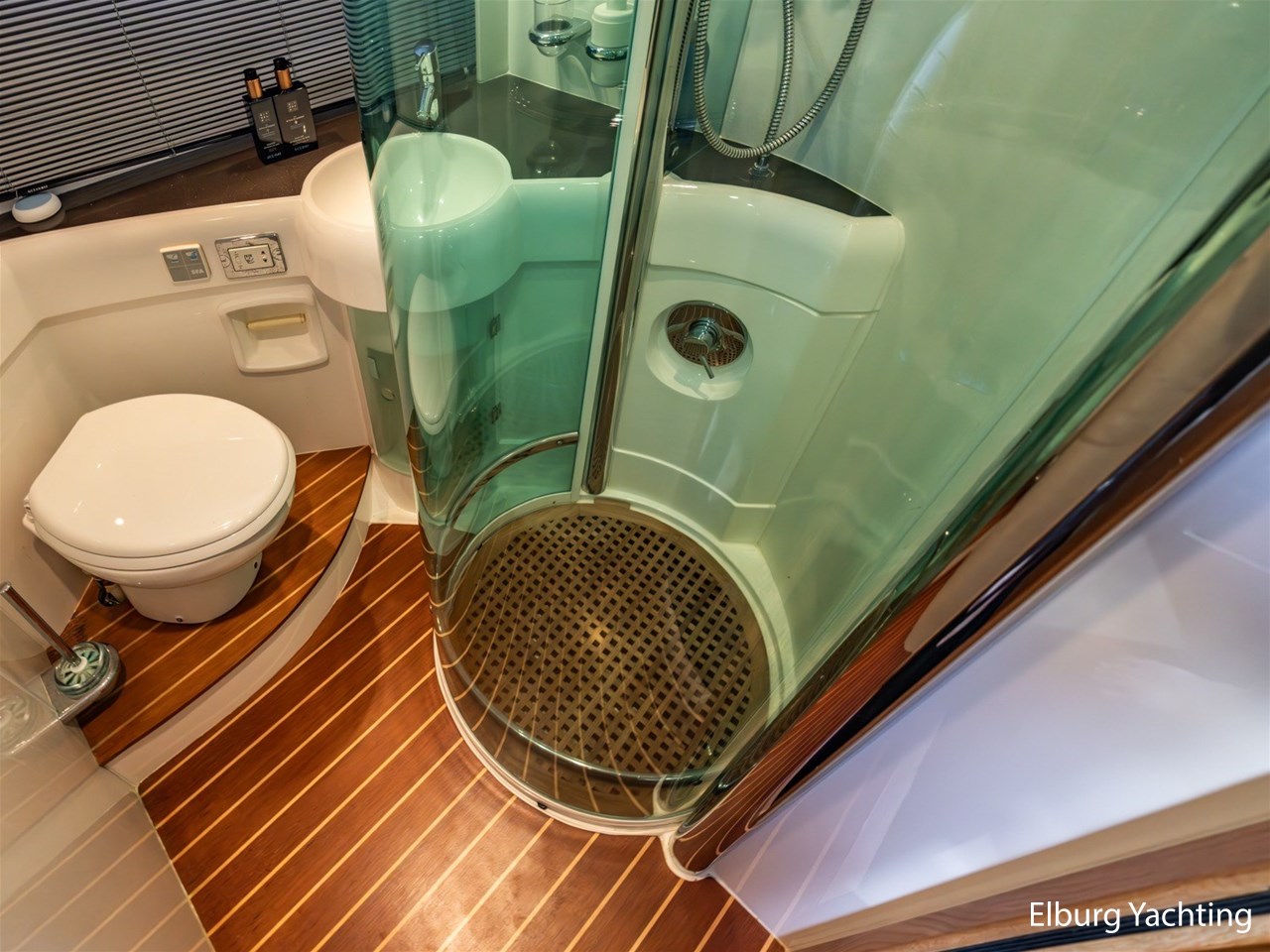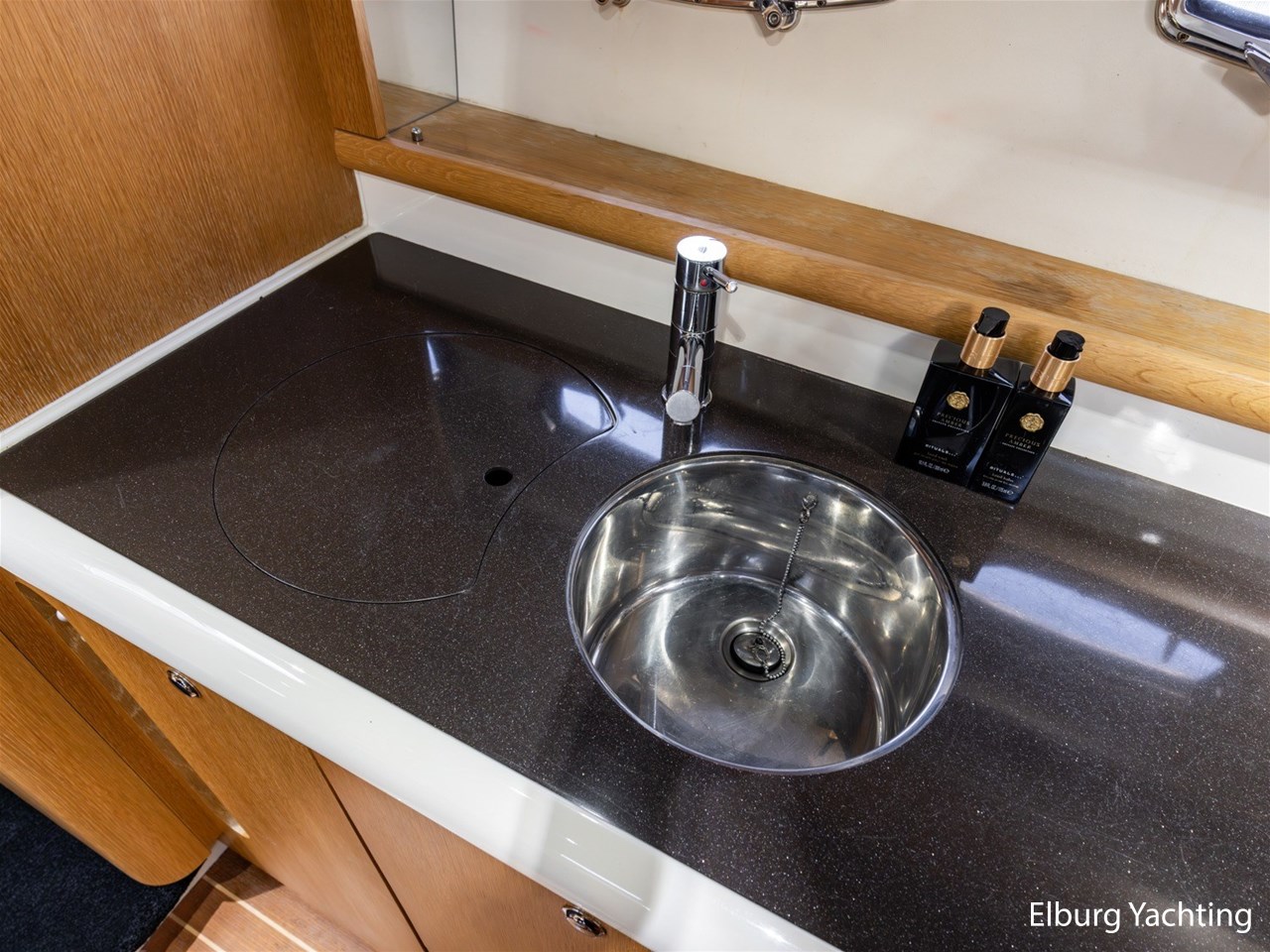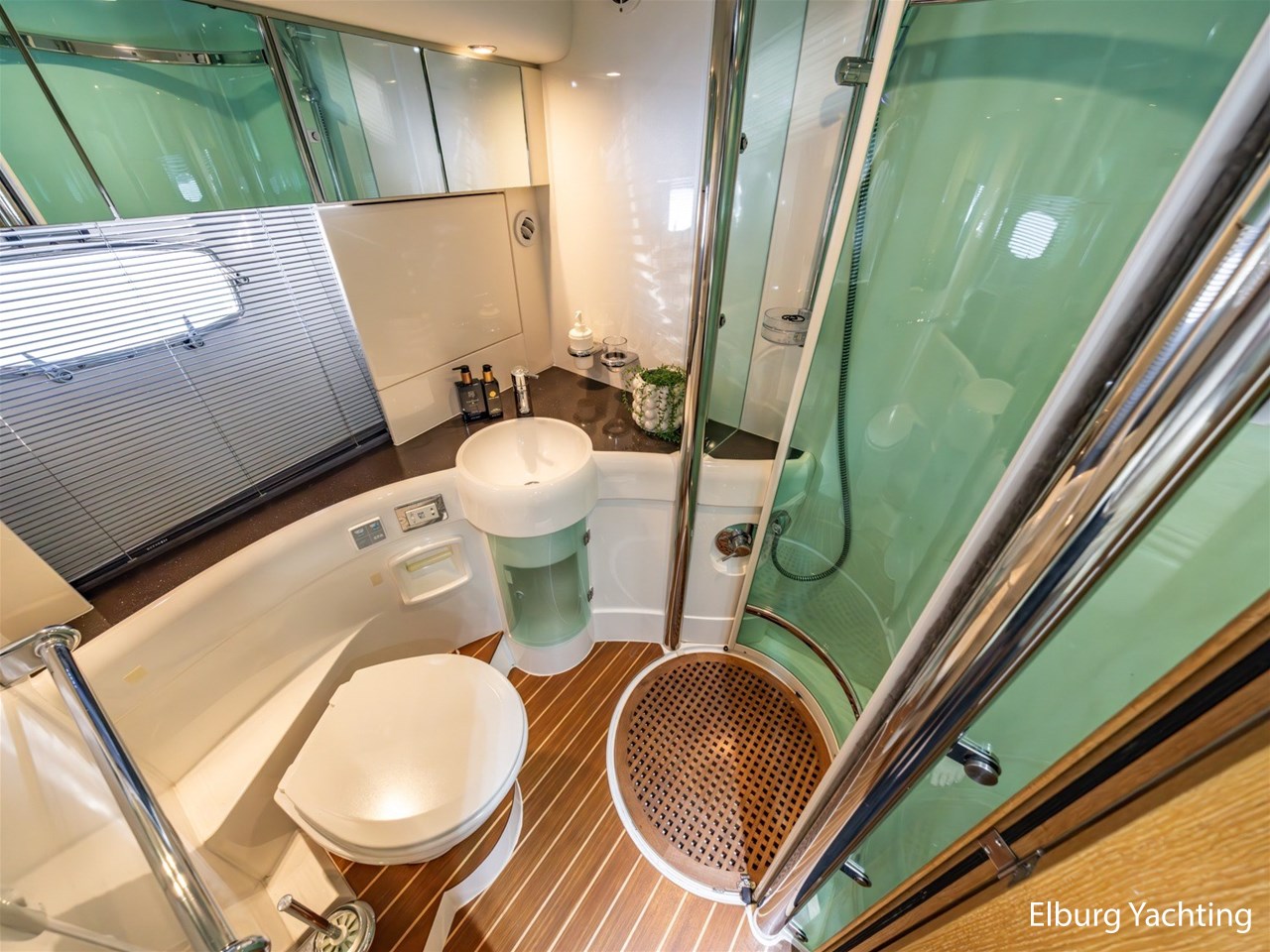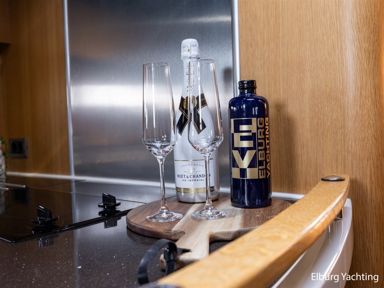 The galley is fully equipped with, among other things, a dishwasher, Isotherm refrigerator, refrigerator with ice maker, and a microwave. The dashboard is custom-made from carbon fiber and see-through carbon. Ambient lighting is also present in the cockpit and can be adjusted to your preference. The yacht is fitted with an original Fairline steering wheel.
