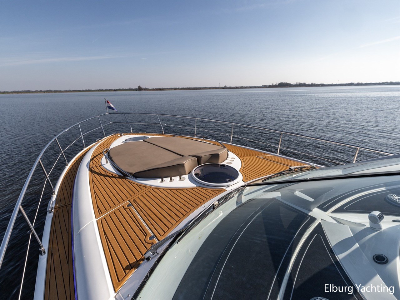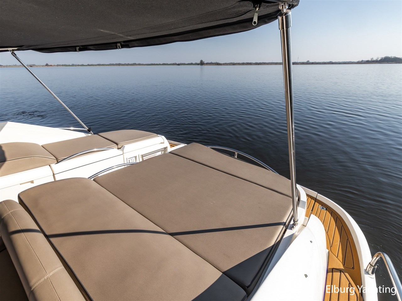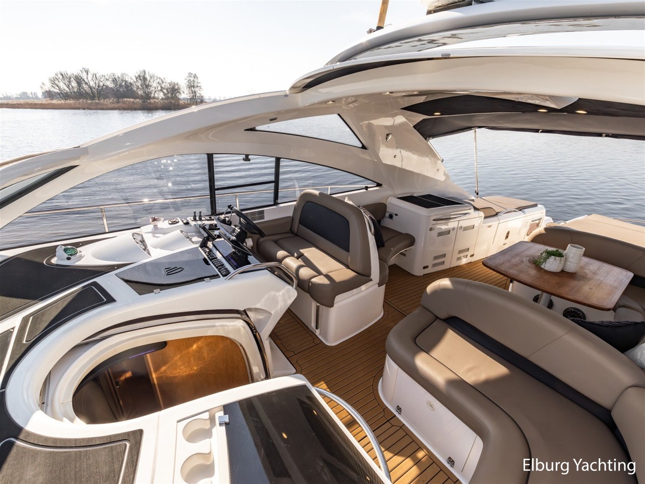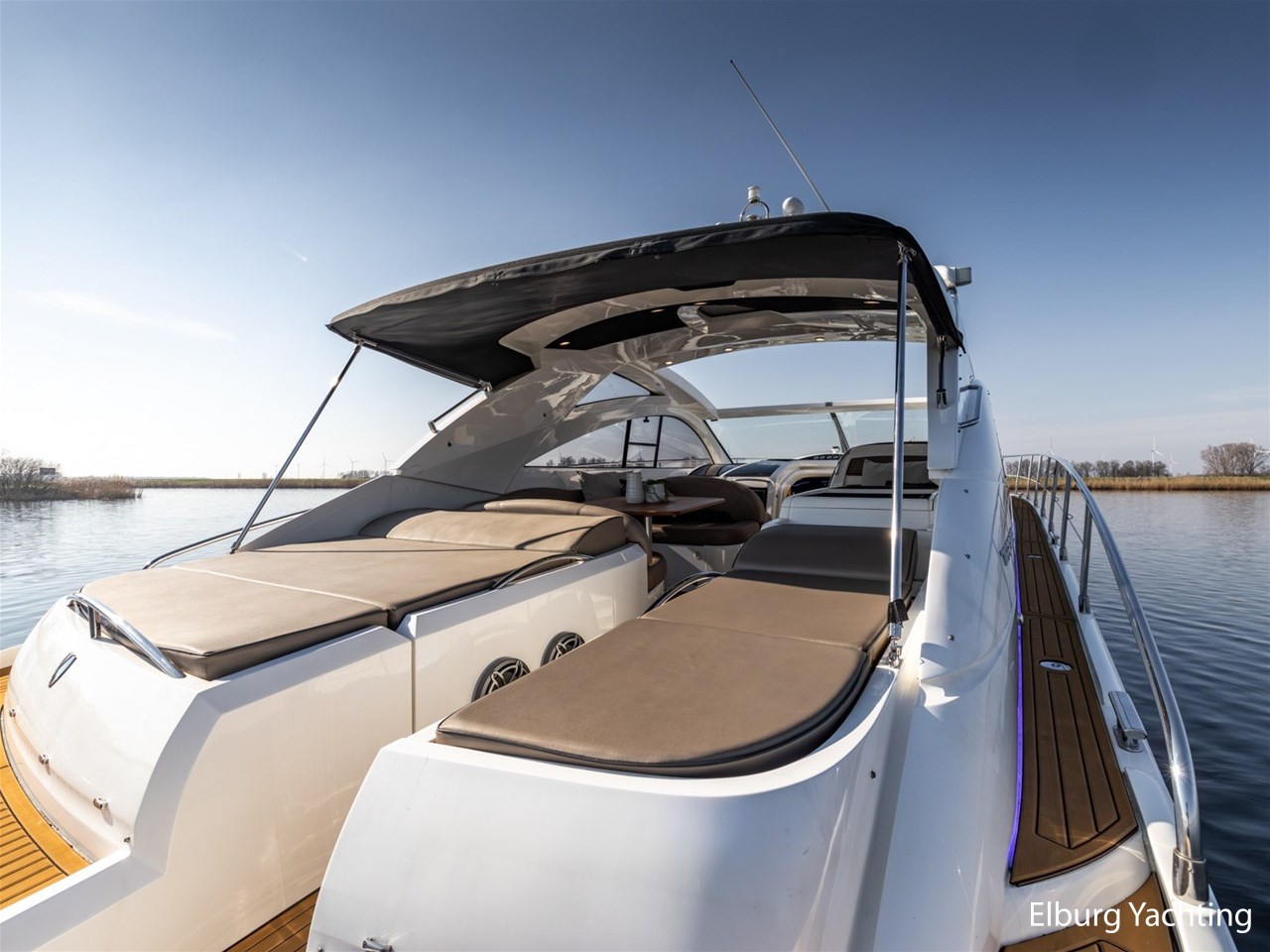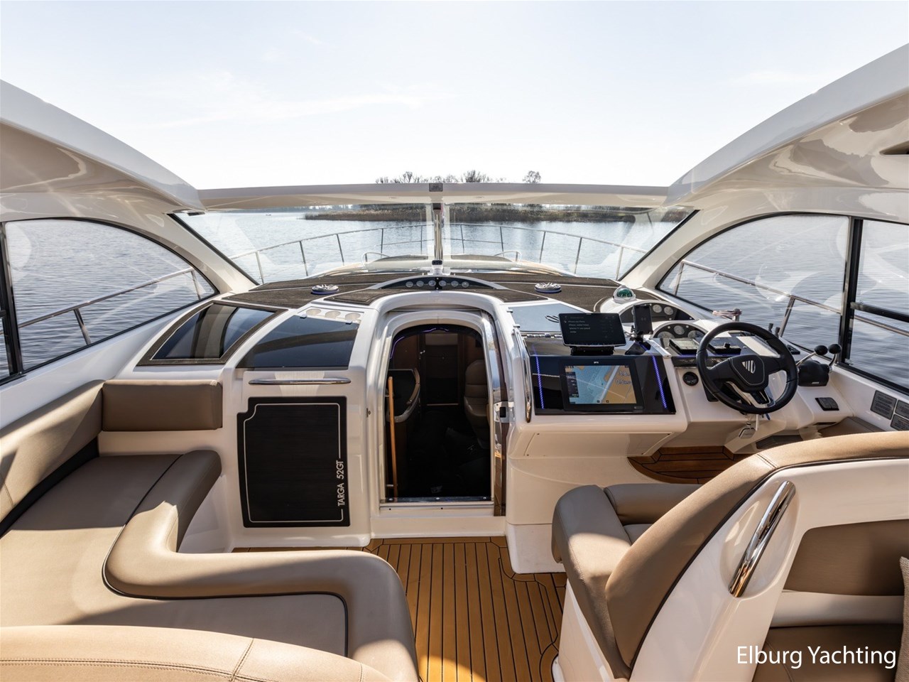 In addition, this Fairline Targa 52 GT is fully equipped with, among other things: a fully closable awning over the aft deck, a large electrically operated sunroof above the helm station, access to the engine room from the open cockpit with storage options, a height-adjustable coffee table, TV in the saloon, a deep storage hatch in the floor of the galley, mosquito nets for portholes and hatches, trim tabs, 2 x Volvo Penta on-board computers, Raymarine AIS700, cushions on the foredeck, and sunshades around the helm and cockpit.