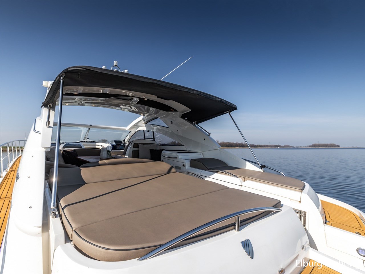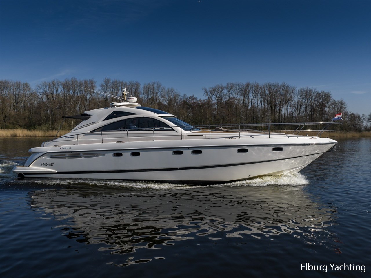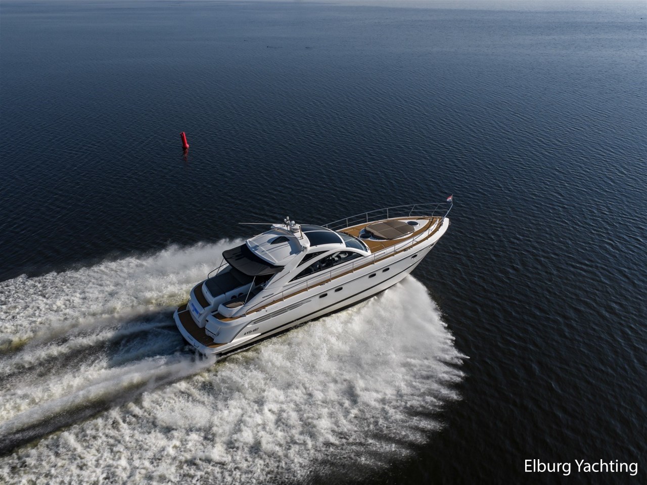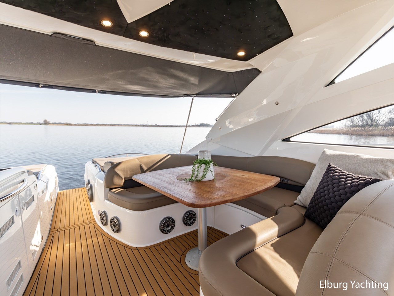In addition, this Fairline Targa 52 GT is fully equipped with, among other things: a fully closable awning over the aft deck, a large electrically operated sunroof above the helm station, access to the engine room from the open cockpit with storage options, a height-adjustable coffee table, TV in the saloon, a deep storage hatch in the floor of the galley, mosquito nets for portholes and hatches, trim tabs, 2 x Volvo Penta on-board computers, Raymarine AIS700, cushions on the foredeck, and sunshades around the helm and cockpit.