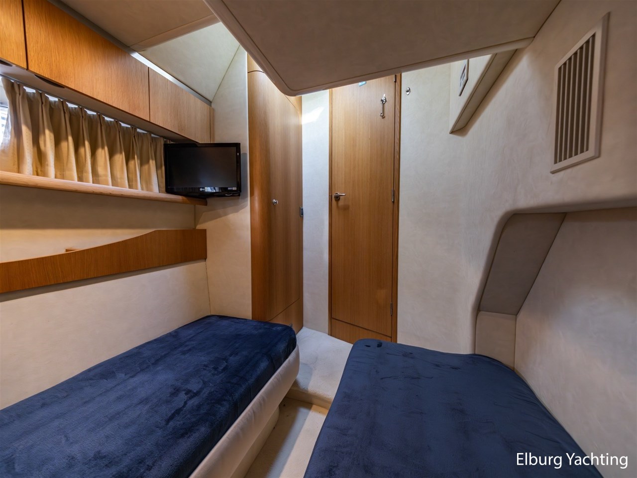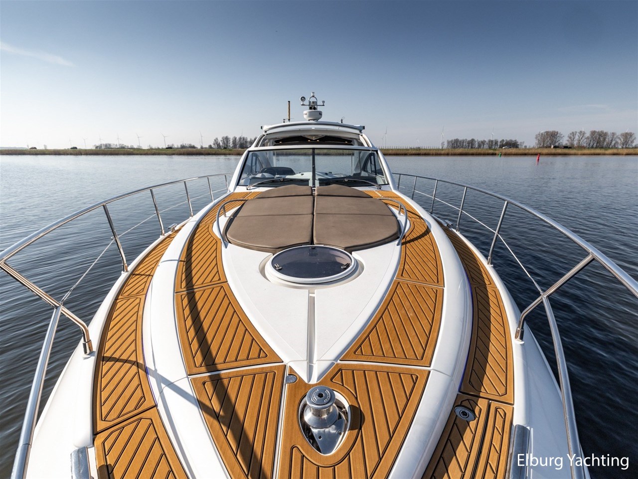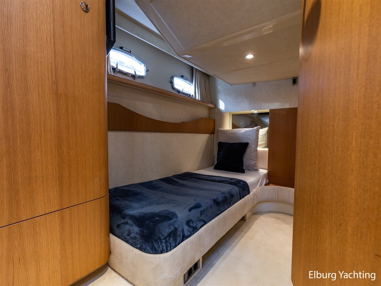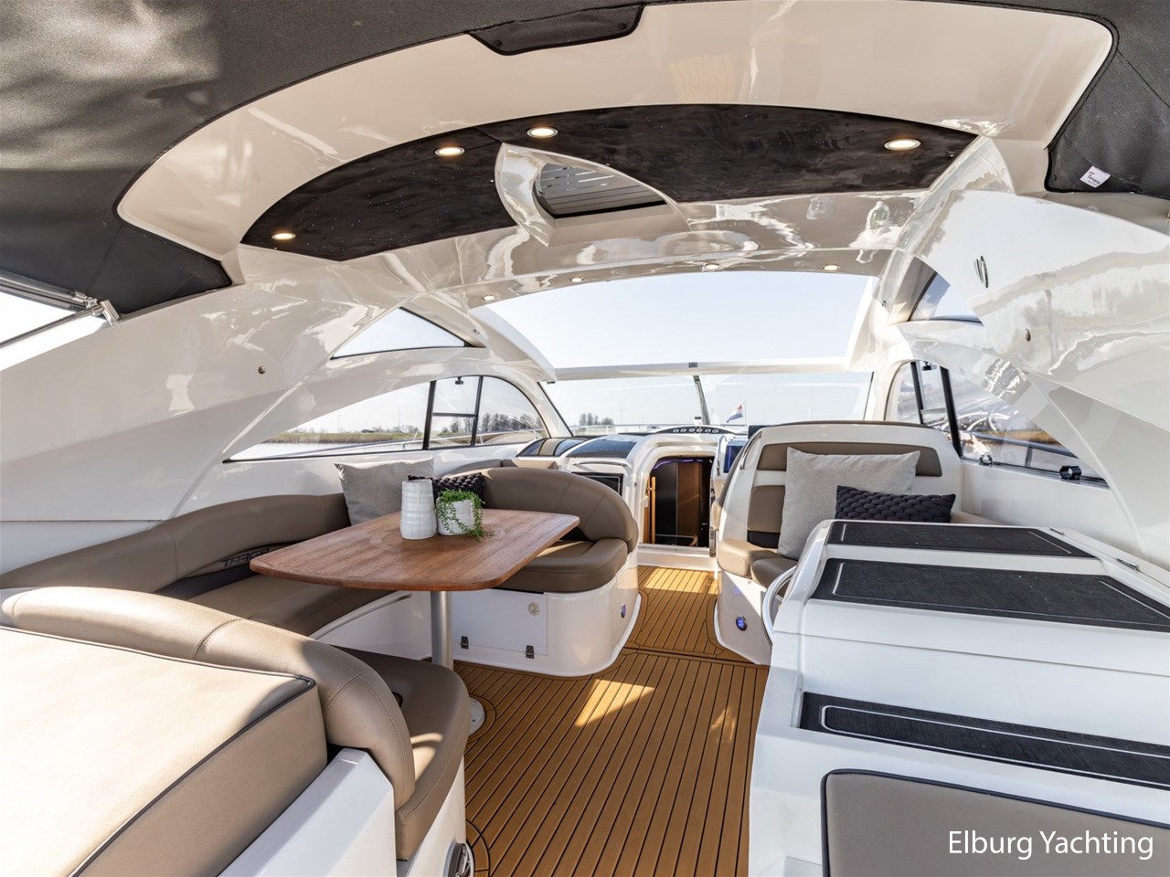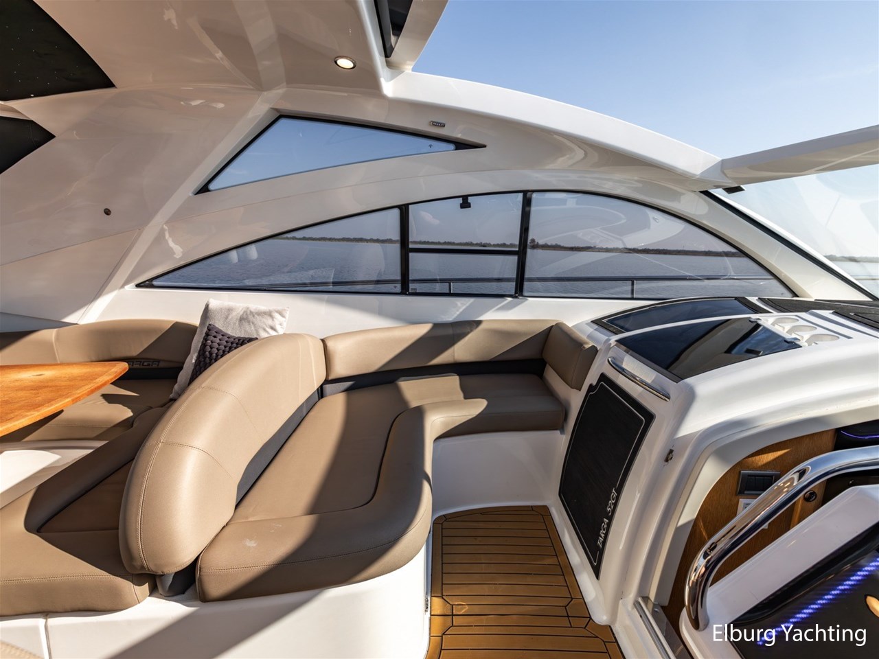 In addition, this Fairline Targa 52 GT is fully equipped with, among other things: a fully closable awning over the aft deck, a large electrically operated sunroof above the helm station, access to the engine room from the open cockpit with storage options, a height-adjustable coffee table, TV in the saloon, a deep storage hatch in the floor of the galley, mosquito nets for portholes and hatches, trim tabs, 2 x Volvo Penta on-board computers, Raymarine AIS700, cushions on the foredeck, and sunshades around the helm and cockpit.