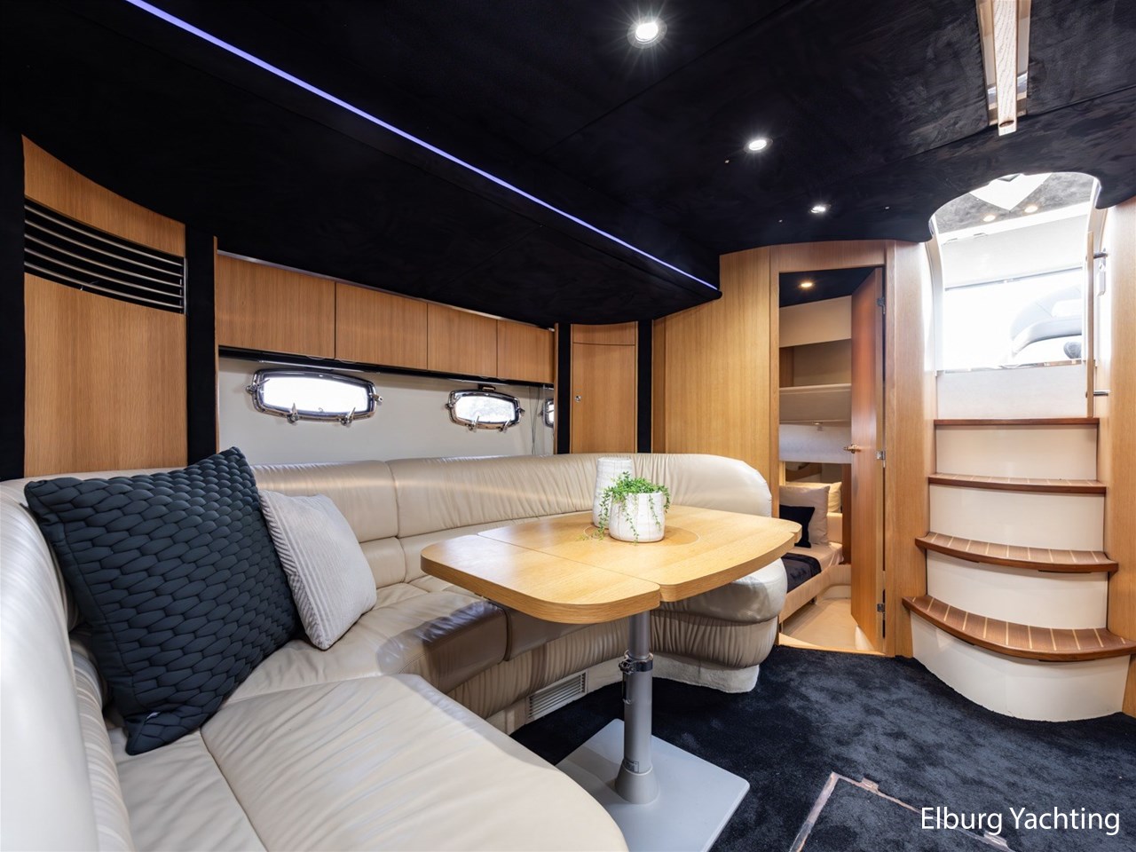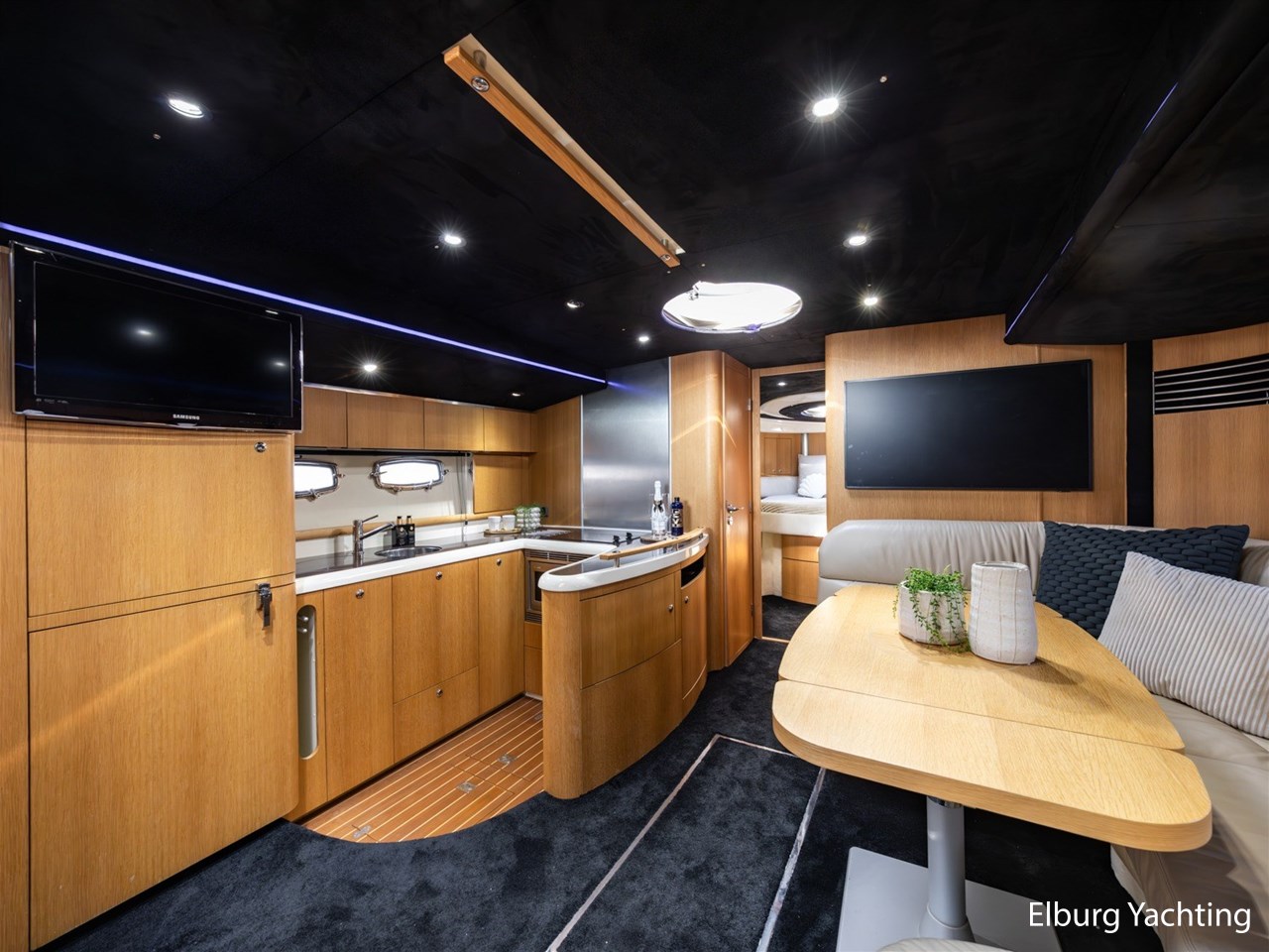 The Fairline Targa 52 GT features a recently modernized interior. The salon and cabins are finished with a luxurious Alcantara ceiling, combined with plush carpeting and new Luxaflex window coverings. Both the salon and the owner’s cabin are equipped with a television (available via WiFi, dongle not included). The mood lighting in the salon is fully adjustable in color and intensity via the MiBoxer smart LED lighting system.