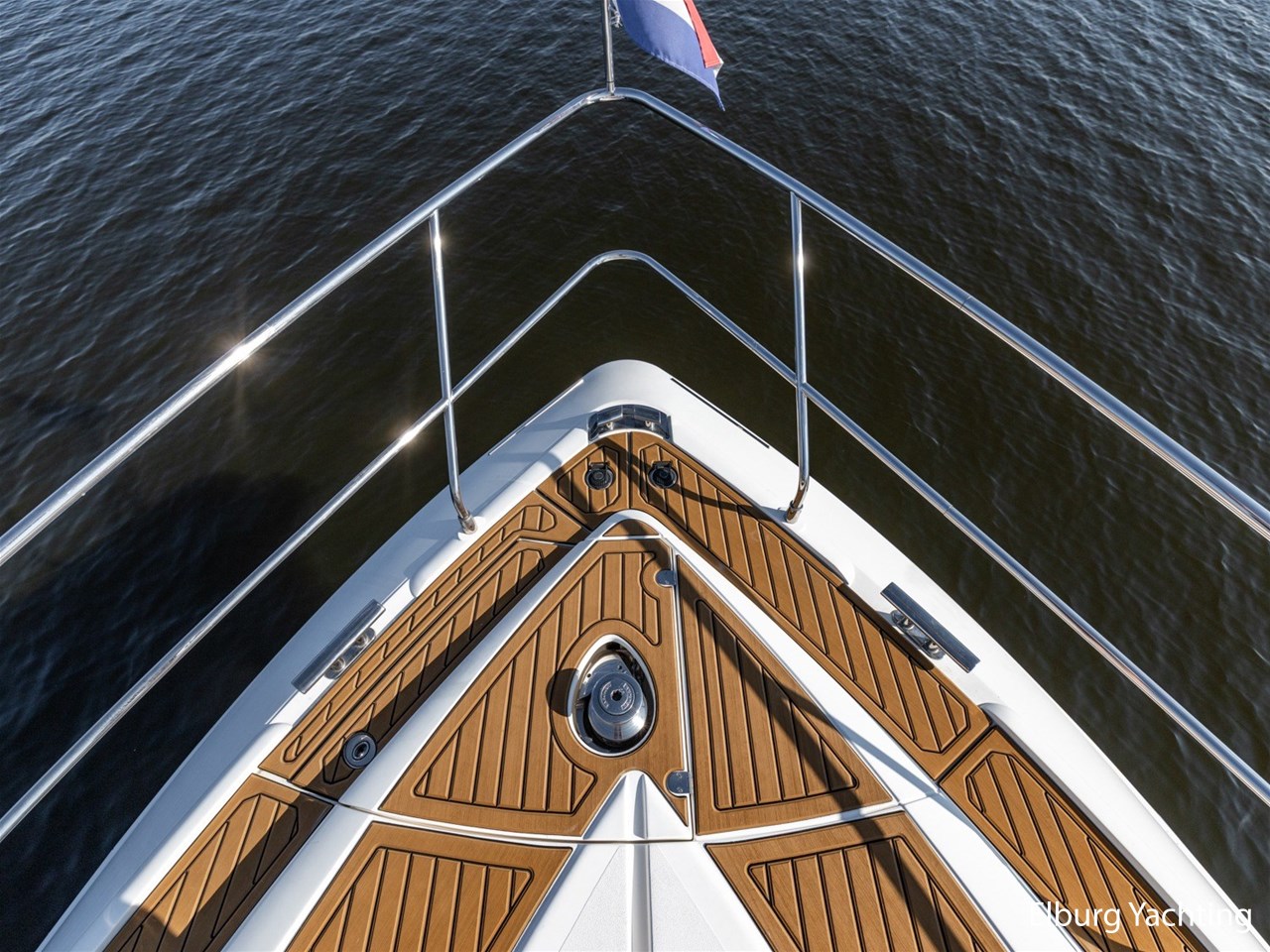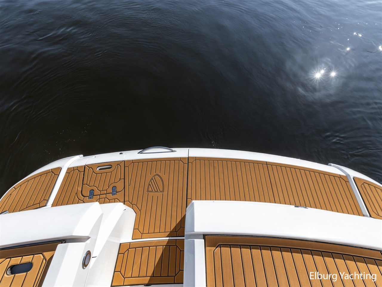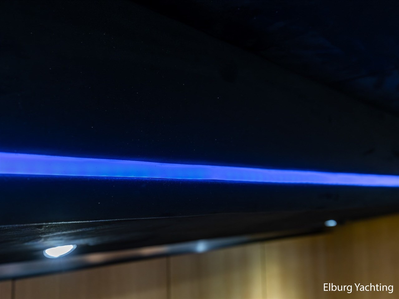 The cockpit features an Alcantara ceiling finish, including starlight lighting. The cockpit, bathing platform, and gangways are finished with SeaDek, providing extra comfort and a modern look. The exterior is equipped with color-adjustable ambient lighting all around, and there is a spacious sun deck at the bow.