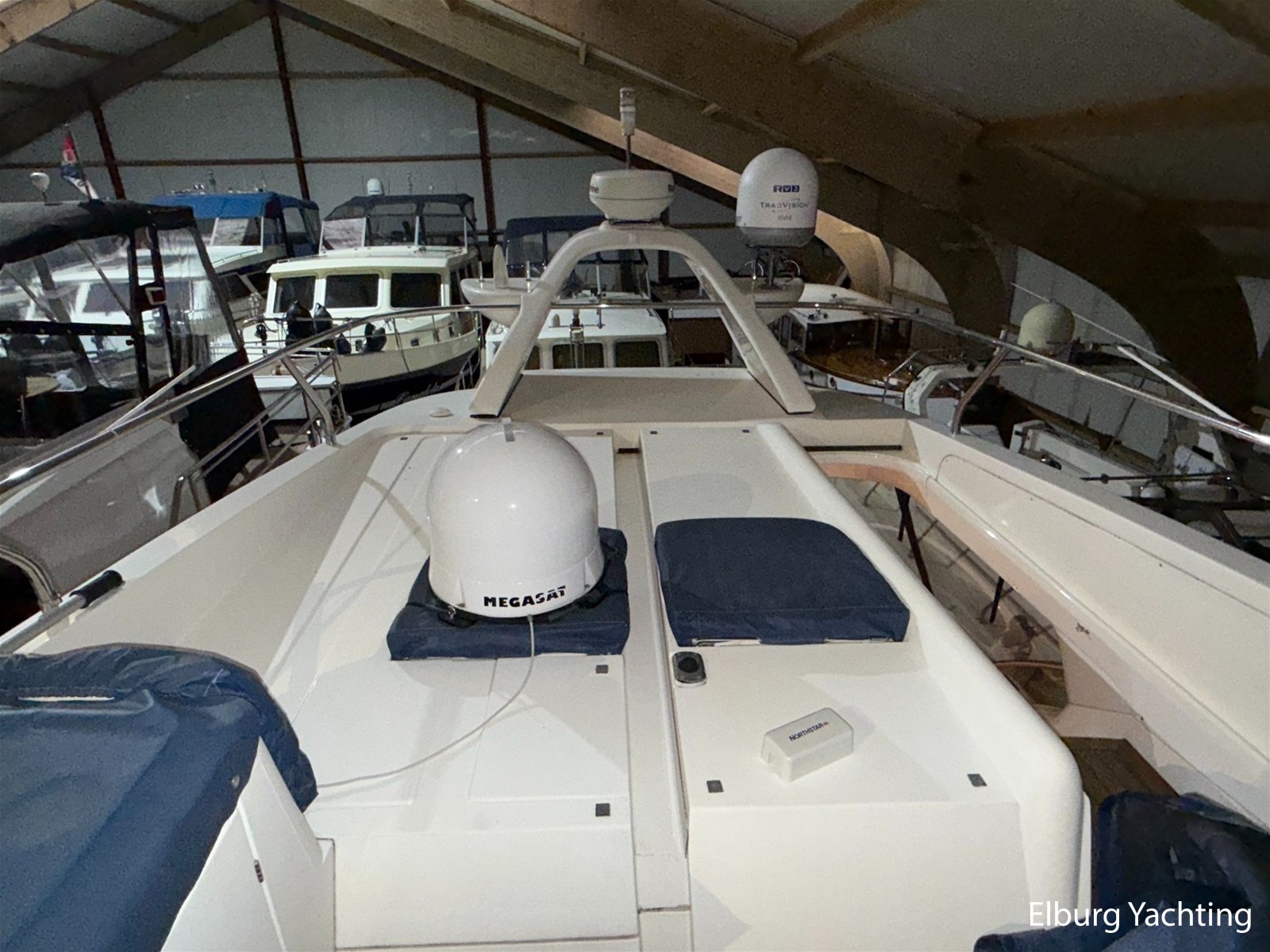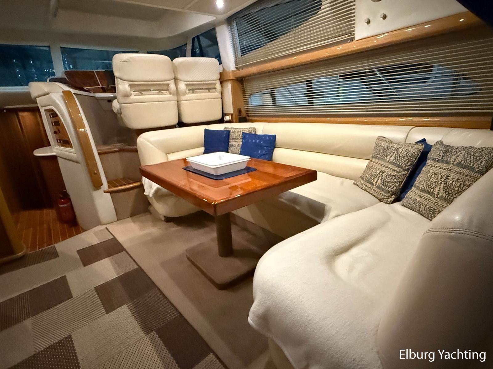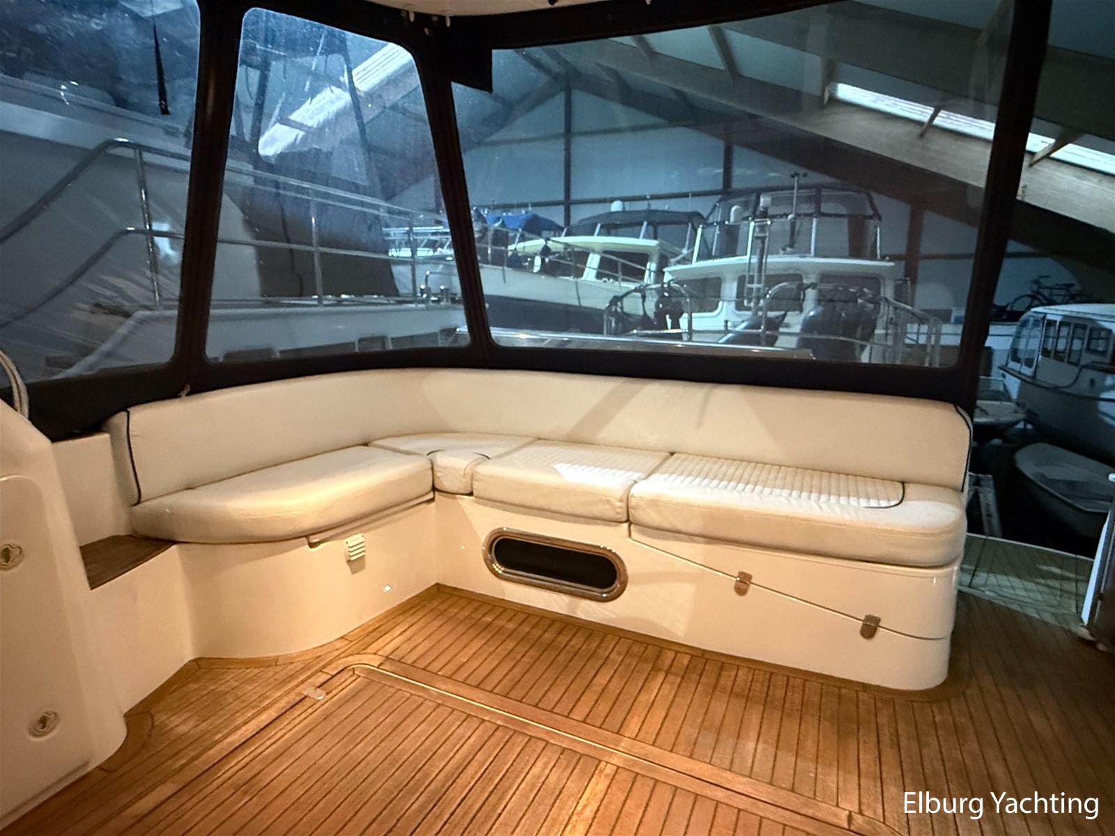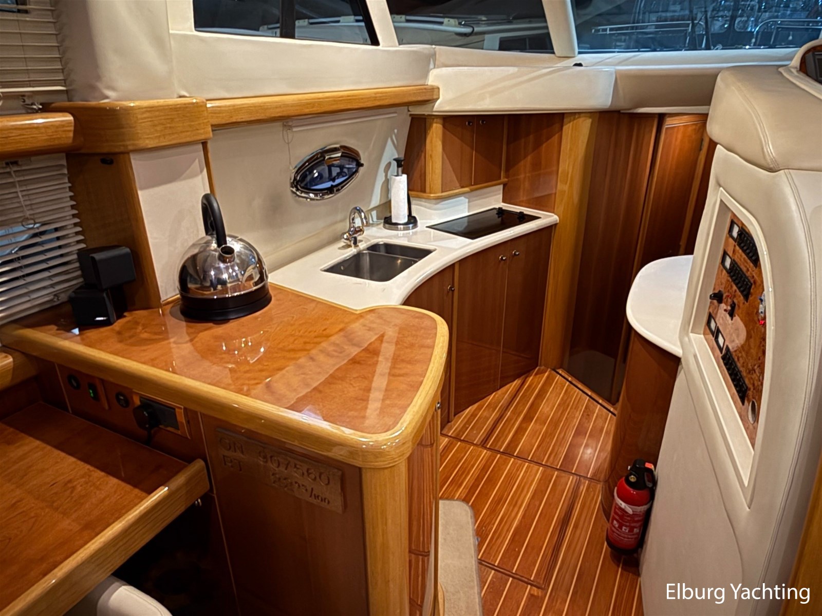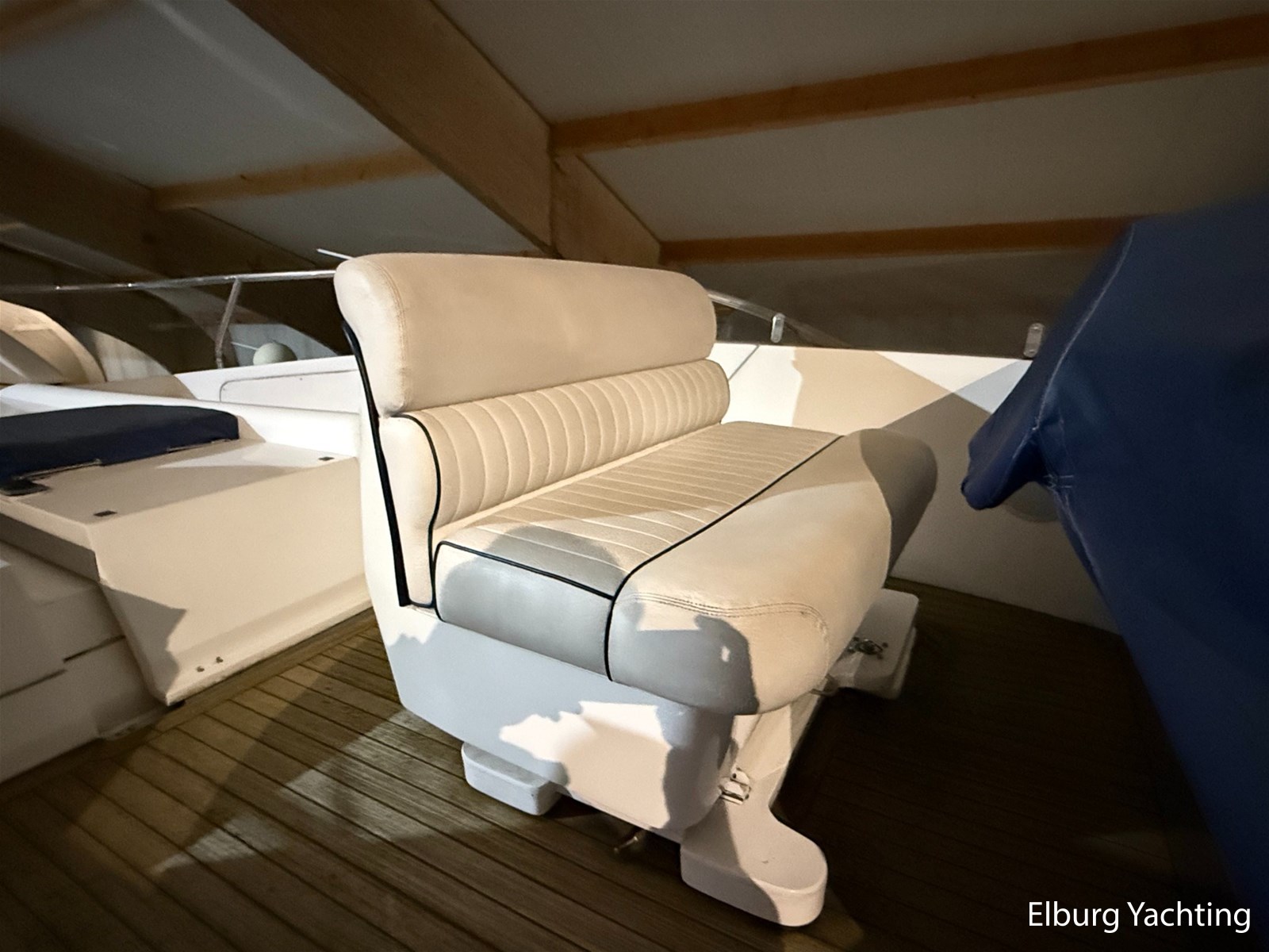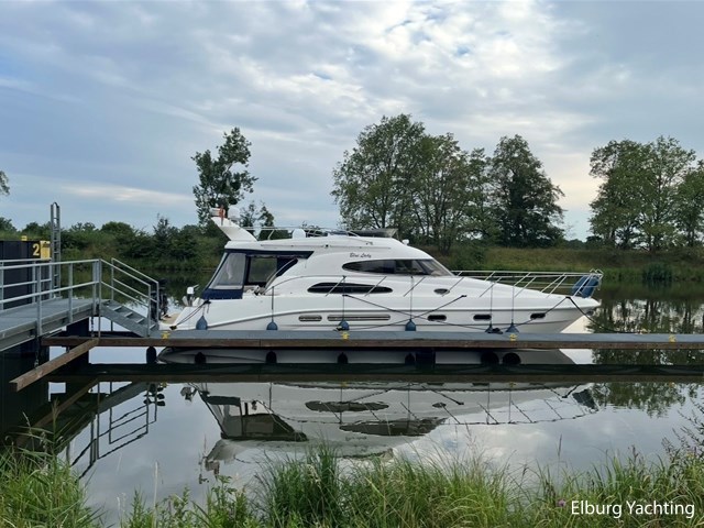 Attractive and, above all, very sporty Sealine T47 with two cabins and two powerful Volvo Penta TAMD 75 diesel engines, offered for sale by its German owner. The yacht is stored in winter every year and is well maintained. The interior upholstery has recently been replaced with new light-coloured artificial leather, giving the yacht a fresh look. The yacht has a spacious layout. It has a generous saloon with a large corner sofa with a cherry wood coffee table, a desk with two armchairs, and an indoor helm with two seats, one for the captain and one for the co-skipper. Further forward is the galley with a sink, refrigerator and electric cooking facilities. At the front of the yacht is the owner's cabin with a double freestanding French bed and en-suite bathroom (shower, toilet and washbasin). On the starboard side is the guest cabin with a double bed, and the second bathroom is also located on the starboard side of the yacht. This space is accessible from the corridor and from the guest cabin and is equipped with a shower, washbasin and toilet. The Sealine T47 has a spacious cockpit with a fixed bench and a large storage hatch under the bench that could also be used as a crew cabin. The engine room is accessible via the floor hatch in the cockpit. The flybridge is accessible from the cockpit and has a second helm, dinette and refrigerator. Sailing from the flybridge gives you a great overview and it is a wonderful place to relax on warmer days. The yacht can be viewed on location (in winter storage) by appointment. For questions and/or to make an appointment, you are welcome at Elburg Yachting 7 days a week.