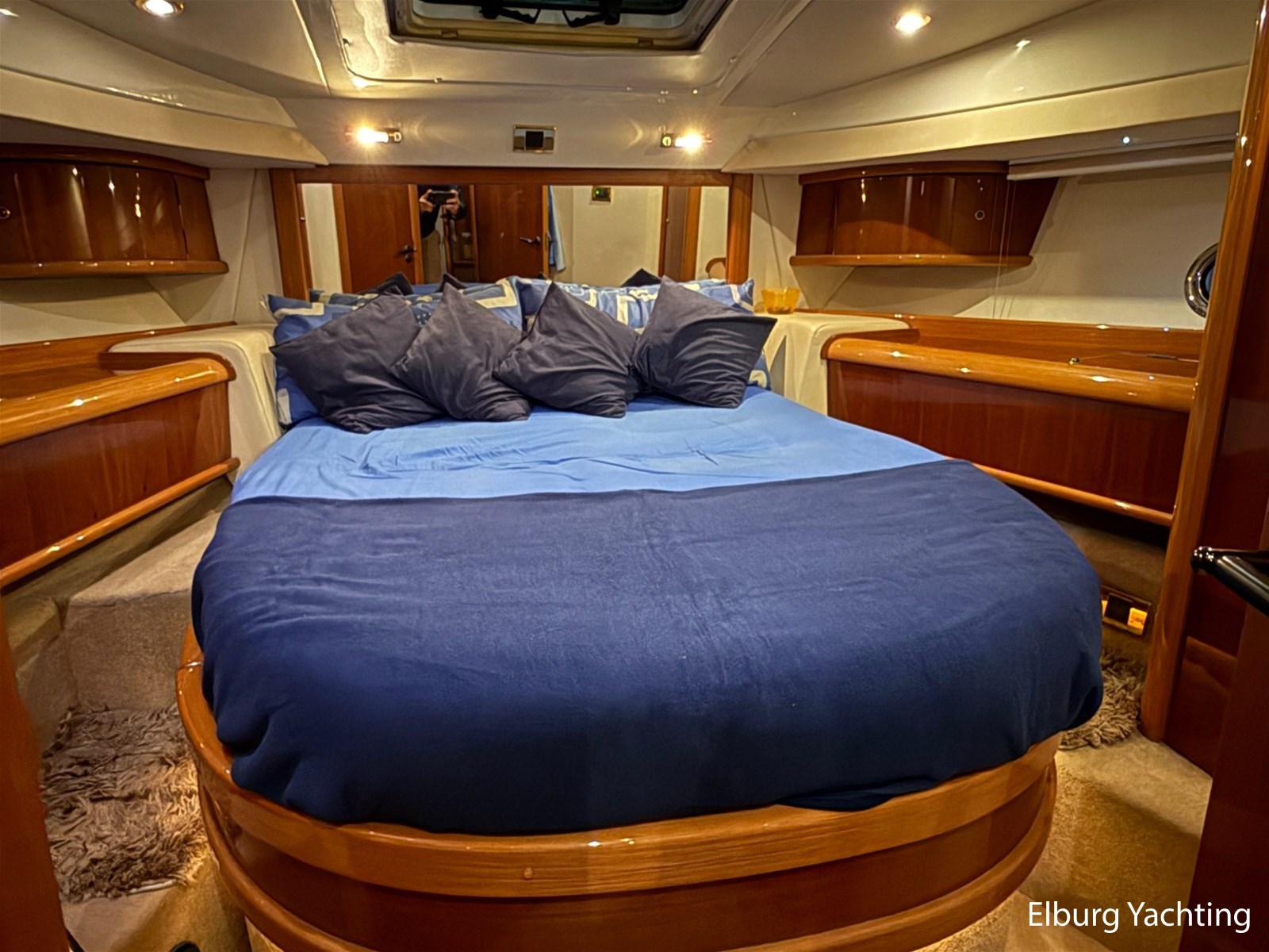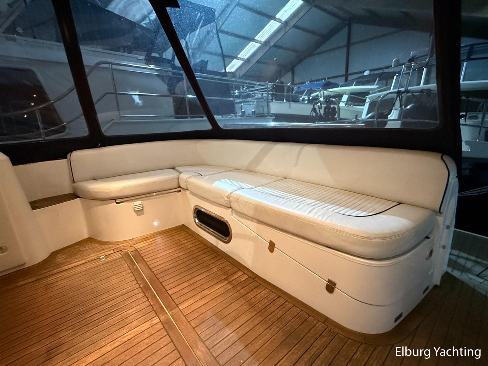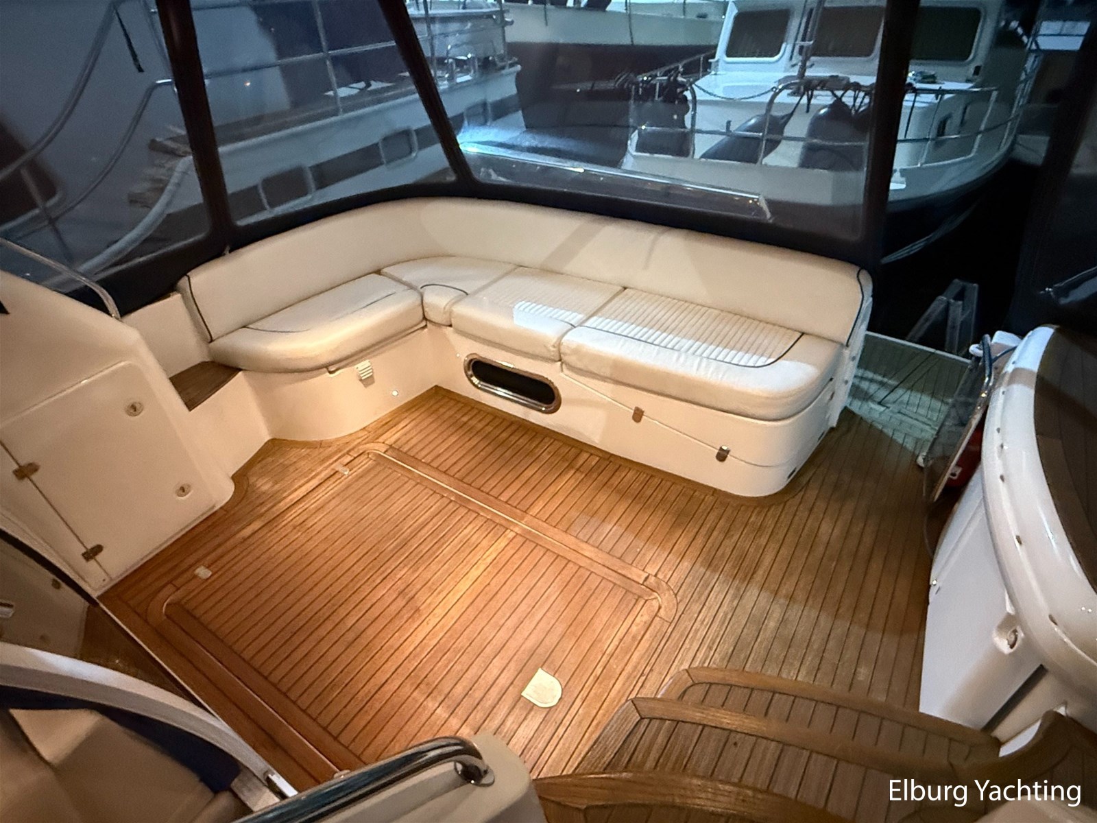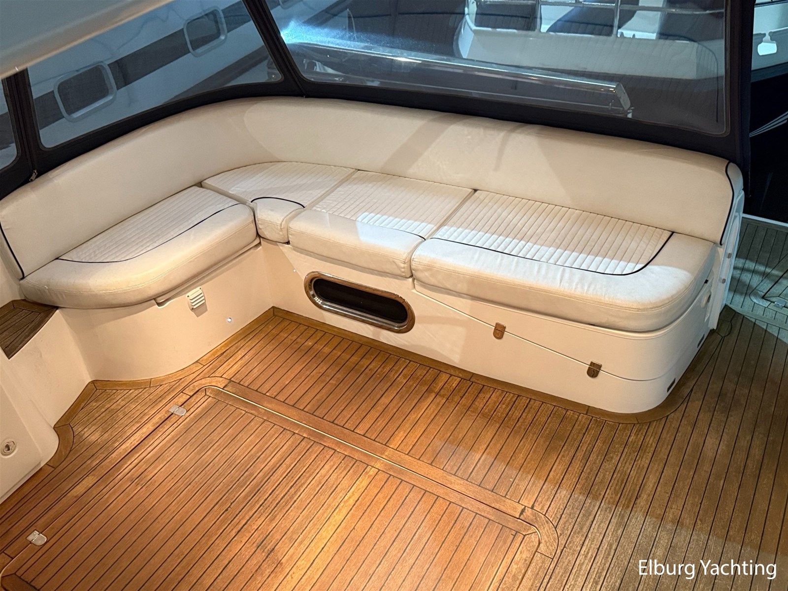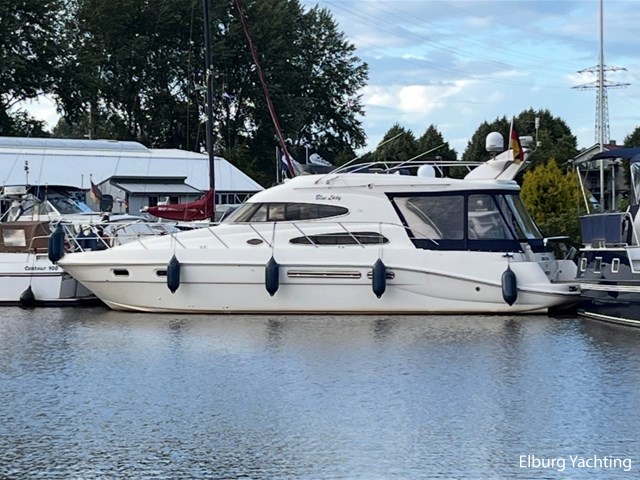 Attractive and, above all, very sporty Sealine T47 with two cabins and two powerful Volvo Penta TAMD 75 diesel engines, offered for sale by its German owner. The yacht is stored in winter every year and is well maintained. The interior upholstery has recently been replaced with new light-coloured artificial leather, giving the yacht a fresh look. The yacht has a spacious layout. It has a generous saloon with a large corner sofa with a cherry wood coffee table, a desk with two armchairs, and an indoor helm with two seats, one for the captain and one for the co-skipper. Further forward is the galley with a sink, refrigerator and electric cooking facilities. At the front of the yacht is the owner's cabin with a double freestanding French bed and en-suite bathroom (shower, toilet and washbasin). On the starboard side is the guest cabin with a double bed, and the second bathroom is also located on the starboard side of the yacht. This space is accessible from the corridor and from the guest cabin and is equipped with a shower, washbasin and toilet. The Sealine T47 has a spacious cockpit with a fixed bench and a large storage hatch under the bench that could also be used as a crew cabin. The engine room is accessible via the floor hatch in the cockpit. The flybridge is accessible from the cockpit and has a second helm, dinette and refrigerator. Sailing from the flybridge gives you a great overview and it is a wonderful place to relax on warmer days. The yacht can be viewed on location (in winter storage) by appointment. For questions and/or to make an appointment, you are welcome at Elburg Yachting 7 days a week.