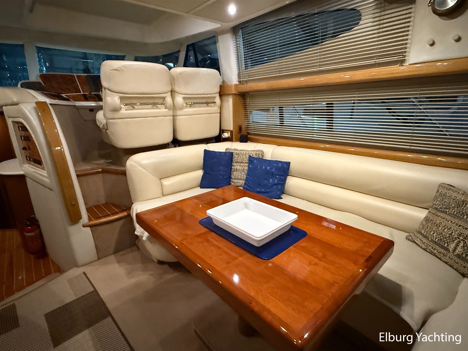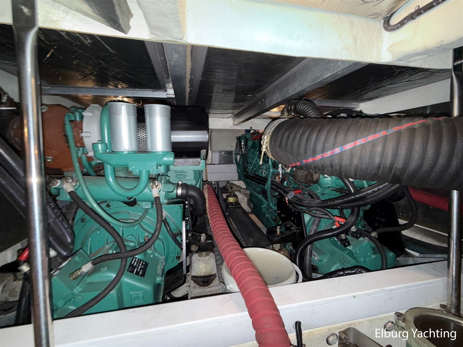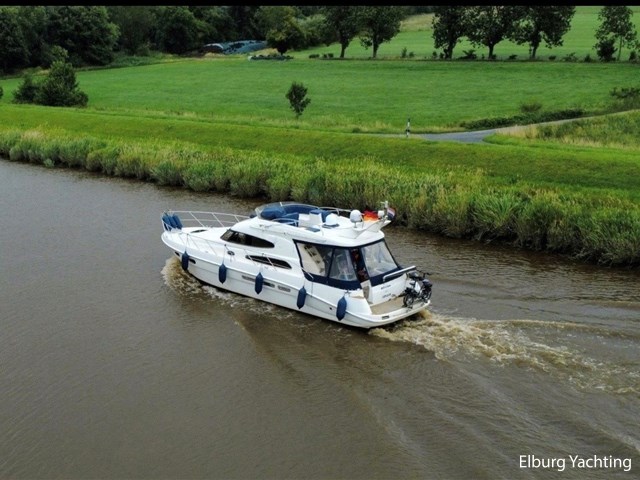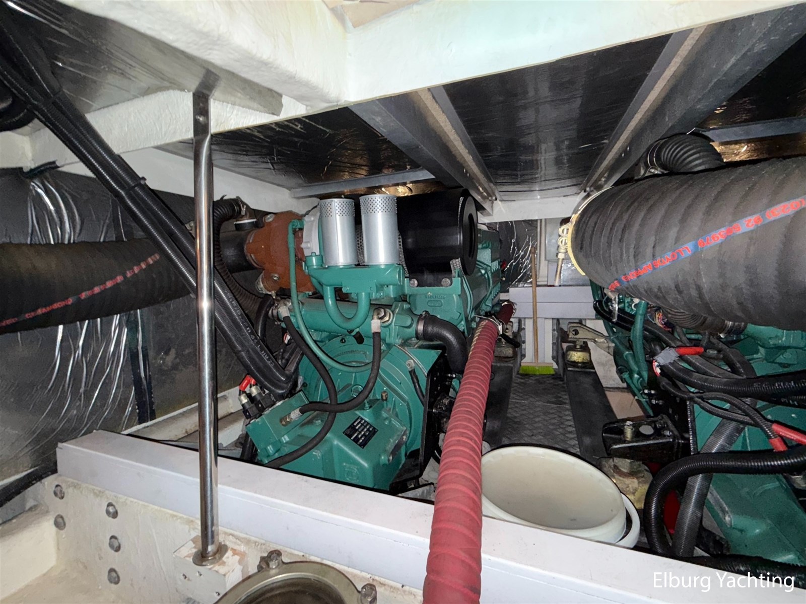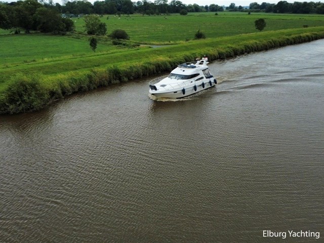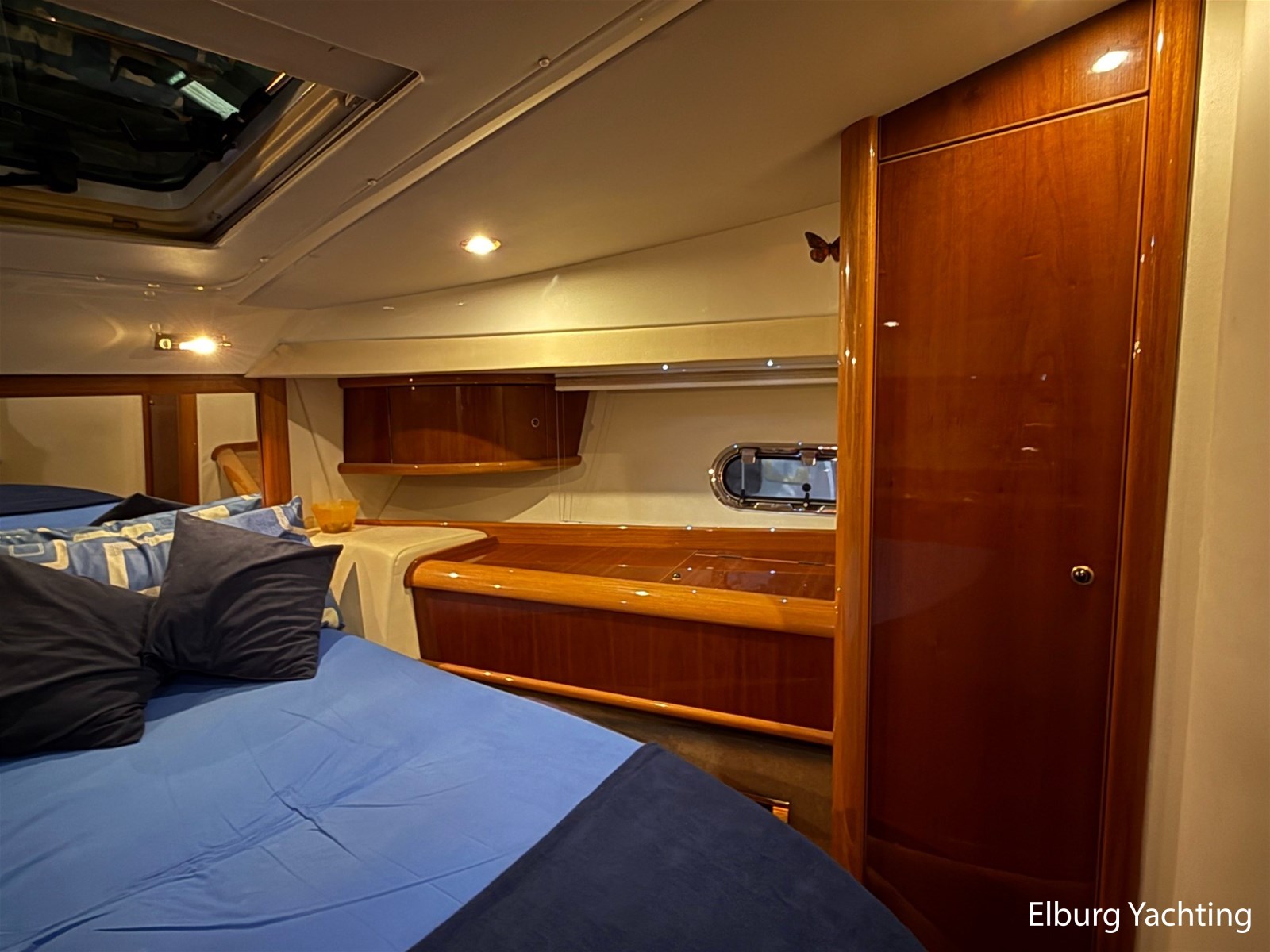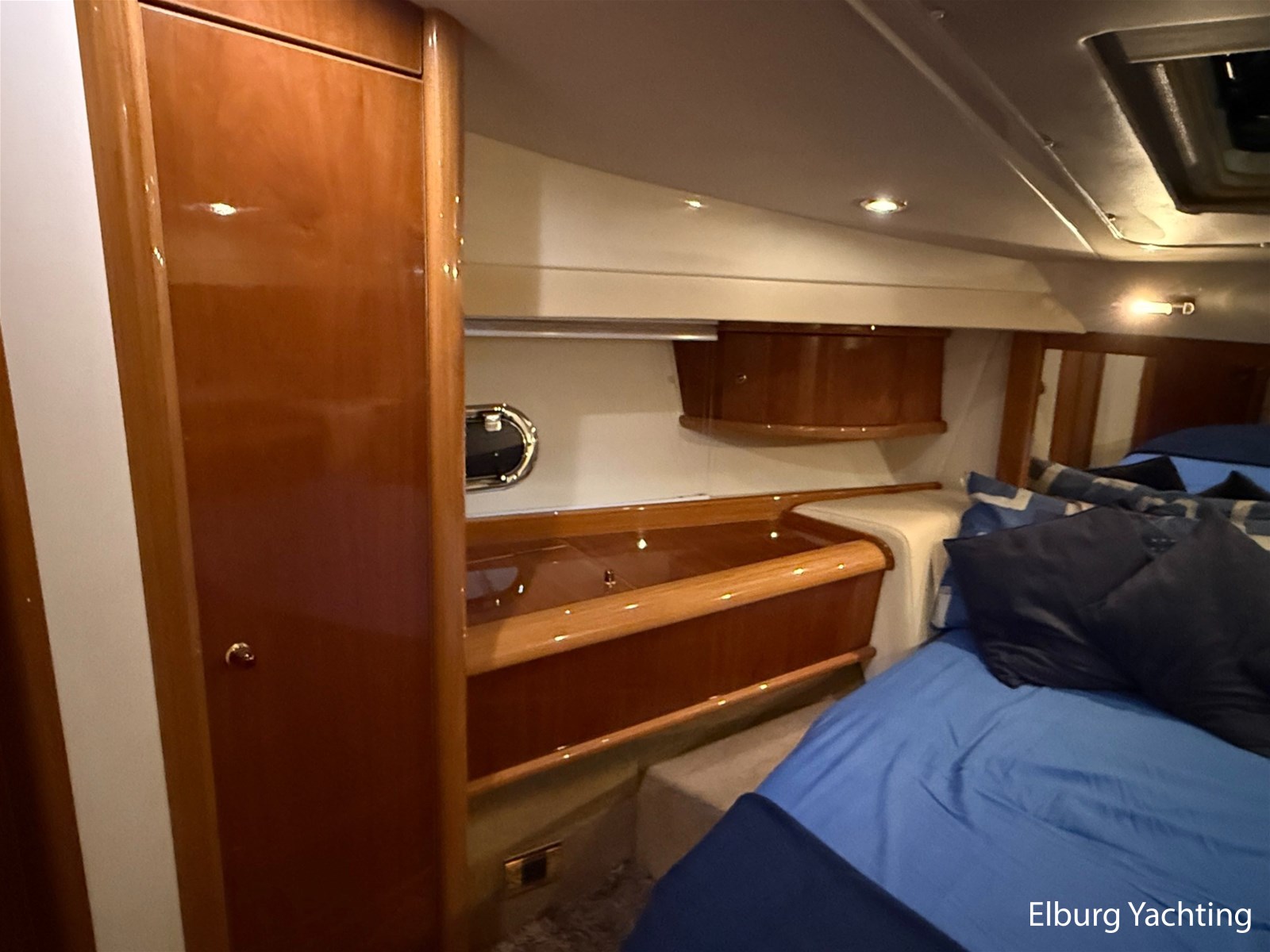 Attractive and, above all, very sporty Sealine T47 with two cabins and two powerful Volvo Penta TAMD 75 diesel engines, offered for sale by its German owner. The yacht is stored in winter every year and is well maintained. The interior upholstery has recently been replaced with new light-coloured artificial leather, giving the yacht a fresh look. The yacht has a spacious layout. It has a generous saloon with a large corner sofa with a cherry wood coffee table, a desk with two armchairs, and an indoor helm with two seats, one for the captain and one for the co-skipper. Further forward is the galley with a sink, refrigerator and electric cooking facilities. At the front of the yacht is the owner's cabin with a double freestanding French bed and en-suite bathroom (shower, toilet and washbasin). On the starboard side is the guest cabin with a double bed, and the second bathroom is also located on the starboard side of the yacht. This space is accessible from the corridor and from the guest cabin and is equipped with a shower, washbasin and toilet. The Sealine T47 has a spacious cockpit with a fixed bench and a large storage hatch under the bench that could also be used as a crew cabin. The engine room is accessible via the floor hatch in the cockpit. The flybridge is accessible from the cockpit and has a second helm, dinette and refrigerator. Sailing from the flybridge gives you a great overview and it is a wonderful place to relax on warmer days. The yacht can be viewed on location (in winter storage) by appointment. For questions and/or to make an appointment, you are welcome at Elburg Yachting 7 days a week.