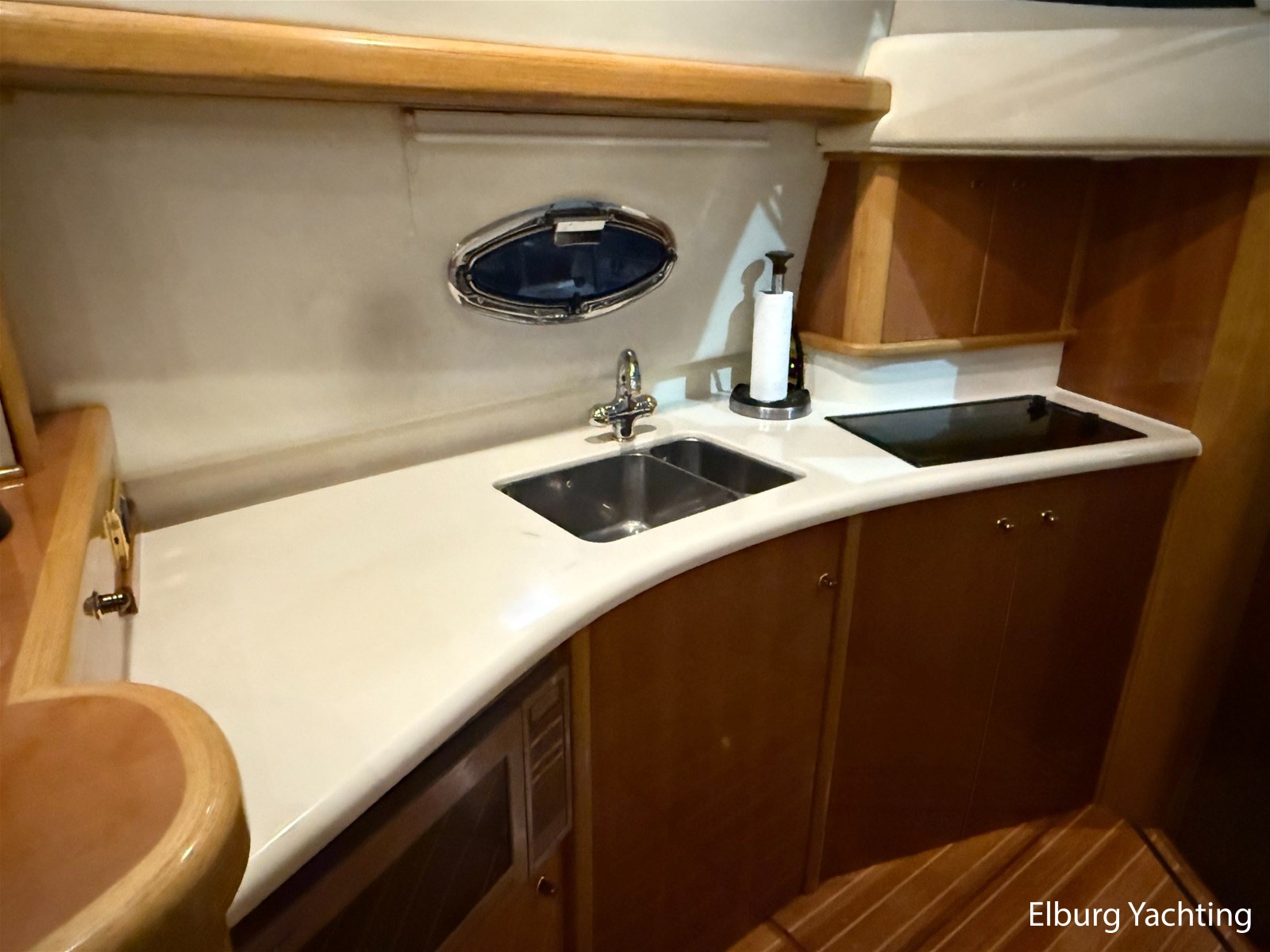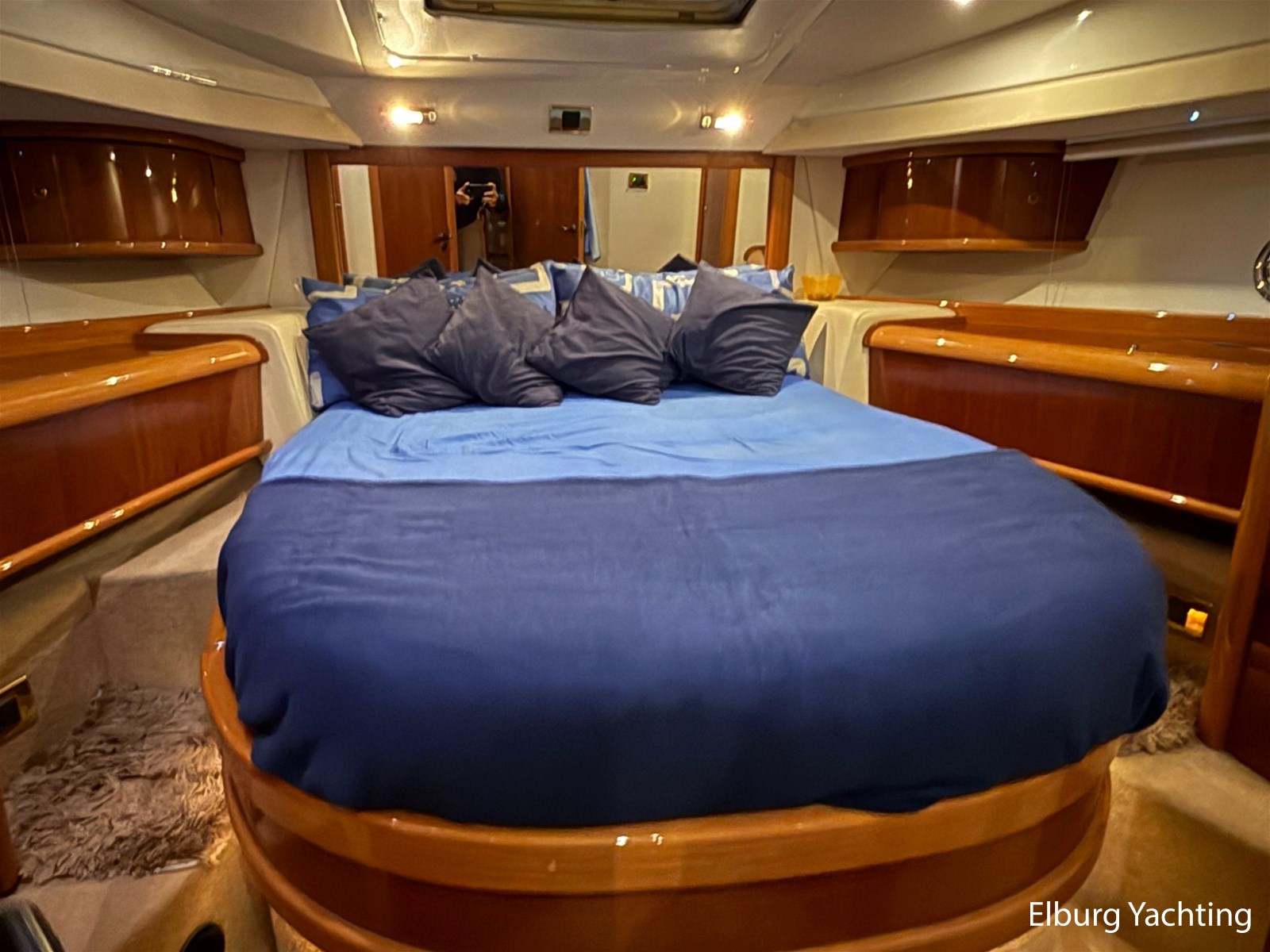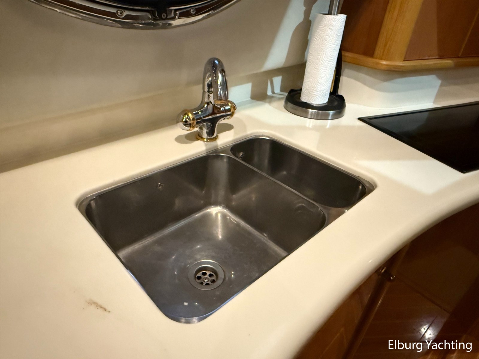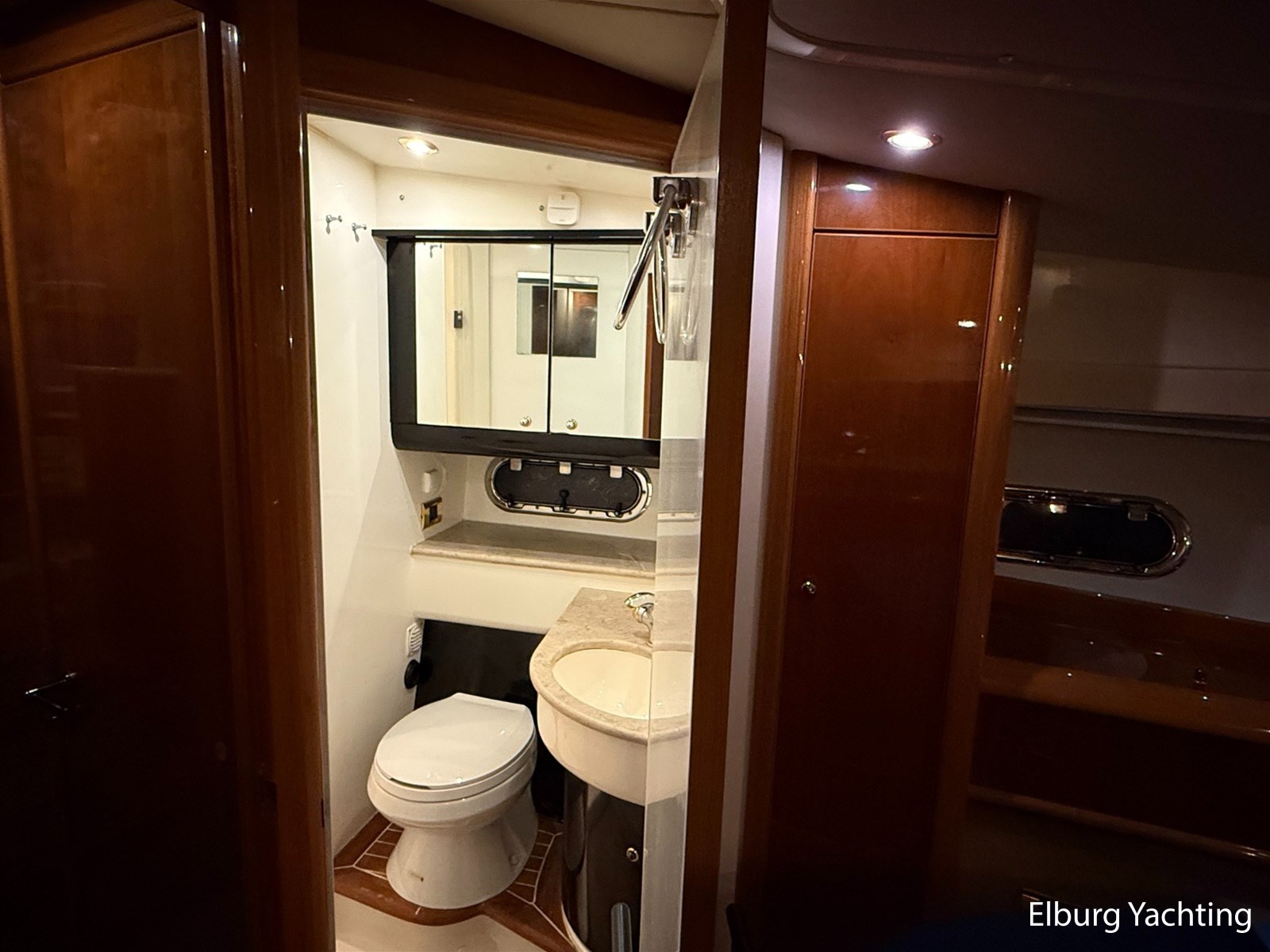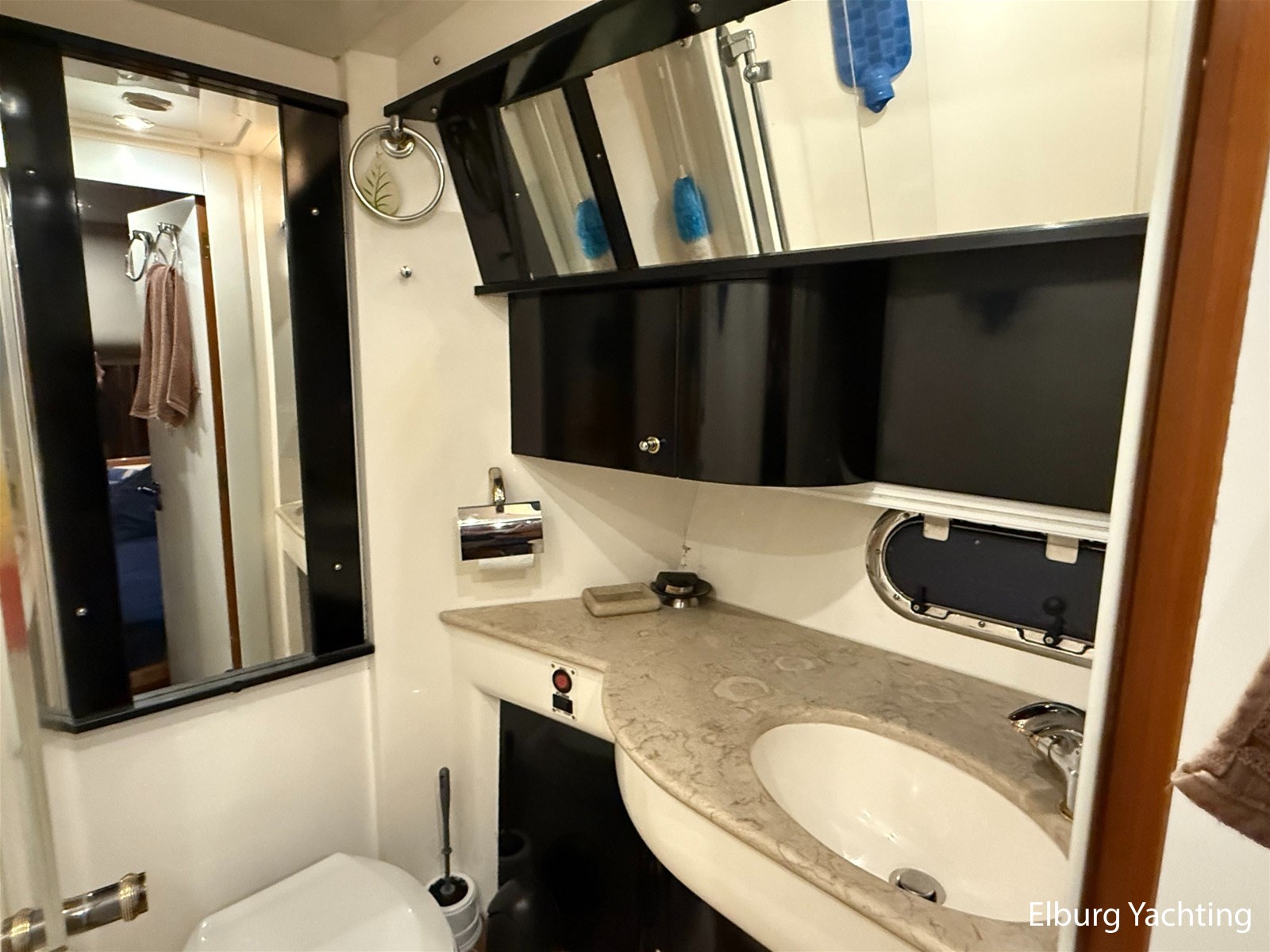 Attractive and, above all, very sporty Sealine T47 with two cabins and two powerful Volvo Penta TAMD 75 diesel engines, offered for sale by its German owner. The yacht is stored in winter every year and is well maintained. The interior upholstery has recently been replaced with new light-coloured artificial leather, giving the yacht a fresh look. The yacht has a spacious layout. It has a generous saloon with a large corner sofa with a cherry wood coffee table, a desk with two armchairs, and an indoor helm with two seats, one for the captain and one for the co-skipper. Further forward is the galley with a sink, refrigerator and electric cooking facilities. At the front of the yacht is the owner's cabin with a double freestanding French bed and en-suite bathroom (shower, toilet and washbasin). On the starboard side is the guest cabin with a double bed, and the second bathroom is also located on the starboard side of the yacht. This space is accessible from the corridor and from the guest cabin and is equipped with a shower, washbasin and toilet. The Sealine T47 has a spacious cockpit with a fixed bench and a large storage hatch under the bench that could also be used as a crew cabin. The engine room is accessible via the floor hatch in the cockpit. The flybridge is accessible from the cockpit and has a second helm, dinette and refrigerator. Sailing from the flybridge gives you a great overview and it is a wonderful place to relax on warmer days. The yacht can be viewed on location (in winter storage) by appointment. For questions and/or to make an appointment, you are welcome at Elburg Yachting 7 days a week.