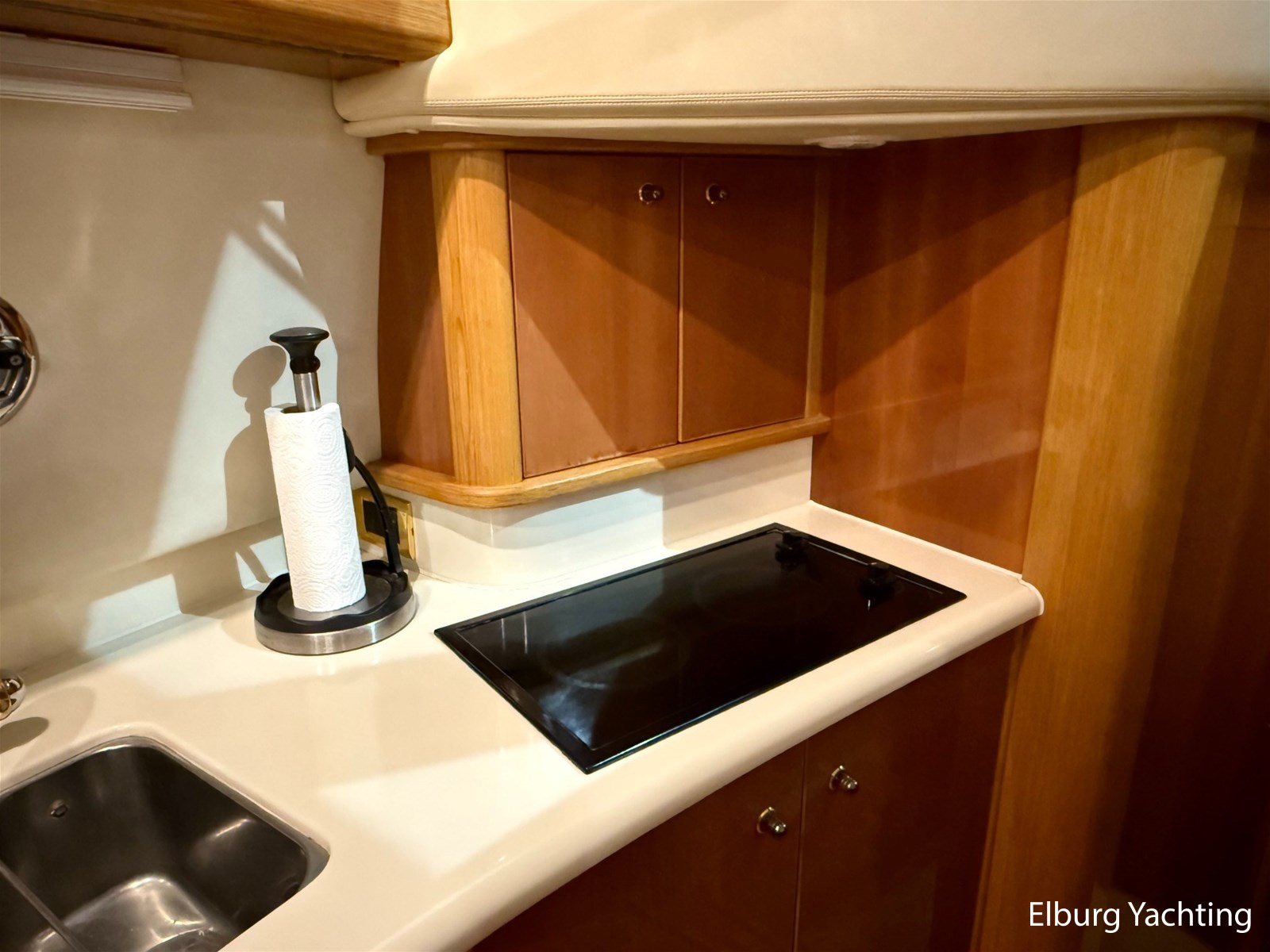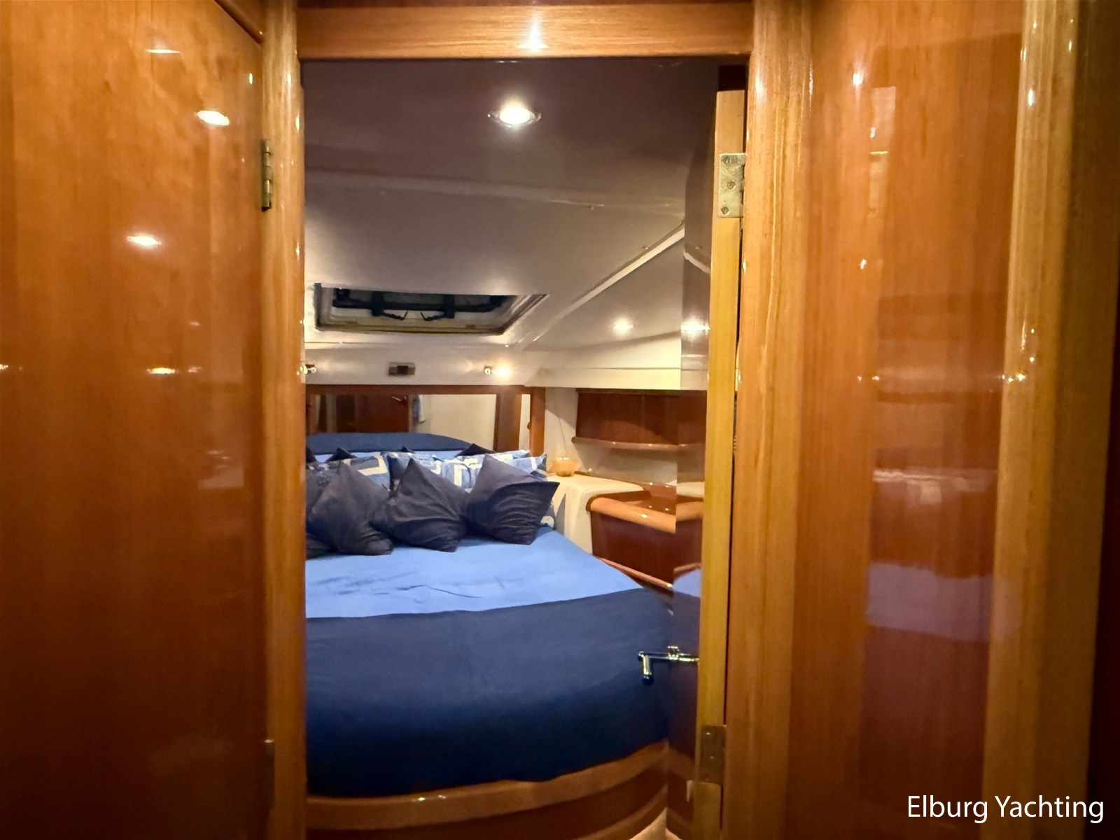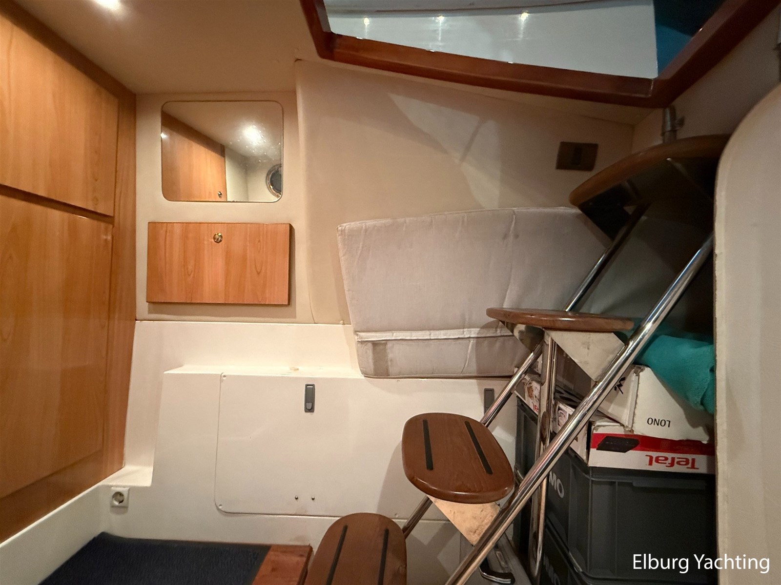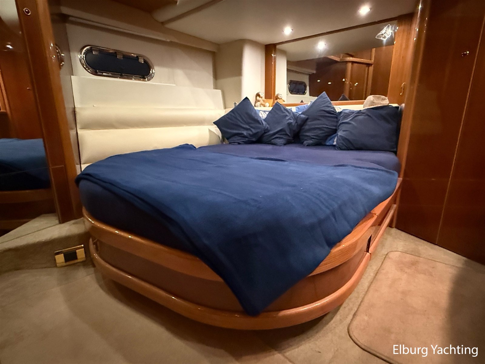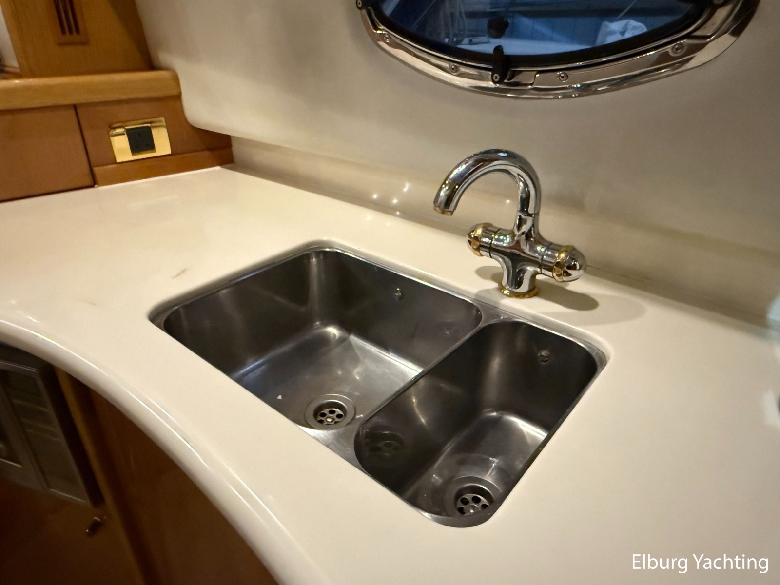 Attractive and, above all, very sporty Sealine T47 with two cabins and two powerful Volvo Penta TAMD 75 diesel engines, offered for sale by its German owner. The yacht is stored in winter every year and is well maintained. The interior upholstery has recently been replaced with new light-coloured artificial leather, giving the yacht a fresh look. The yacht has a spacious layout. It has a generous saloon with a large corner sofa with a cherry wood coffee table, a desk with two armchairs, and an indoor helm with two seats, one for the captain and one for the co-skipper. Further forward is the galley with a sink, refrigerator and electric cooking facilities. At the front of the yacht is the owner's cabin with a double freestanding French bed and en-suite bathroom (shower, toilet and washbasin). On the starboard side is the guest cabin with a double bed, and the second bathroom is also located on the starboard side of the yacht. This space is accessible from the corridor and from the guest cabin and is equipped with a shower, washbasin and toilet. The Sealine T47 has a spacious cockpit with a fixed bench and a large storage hatch under the bench that could also be used as a crew cabin. The engine room is accessible via the floor hatch in the cockpit. The flybridge is accessible from the cockpit and has a second helm, dinette and refrigerator. Sailing from the flybridge gives you a great overview and it is a wonderful place to relax on warmer days. The yacht can be viewed on location (in winter storage) by appointment. For questions and/or to make an appointment, you are welcome at Elburg Yachting 7 days a week.