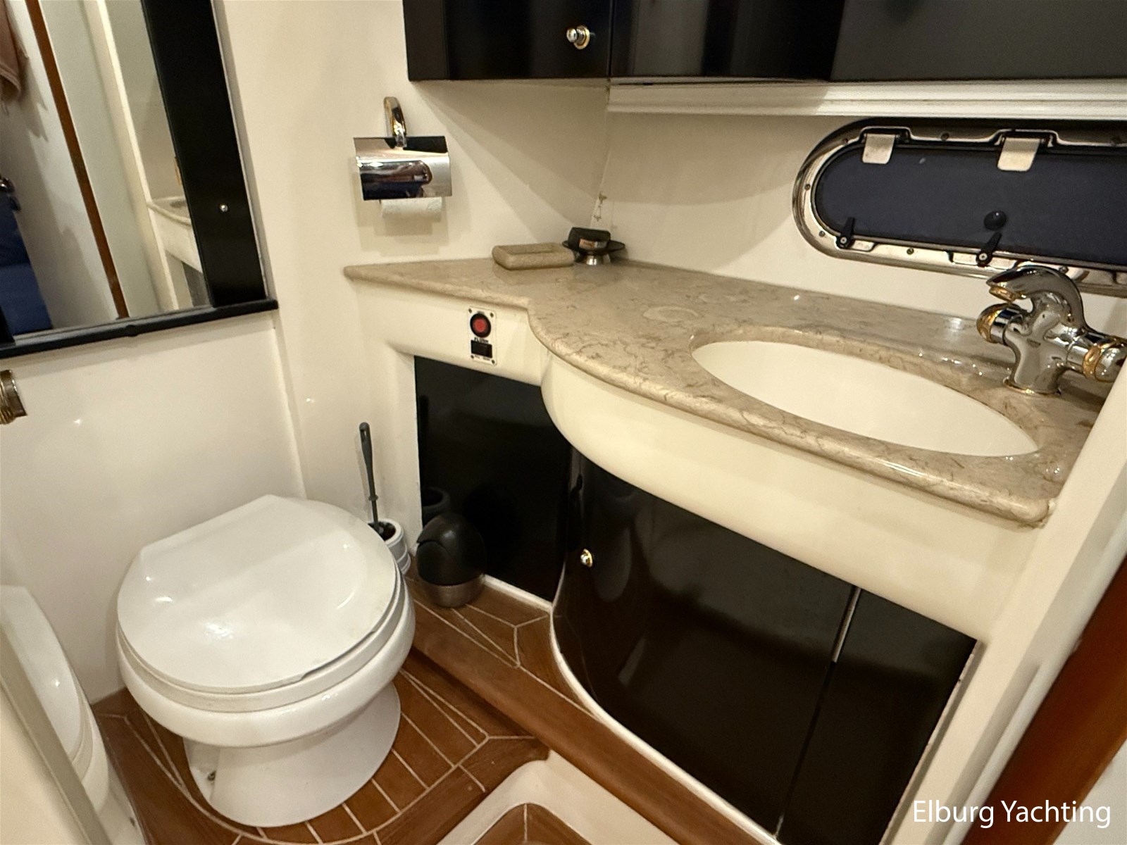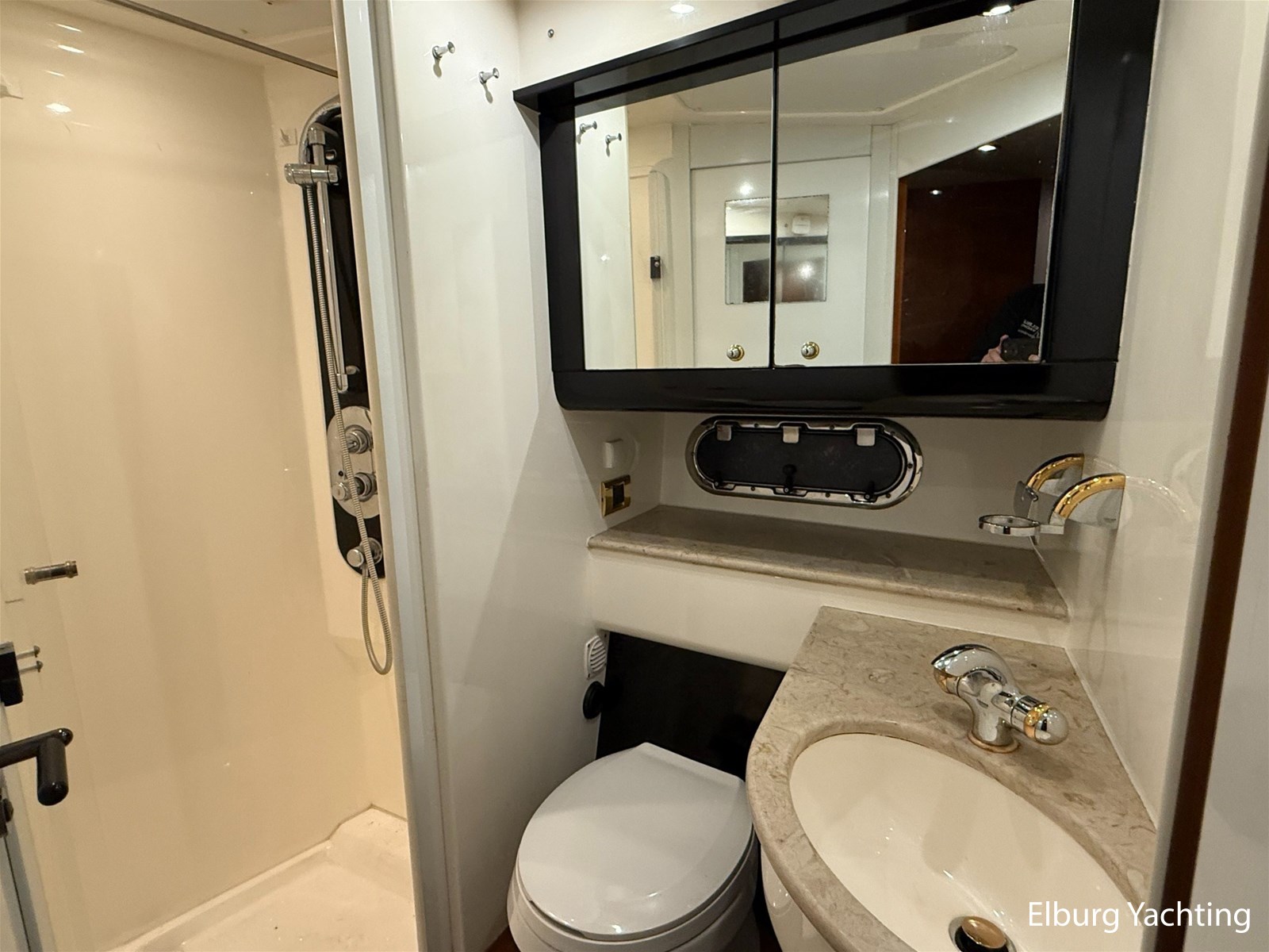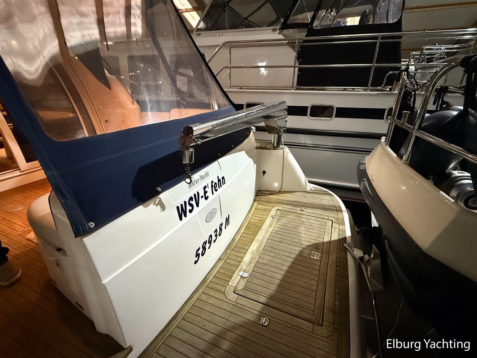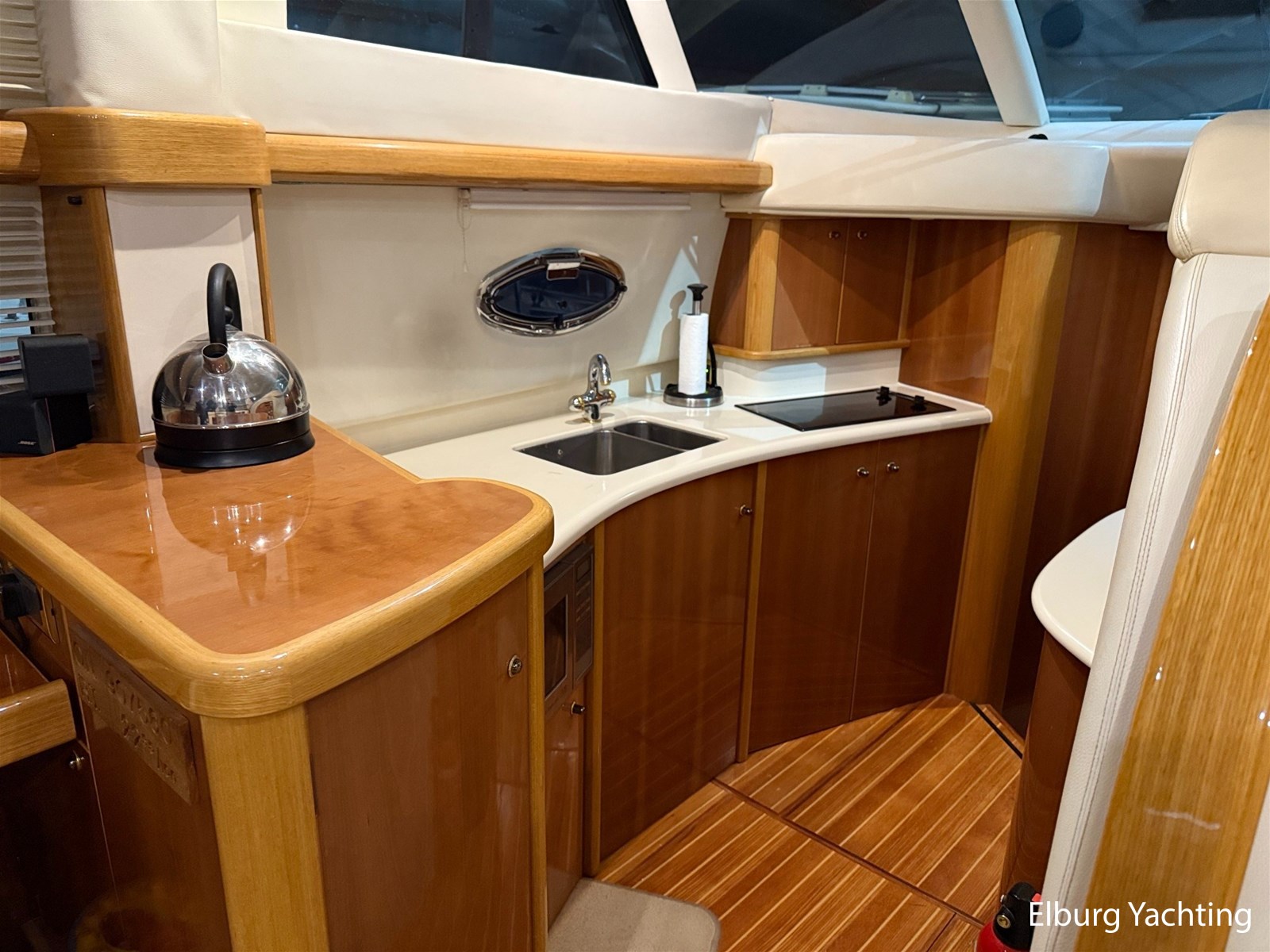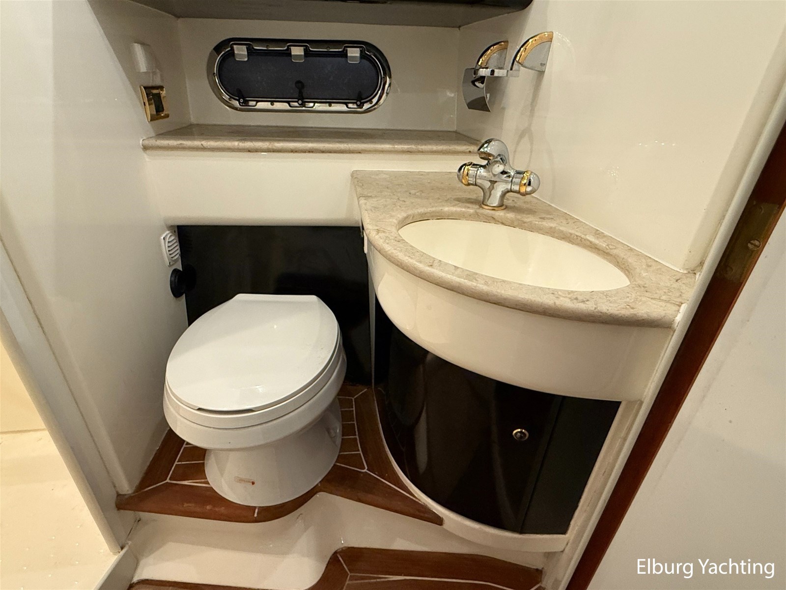 Attractive and, above all, very sporty Sealine T47 with two cabins and two powerful Volvo Penta TAMD 75 diesel engines, offered for sale by its German owner. The yacht is stored in winter every year and is well maintained. The interior upholstery has recently been replaced with new light-coloured artificial leather, giving the yacht a fresh look. The yacht has a spacious layout. It has a generous saloon with a large corner sofa with a cherry wood coffee table, a desk with two armchairs, and an indoor helm with two seats, one for the captain and one for the co-skipper. Further forward is the galley with a sink, refrigerator and electric cooking facilities. At the front of the yacht is the owner's cabin with a double freestanding French bed and en-suite bathroom (shower, toilet and washbasin). On the starboard side is the guest cabin with a double bed, and the second bathroom is also located on the starboard side of the yacht. This space is accessible from the corridor and from the guest cabin and is equipped with a shower, washbasin and toilet. The Sealine T47 has a spacious cockpit with a fixed bench and a large storage hatch under the bench that could also be used as a crew cabin. The engine room is accessible via the floor hatch in the cockpit. The flybridge is accessible from the cockpit and has a second helm, dinette and refrigerator. Sailing from the flybridge gives you a great overview and it is a wonderful place to relax on warmer days. The yacht can be viewed on location (in winter storage) by appointment. For questions and/or to make an appointment, you are welcome at Elburg Yachting 7 days a week.