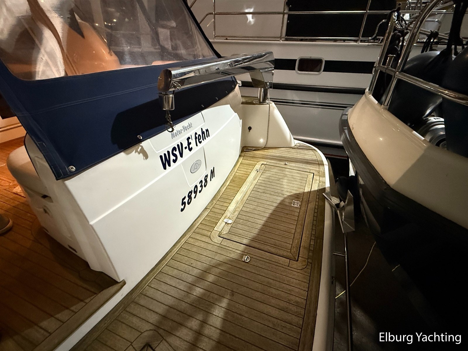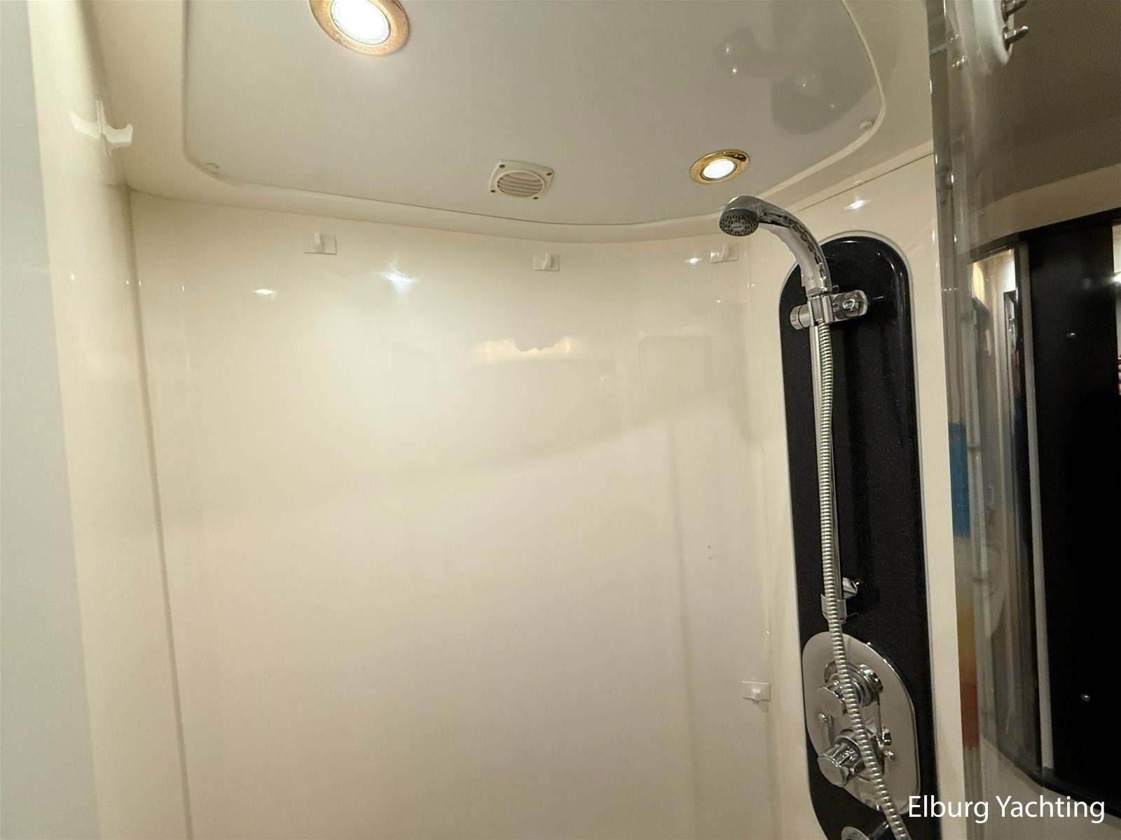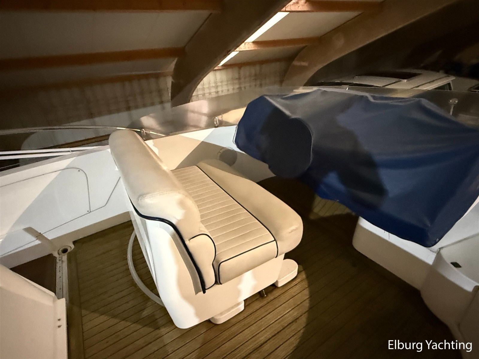 - Non-slip deck all around with teak in the cockpit + flybridge + swimming platform