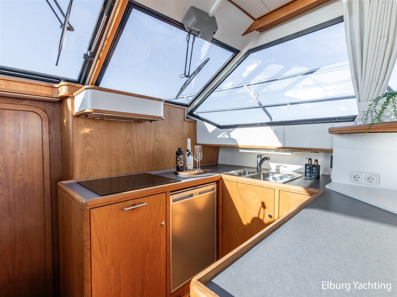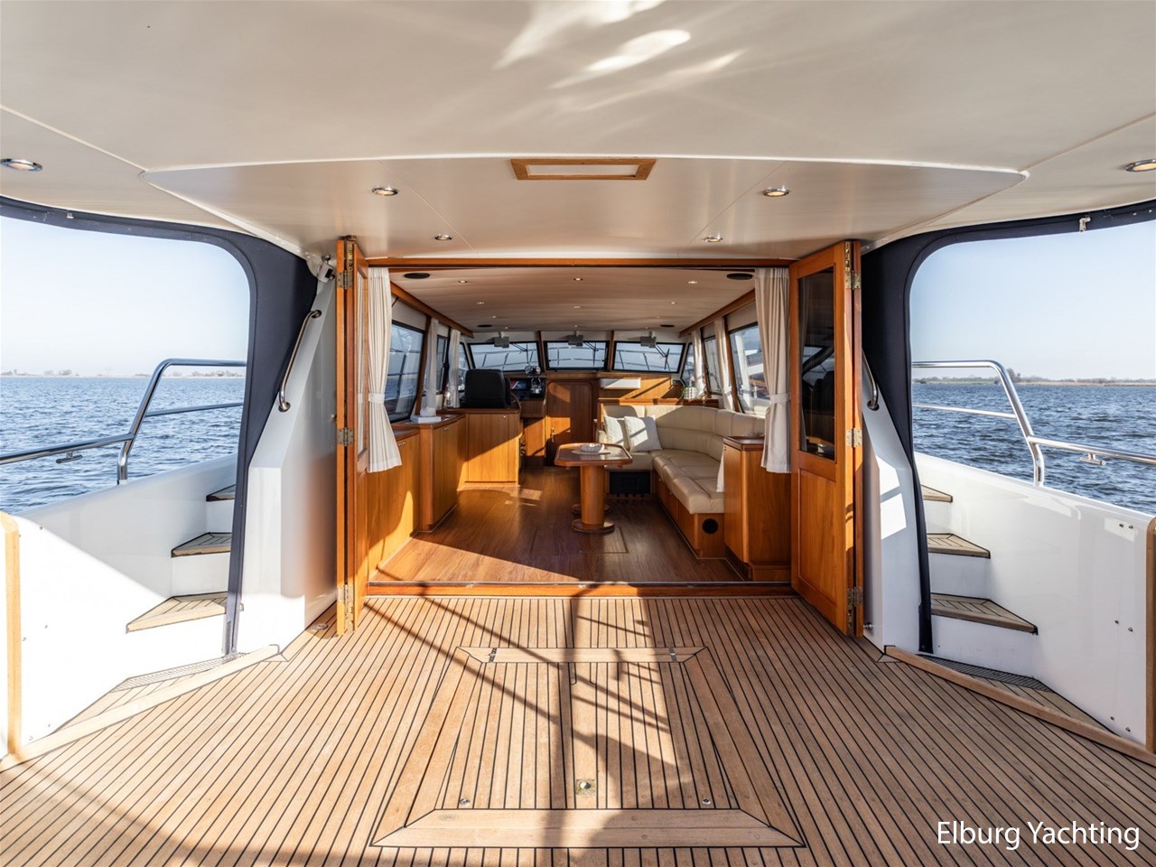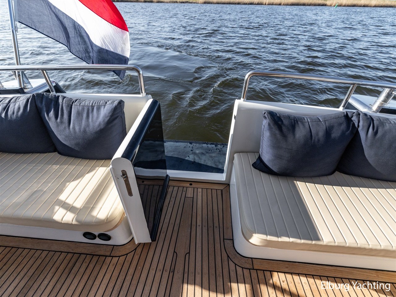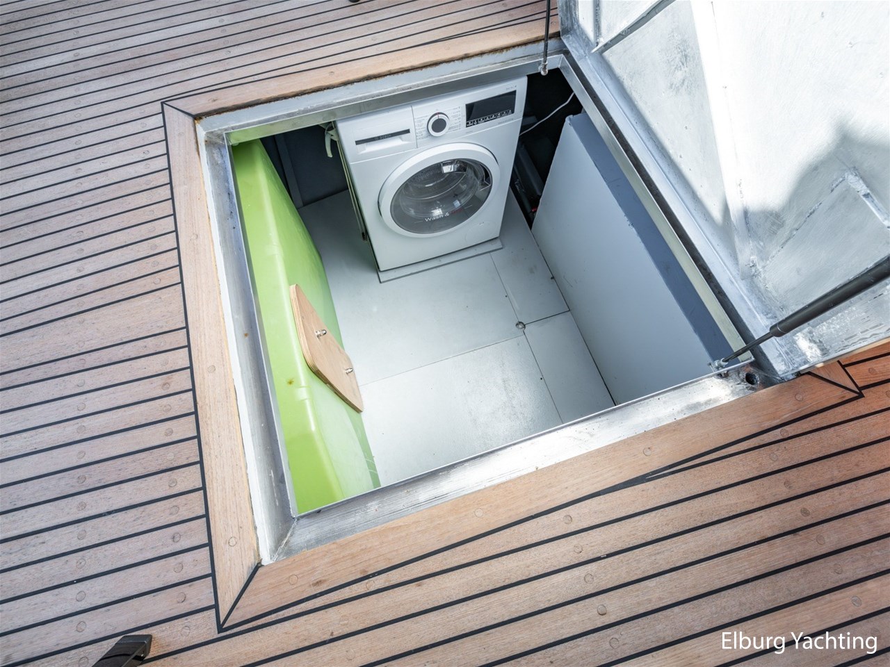 The yacht is also equipped with: Vetus air conditioning in the saloon, extra sturdy stainless steel railing, 4 x wooden (hinged) doors to the open cockpit, door in the bulwark to the swimming platform, integrated storage lockers with teak lids, large heated (by radiator) storage space under the cockpit, deck wash pump, leather upholstery, double stainless steel rubbing strake, escape/ventilation hatch, luxury sailing chair (leather upholstered), Mastervolt Mass inverter/charger Control, stainless steel bollards and cleats mounted on stainless steel plates, Bosch washer/dryer combination (2023), self-draining cockpit, cockpit tent, Wyckomar Water Purification System, folding radar bracket, wooden floor in saloon, tear plates in engine room, double weed filters, double fuel filters, the yacht has a very spacious sheltered cockpit + very spacious saloon. The 4 folding doors create a very cozy space as a whole.
