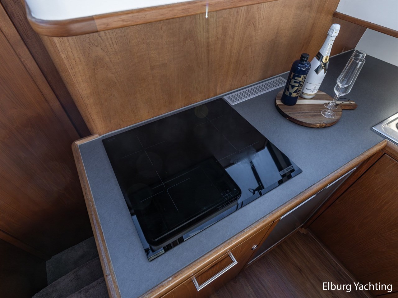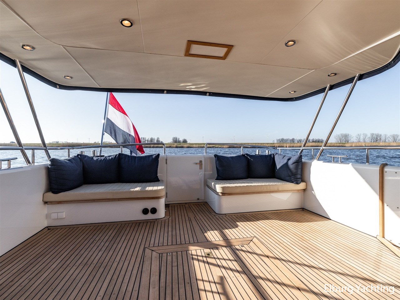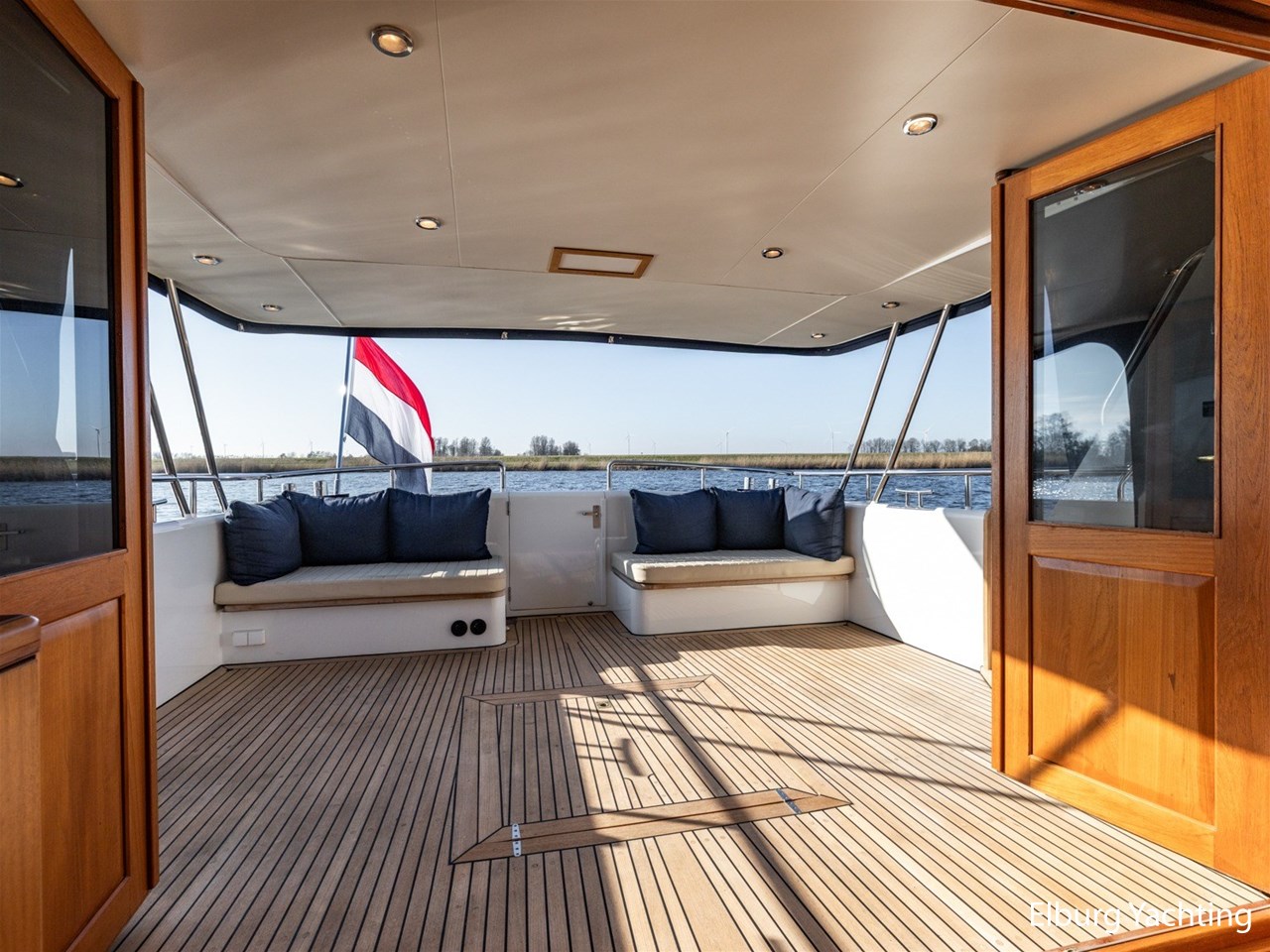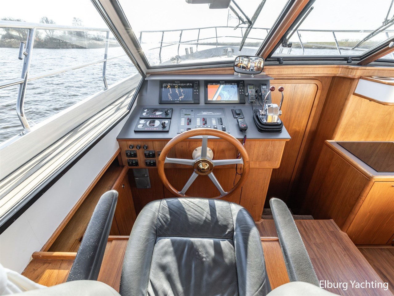 The yacht is also equipped with: Vetus air conditioning in the saloon, extra sturdy stainless steel railing, 4 x wooden (hinged) doors to the open cockpit, door in the bulwark to the swimming platform, integrated storage lockers with teak lids, large heated (by radiator) storage space under the cockpit, deck wash pump, leather upholstery, double stainless steel rubbing strake, escape/ventilation hatch, luxury sailing chair (leather upholstered), Mastervolt Mass inverter/charger Control, stainless steel bollards and cleats mounted on stainless steel plates, Bosch washer/dryer combination (2023), self-draining cockpit, cockpit tent, Wyckomar Water Purification System, folding radar bracket, wooden floor in saloon, tear plates in engine room, double weed filters, double fuel filters, the yacht has a very spacious sheltered cockpit + very spacious saloon. The 4 folding doors create a very cozy space as a whole.
