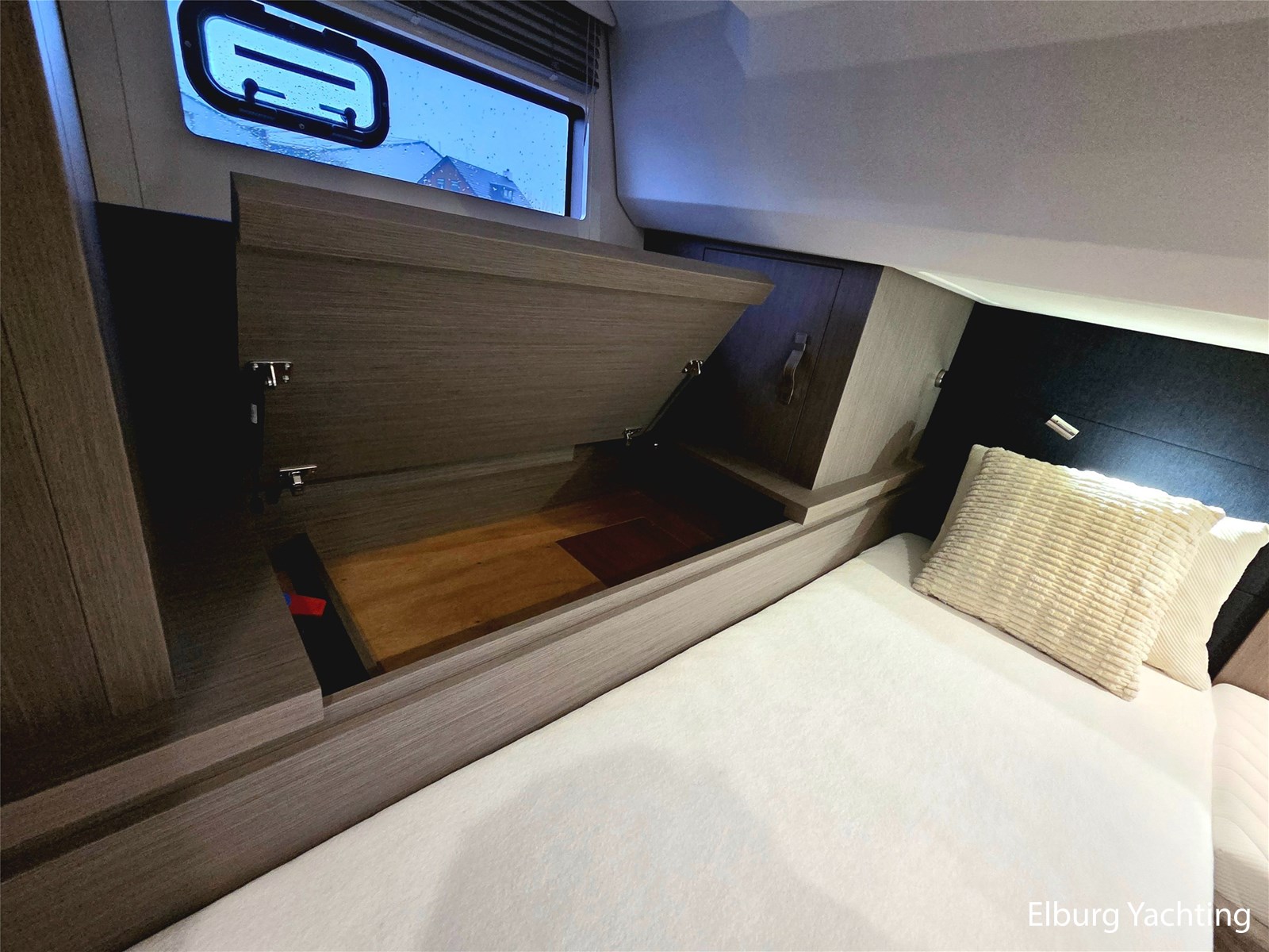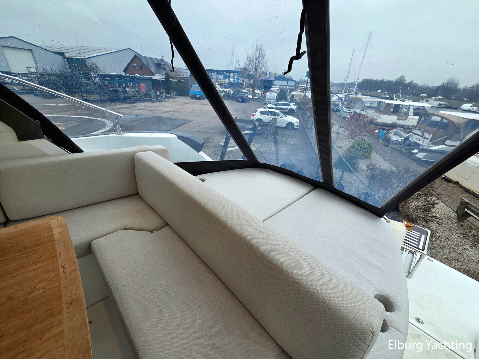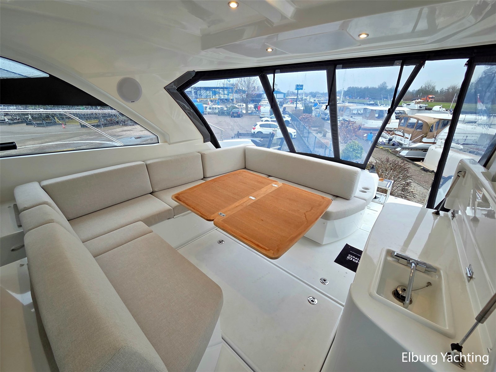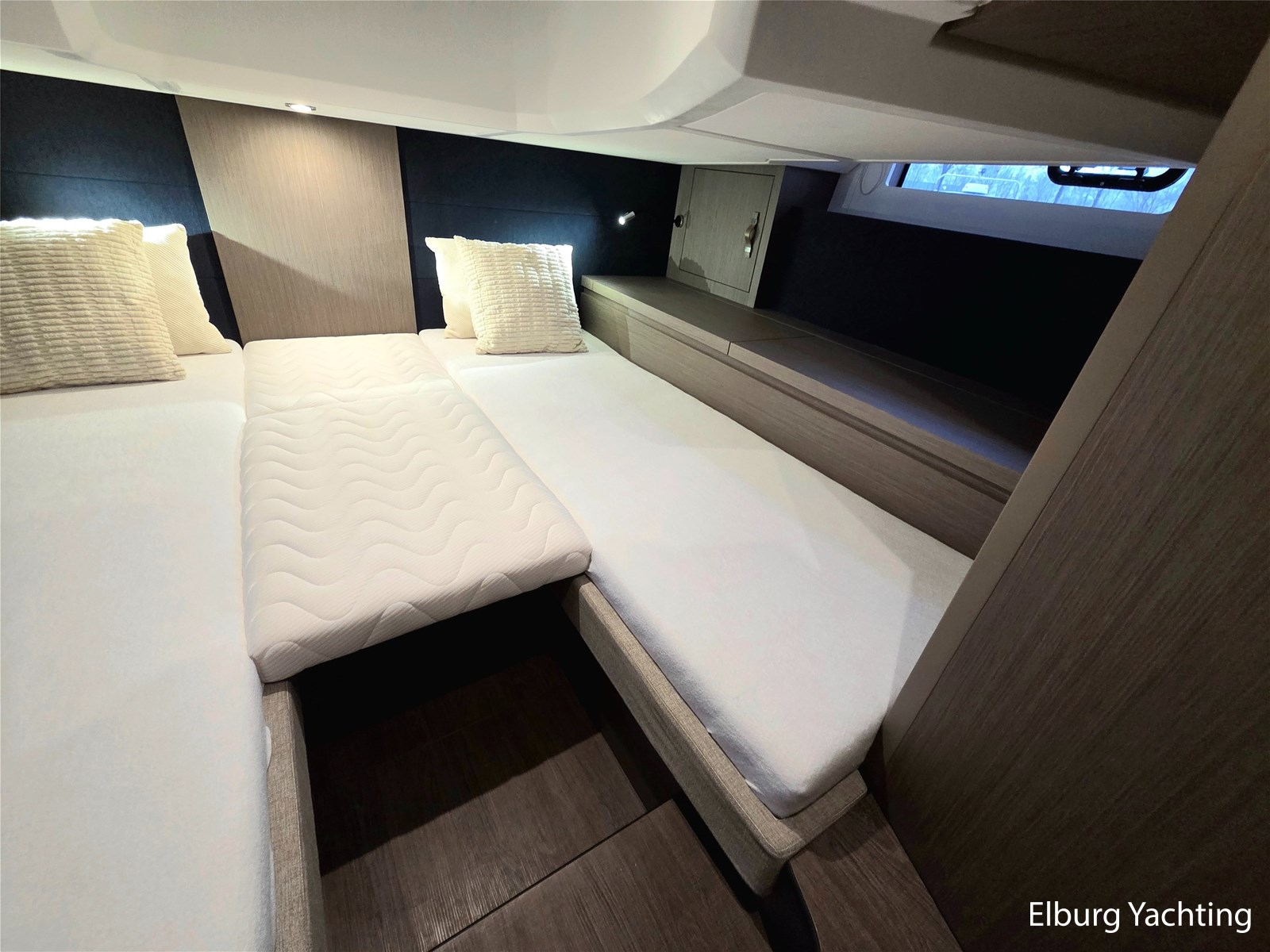 The Beneteau 41 Gran Tourismo is a sporty all-rounder for both inland waters and the open sea, thanks to its combination of practical space and excellent sailing characteristics. It is powered by two 380 hp Volvo Penta D6 engines with docking joystick. The Volvo docking system significantly improves the control and maneuverability of the boat and makes mooring and docking child's play. With a joystick at the helm, every conceivable maneuver can be performed. A supporting electric bow thruster from Sleipner is also present. In the cockpit, there is a large U-shaped bench seat that is open to the helm. The cockpit has an extra refrigerator and sink. The aft deck has a large sunbed with a sliding headrest for extra length. Under the sunbed is an extra-large storage space. This Beneteau 41 Gran Tourismo is equipped with: Full tent around the aft deck, adjustable cockpit table, transom door to swimming platform, helm seat with extra passenger seat on starboard side, refrigerator in cockpit, storage lockers, Volvo Penta computer for reading engine information and current fuel consumption. Volvo trim tabs, 2 x sliding windows at the helm, large electrically operated sliding roof above the helm, Fusion audio system speakers in saloon and cockpit, spacious wardrobe with lighting in forward cabin, bed in second cabin amidships, removable cushions on foredeck, various 220V and USB plug connections available, removable sunshades around the helm position (3 pieces).