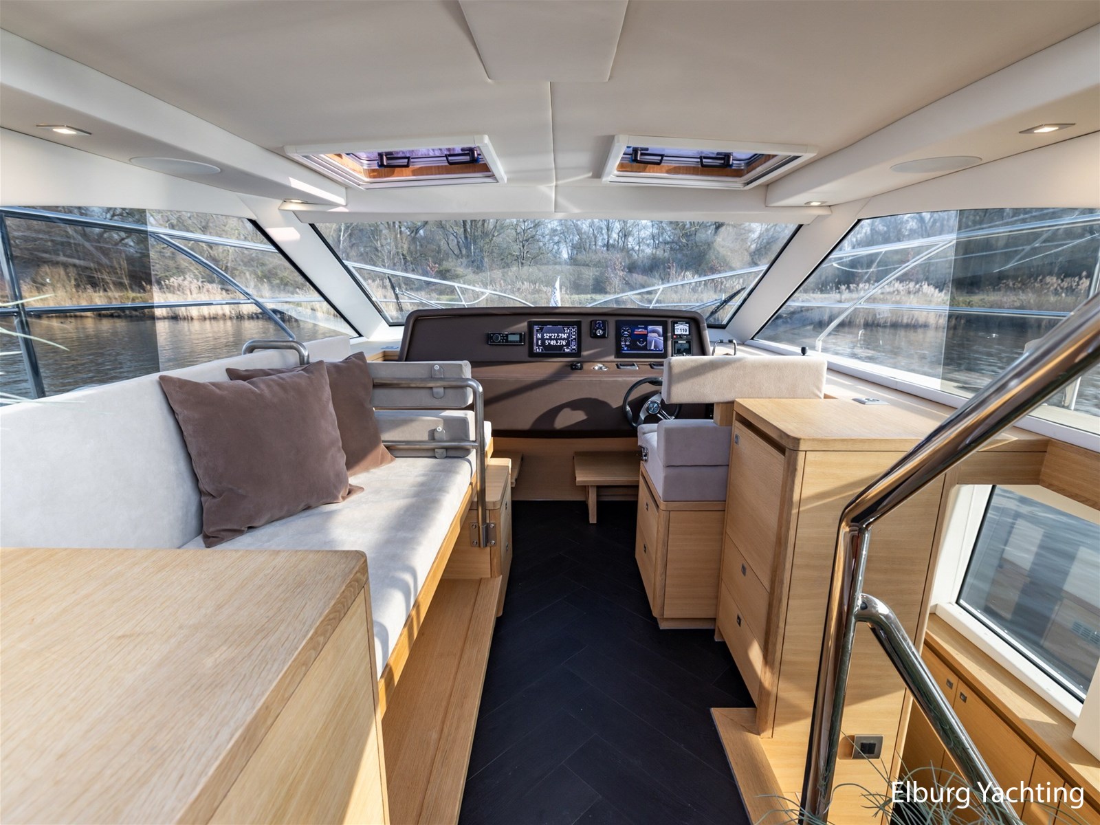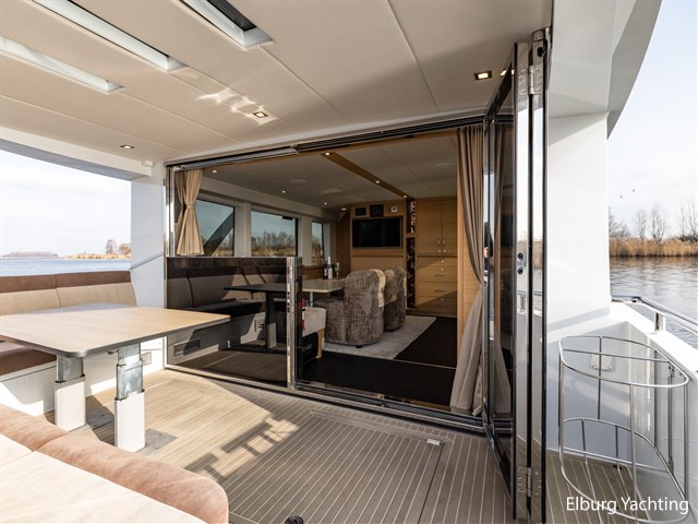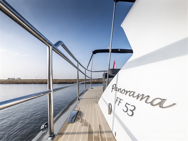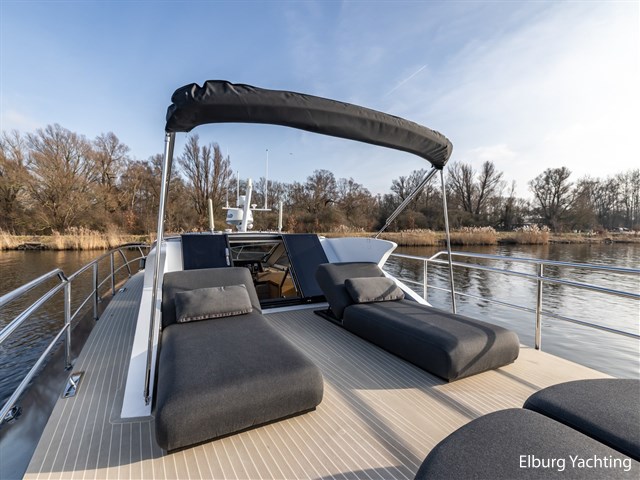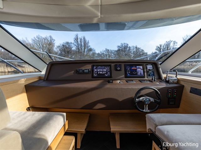 The Steeler Panorama FF53 is as comfortable as a penthouse and has the sailing characteristics of a true sports cruiser. The saloon, helm station, and both cabins offer panoramic views of the outside. The spacious upper deck is fully equipped for enjoying the outdoors. The open cockpit can also be fully connected to the saloon by opening two large folding doors and a pocket window. The yacht is on one level from the swimming platform (submersible) to the bow, which makes moving around on board very pleasant. This Panorama FF53 has two full double cabins with private bathrooms. The equipment is very complete with: Full removable cushion set in the open cockpit, storage hatch in cockpit floor, TV in saloon, electrically operated saloon floor for access to engine room, Yachtcontrol control screen for main functions of the yacht, height-adjustable tables, dishwasher, large door on starboard side for access to jetty at water level, Hydronautica remote control for bow and stern thrusters and independent control of both engines, electric heat pump for underfloor heating throughout the ship, plenty of cupboard space, Zipwake trim system, double bimini top over upper deck, 2 x roof hatch above helm, passenger bench, stainless steel fender holders. The hull has an anthracite grey coloured film/wrap, applied in 2025.