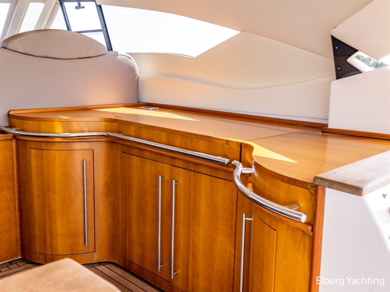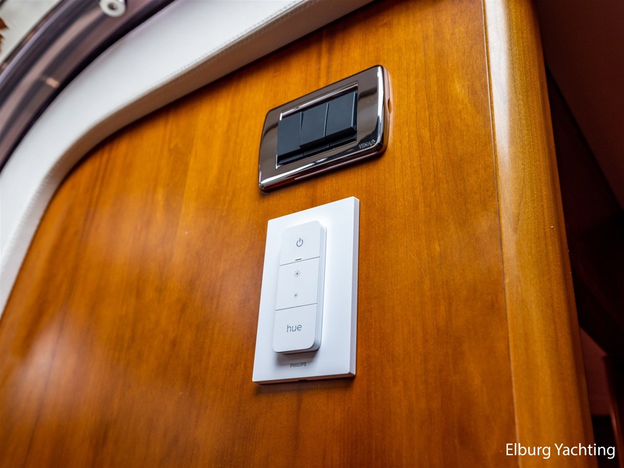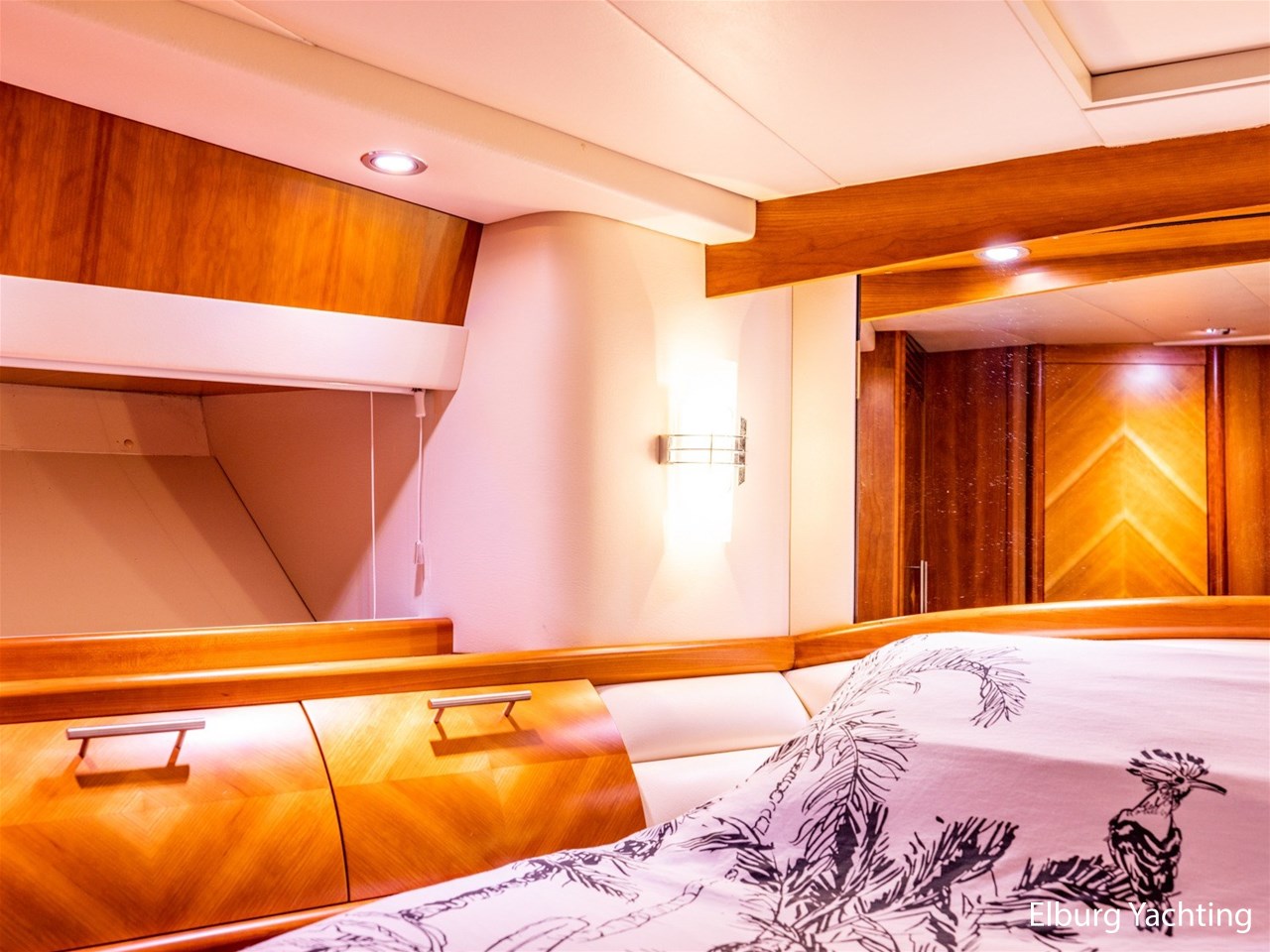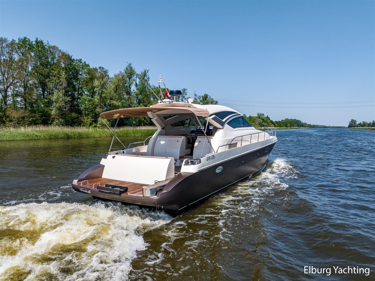 The Cayman 52 Hardtop is a truly sporty all-rounder. The wheelhouse can be fully enclosed with a canopy or insect screen. The helm station, wet bar with sink, grill and fridge, and the spacious U-shaped seating area are all located on a single level. The large electric sliding roof brings the outdoor feeling inside. The open cockpit is generously laid out with a fixed bench and matching cushions. A cockpit hatch provides access to the technical area with additional storage space. Below deck, there are no fewer than three cabins offering up to six berths, along with two separate toilet and shower compartments. This Cayman 52 is equipped with features including: a hydraulically operated gangway on the aft deck, dinghy bracket and launching system, bimini top over the aft deck, cockpit lighting, stainless steel fender holders, two storage hatches in the foredeck, a large sunbed on the bow, high stainless steel guard rails all around, high-quality Italian wood interior, easily accessible technical systems, tanks with inspection hatches, trim tabs, Philips HUE interior lighting, and a trawling mode (low-speed control at idle). Furthermore, a stern thruster was recently installed, and the bilge pump, cover (2024), and service batteries have been renewed.